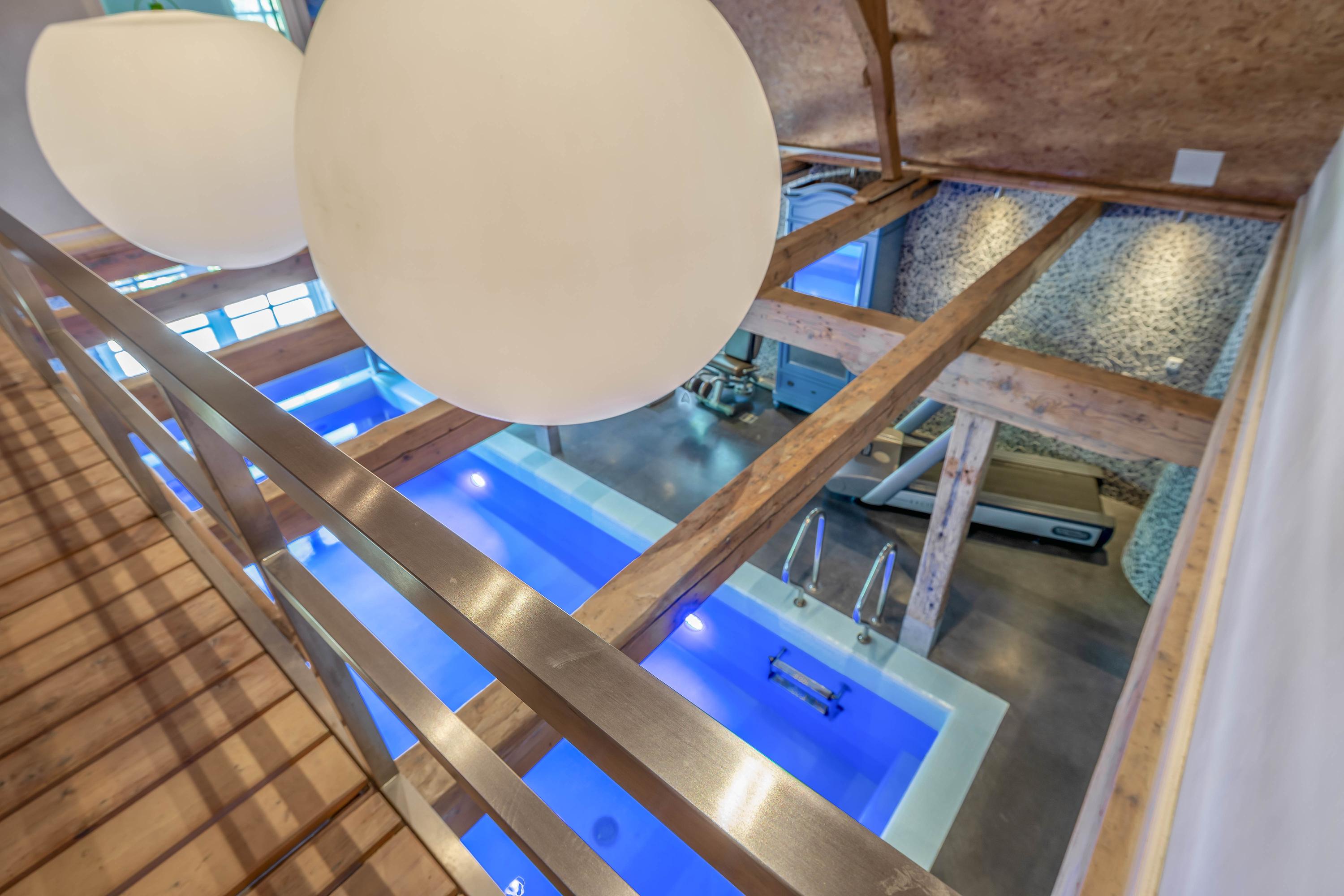 The renewed master suite includes an en-suite bathroom, while a dedicated entertainment room serves as a billiard lounge or guest accommodation. In the former stable, a generous wellness area unfolds with a swimming pool, jacuzzi, gym zone, and light streaming through original stable windows. The property’s serene sense of space is reinforced by 1,250m² of land, with an additional 4,430m² leased, offering orchards of cherry, walnut, apple, and pear trees, a garage over 80m², three horse stables, and a greenhouse.
