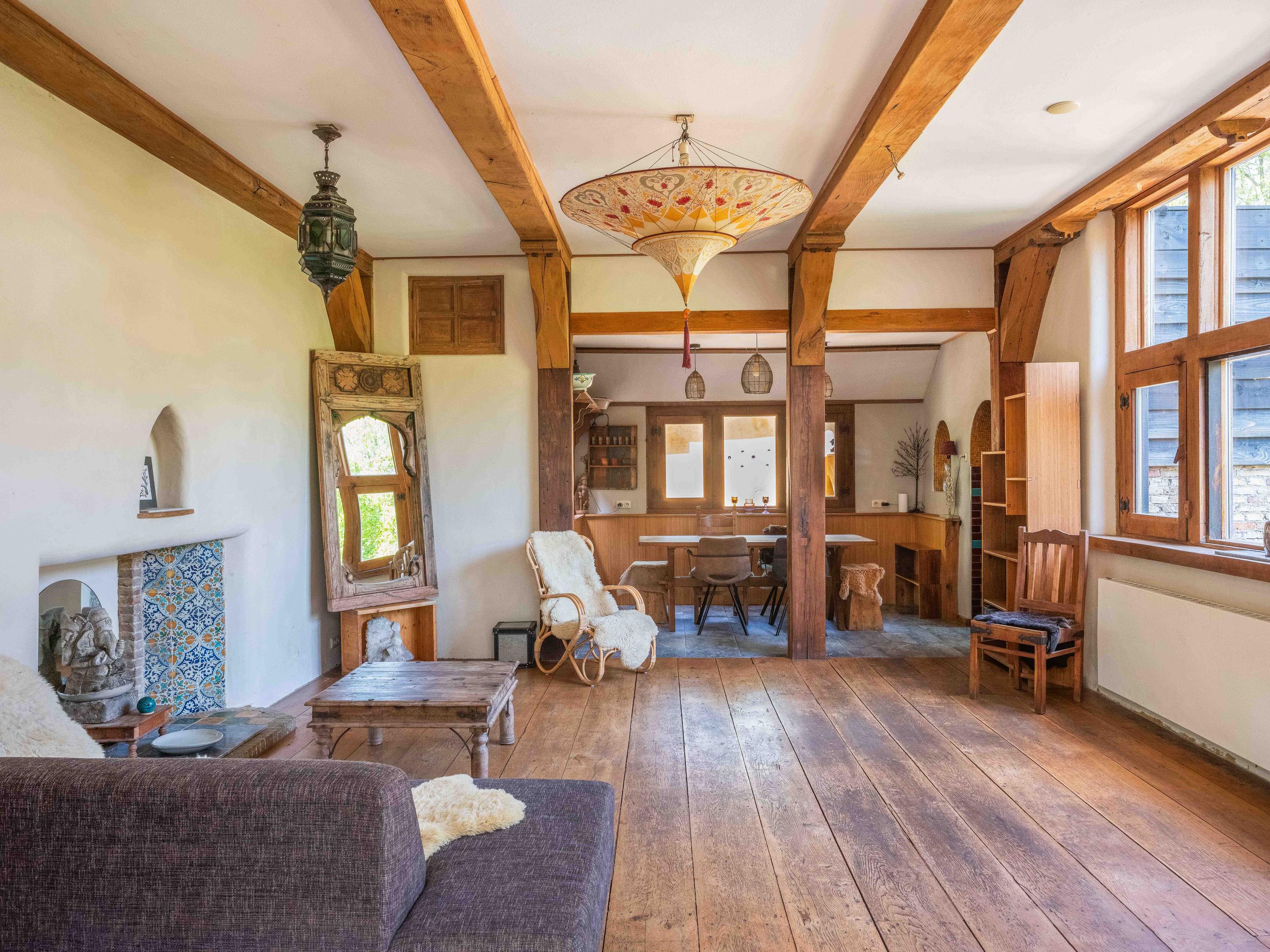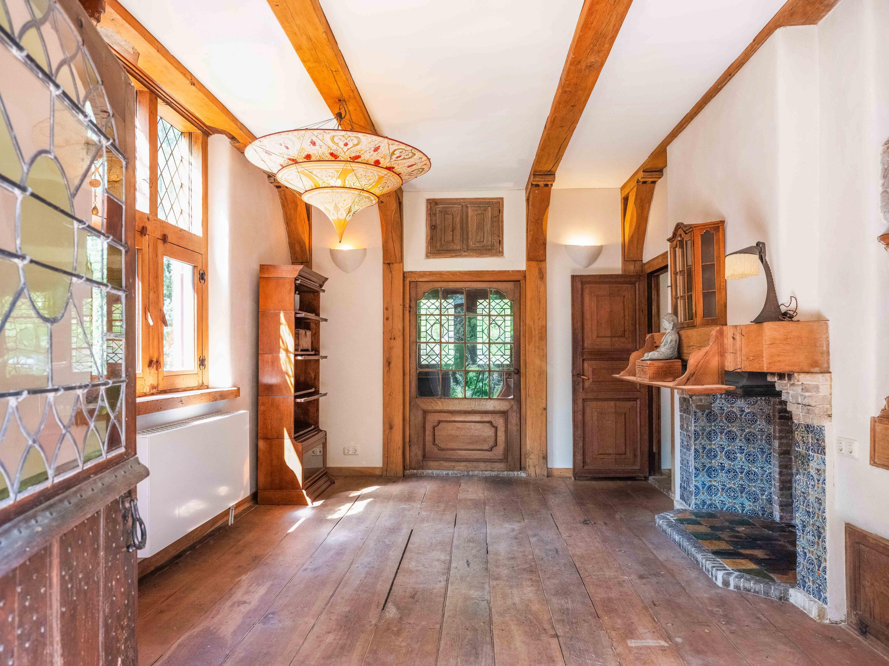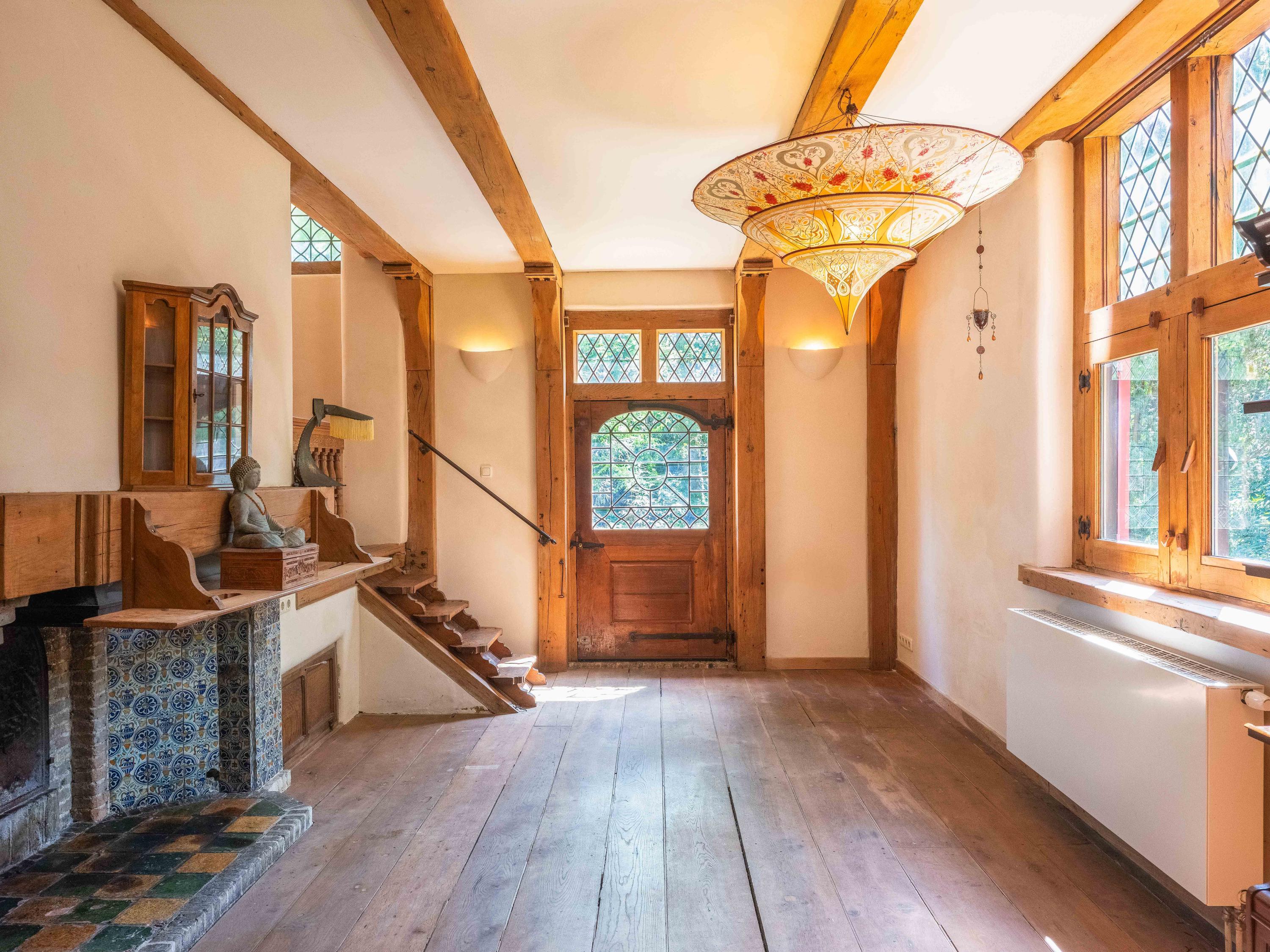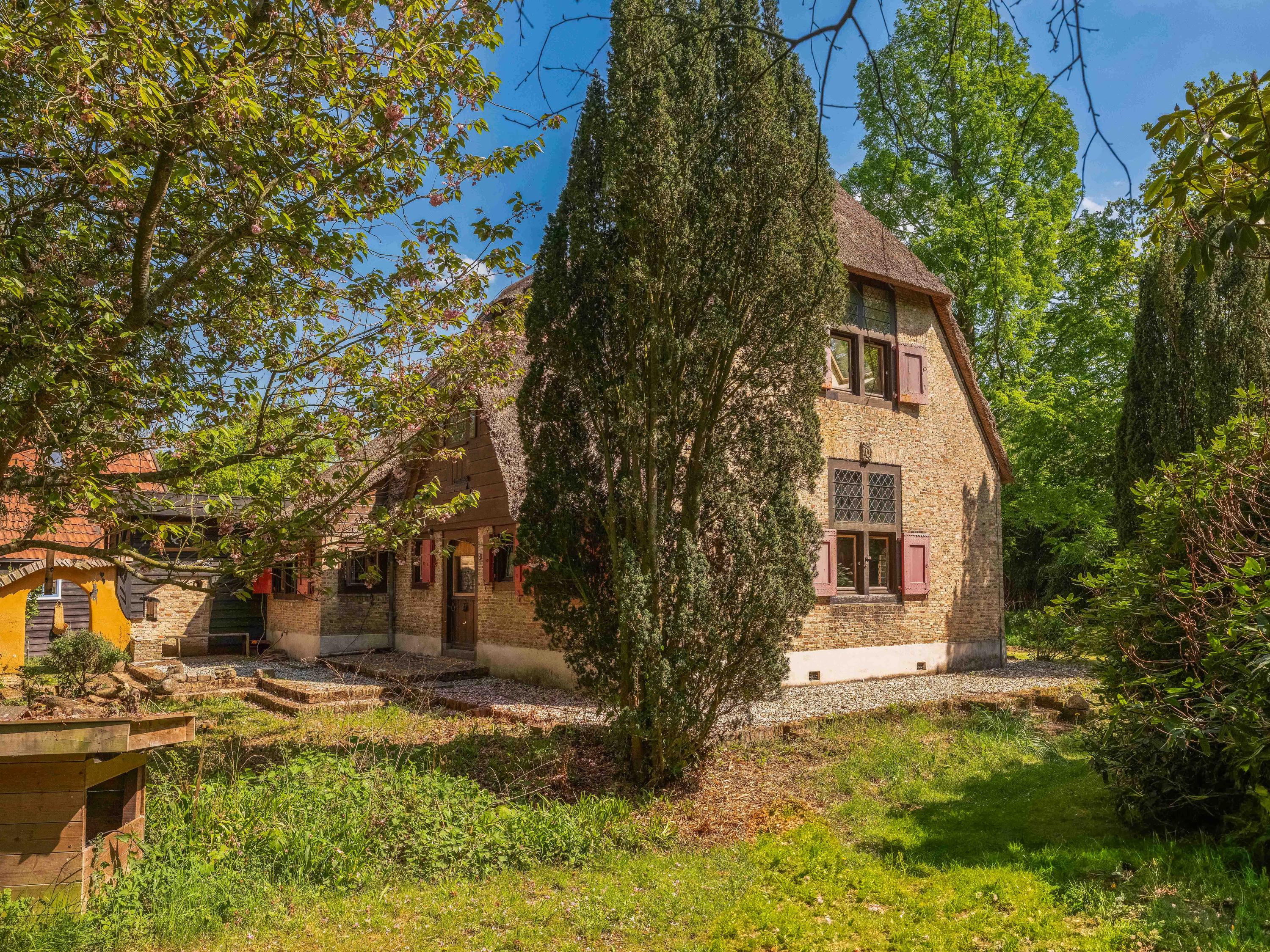 A long forest path leads you to this striking property, built in 1935 using 17th-century materials and designed by architect Royaards. The house exudes character and history: robust fireplaces – currently not functional but eligible for renovation – antique elements such as solid oak beams and floors, and clay-plastered walls that create a pleasant indoor climate and promote restful sleep. Here, you experience the luxury of silence, space, and privacy, surrounded by the scent of the forest, the gentle rustling of trees, and the songs of countless birds – this is truly a bird lover’s paradise.