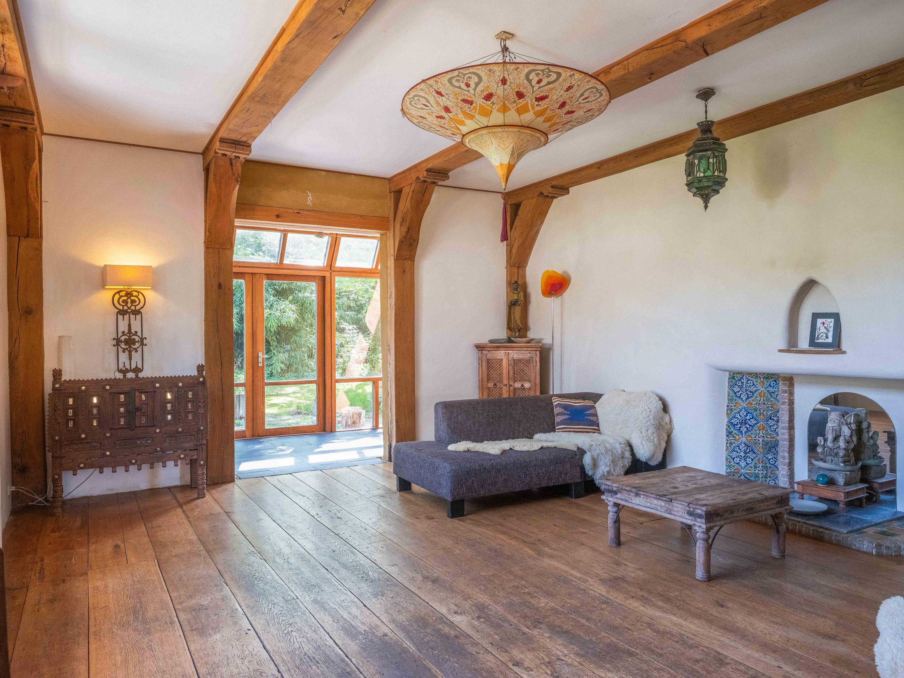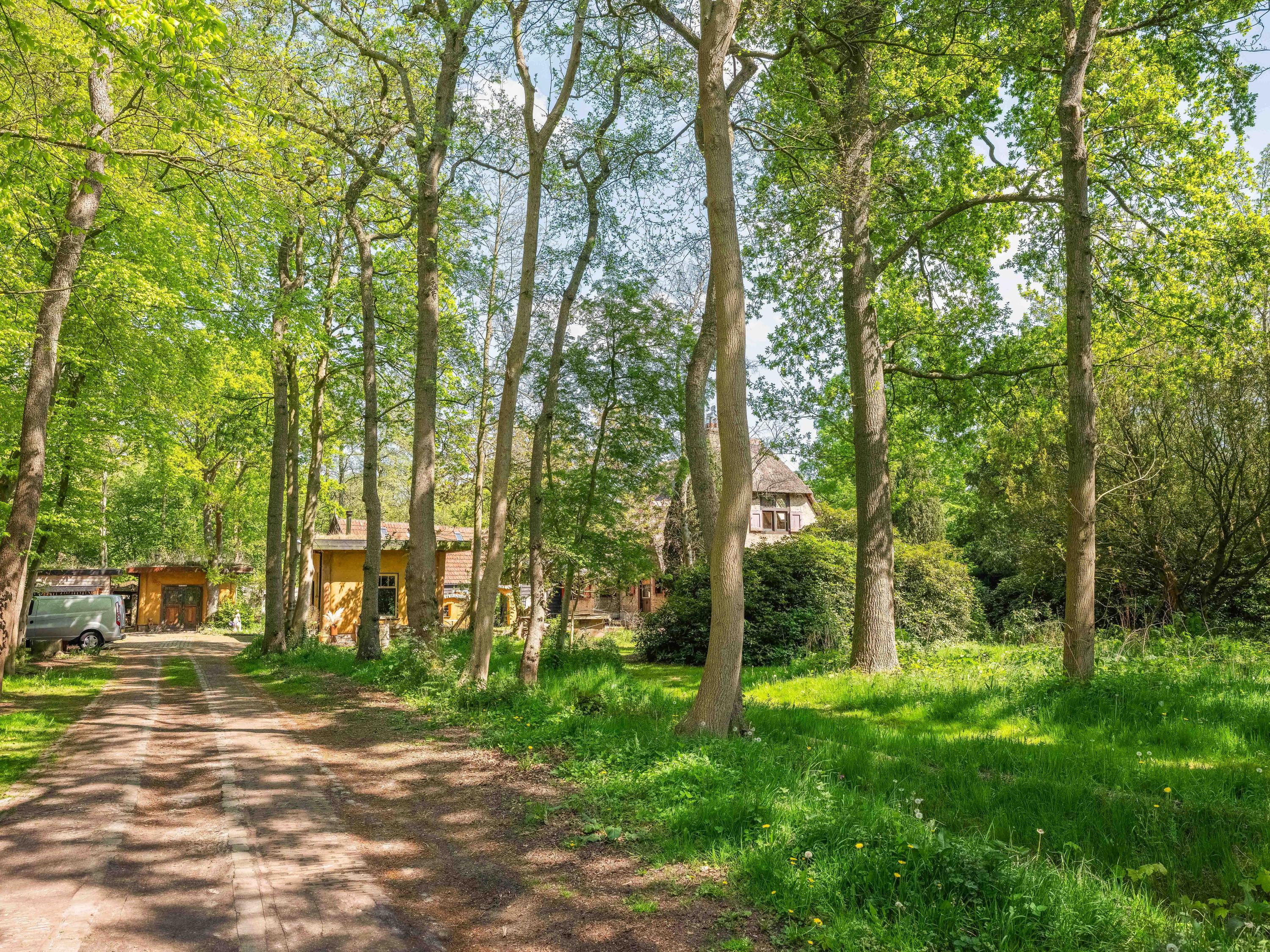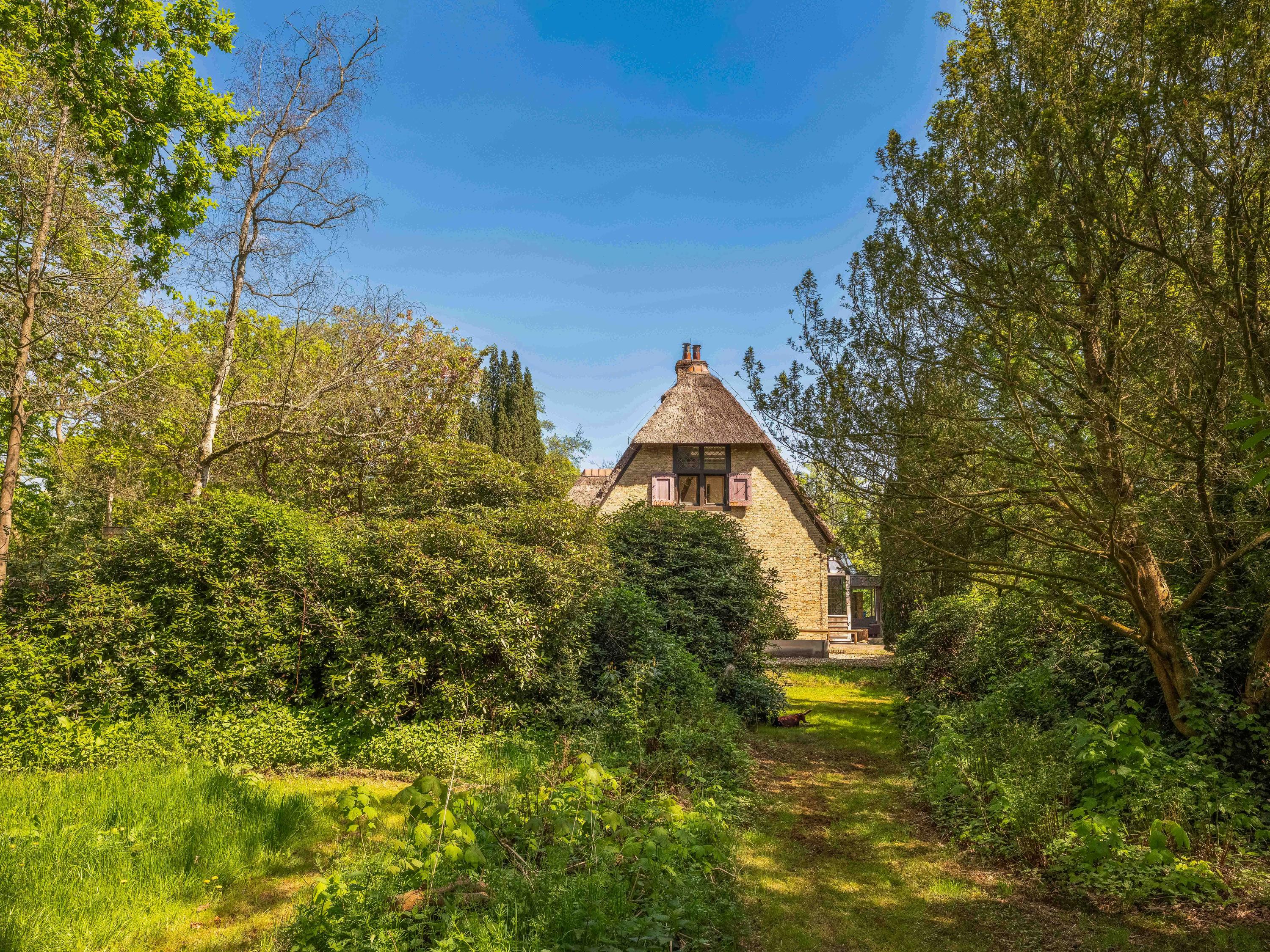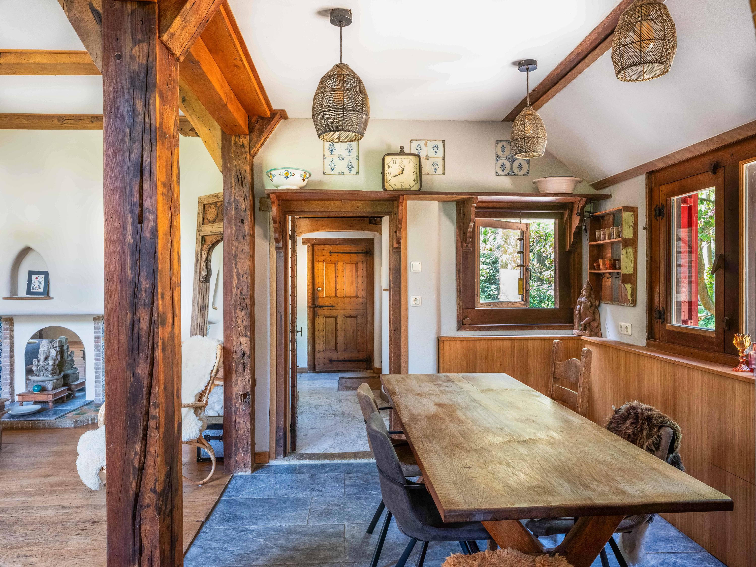 A long forest path leads you to this striking property, built in 1935 using 17th-century materials and designed by architect Royaards. The house exudes character and history: robust fireplaces – currently not functional but eligible for renovation – antique elements such as solid oak beams and floors, and clay-plastered walls that create a pleasant indoor climate and promote restful sleep. Here, you experience the luxury of silence, space, and privacy, surrounded by the scent of the forest, the gentle rustling of trees, and the songs of countless birds – this is truly a bird lover’s paradise.