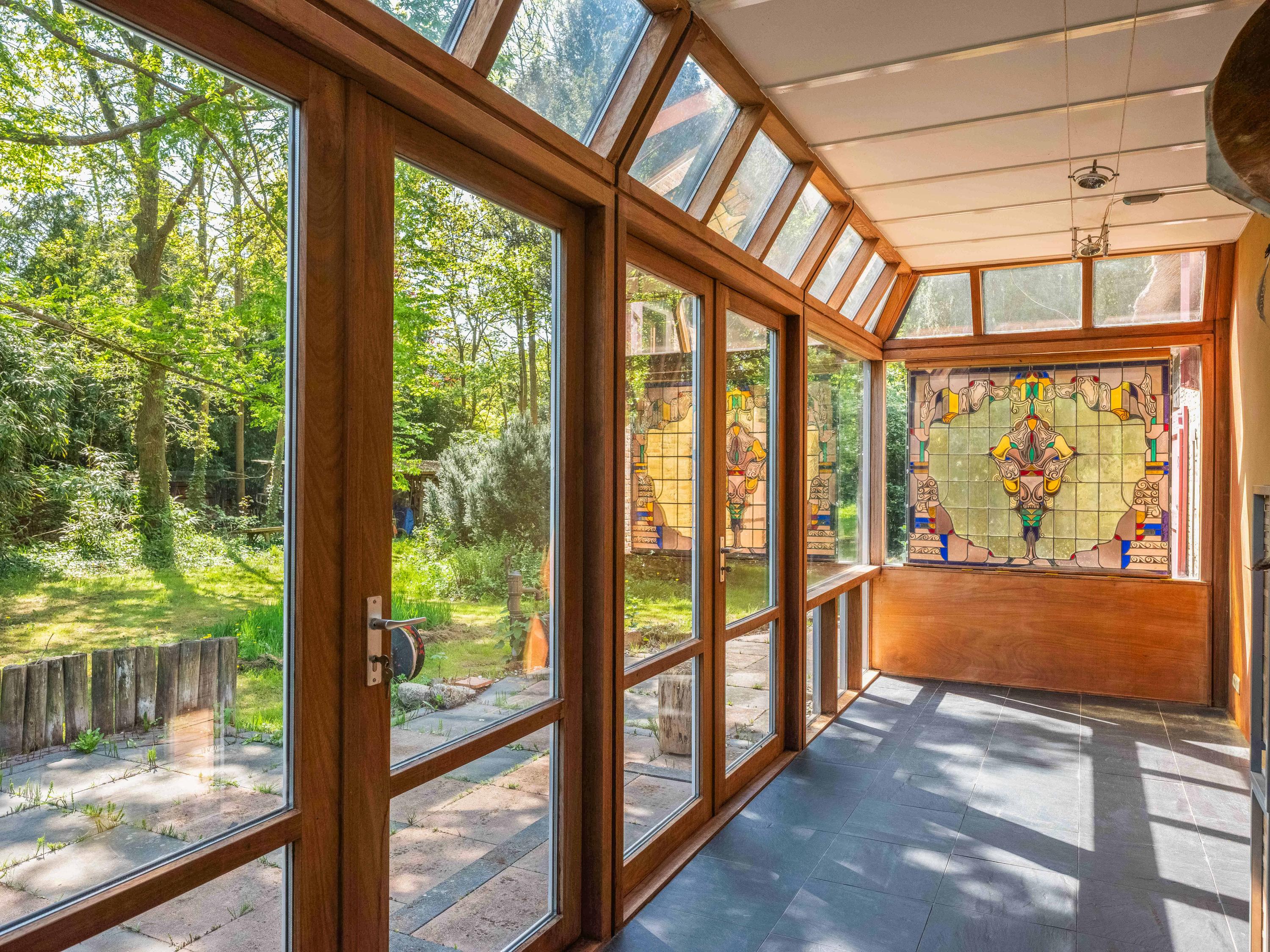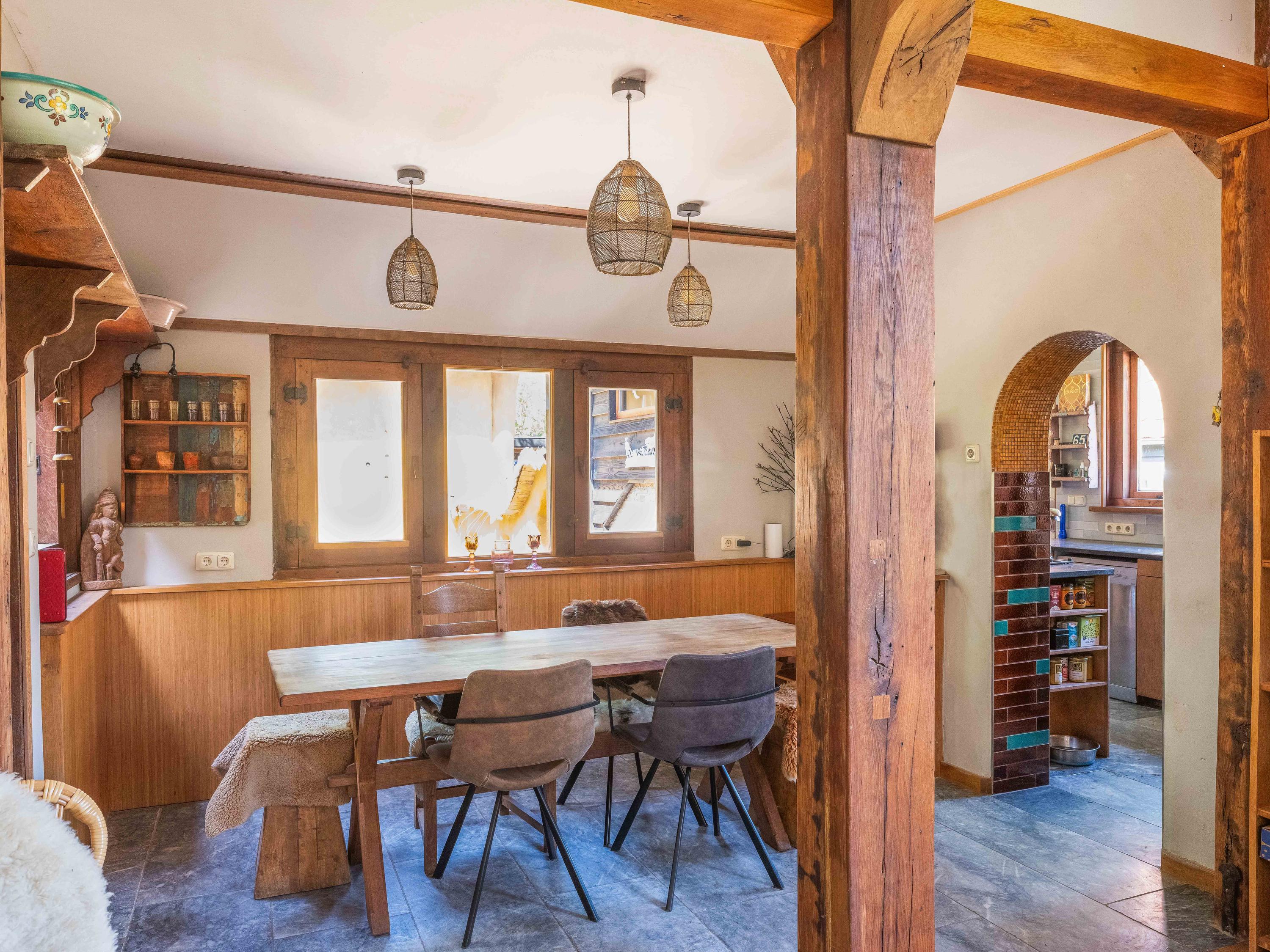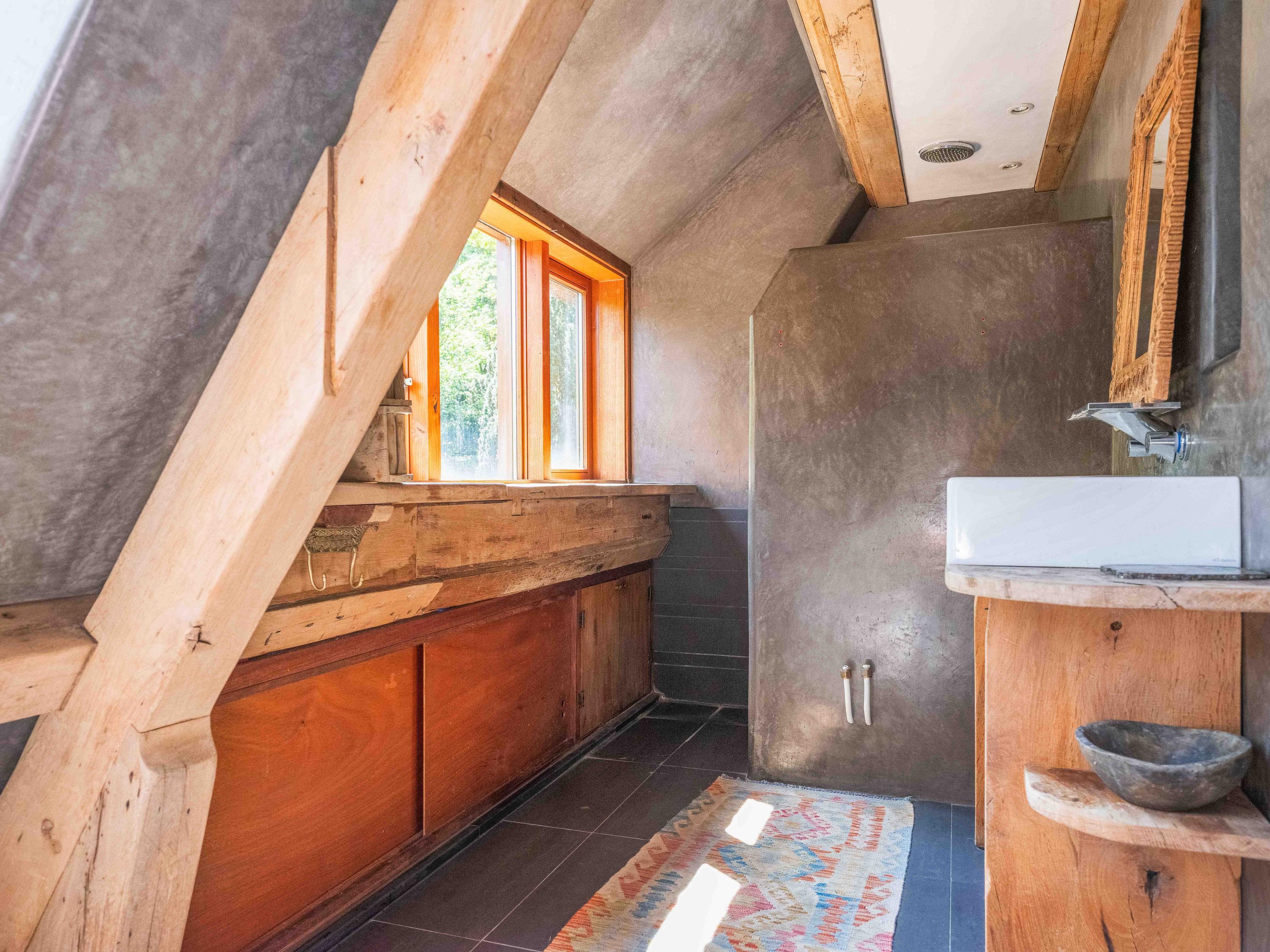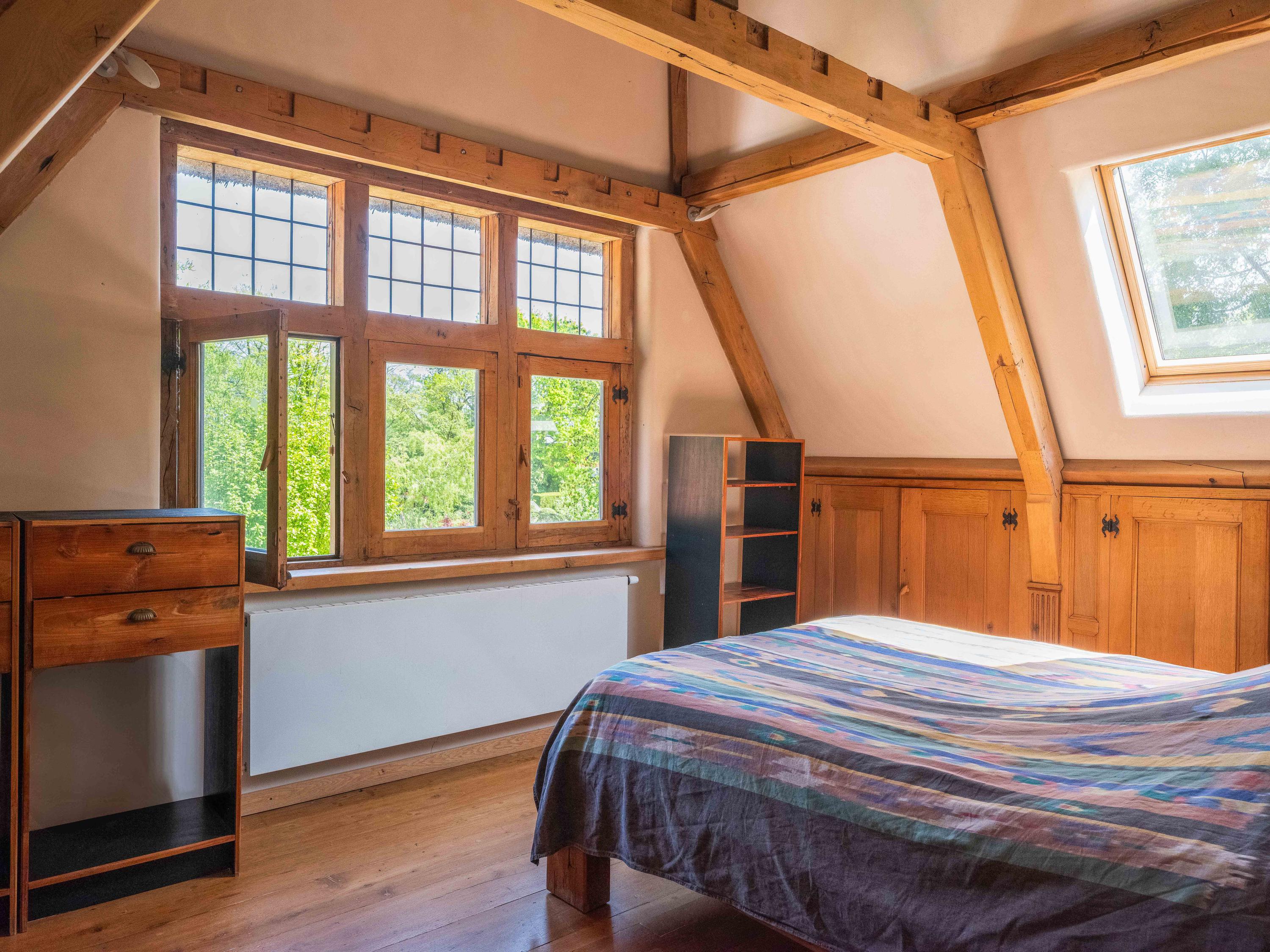 A long forest path leads you to this striking property, built in 1935 using 17th-century materials and designed by architect Royaards. The house exudes character and history: robust fireplaces – currently not functional but eligible for renovation – antique elements such as solid oak beams and floors, and clay-plastered walls that create a pleasant indoor climate and promote restful sleep. Here, you experience the luxury of silence, space, and privacy, surrounded by the scent of the forest, the gentle rustling of trees, and the songs of countless birds – this is truly a bird lover’s paradise.