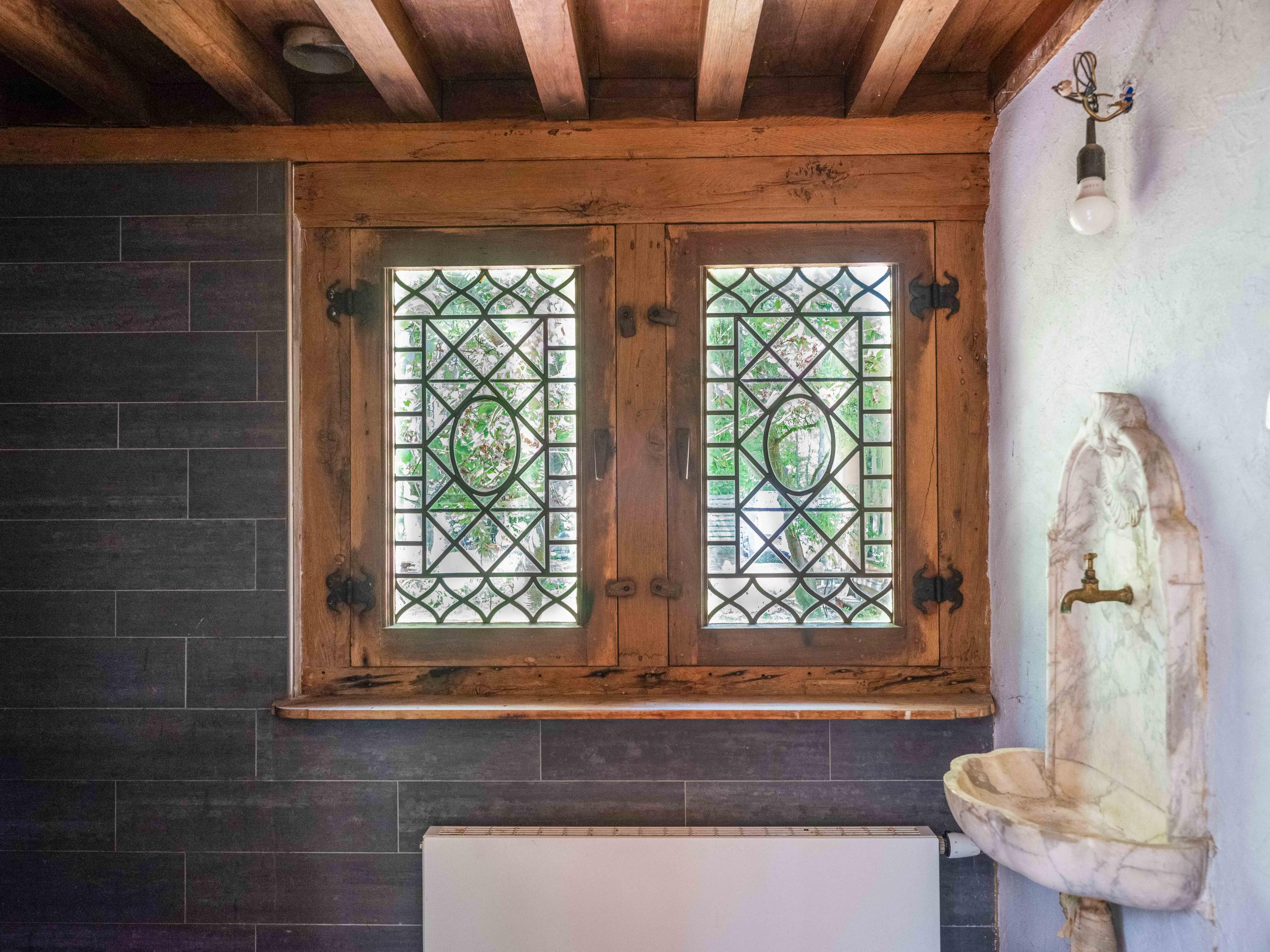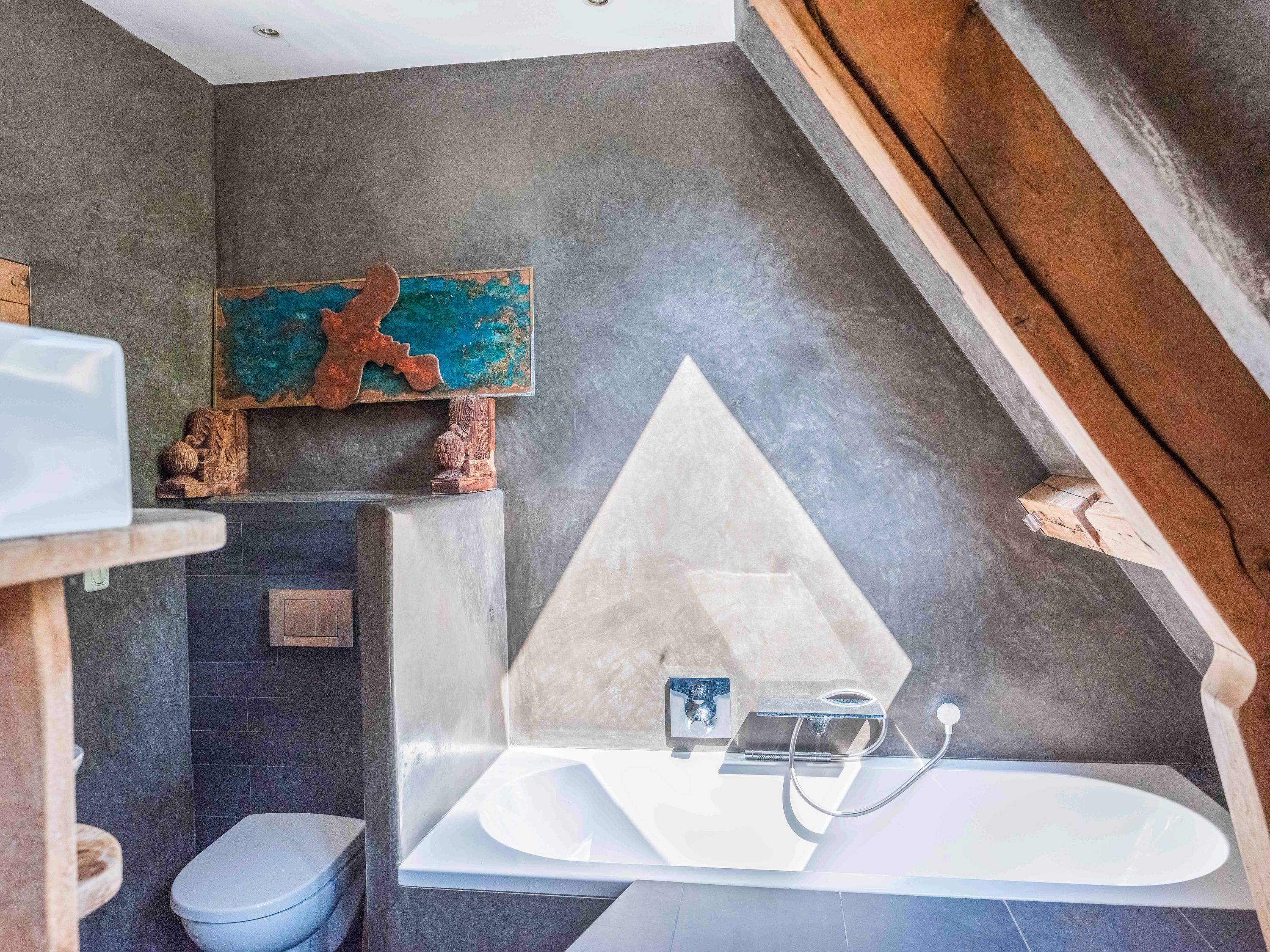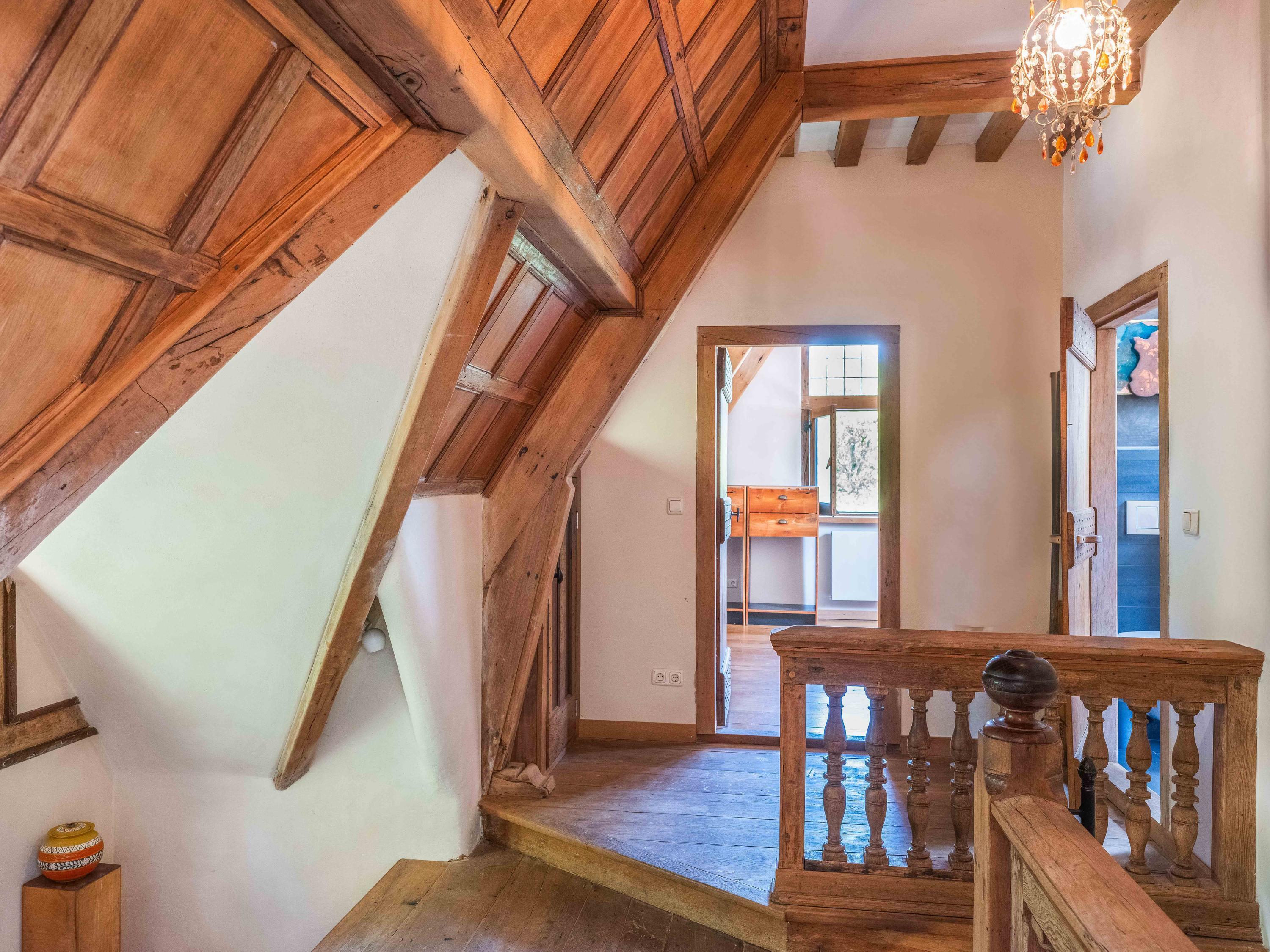 Upstairs, the spacious landing leads to two bedrooms with built-in wardrobes and a modern bathroom finished in tadelakt, complete with a toilet, bathtub, sink, and shower. It’s also wonderful to see how the original beams have been left visible, adding to the authentic atmosphere.