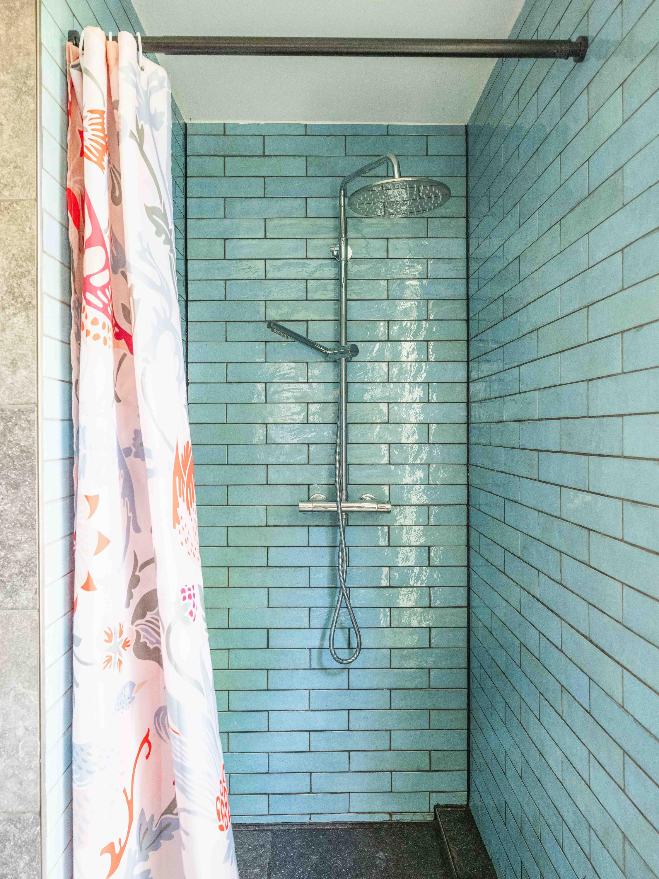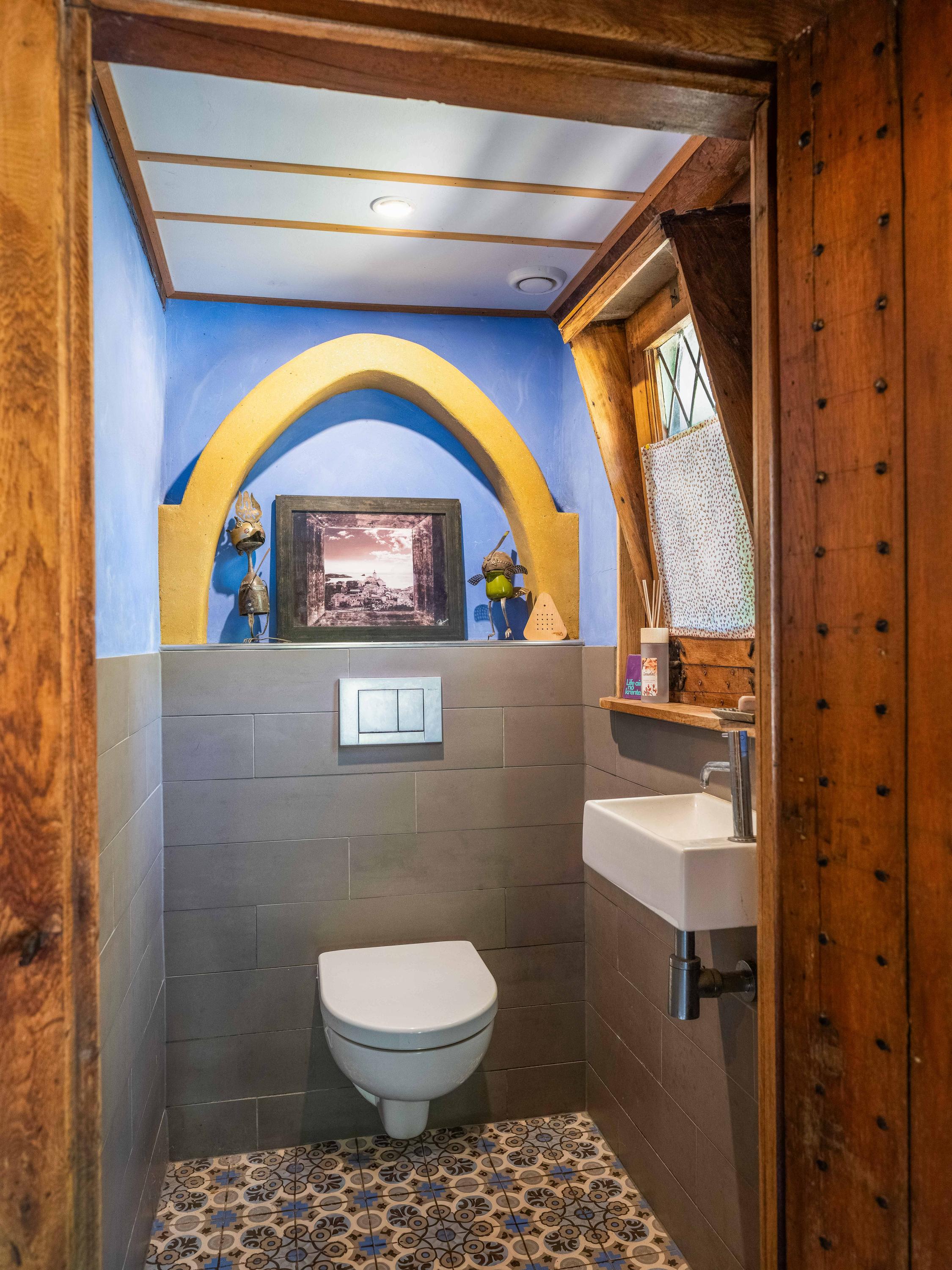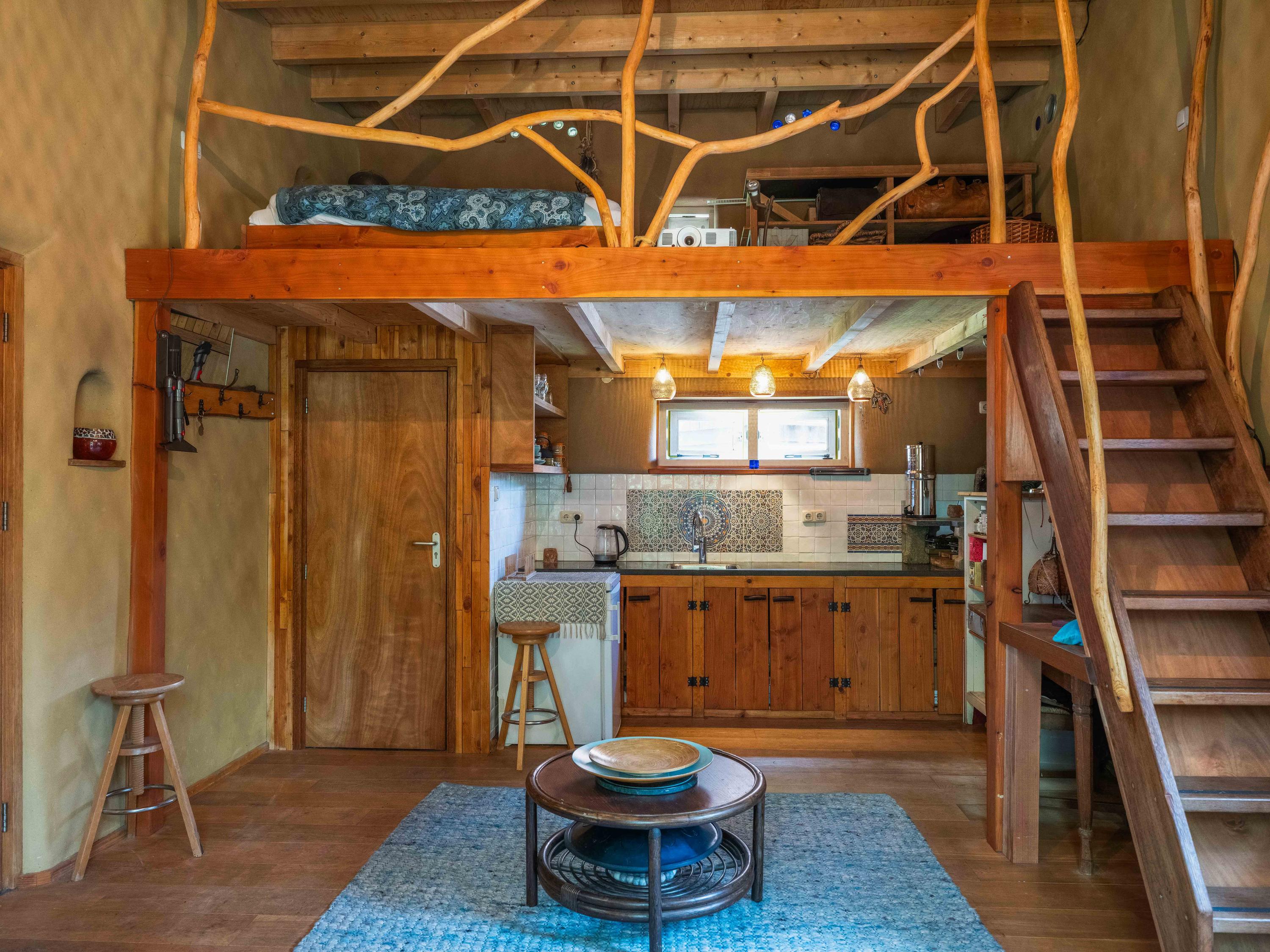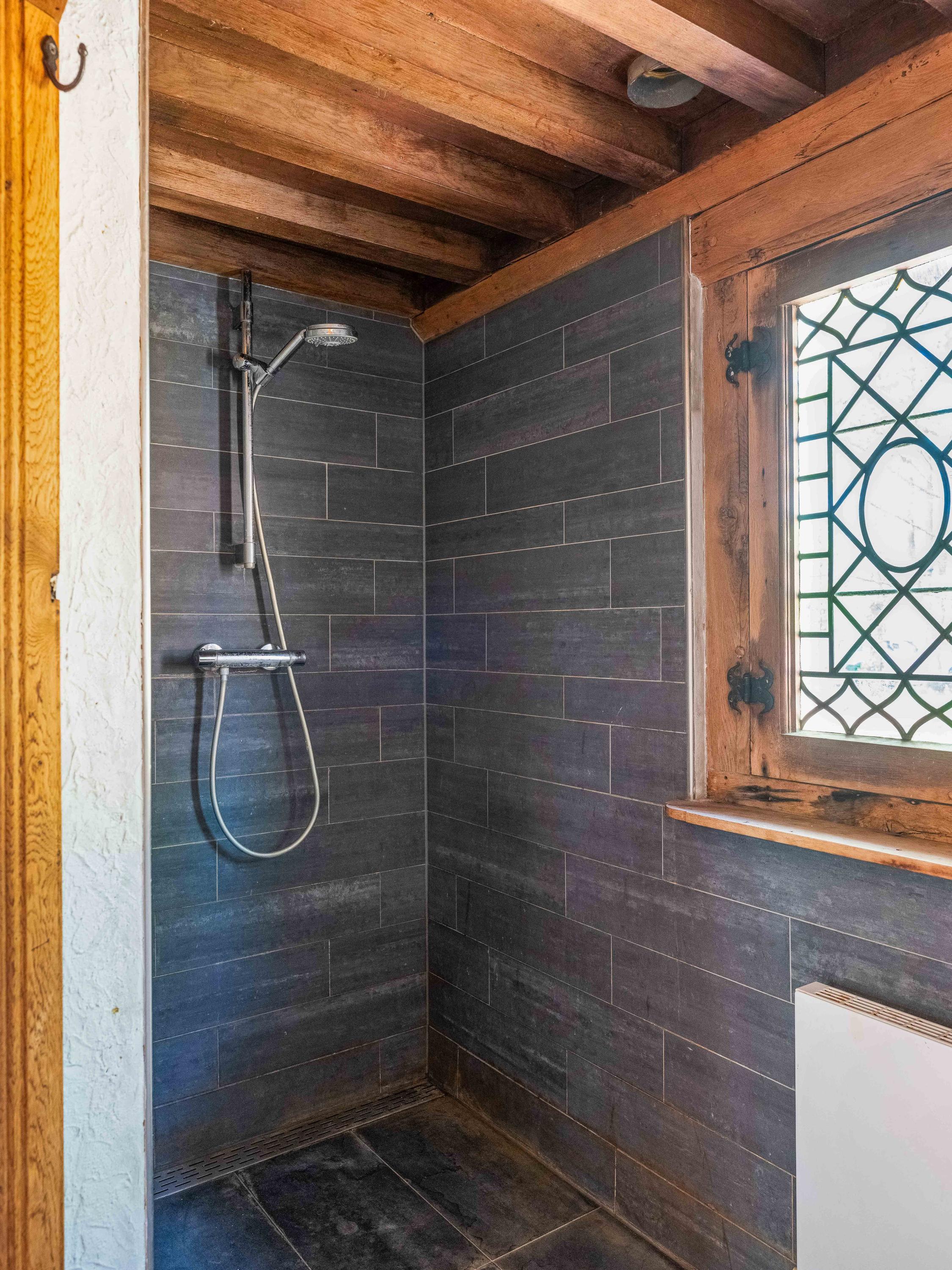 Upstairs, the spacious landing leads to two bedrooms with built-in wardrobes and a modern bathroom finished in tadelakt, complete with a toilet, bathtub, sink, and shower. It’s also wonderful to see how the original beams have been left visible, adding to the authentic atmosphere.