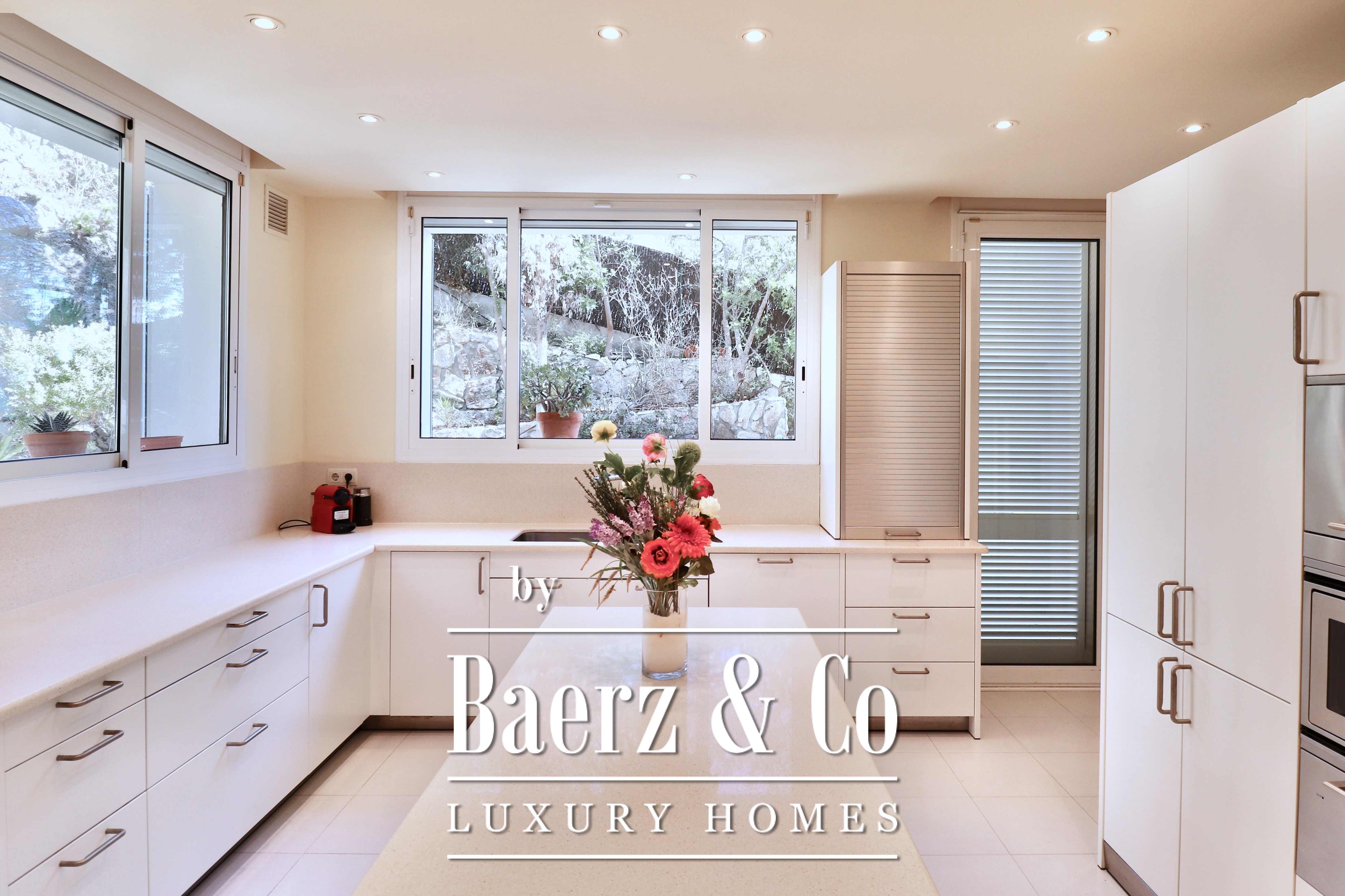 Designed for discretion and comfort, the villa unfolds across three levels, connected by a private lift. The main level opens with a refined entrance hall leading to a fluid living space, including living and dining rooms, a media zone, and a fully equipped kitchen with an adjoining service area and dedicated office. Five bedrooms and eight bathrooms allow for both family intimacy and entertaining on a generous scale.