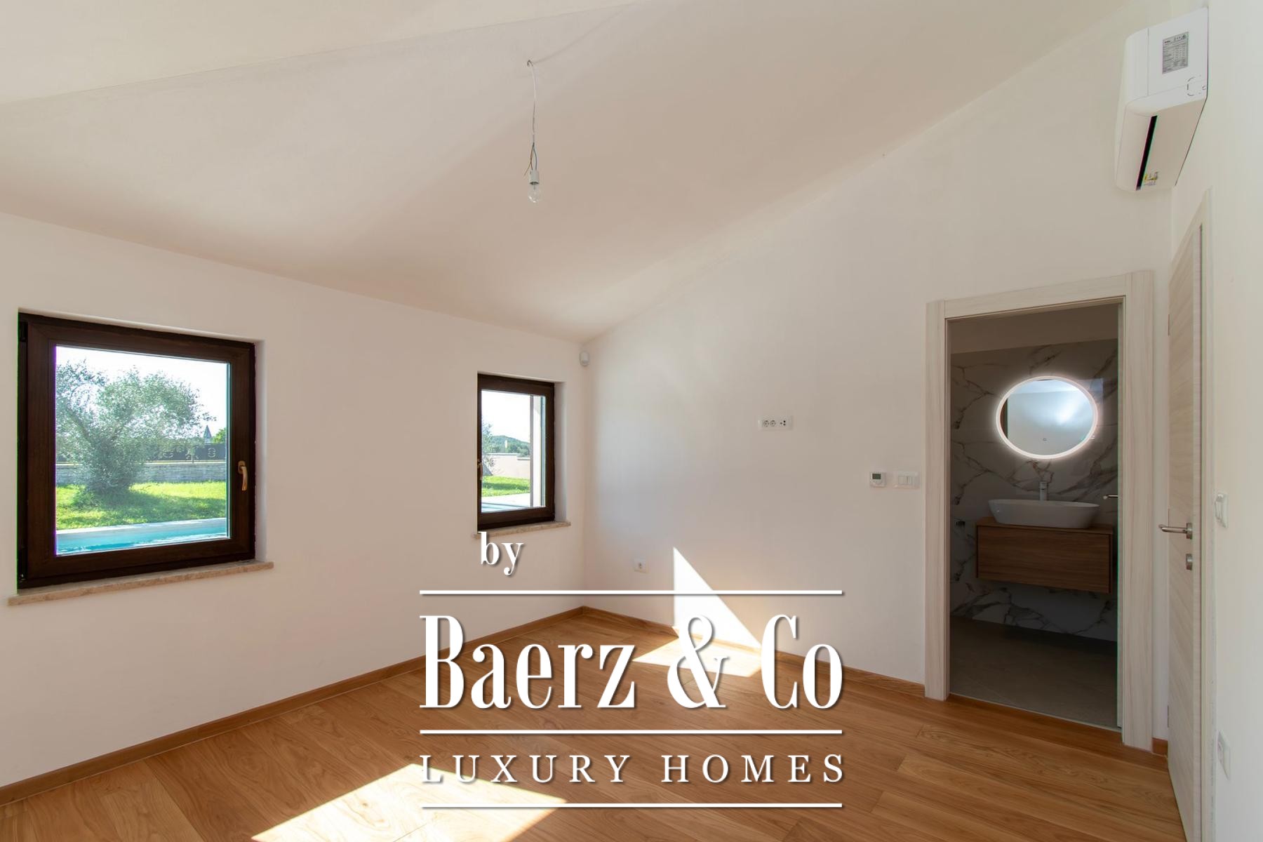 an oasis of peace.The quality of construction and equipment is at the highest level, with reinforced concrete construction and facade stone wool d=10 cm and a silicate finish, ensuring superior energy efficiency (certificate A). The ceiling height of 2.75 m gives a feeling of airiness, while high-quality joinery with triple glass in walnut color, plastered with bio-plaster of the interior and paint of the interior walls based on lime, create a healthy and pleasant environment. The floors are covered with ceramics from the Italian manufacturer NORDIK TILE and oak parquet of the 1st class.The villa is equipped with a fire protection system, DAIKIN heat pumps in all rooms with electronic regulation, and 11 air conditioners for optimal temperature throughout the year. Security is ensured by video surveillance, an intercom and an alarm system. The exterior impresses with five parking spaces (three covered), two entrances to the yard, and the facade of the house, terraces and stone-built (drywall) walls on an area of approximately 250-300 m2. Profiled stone erts on the windows, an outdoor shower, eight olive trees aged 60-70 years and external irrigation, round off this exclusive offer.If you want to own a quality, modern villa about 10 minutes from the first beaches in Vrsar or Poreč, feel free to contact us - we are at your disposal.