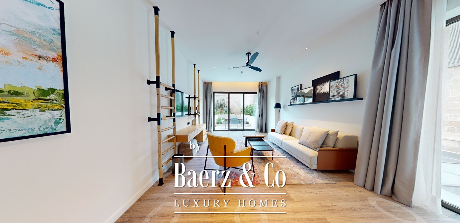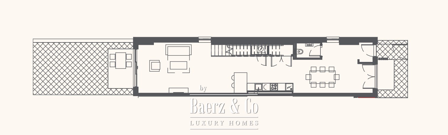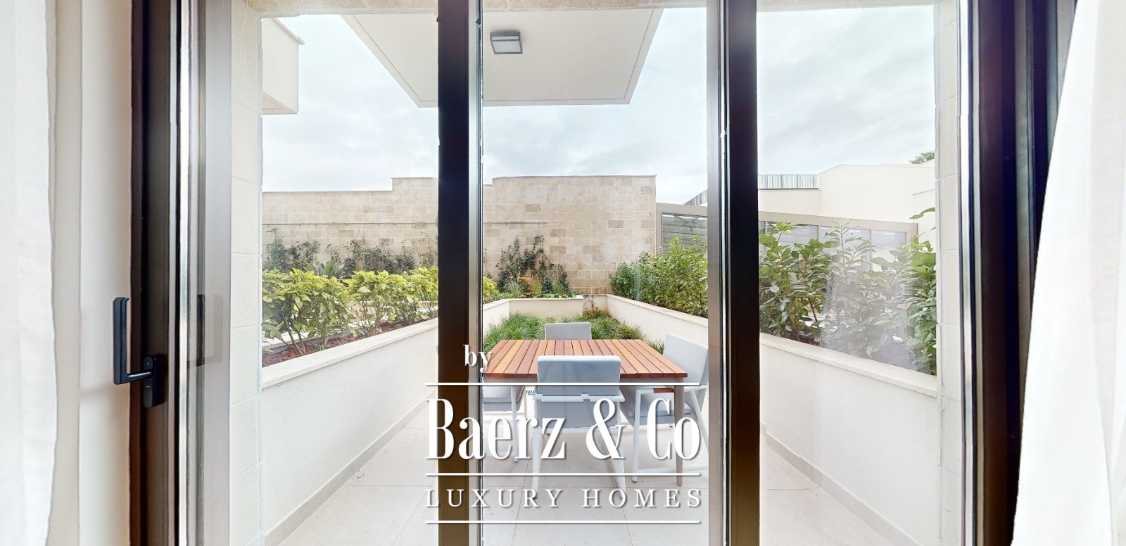 The duplex features two bedrooms, two bathrooms, a guest toilet, an open living room with kitchen and dining area, and an inviting terrace. Expansive windows frame tranquil sea and mountain views, accentuating the natural light and gentle pace of this setting. Included is a private garage space, full furnishings, and the exclusive right of use to a 33.49 m² plot at the entrance, ideal for a secluded garden or outdoor lounge.