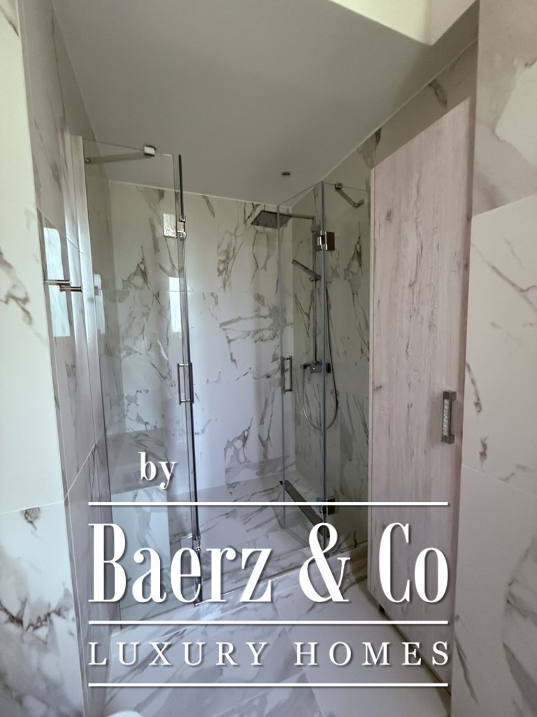 The fully furnished villa spans three levels with a 214 m² internal area on a 463 m² plot. Renovated in 2024, its five-bedroom layout includes five bathrooms and a guest WC. Four bedrooms reside on the second floor while the expansive master suite, complete with en-suite bathroom and a private storage room, occupies the top level. The kitchen faces the landscaped garden, complementing a separate dining area and a cozy living room anchored by a steam fireplace. Materials are elegantly matched with tiles, marble, and laminate throughout.
