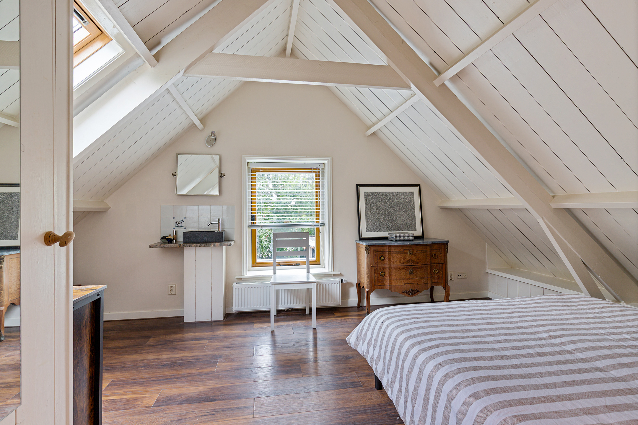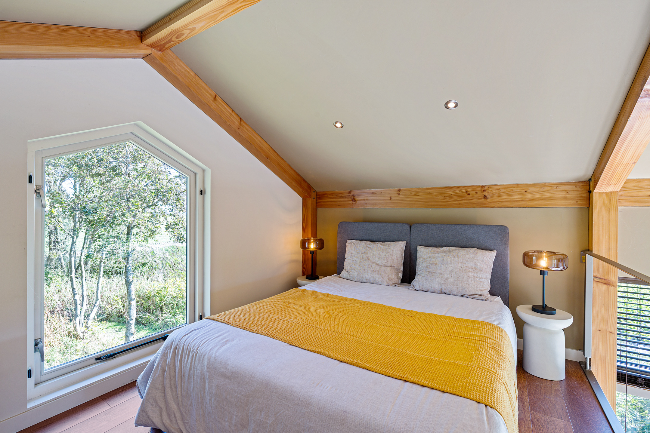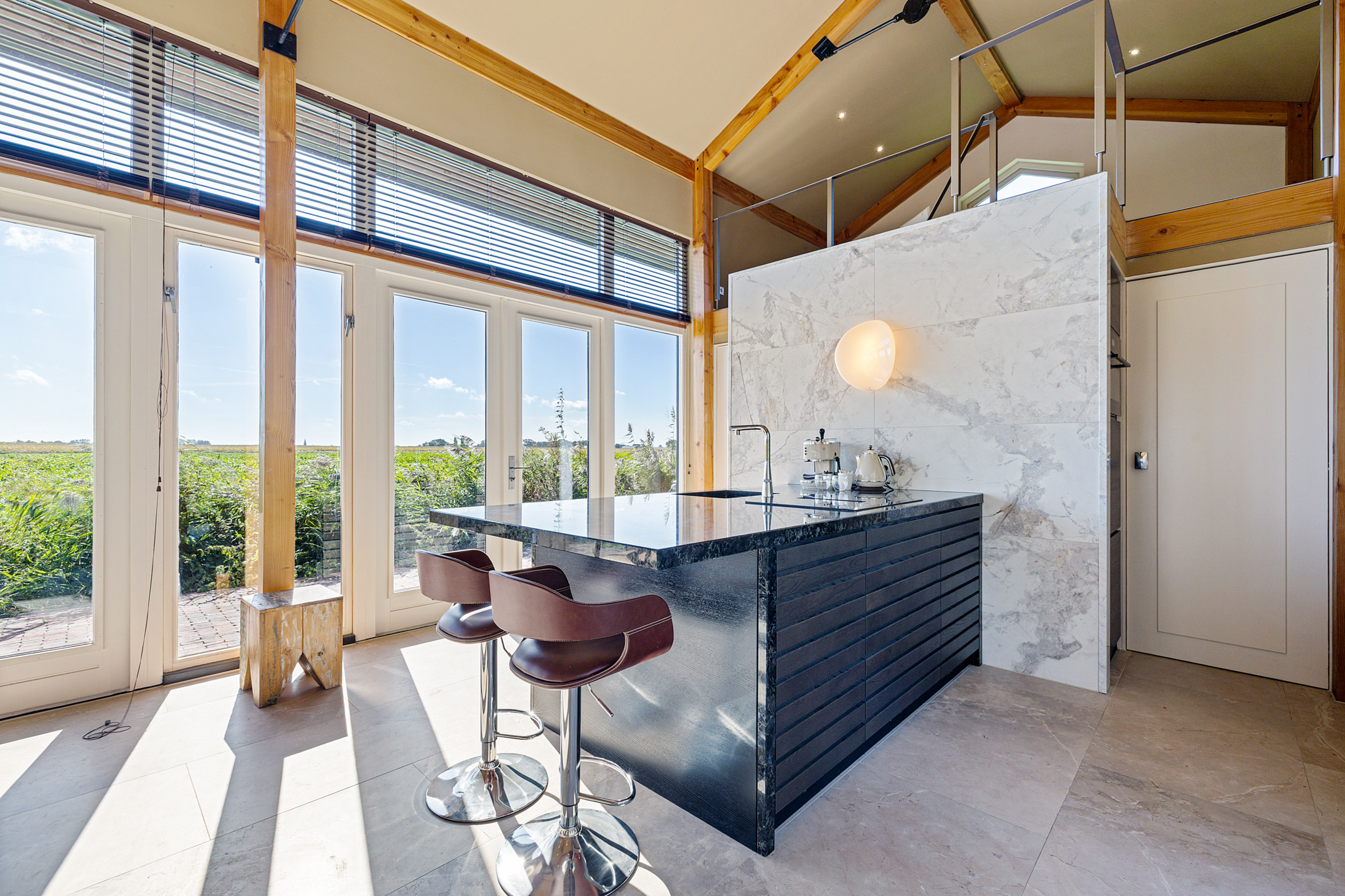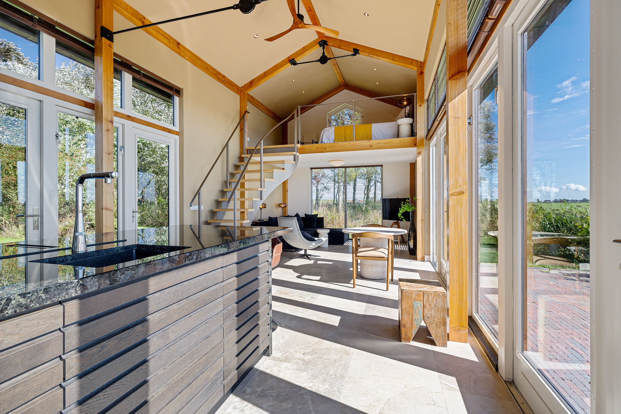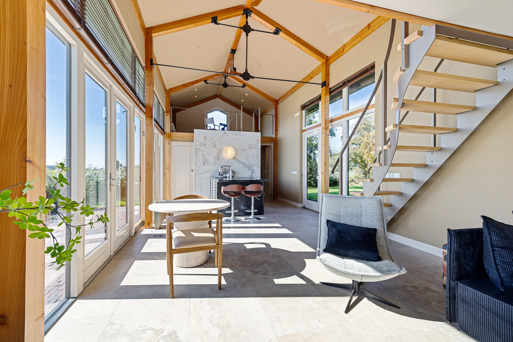 The separate guesthouse, completed in 2021, features French doors opening to handmade terraces, high ceilings with exposed Douglas beams, and an open-plan kitchen beneath a mezzanine. Underfloor heating, smart home lighting, and large HR++ windows heighten the sense of comfort and connection with the outdoors. Two versatile lofts offer options for sleeping, working, or studio pursuits. Throughout, architectural restraint and natural light set a cadence attuned to the peaceful setting.