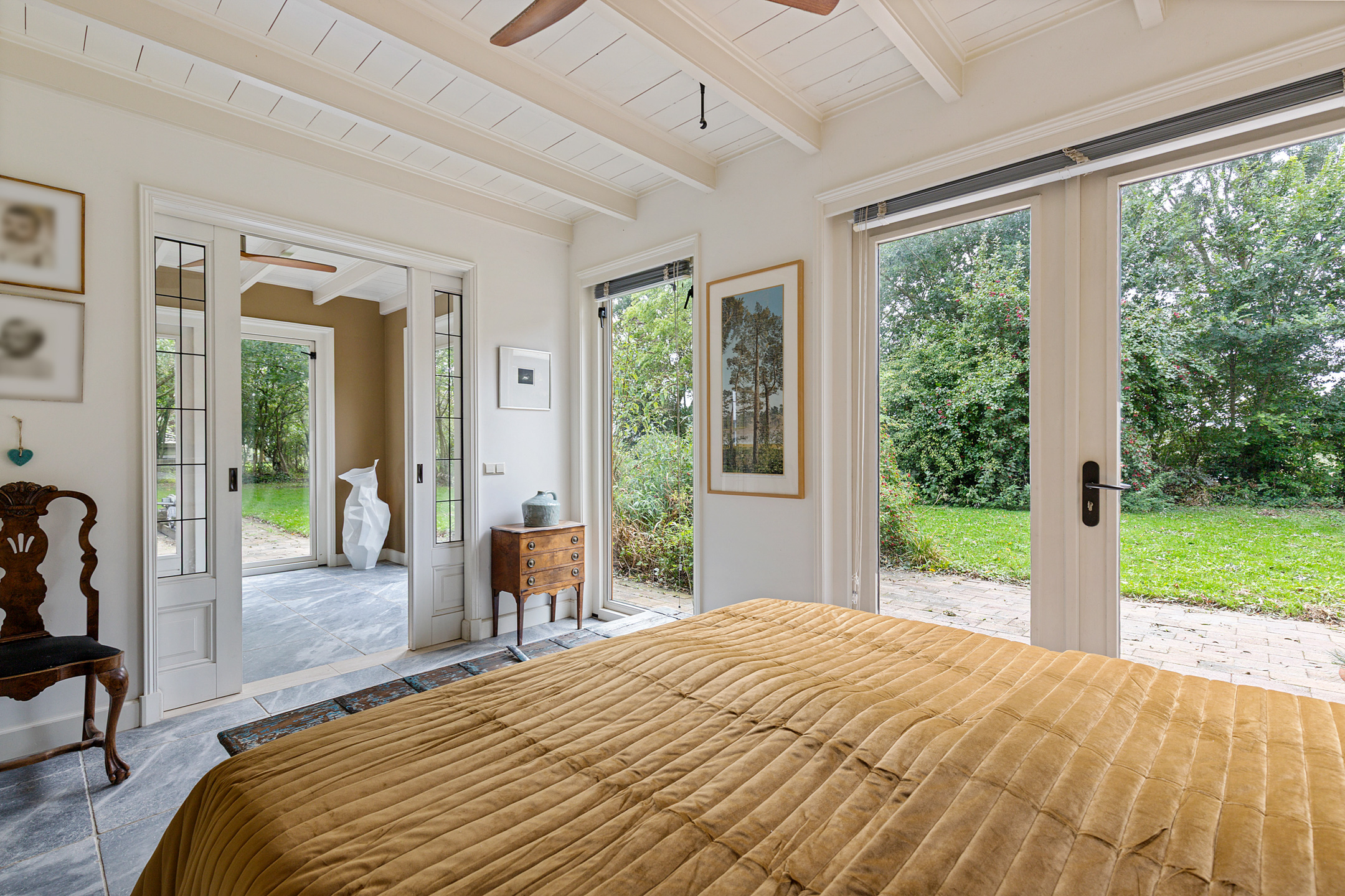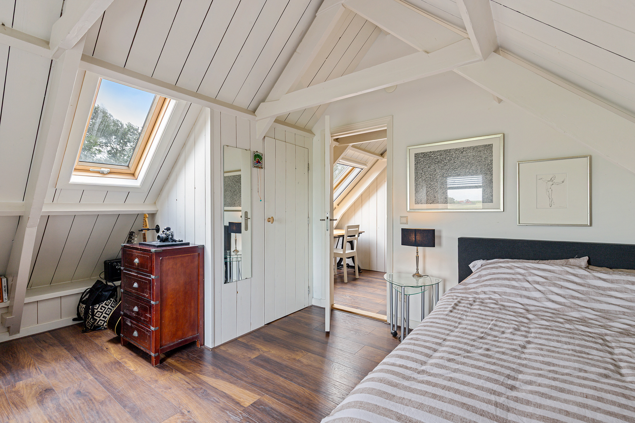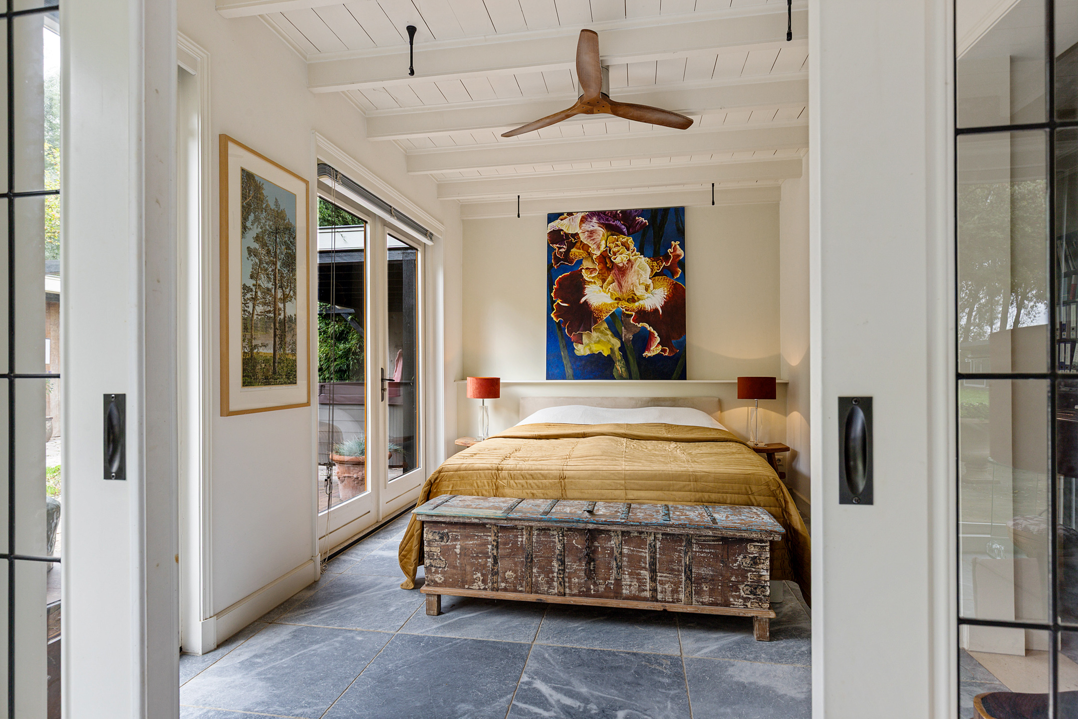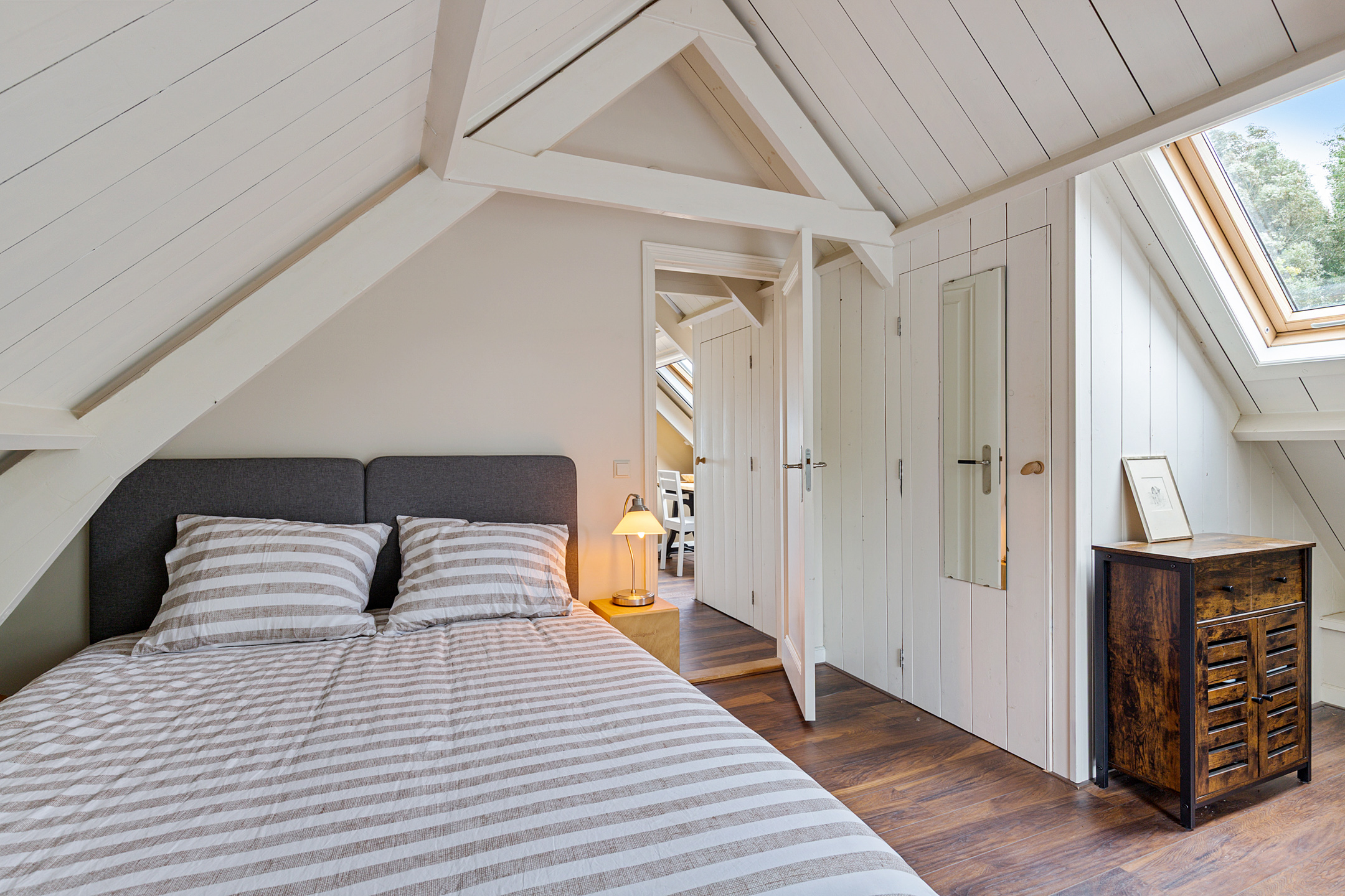 The separate guesthouse, completed in 2021, features French doors opening to handmade terraces, high ceilings with exposed Douglas beams, and an open-plan kitchen beneath a mezzanine. Underfloor heating, smart home lighting, and large HR++ windows heighten the sense of comfort and connection with the outdoors. Two versatile lofts offer options for sleeping, working, or studio pursuits. Throughout, architectural restraint and natural light set a cadence attuned to the peaceful setting.