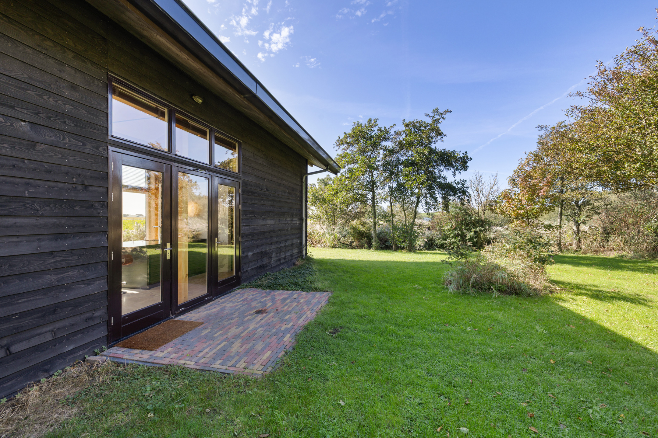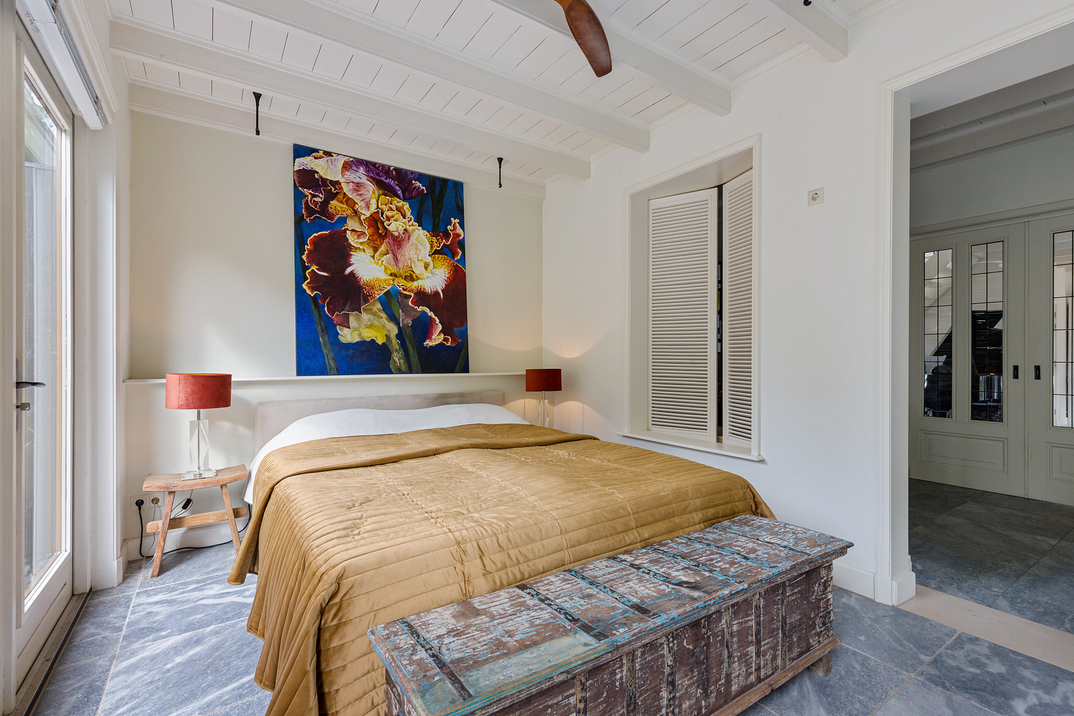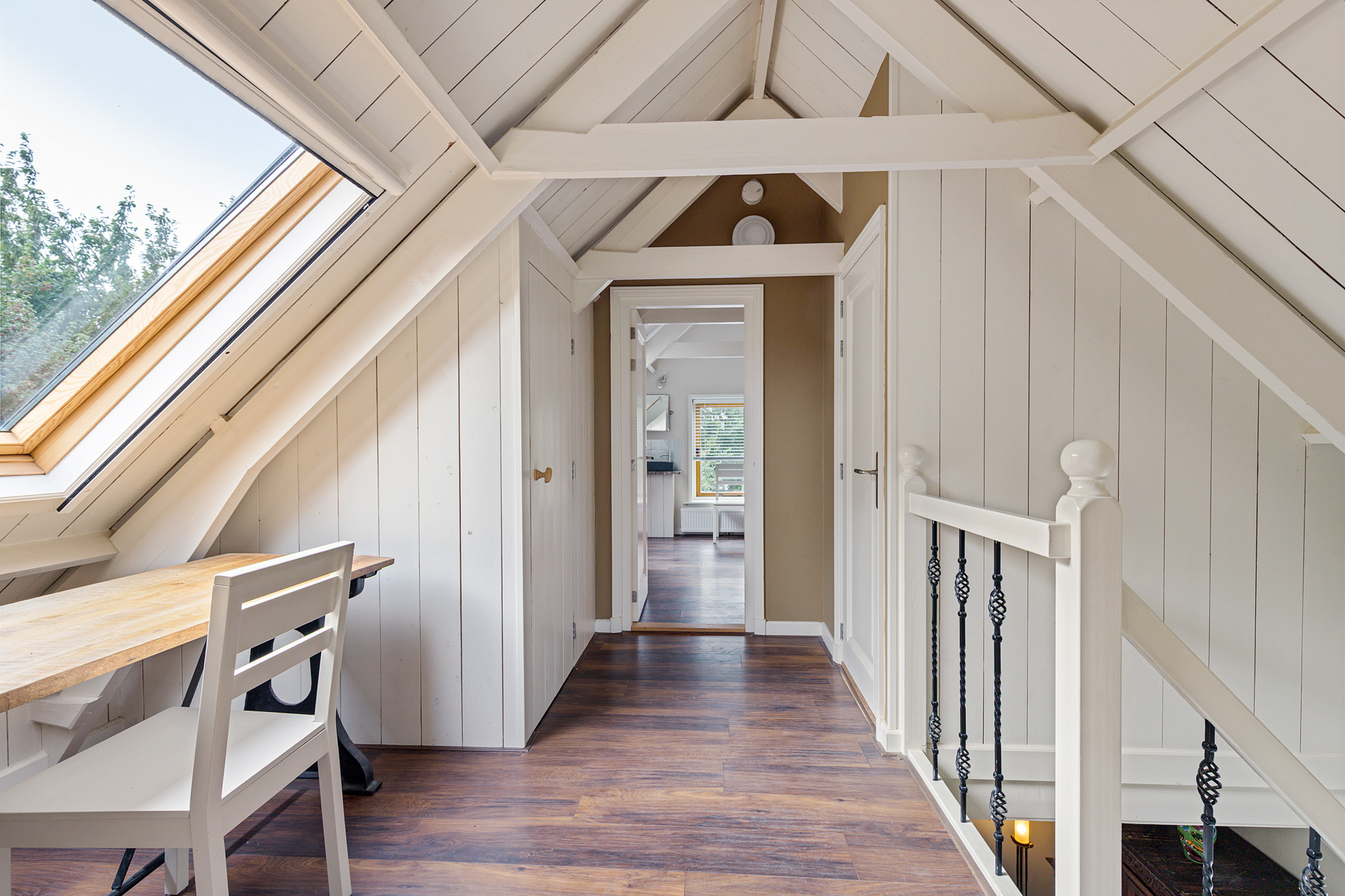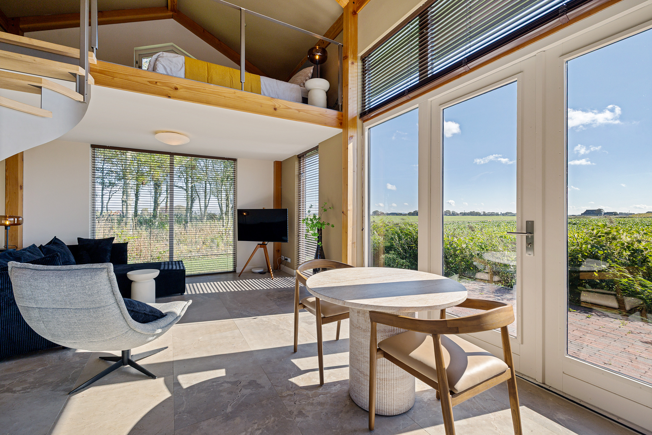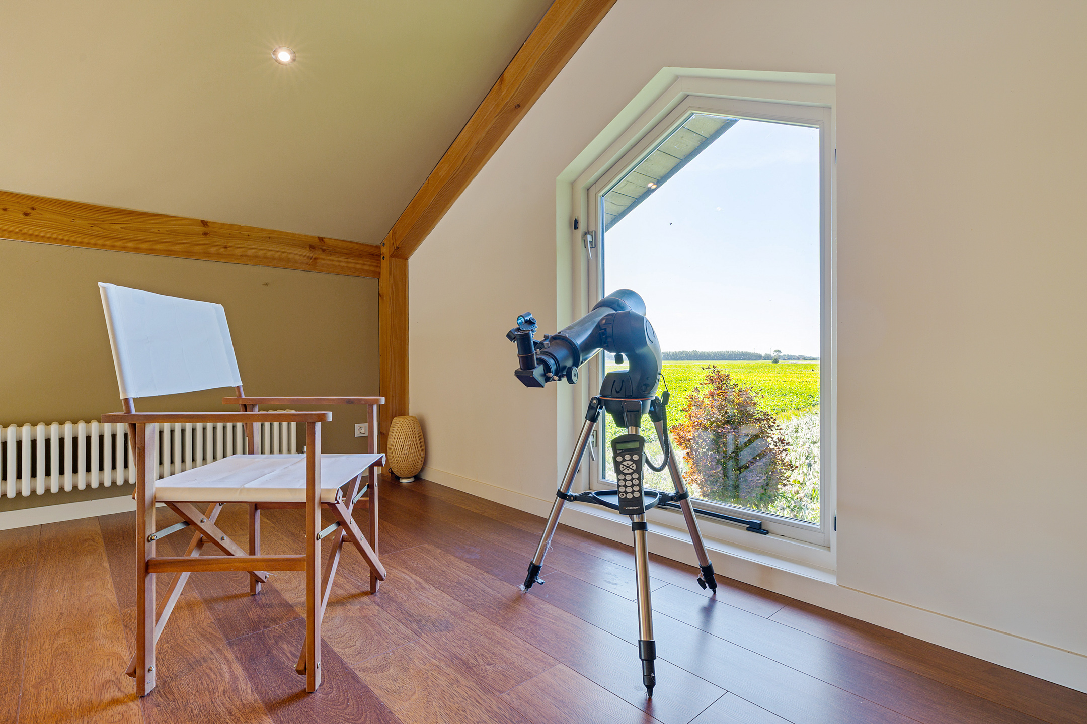 The separate guesthouse, completed in 2021, features French doors opening to handmade terraces, high ceilings with exposed Douglas beams, and an open-plan kitchen beneath a mezzanine. Underfloor heating, smart home lighting, and large HR++ windows heighten the sense of comfort and connection with the outdoors. Two versatile lofts offer options for sleeping, working, or studio pursuits. Throughout, architectural restraint and natural light set a cadence attuned to the peaceful setting.