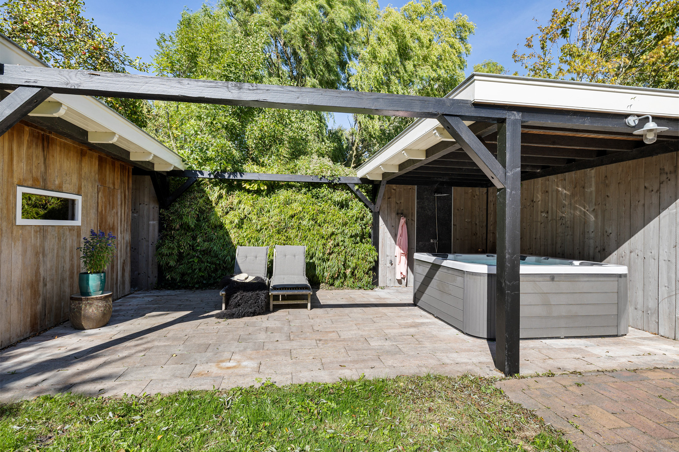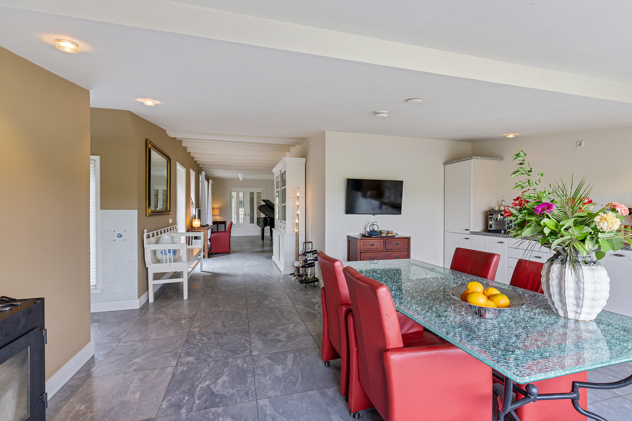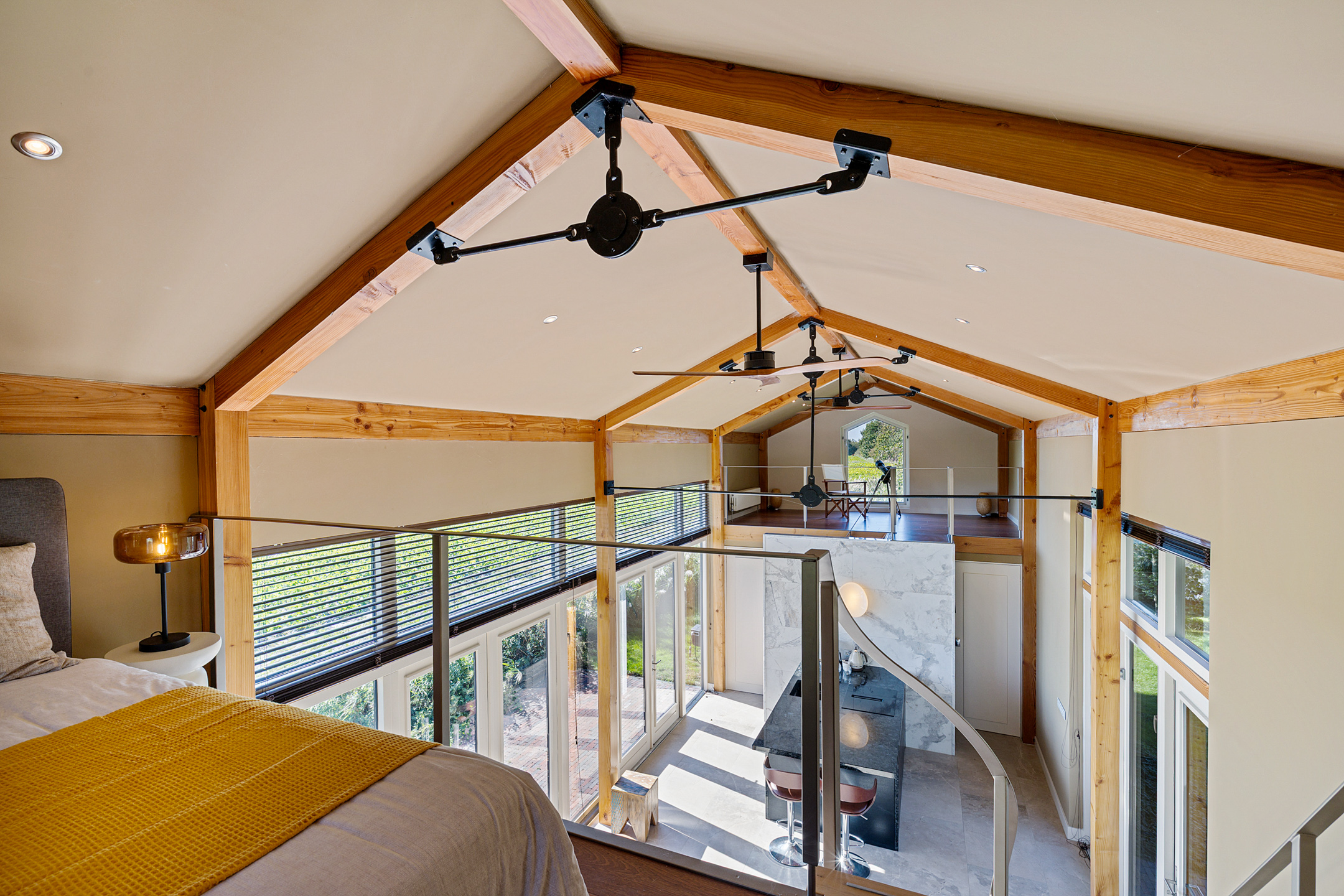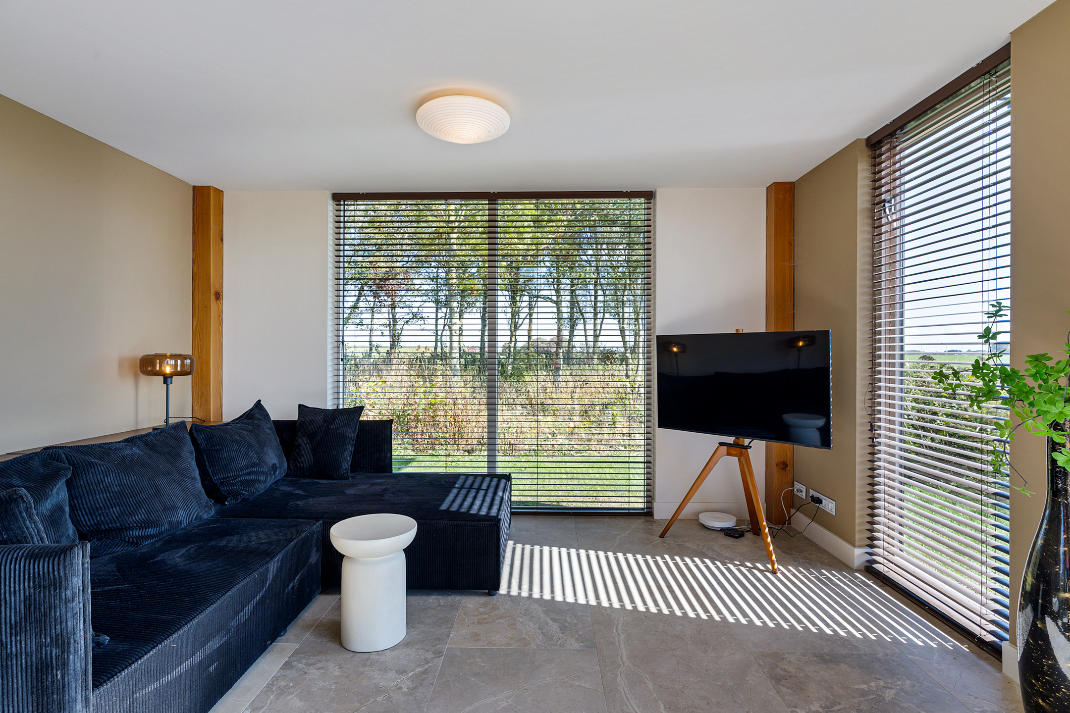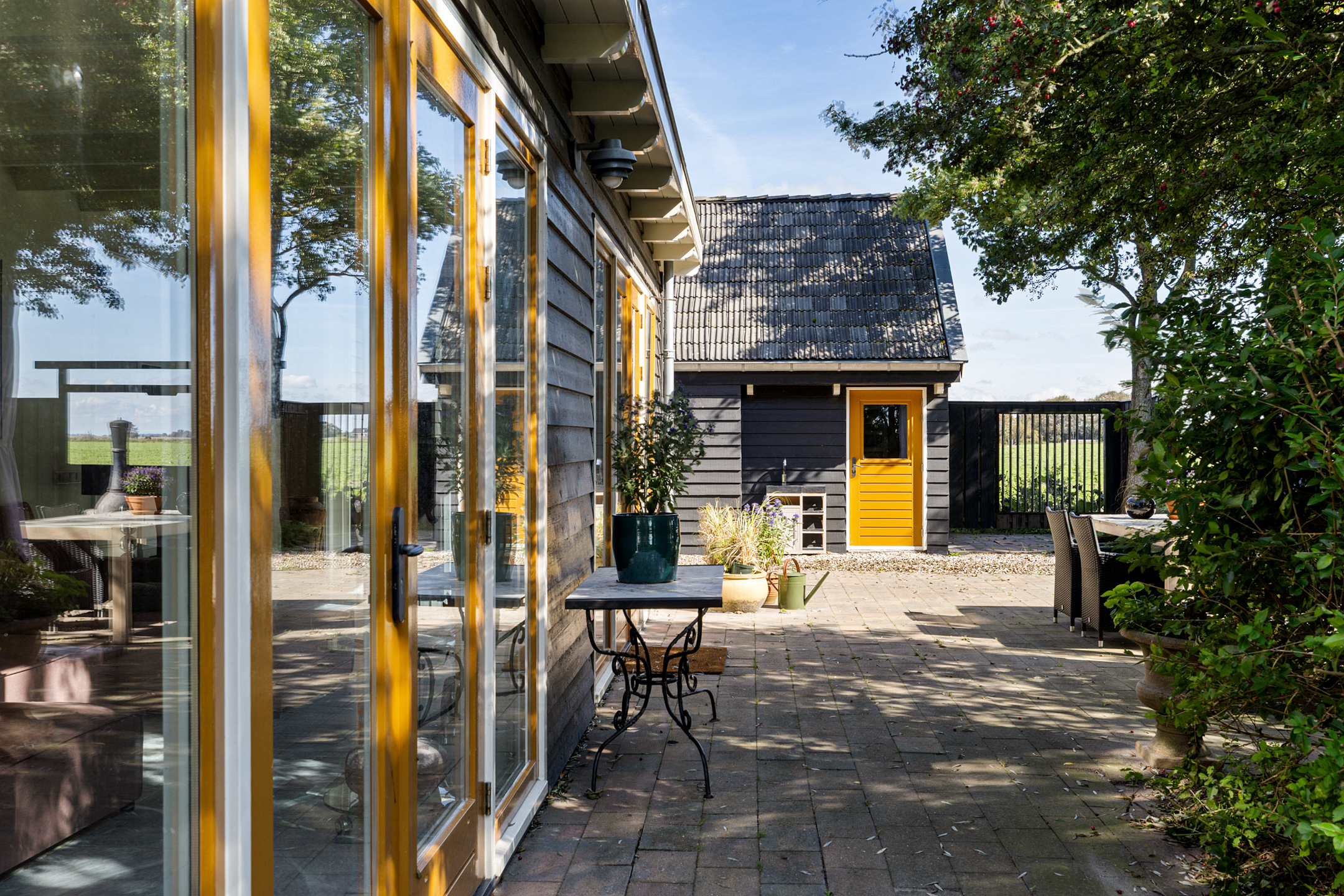 The separate guesthouse, completed in 2021, features French doors opening to handmade terraces, high ceilings with exposed Douglas beams, and an open-plan kitchen beneath a mezzanine. Underfloor heating, smart home lighting, and large HR++ windows heighten the sense of comfort and connection with the outdoors. Two versatile lofts offer options for sleeping, working, or studio pursuits. Throughout, architectural restraint and natural light set a cadence attuned to the peaceful setting.