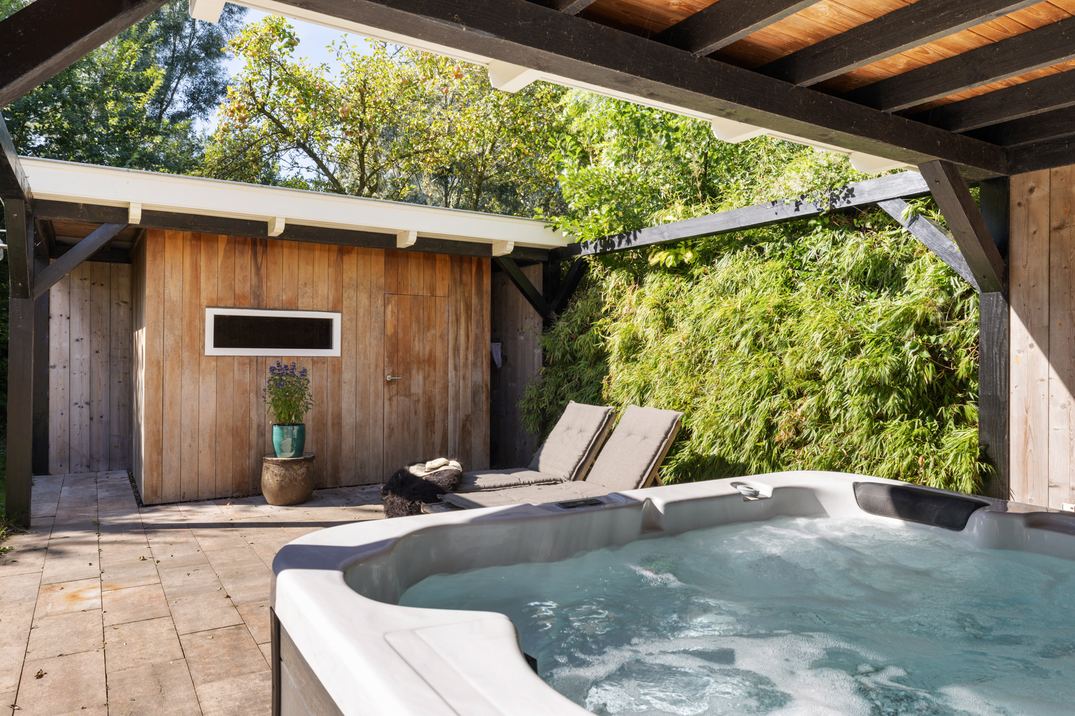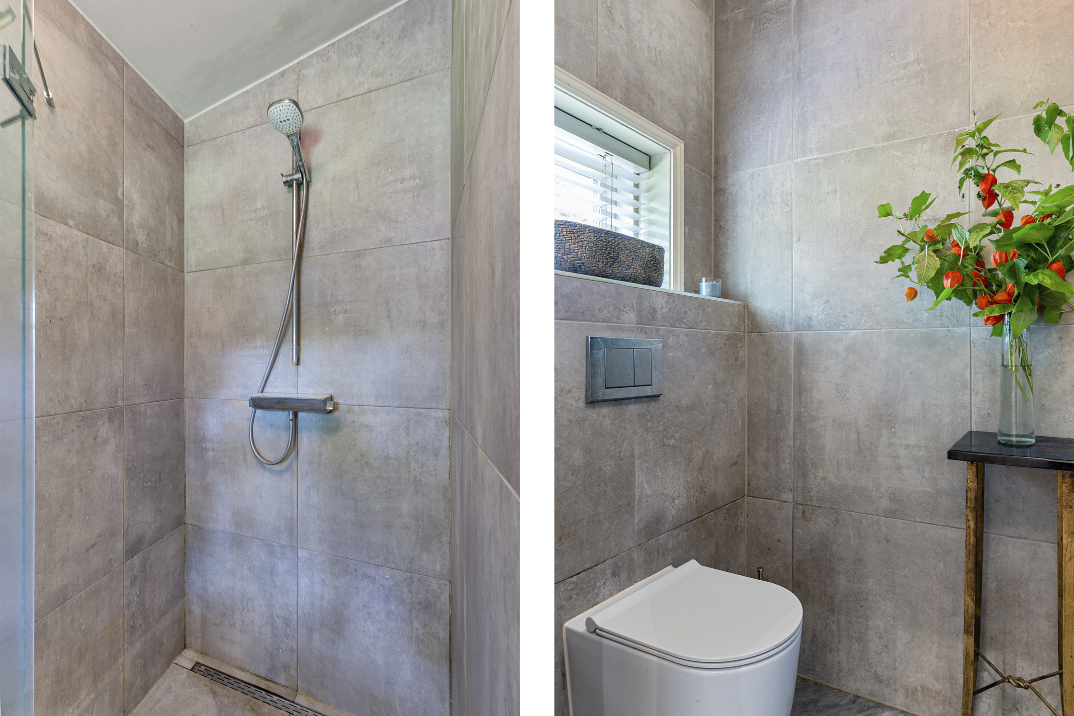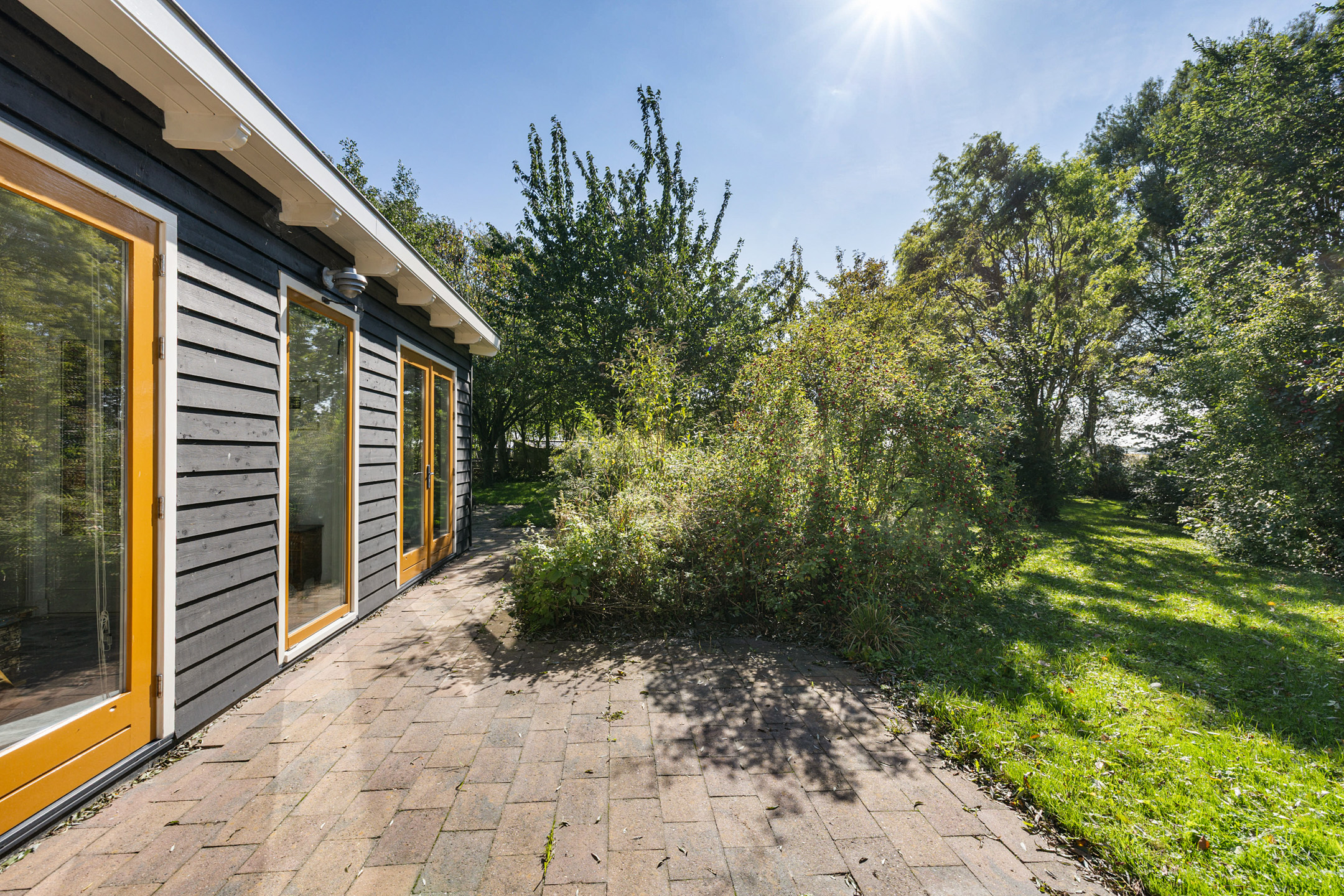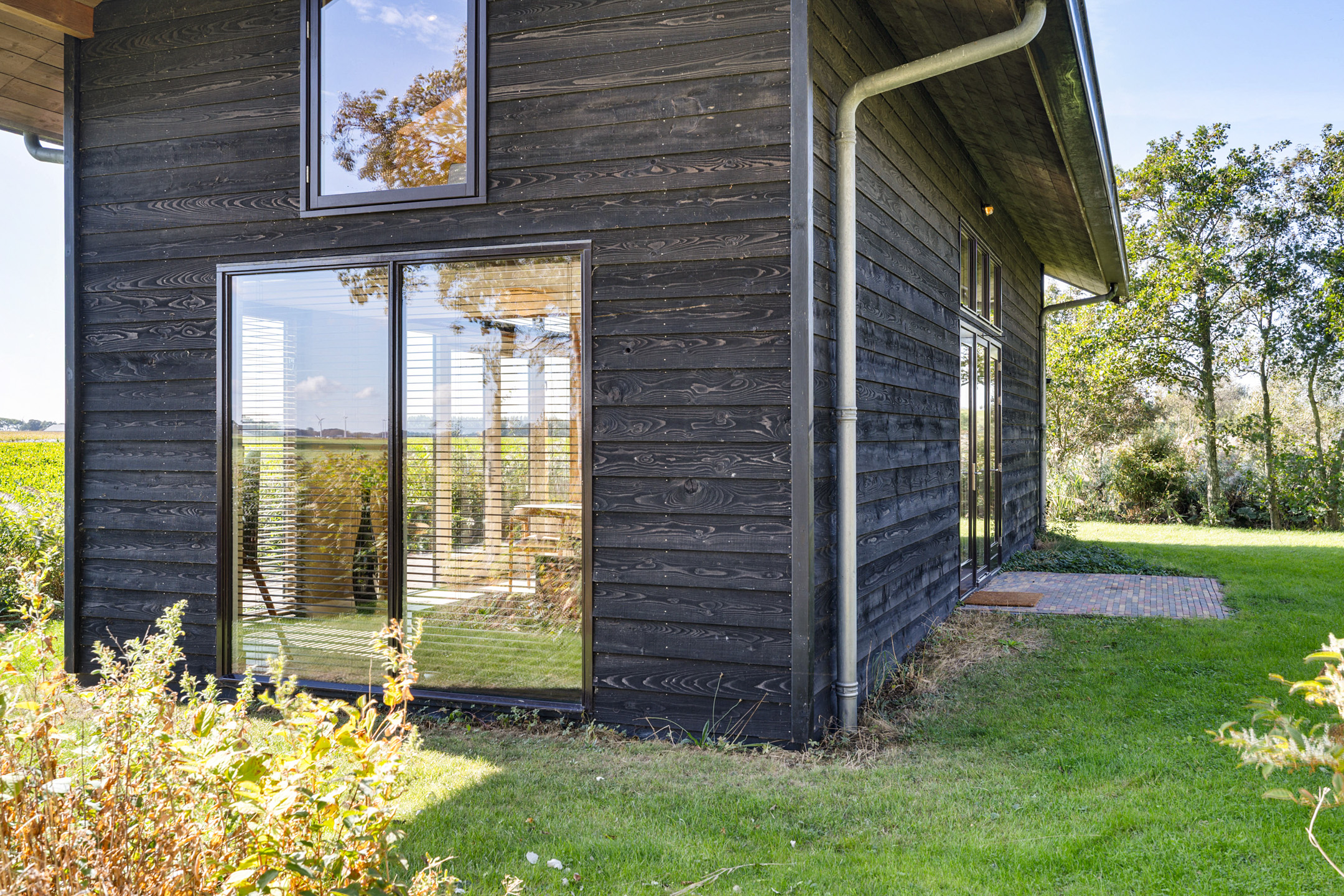 The separate guesthouse, completed in 2021, features French doors opening to handmade terraces, high ceilings with exposed Douglas beams, and an open-plan kitchen beneath a mezzanine. Underfloor heating, smart home lighting, and large HR++ windows heighten the sense of comfort and connection with the outdoors. Two versatile lofts offer options for sleeping, working, or studio pursuits. Throughout, architectural restraint and natural light set a cadence attuned to the peaceful setting.