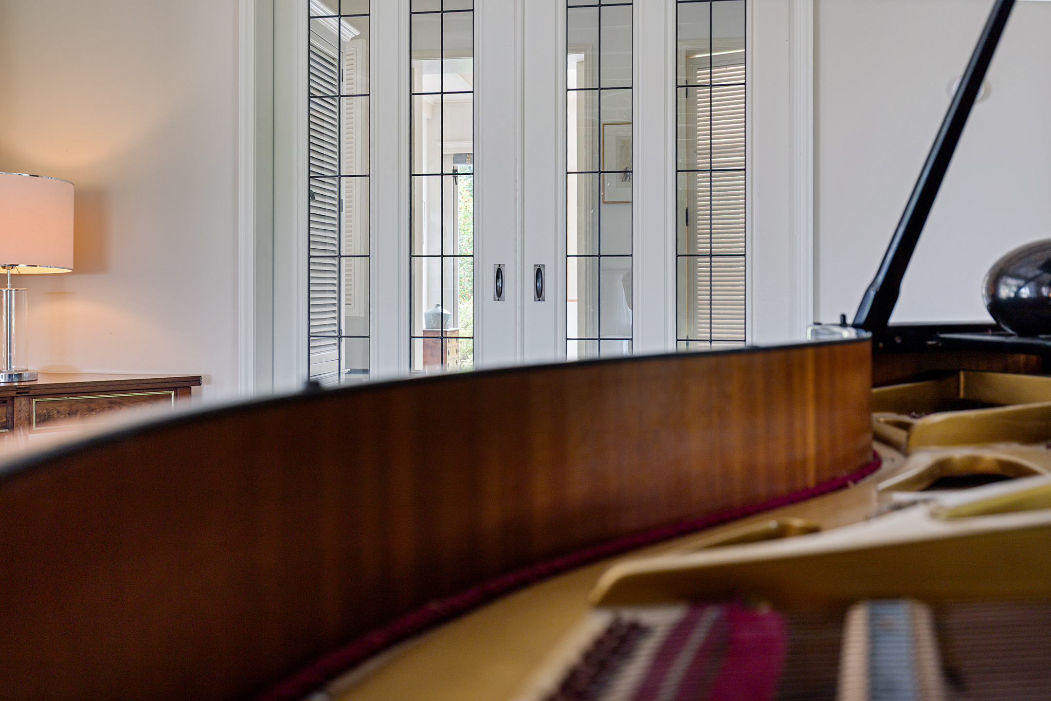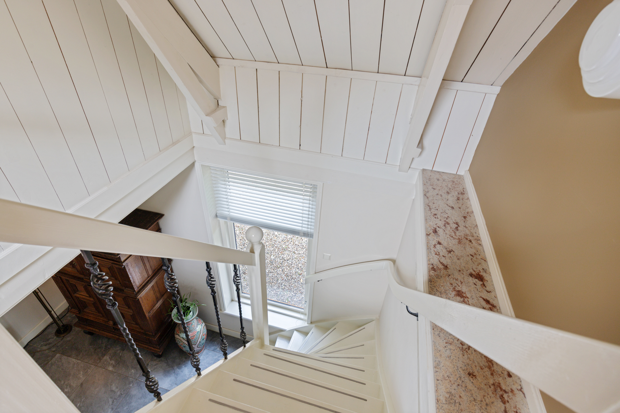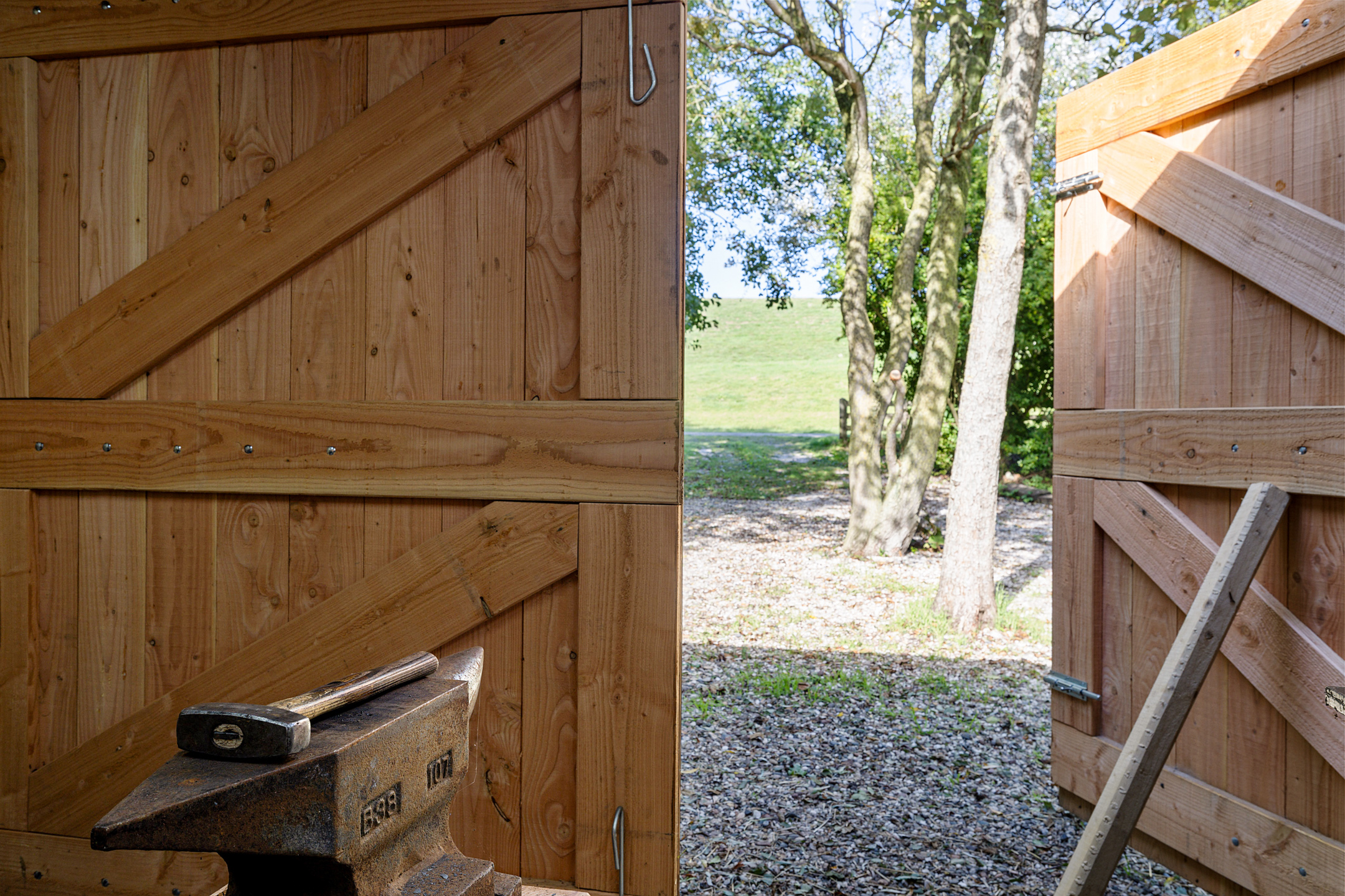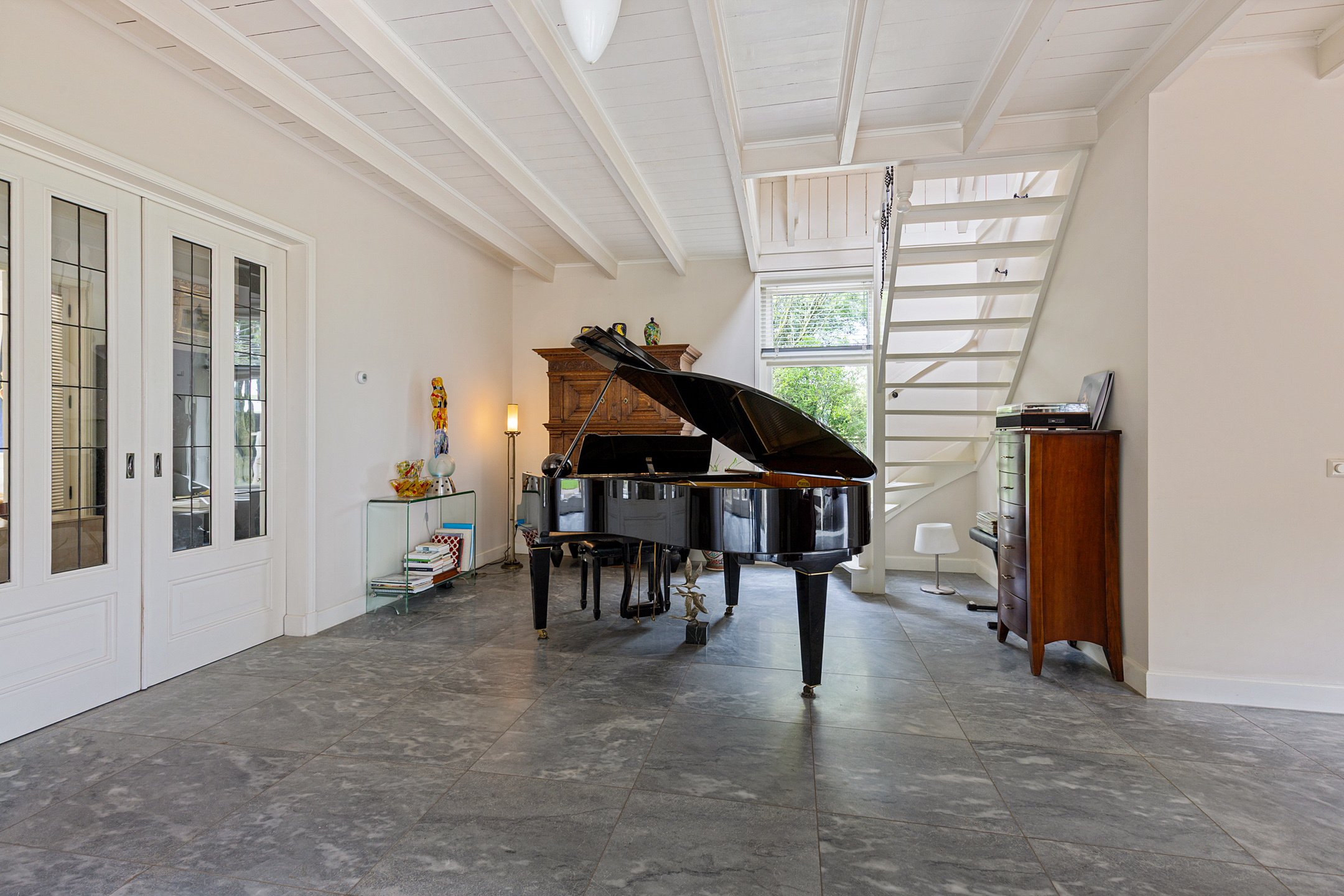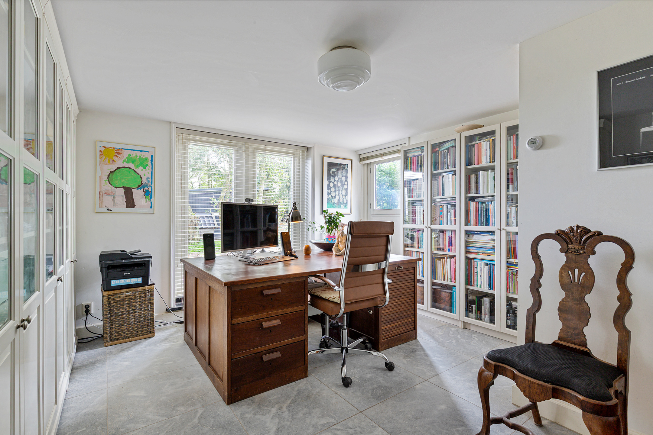 The separate guesthouse, completed in 2021, features French doors opening to handmade terraces, high ceilings with exposed Douglas beams, and an open-plan kitchen beneath a mezzanine. Underfloor heating, smart home lighting, and large HR++ windows heighten the sense of comfort and connection with the outdoors. Two versatile lofts offer options for sleeping, working, or studio pursuits. Throughout, architectural restraint and natural light set a cadence attuned to the peaceful setting.