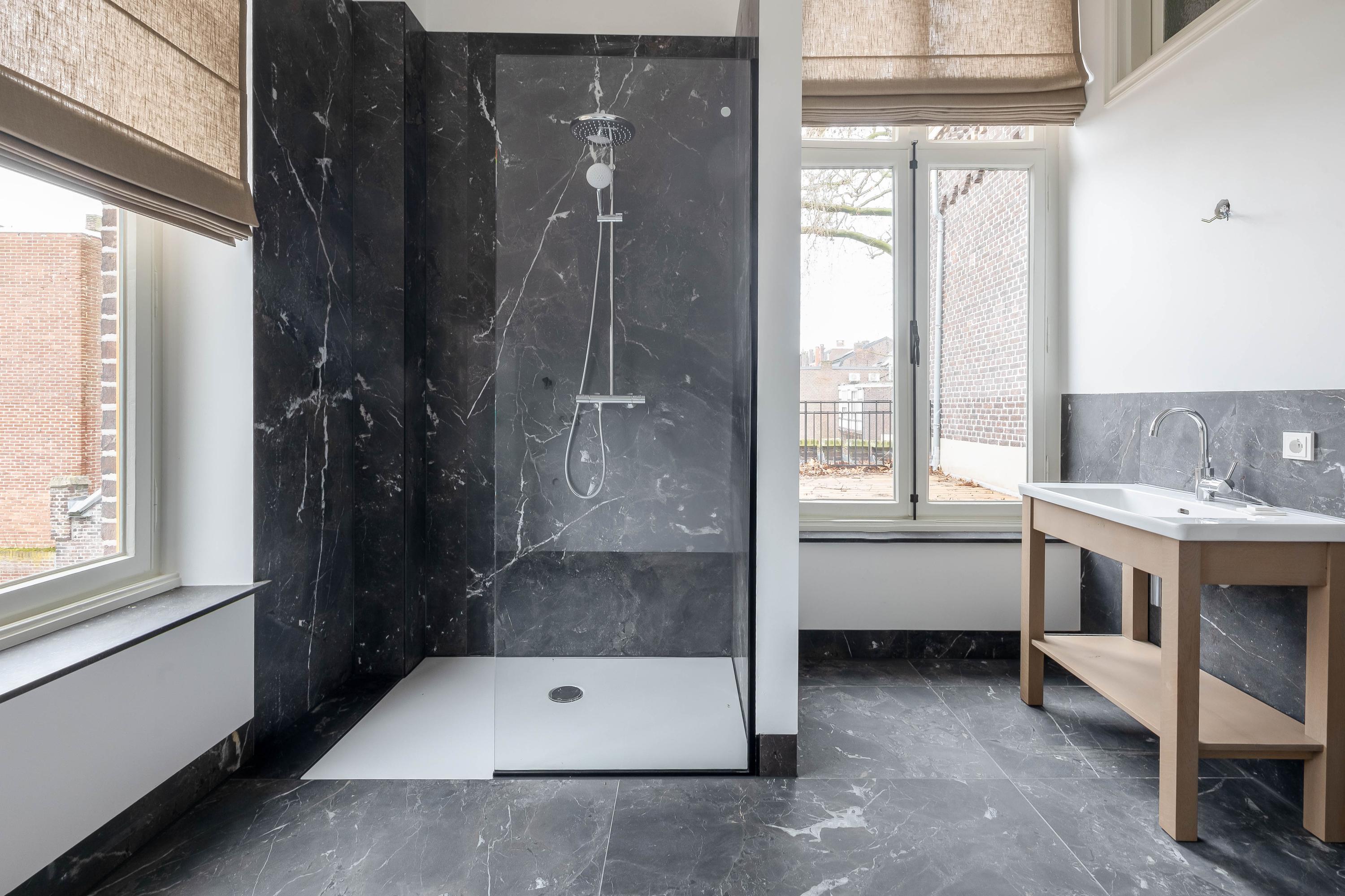 • A luxury bathroom with modern finishes and high-quality materials, including a walk-in shower and stylish sanitary fittings.