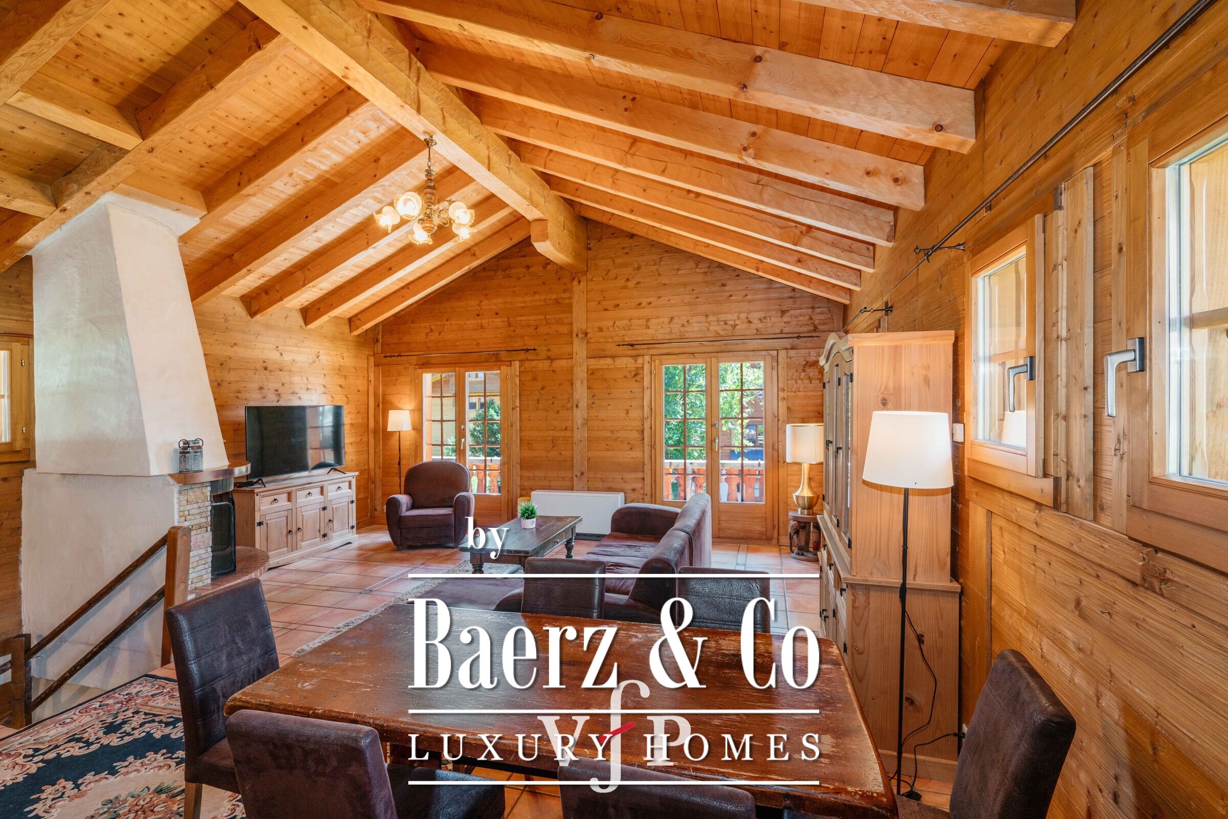 open-plan kitchen and of a large living room with fireplace and south balcony at the 1st floor. An attractive terrace as well as a green outside come to complete the property. Situated in a quiet environment, this chalet suits perfectly to a family. It also has an outside parking place.