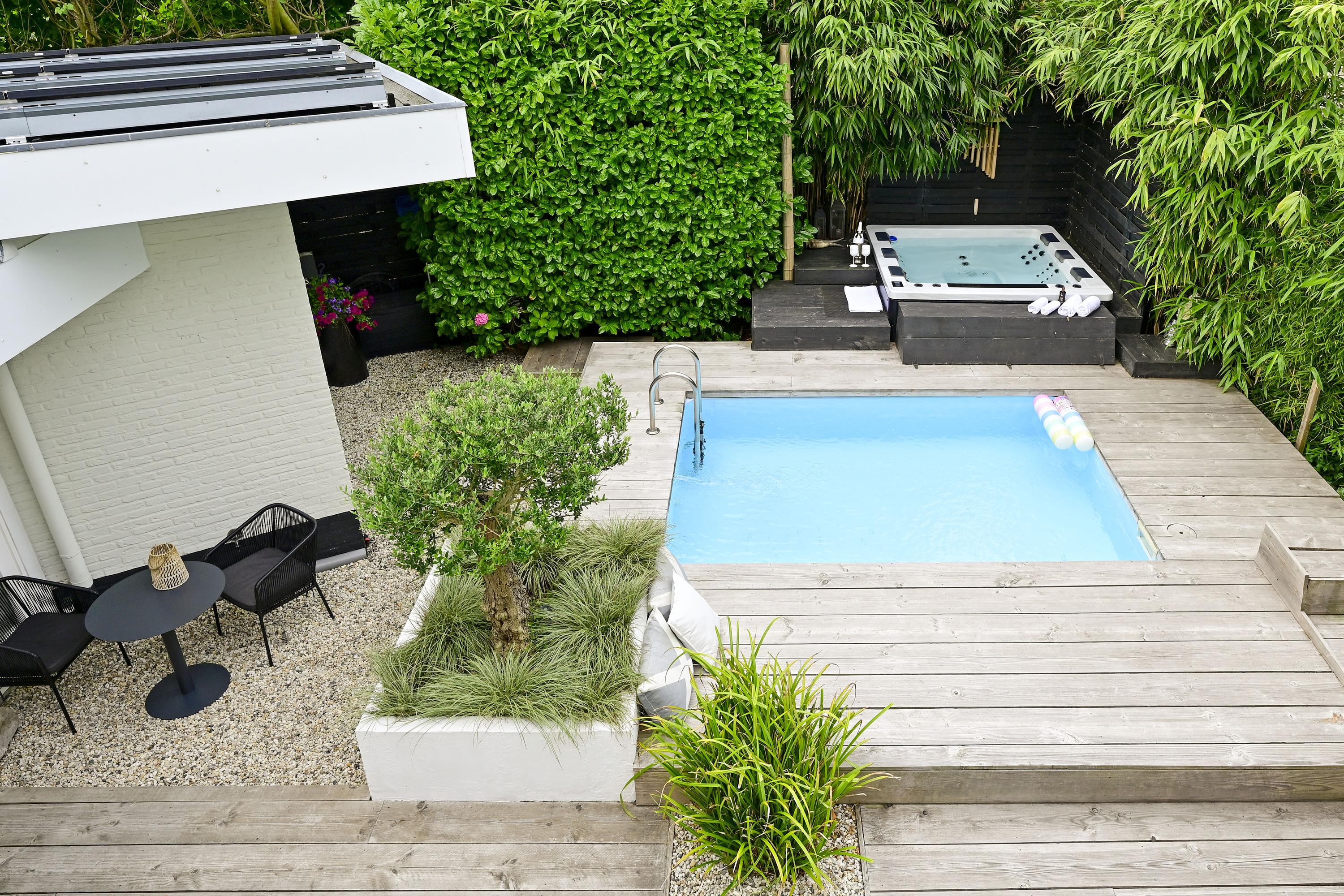 Private spa area in the garden: pool, jacuzzi, built-in lounge bench