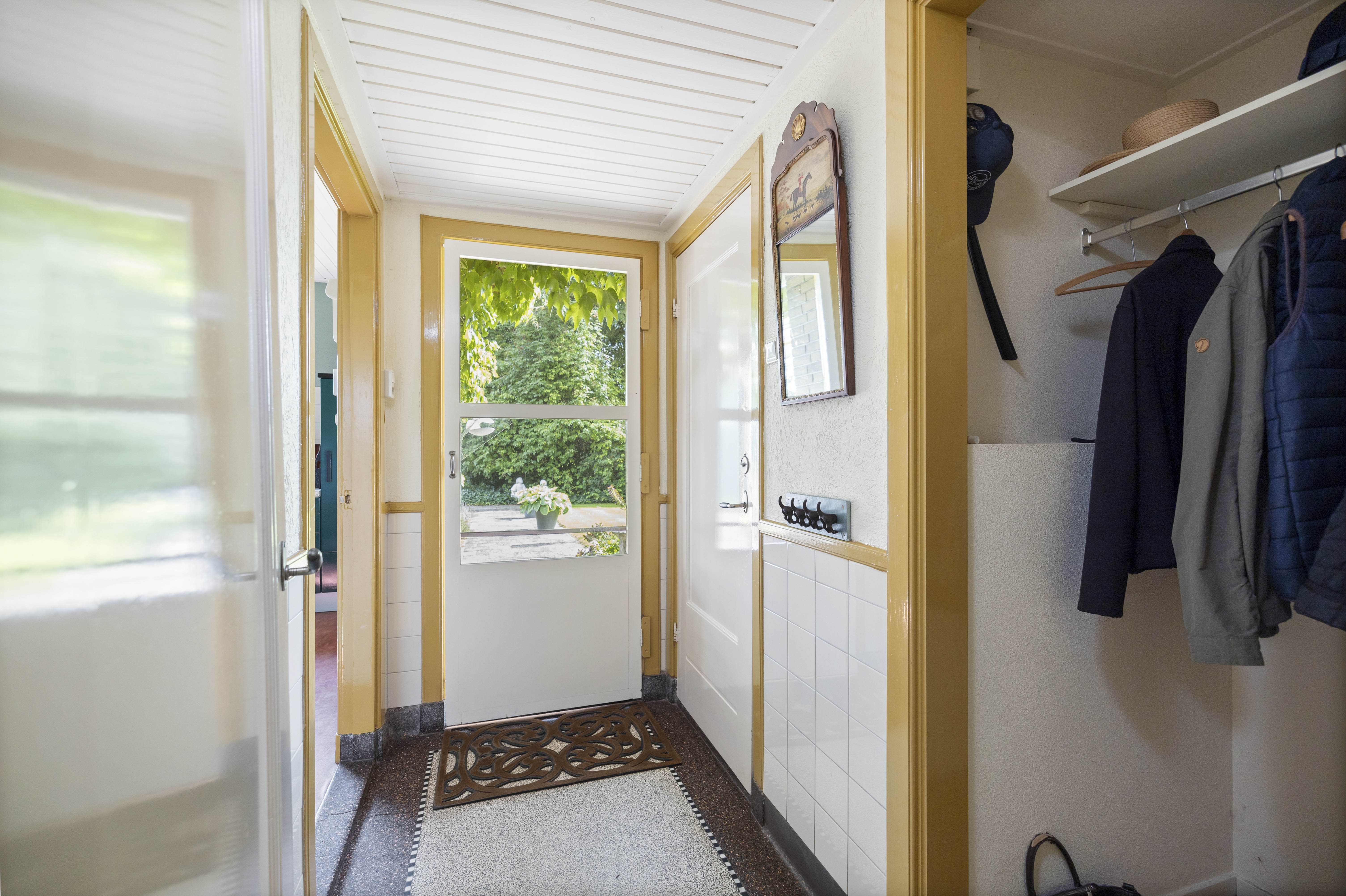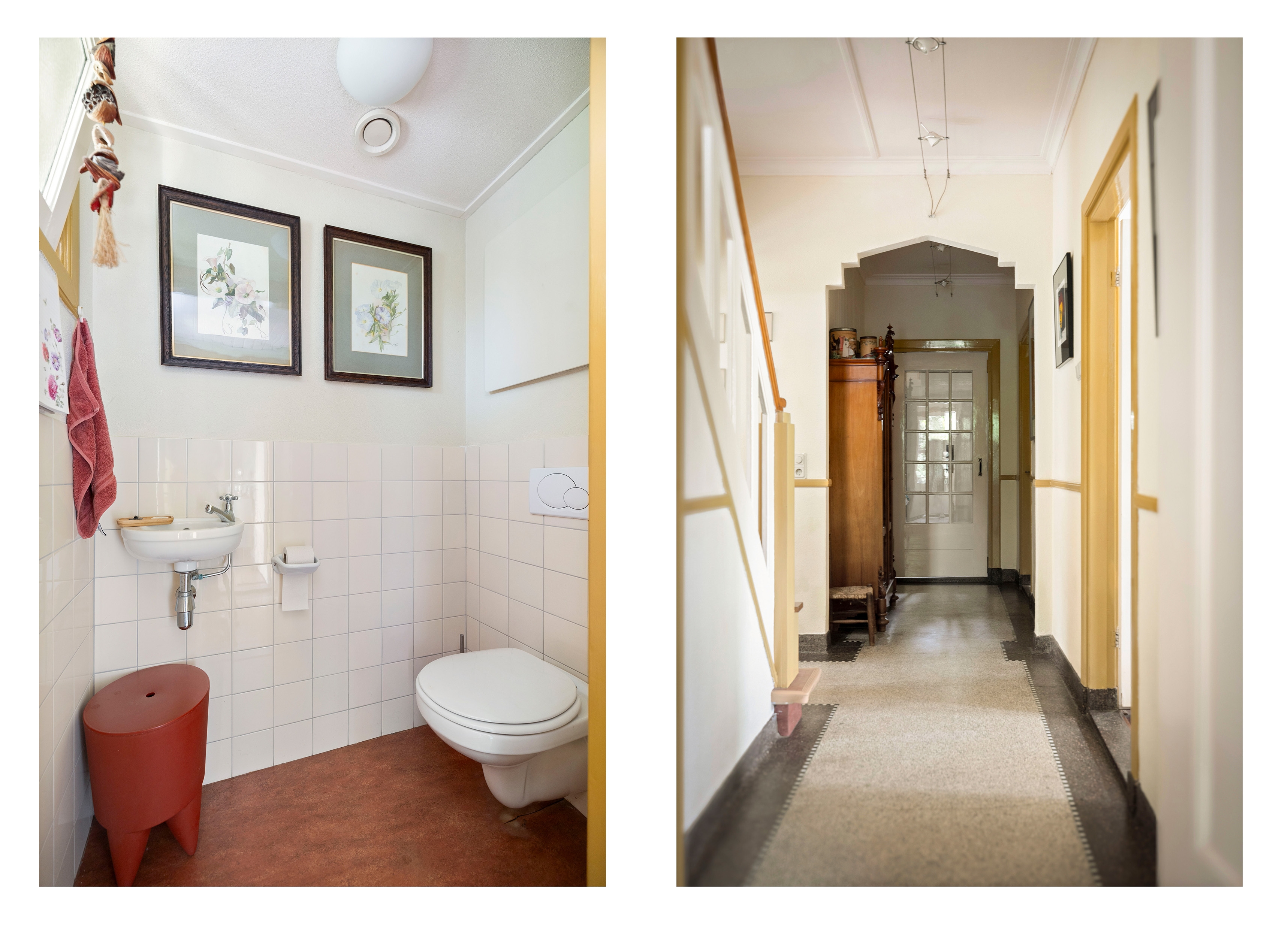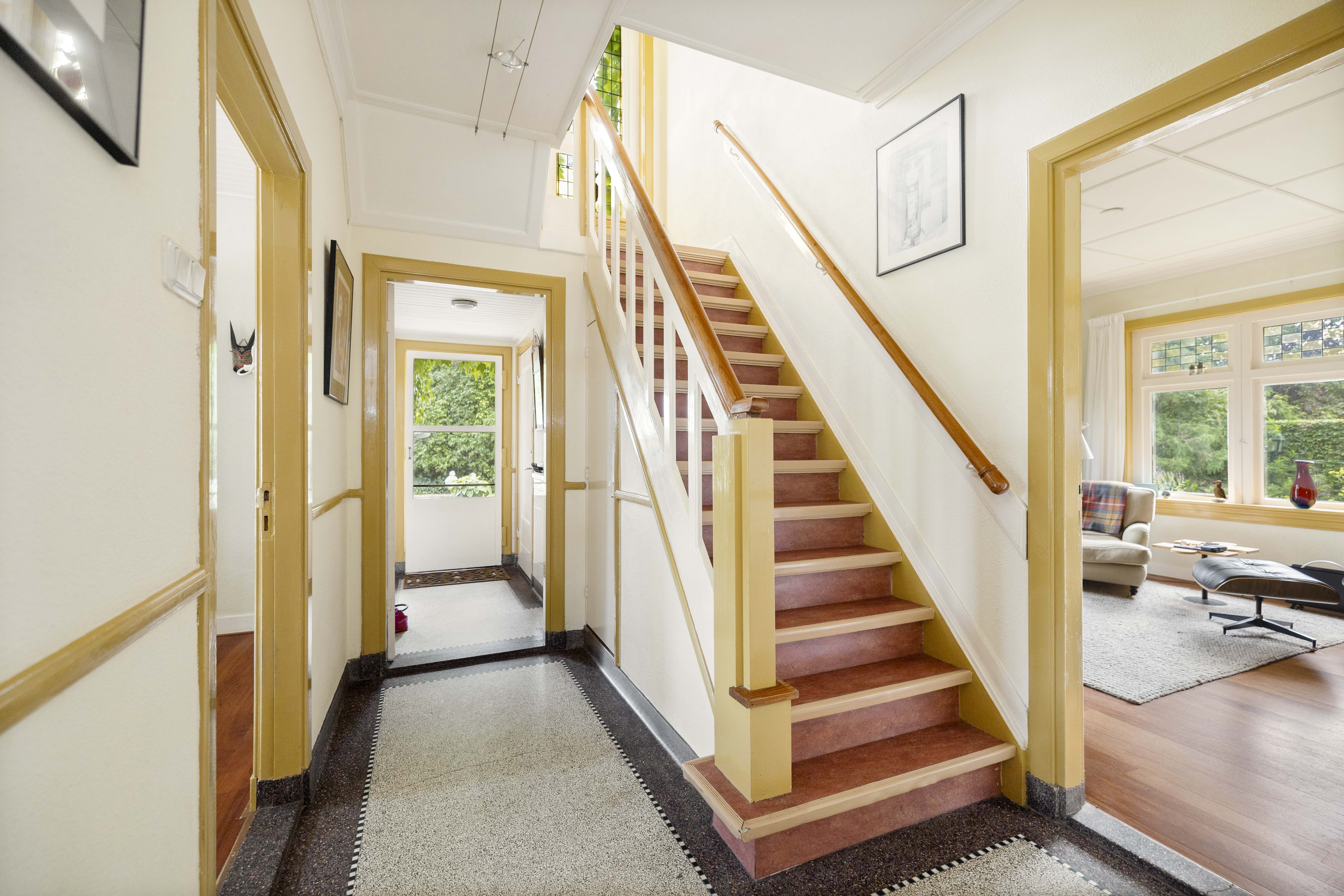 Entrance at the front. There is a classic vestibule leading to the central hall with its stepped passageway. The spacious hall with its beautiful original terrazzo floor is light and sunny and provides access to the living rooms, the staircase to the upper floors and the storage cellar.