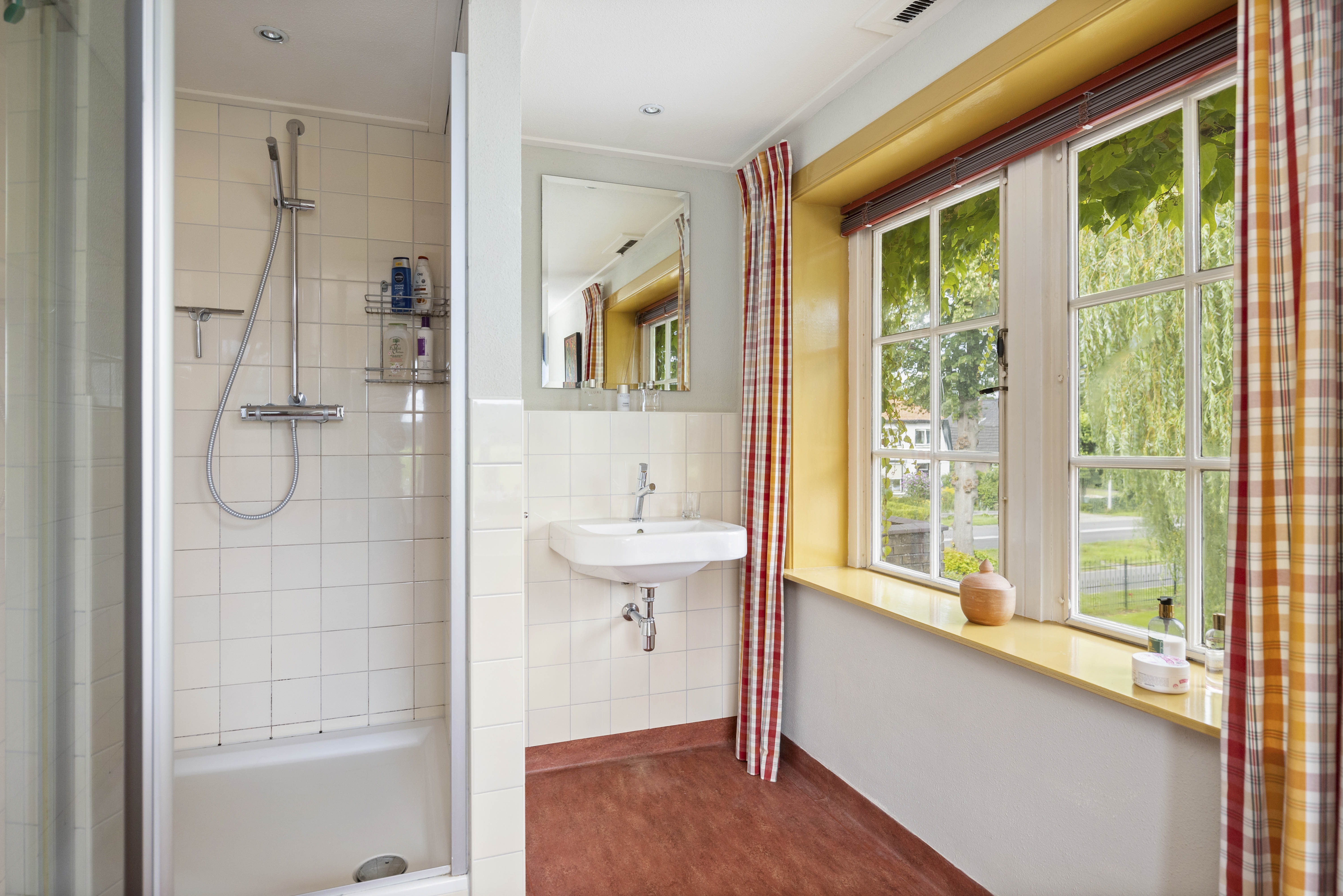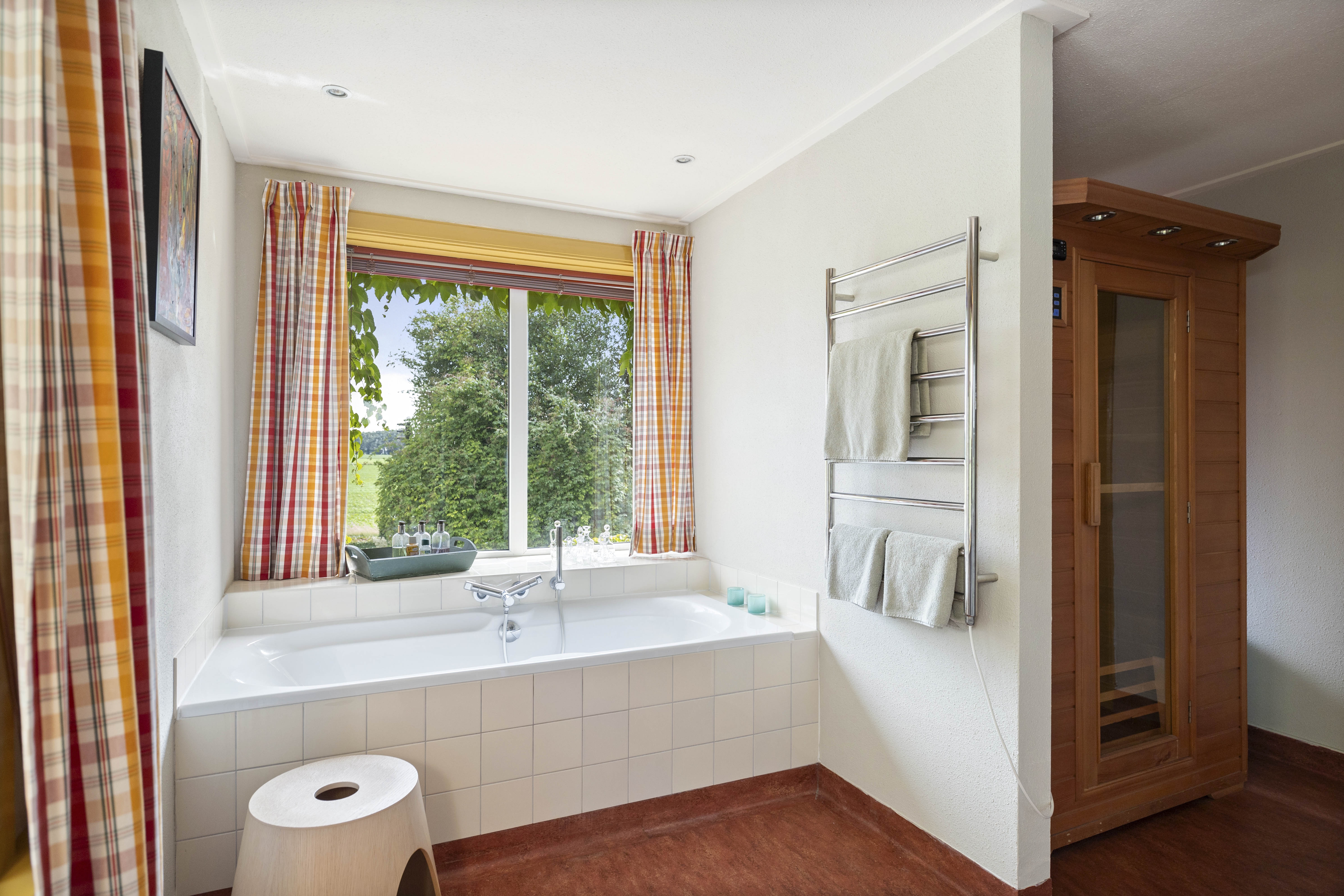 The bathroom is delightful, with a bathtub with a view of the garden, a shower cubicle, two washbasins and a separate toilet in the hallway.