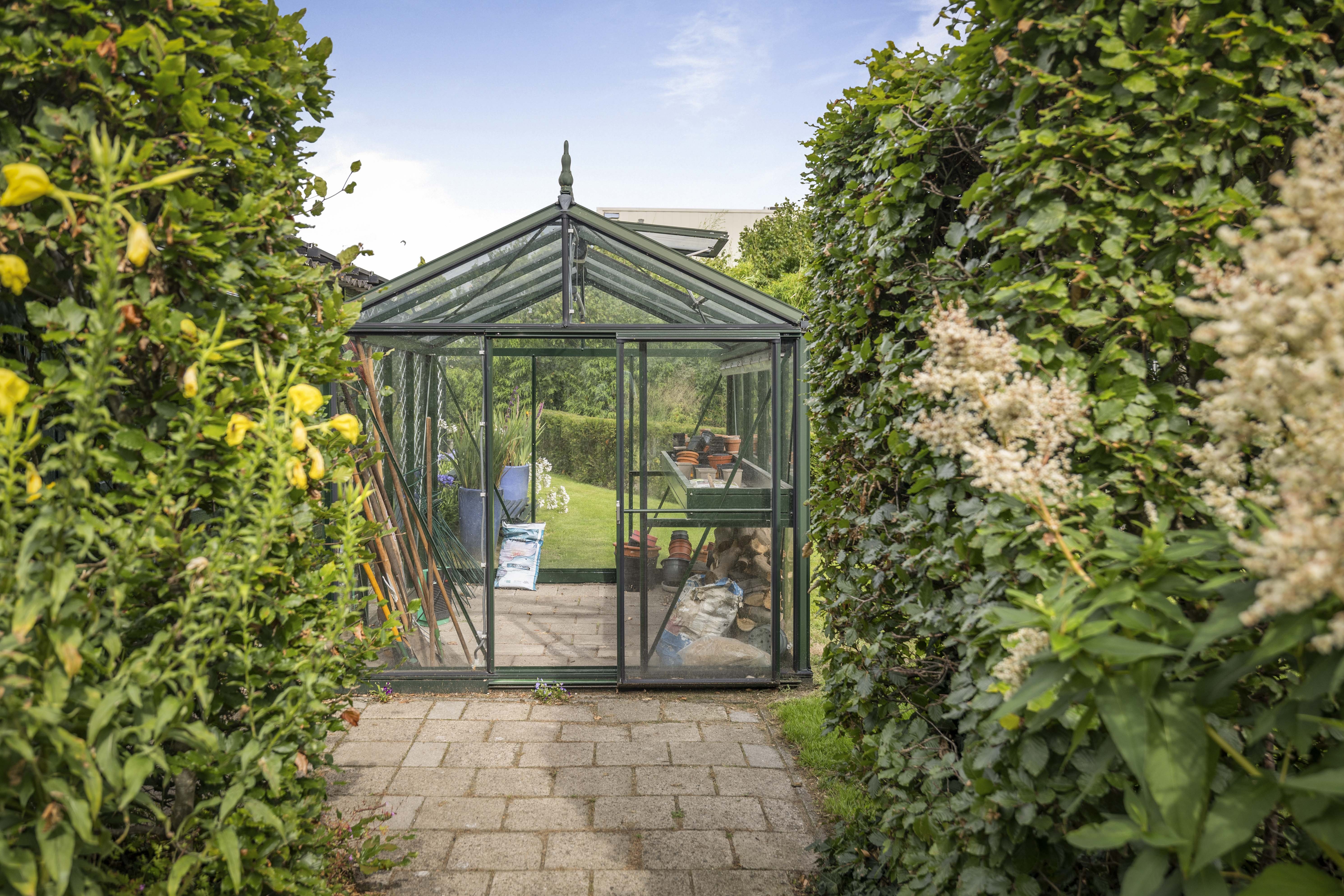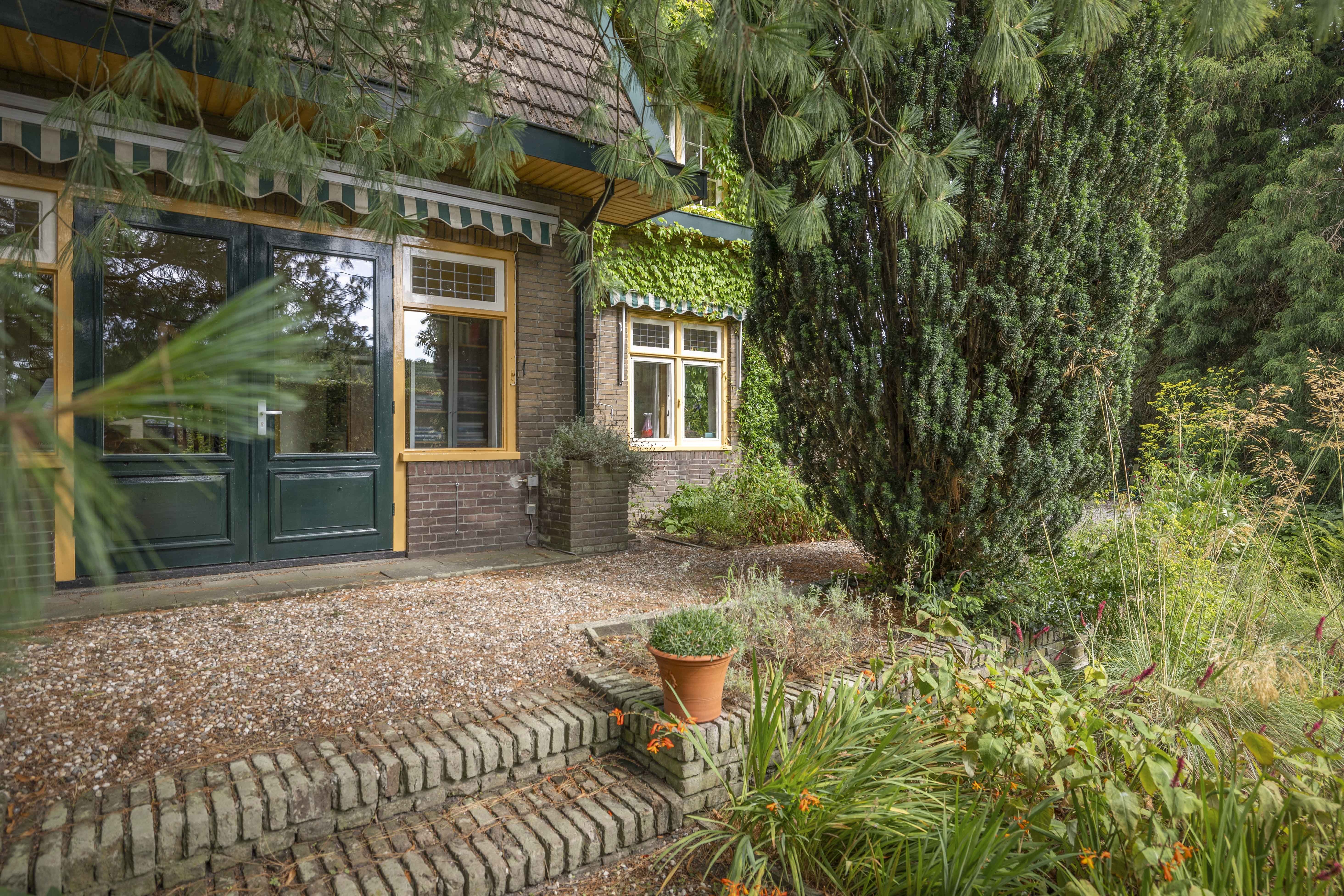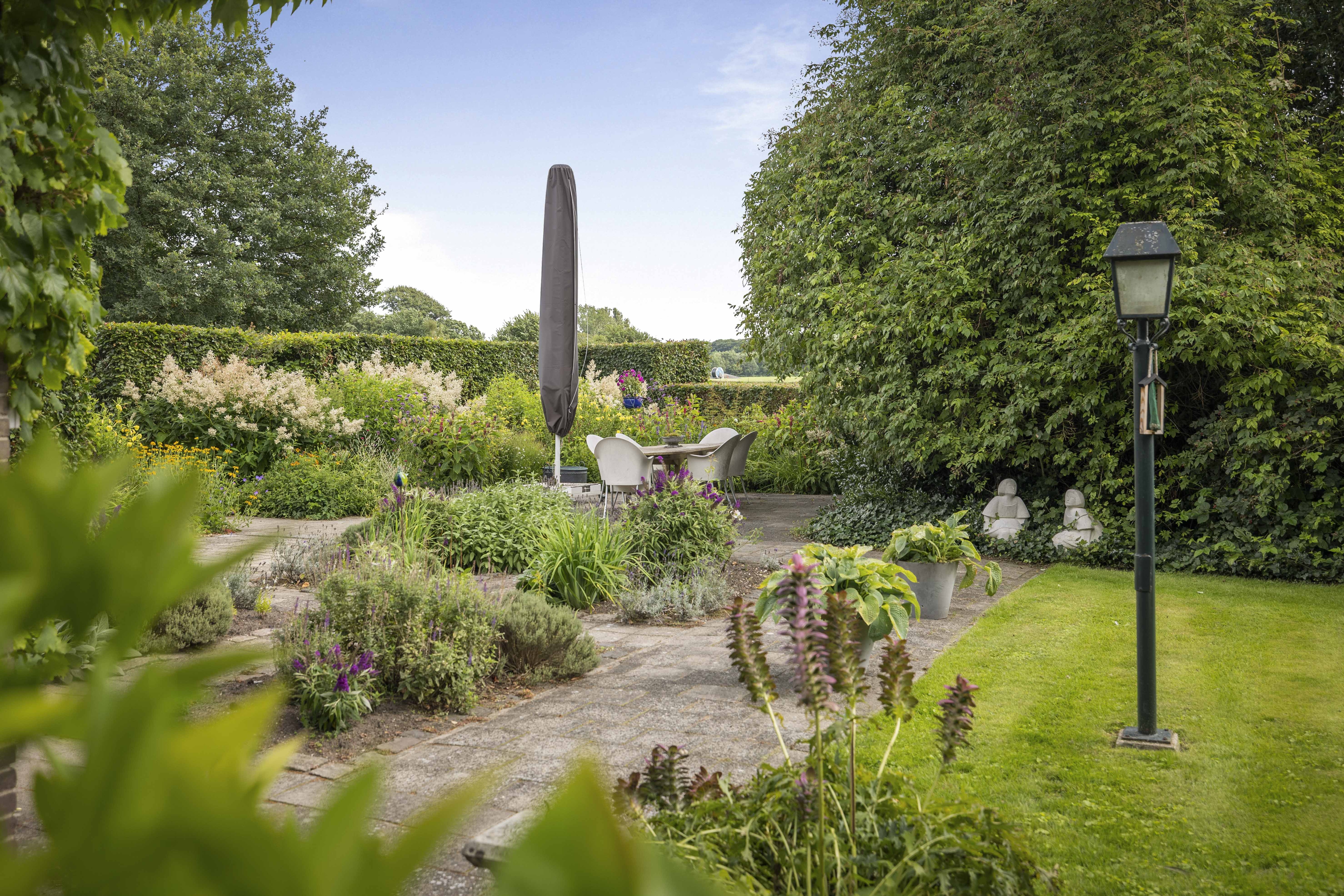 The house is surrounded by a beautiful garden. There is a wooden garage with an adjoining carport, providing space for two cars to be parked in the dry. Garden equipment can also be stored here neatly and sheltered. Due to the orientation of the house, there is a lovely sun terrace behind the property. There are cosy seating areas scattered throughout the garden. The plants are diverse, colourful and carefully chosen, making it a real treat for the senses. There are beautiful sightlines, a small flock of chickens in a cosy run and the dahlias can quietly awaken from their hibernation in the greenhouse. There are two water features and you will enjoy a great deal of privacy here thanks to the secluded location, the man-sized hedges and the mature trees.