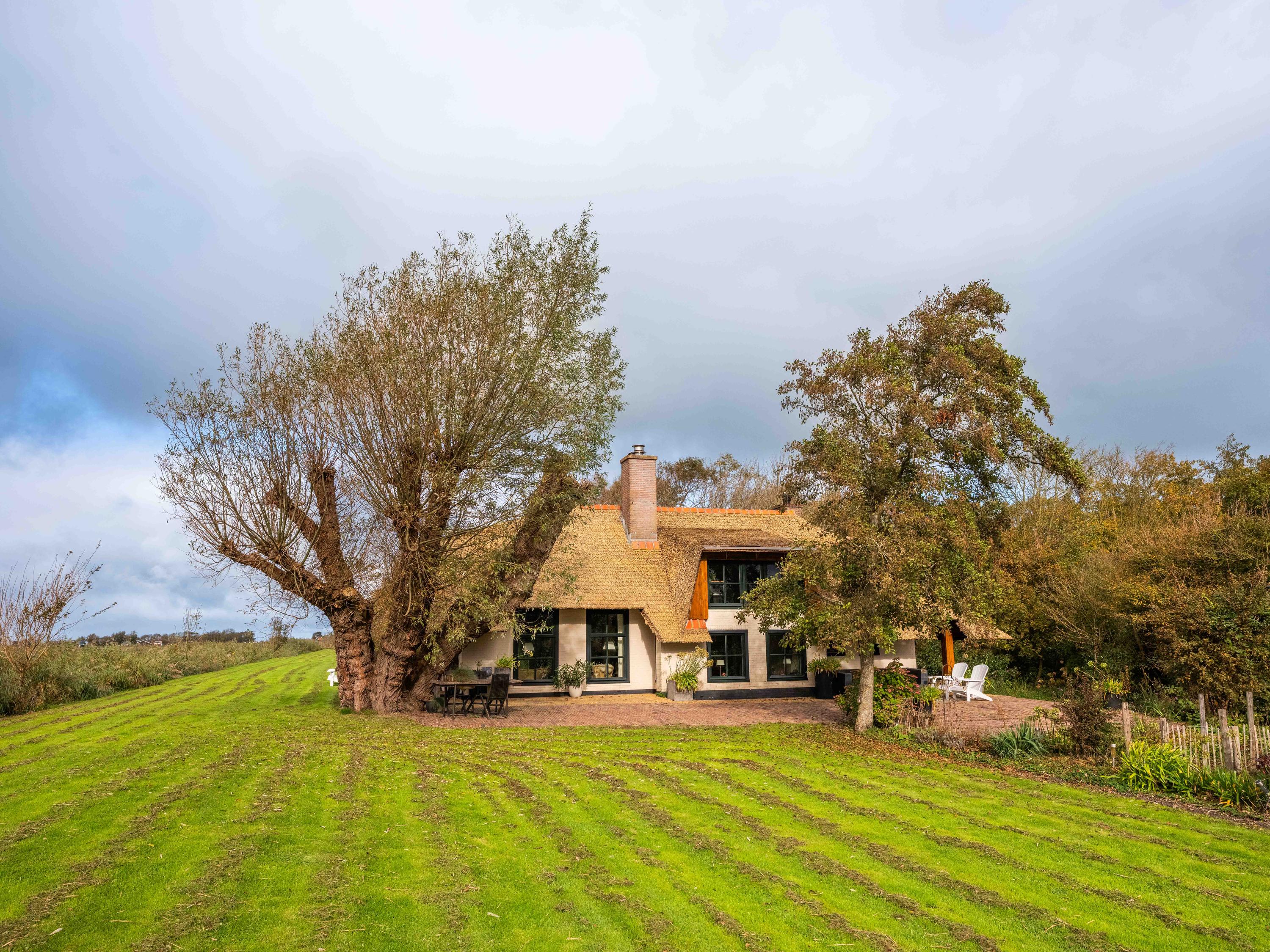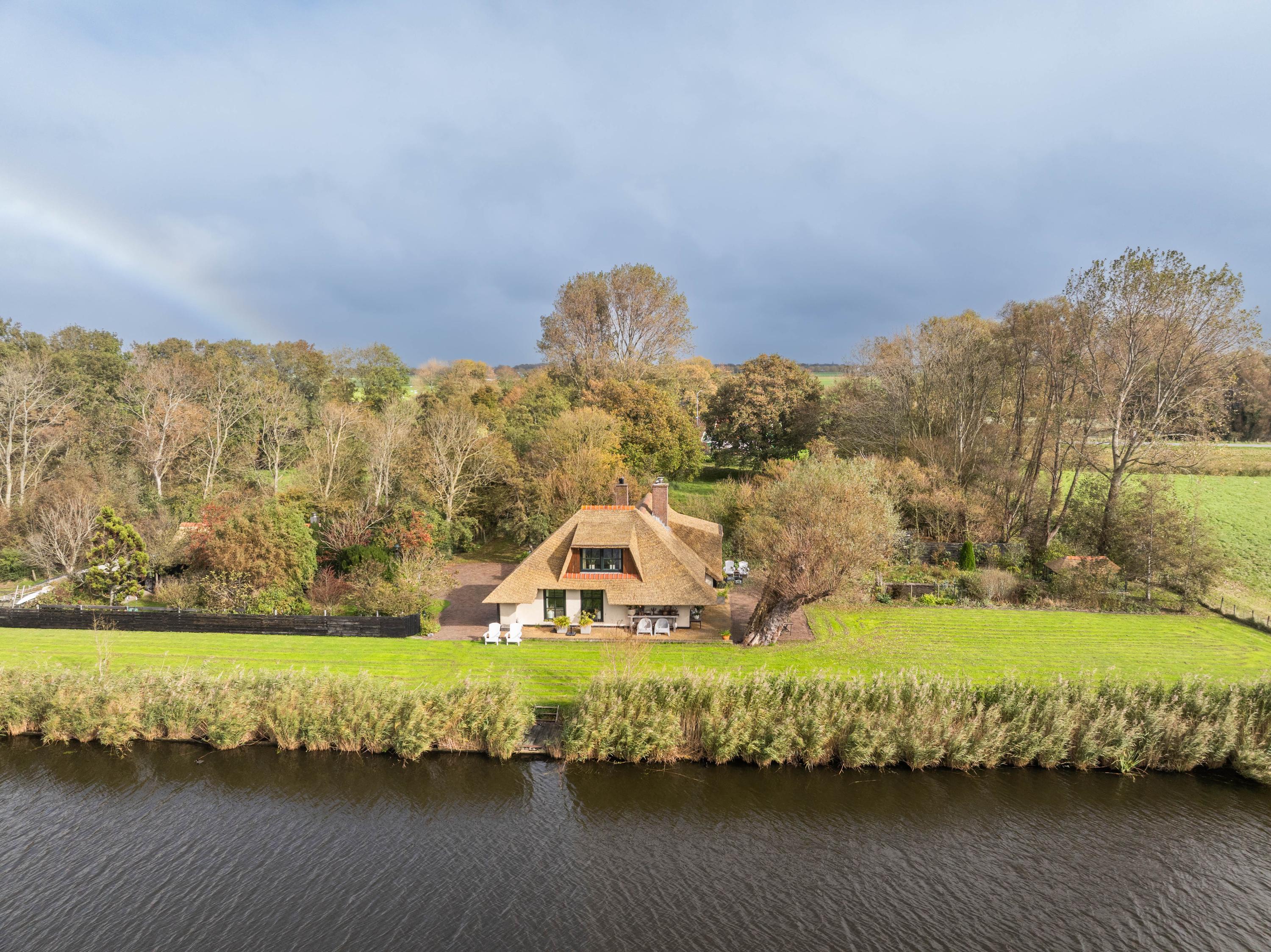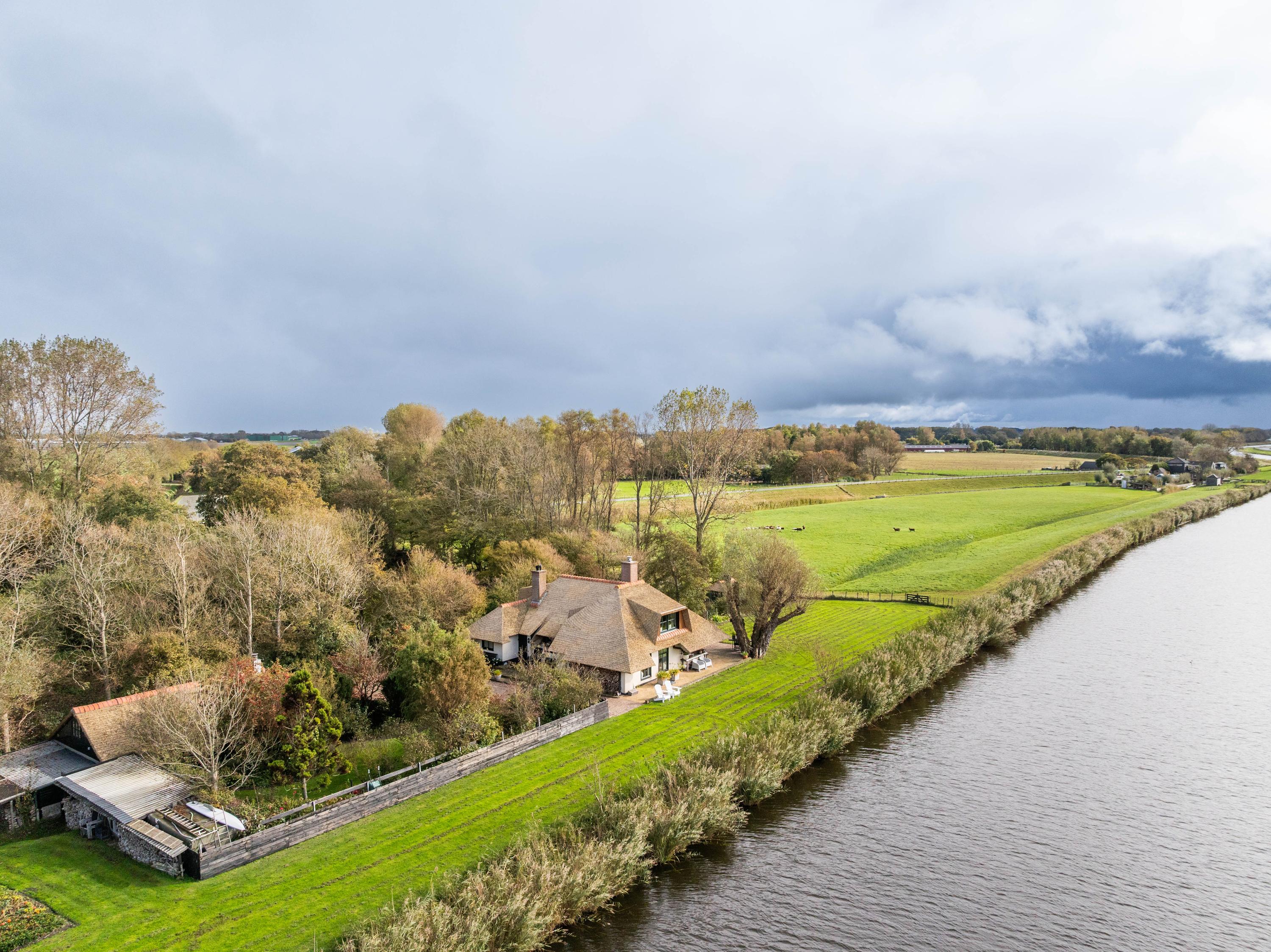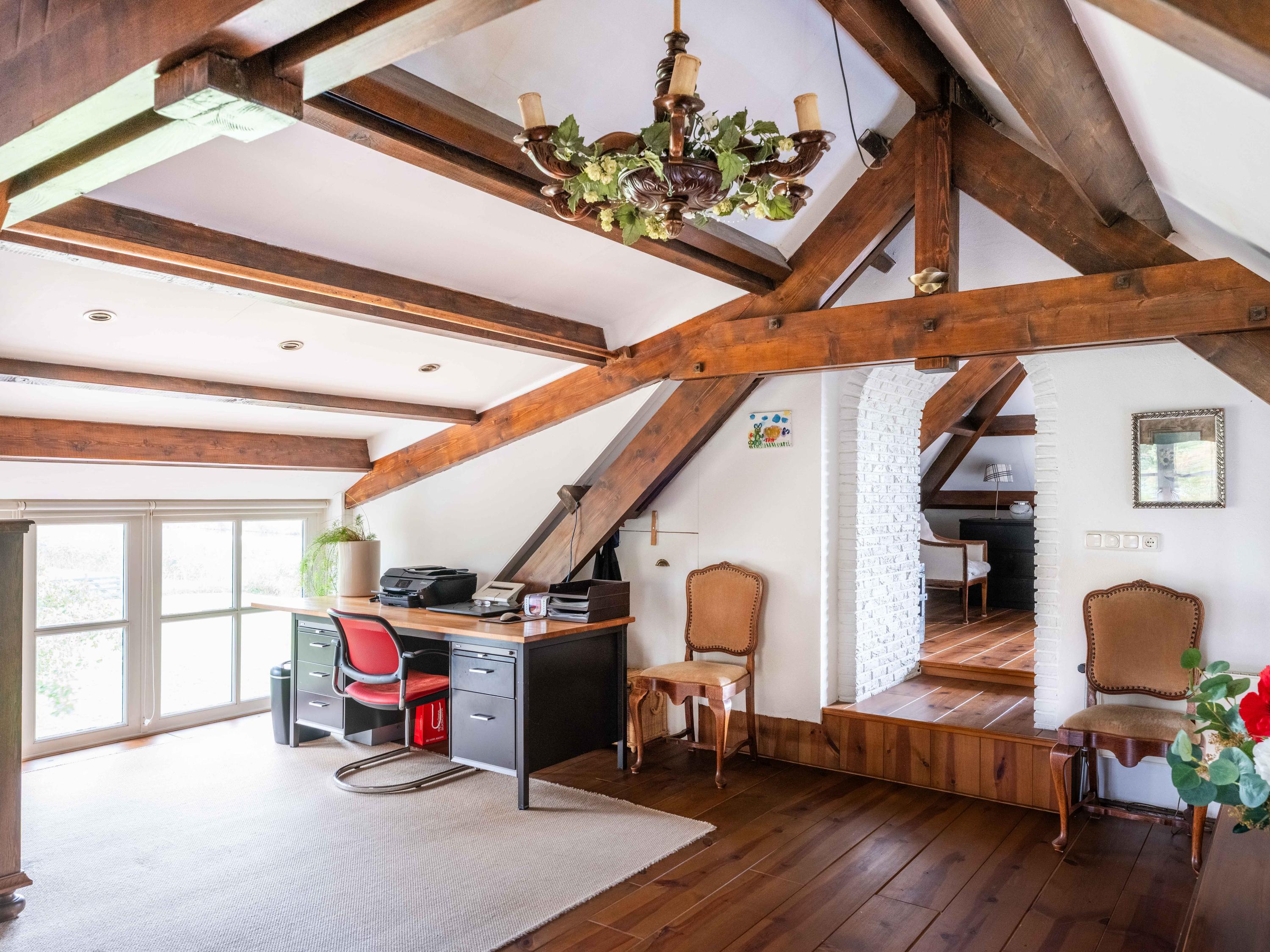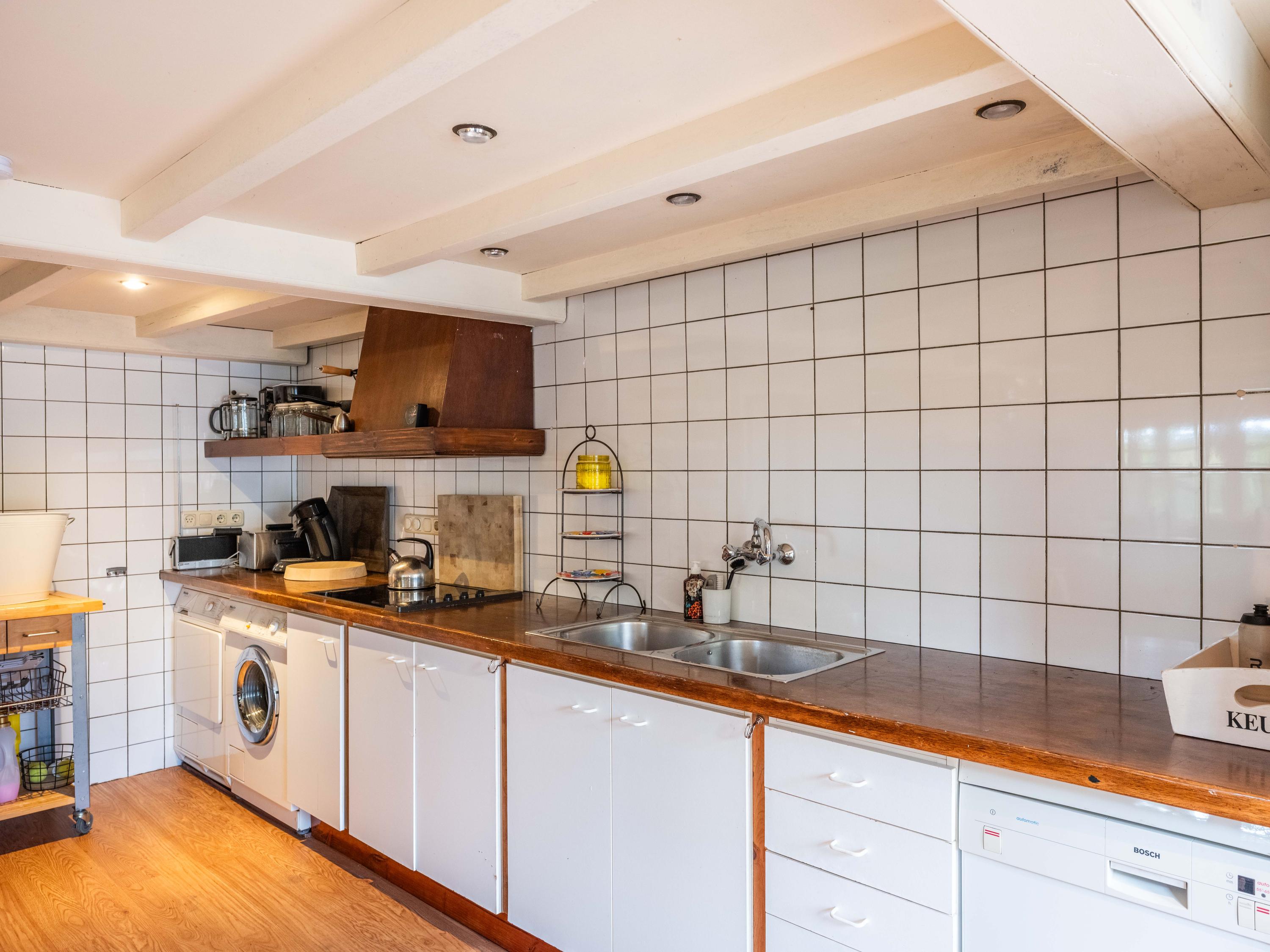 The country-style kitchen is fitted with built-in cabinets and ample storage space. From here, you can also access the spacious cellar, ideal for storage or as a wine cellar. The generous kitchen forms the heart of the home, featuring authentic details such as an English cooker with four ovens and characteristic beamed ceilings. The kitchen flows seamlessly into the inviting living room, where abundant natural light and views over the water immediately draw your attention. This room feels spacious and welcoming, enhanced by the centrally positioned wood-burning stove that adds a warm, homely touch.