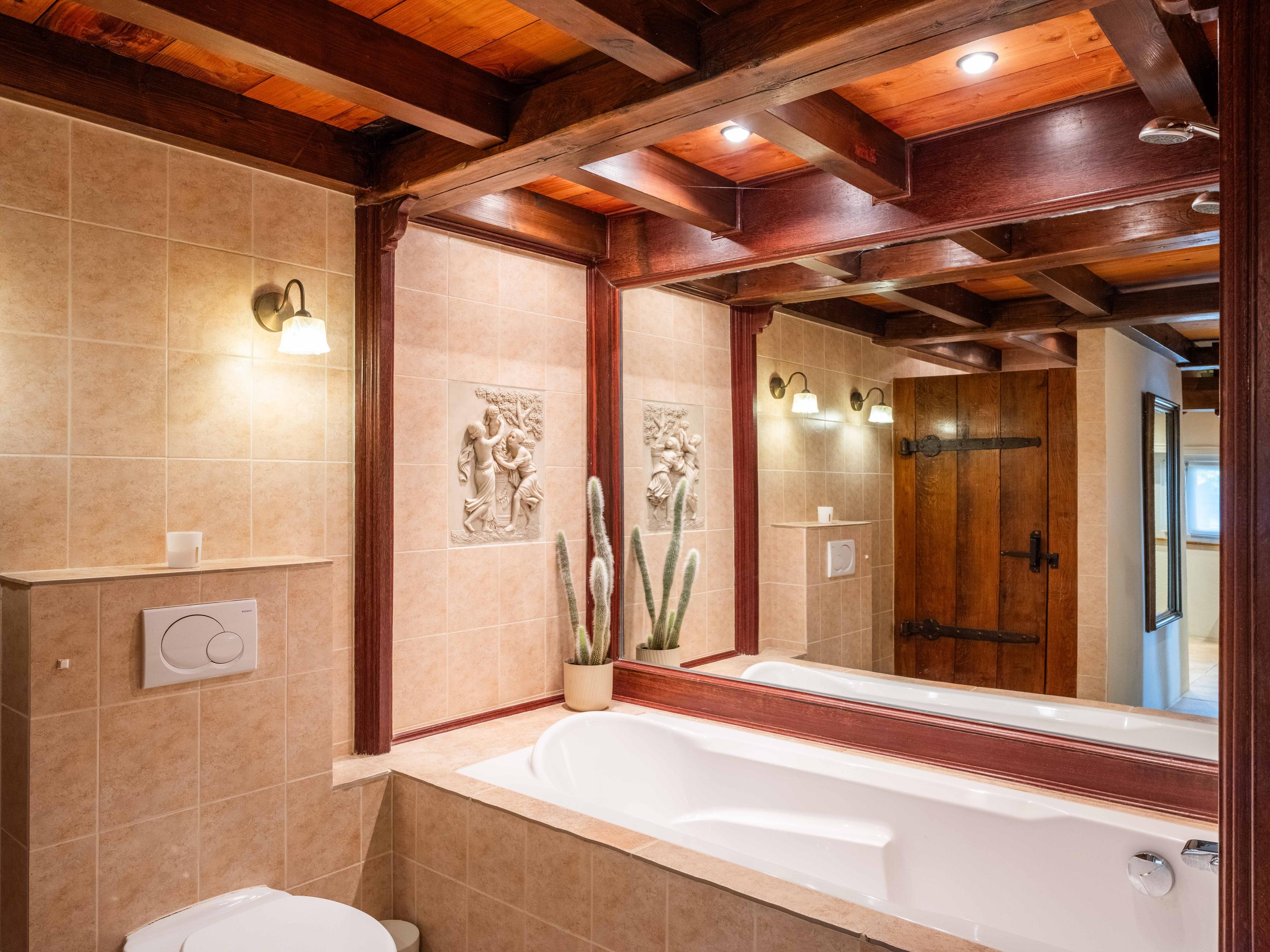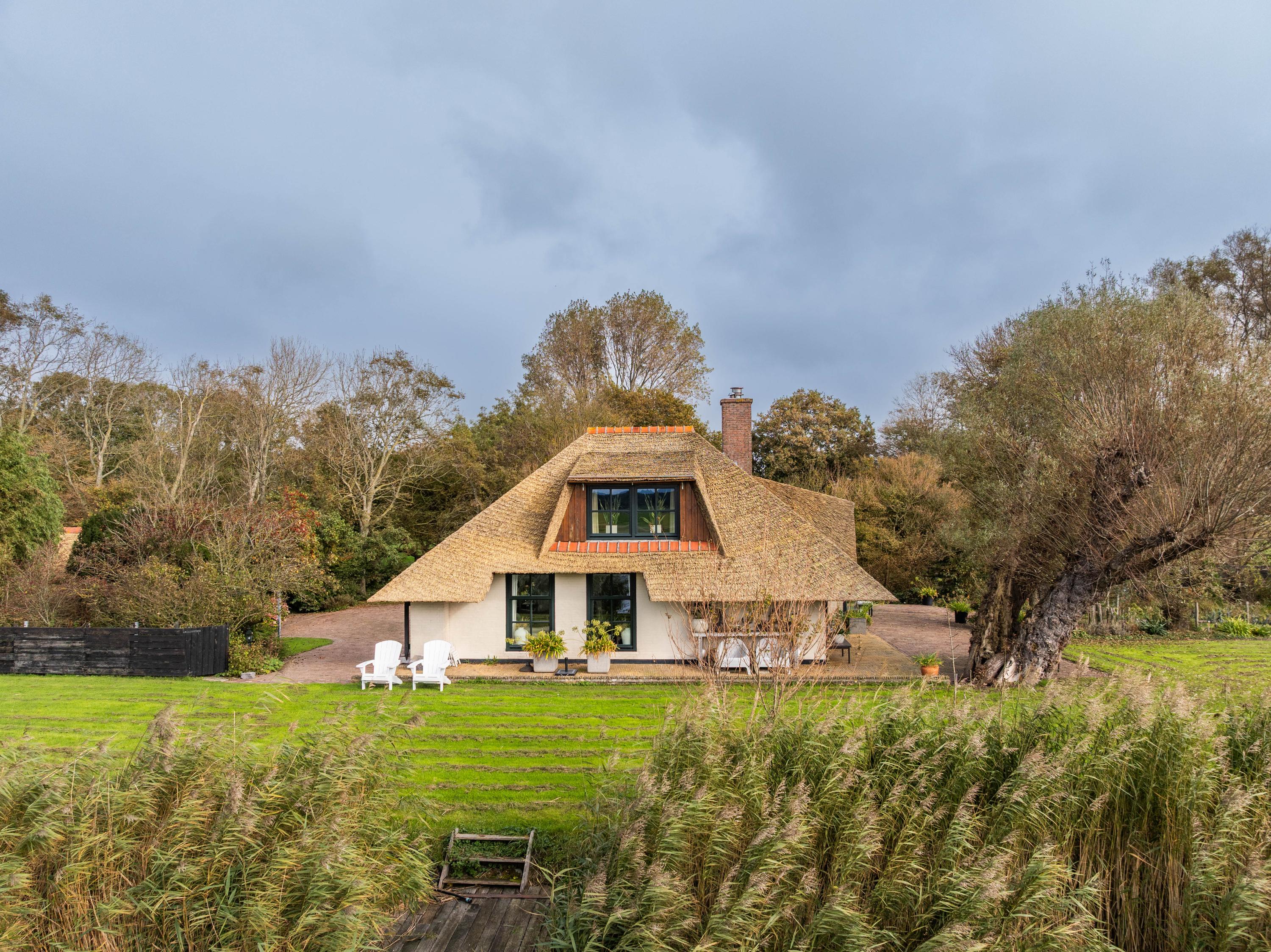 The villa exudes a warm, country-style atmosphere while offering modern comforts such as underfloor heating, synthetic thatched roofing, and full insulation.