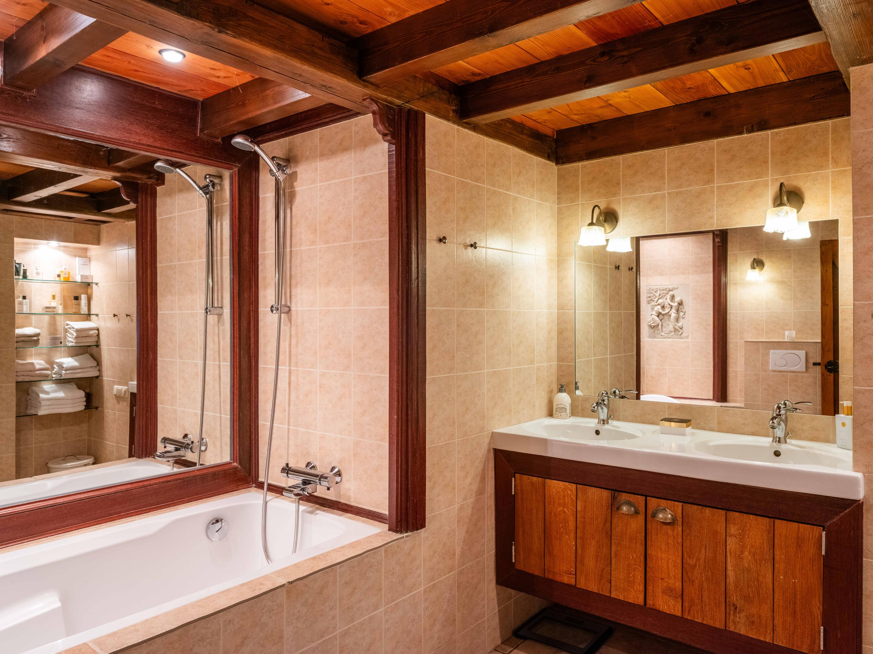 Adjacent to the kitchen is the luxurious bathroom, equipped with a bathtub, walk-in shower, toilet, double washbasin, and a practical walk-in closet.