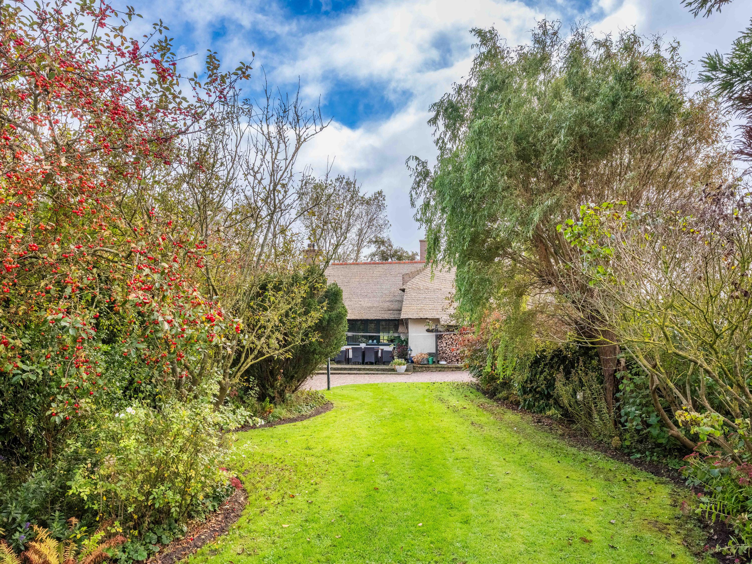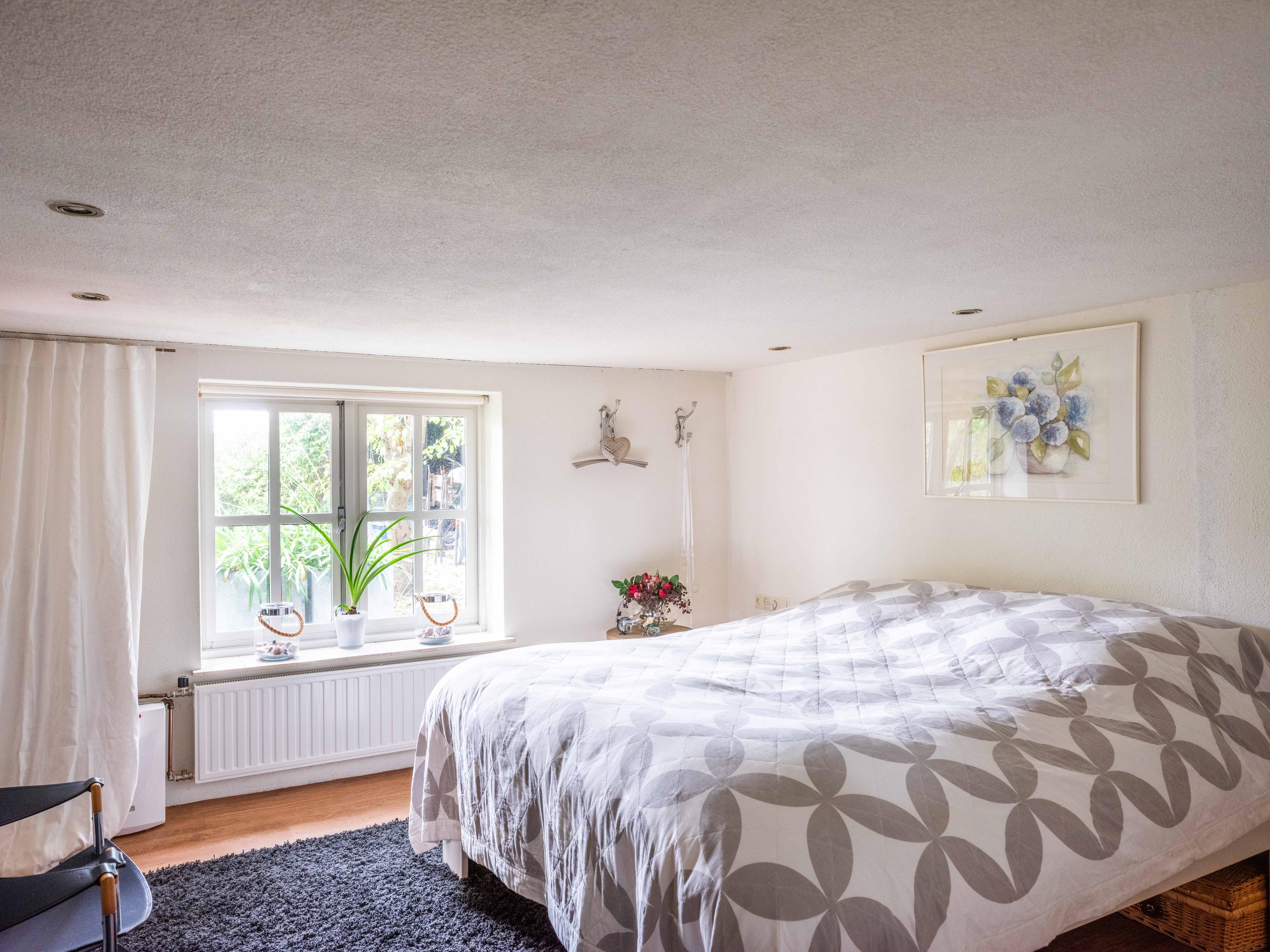In the beautifully landscaped garden, you will find a fully equipped guesthouse with its own wood stove, open kitchen with complete appliances, washer and dryer, dining area, and radiators. The bedroom includes a private shower, and there is also a separate toilet with washbasin. A attic above provides additional storage space.