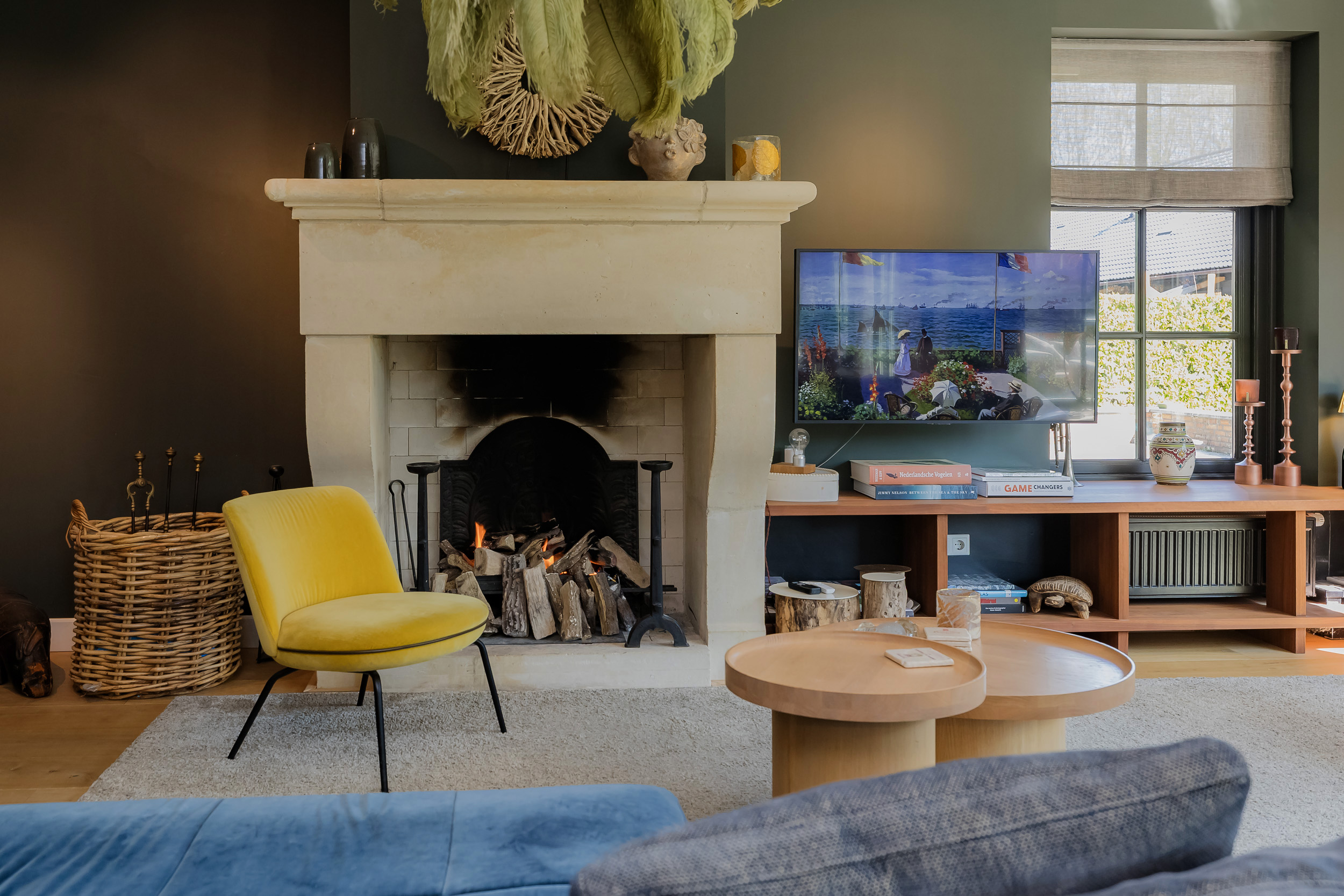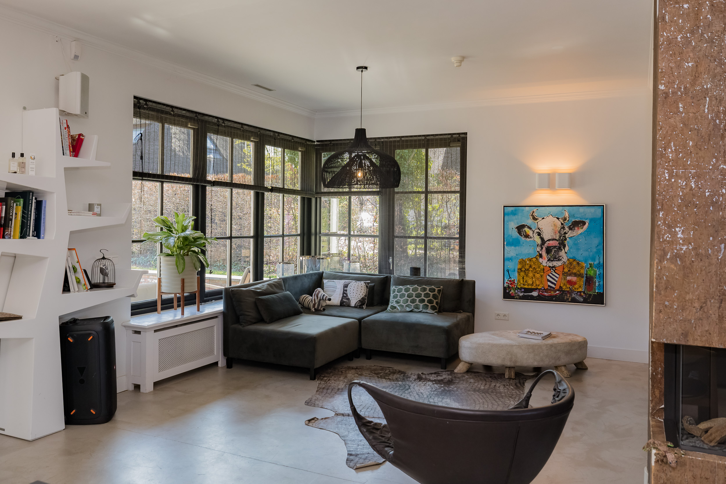 Step into the spacious hall with guest toilet and immediately feel the stylish atmosphere that continues throughout the house. The spacious living room with a beautiful sandstone fireplace and large windows offers a fantastic view of the surrounding garden. For cozy movie nights, there is a separate TV room directly to the right of the entrance. The beautiful concrete-look floor (hallway and living kitchen), luxury steel doors and the high-end kitchen with work island and high-quality appliances provide a modern, yet warm feel. In the living kitchen is further created a lovely sitting area, with access and view of the garden and a modern gas fireplace. Furthermore, on the first floor you will find a practical utility room, double garage, and have access to a spacious porch and a large terrace, where you can fully enjoy the outdoors.