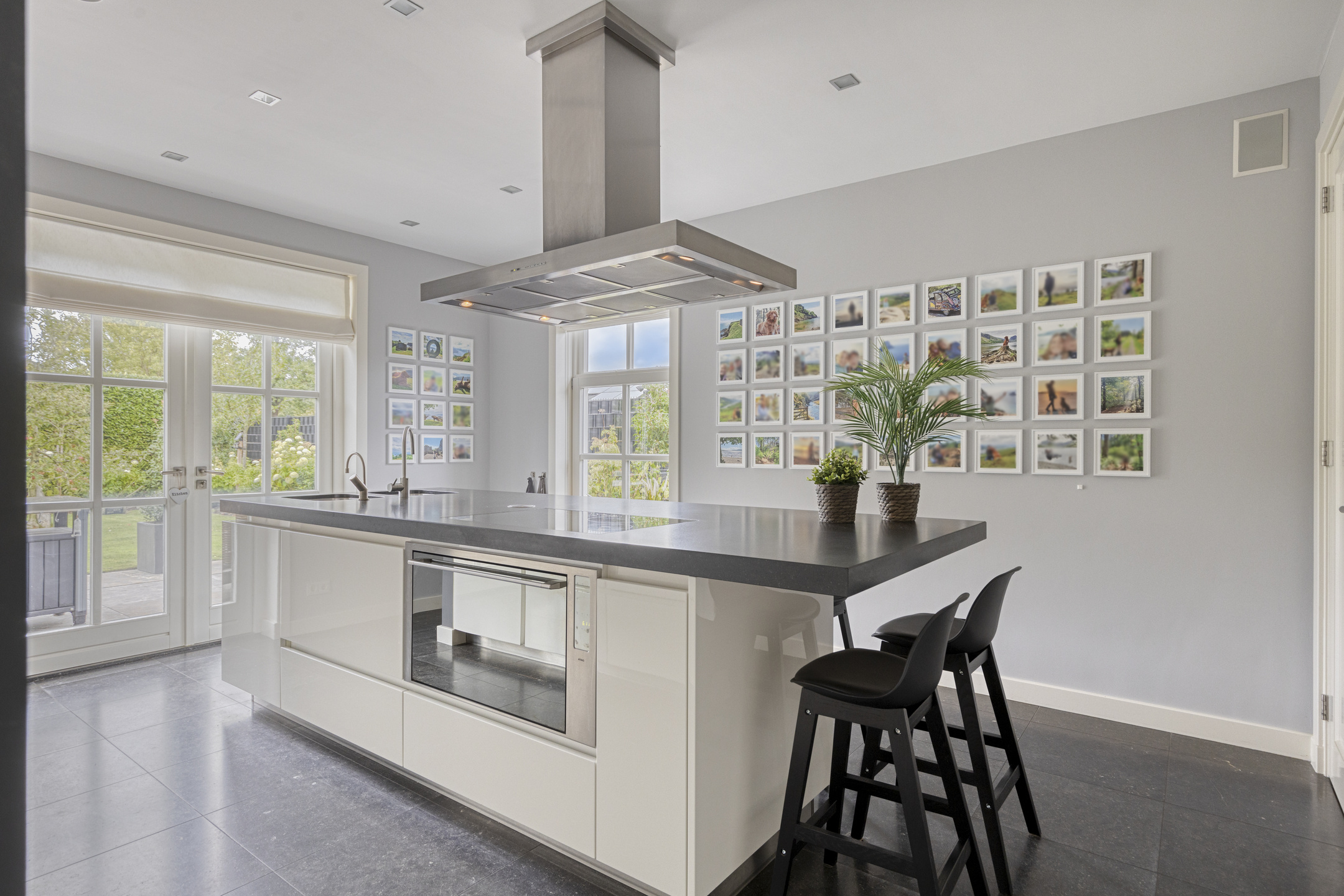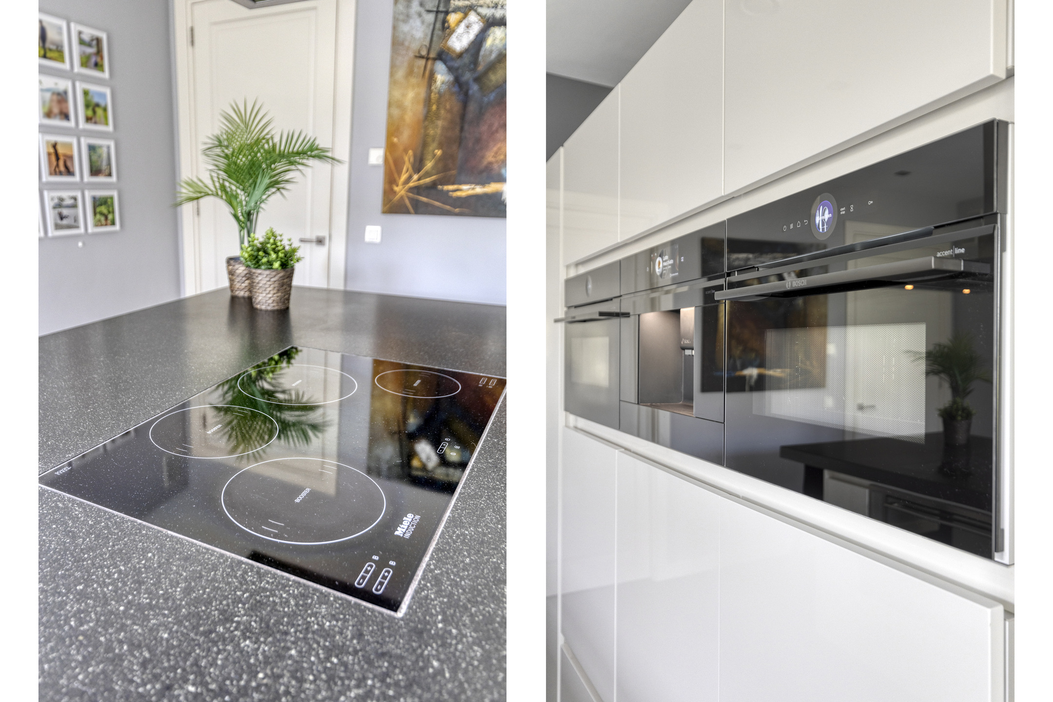 Kitchen: modern Bosch and Miele built-in appliances with cooking and sink island and integrated dining table; composite countertop with double sink and Quooker; Miele induction cooktop with Miele extractor hood; cabinet wall with Bosch built-in coffee machine, Bosch refrigerator (with fresh zone), Bosch freezer, two Bosch combination oven/microwaves, ATAG electric oven (90 cm) and Miele dishwasher at ergonomic height.