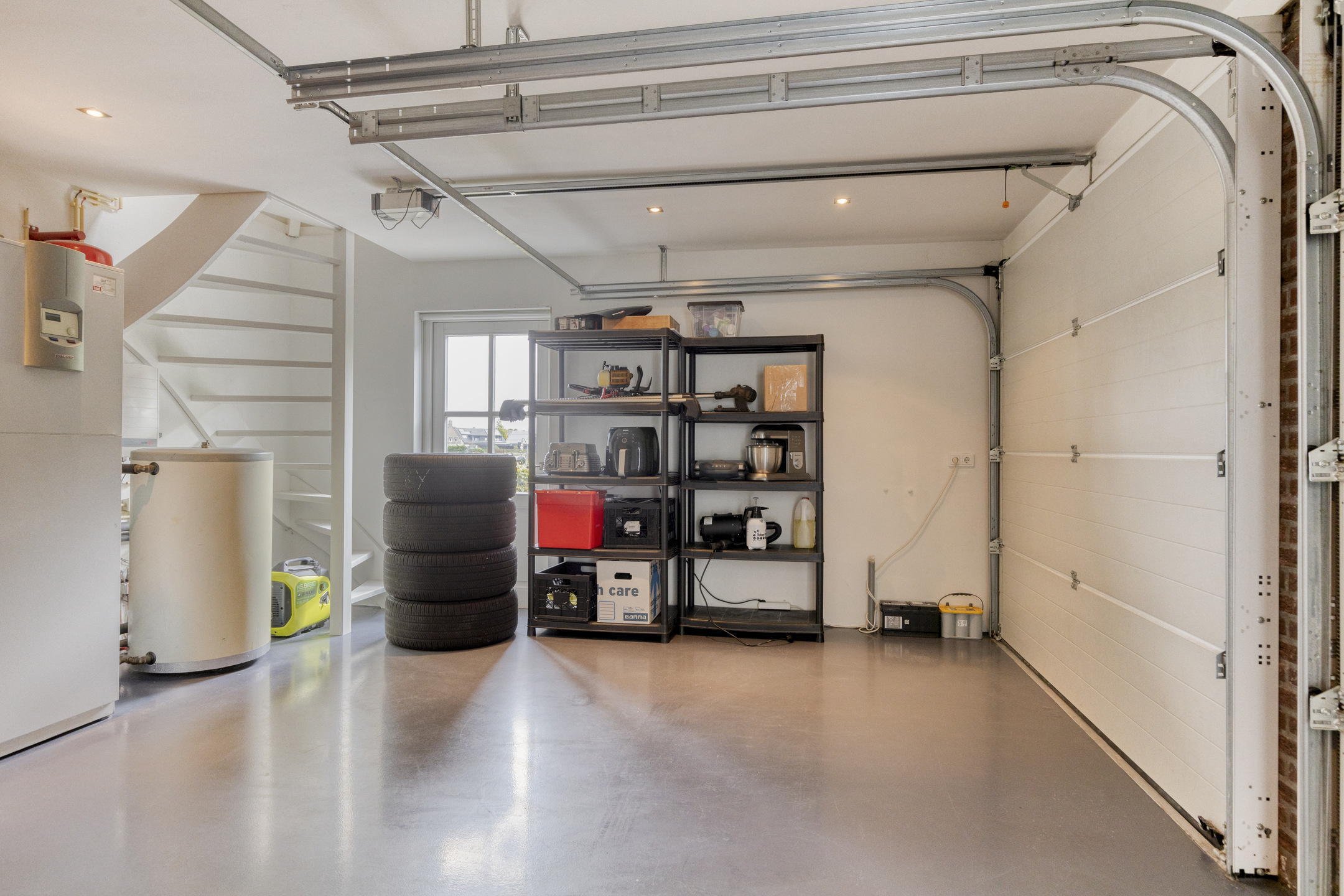 Double garage (approx. 37 m²): directly connected to the house; two electrically operated sectional doors to the driveway; separate side door to the garden; installation space for heat pump system and solar inverter; polished and coated concrete floor; fixed staircase to first floor and room (man cave or chill room with bar – approx. 16 m²) above the garage, including installation space for mechanical ventilation unit and central vacuum system for the entire house.