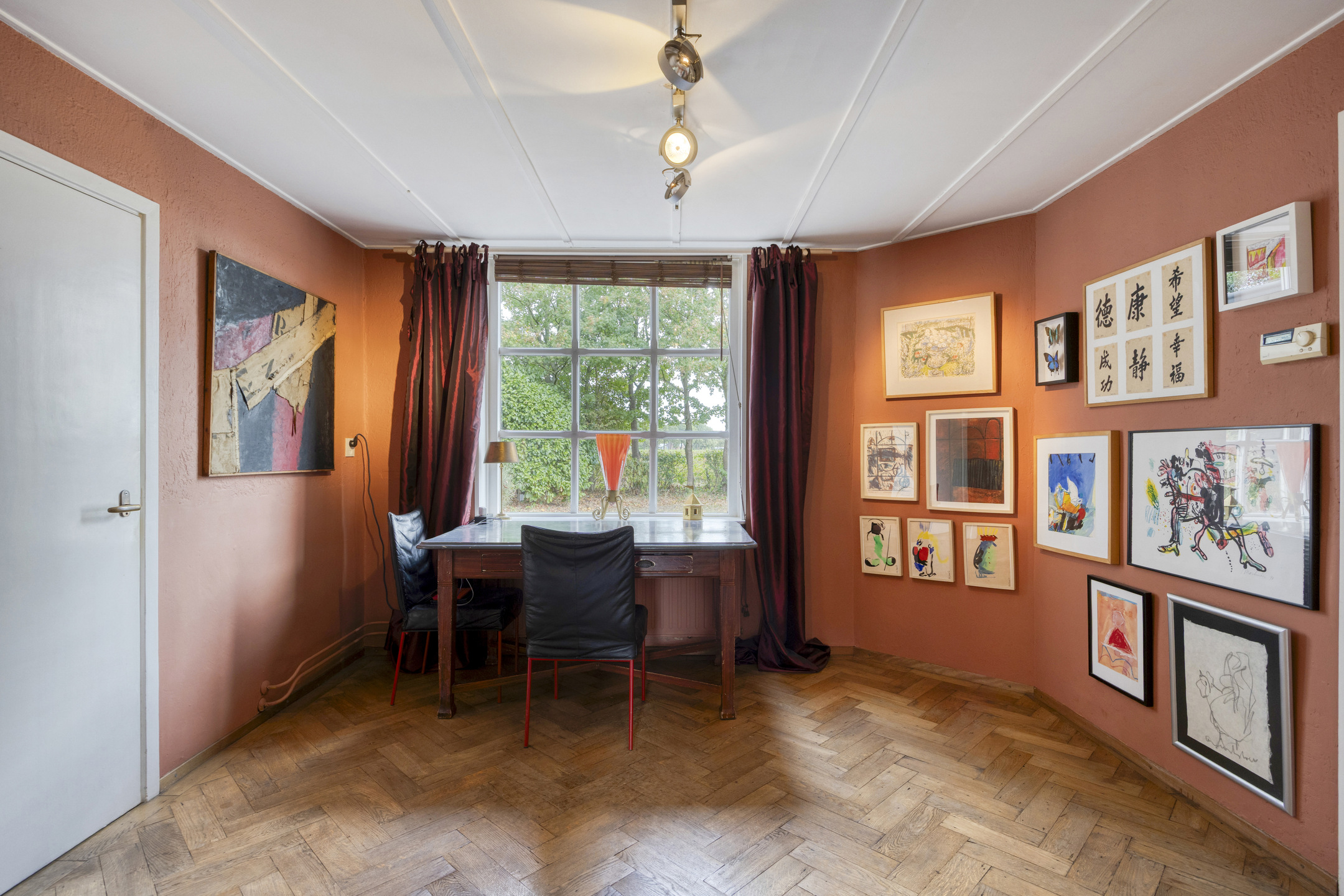 Intermediate room currently used as an office; plastered walls, herringbone floor, ceiling finished with board panels;