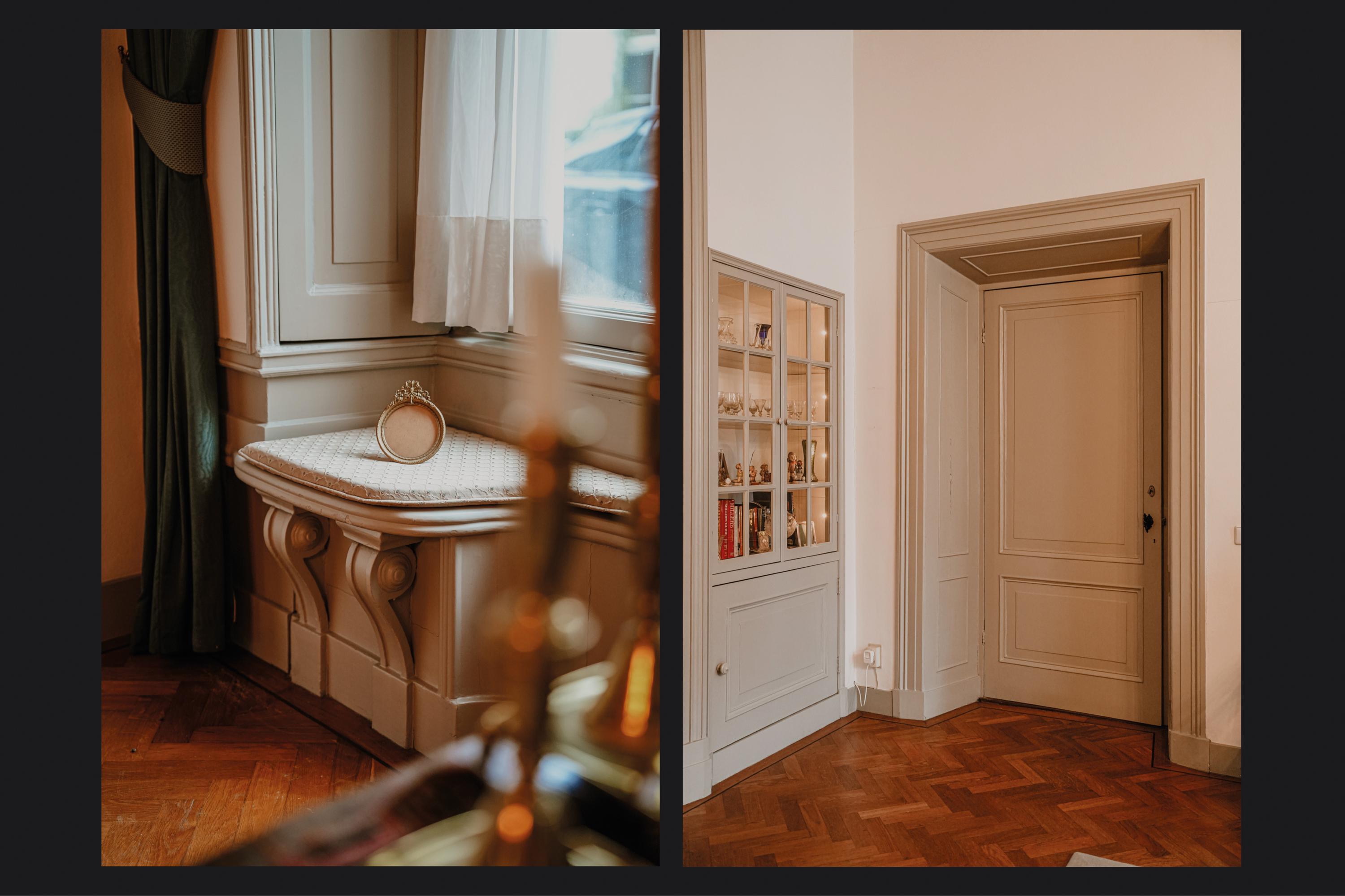 The imposing entrance hall is as large as an average living room. The marble floor continues into an adjoining hallway paved with natural stone. To the left is the expansive living room and en suite, measuring an impressive 70 m². The living room features high stucco ceilings, tall windows with stained glass transoms, two natural stone fireplaces, window seats, interior shutters, fitted cupboards, and herringbone parquet flooring. At the rear, two pairs of French doors open onto the garden.