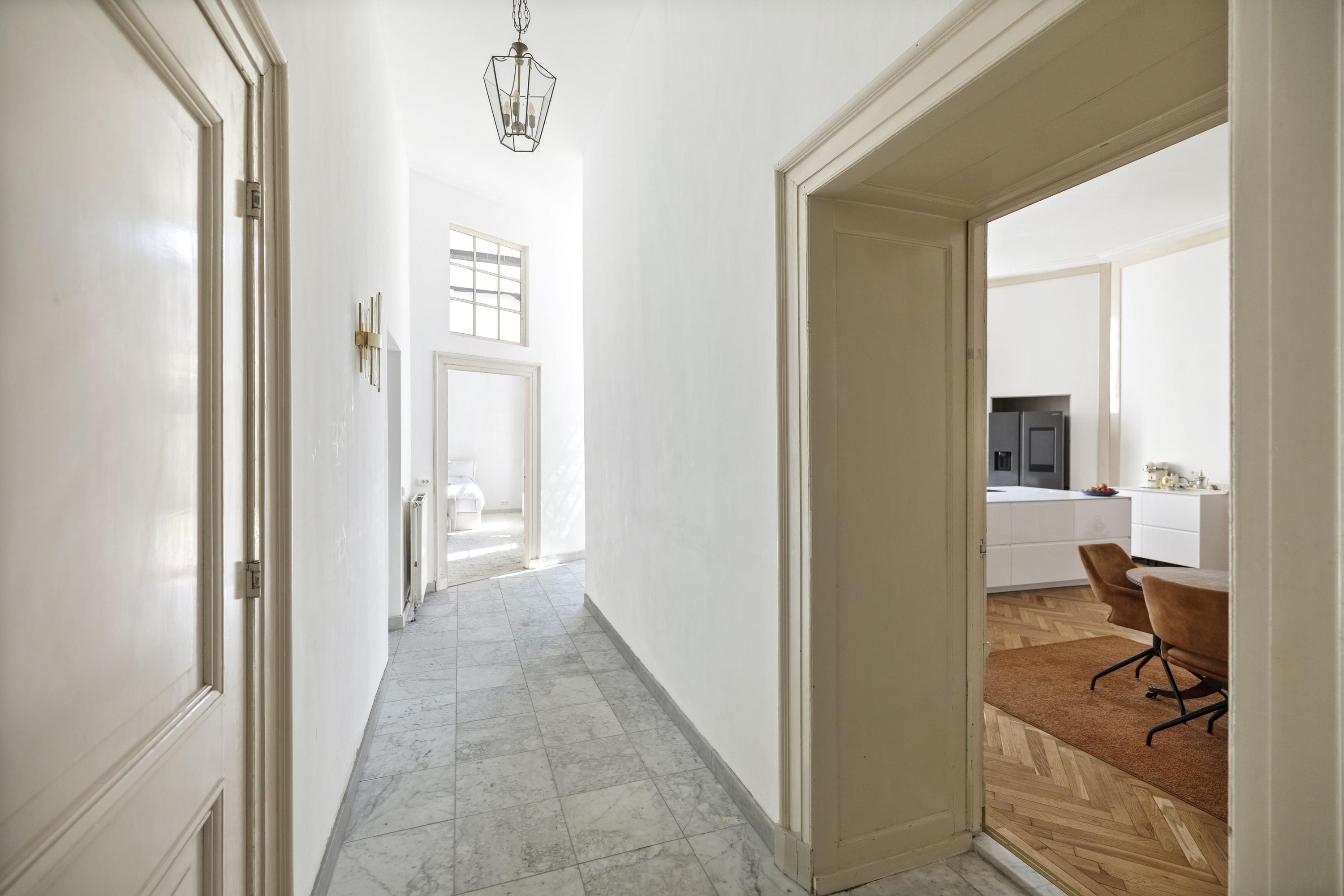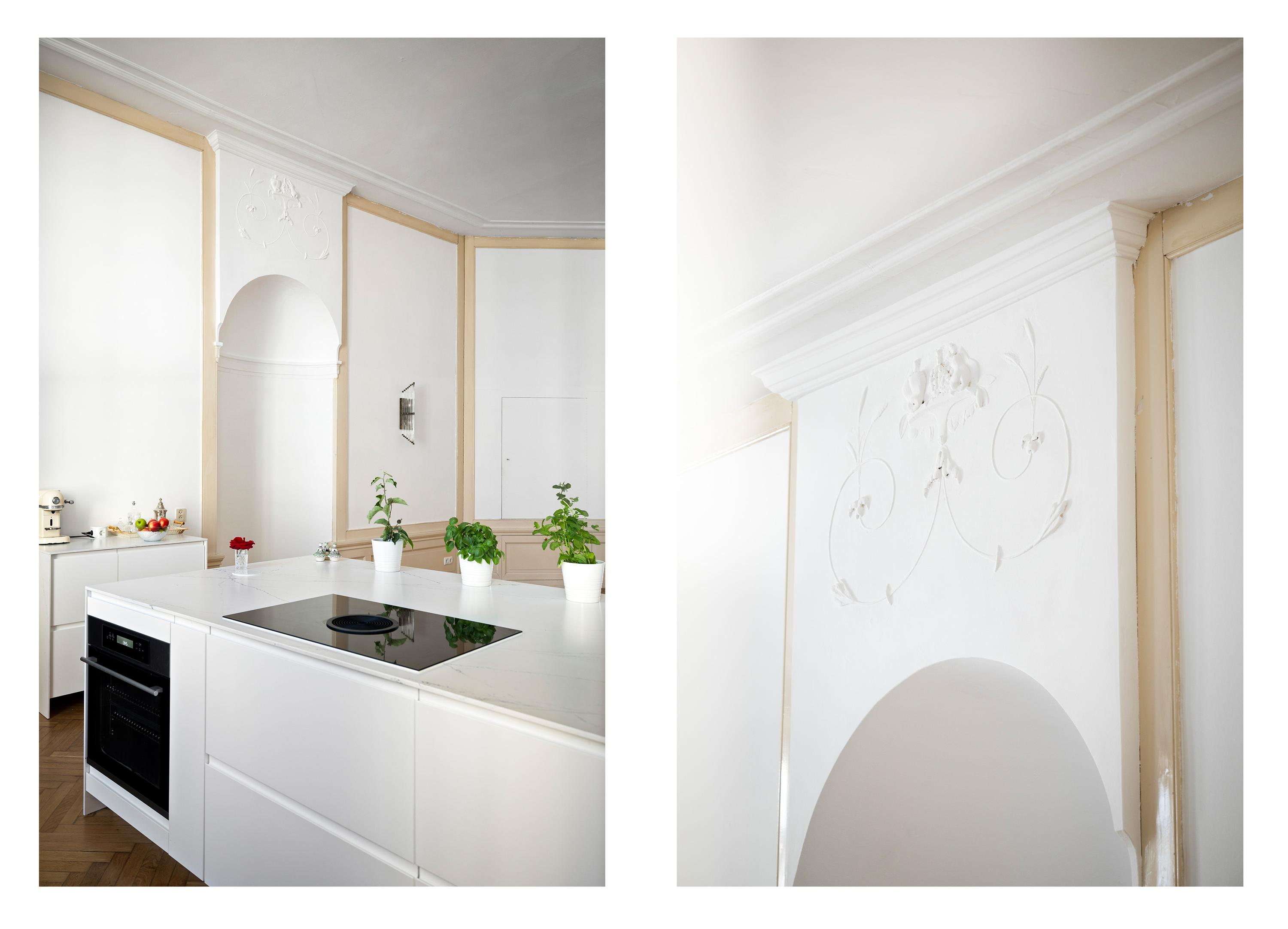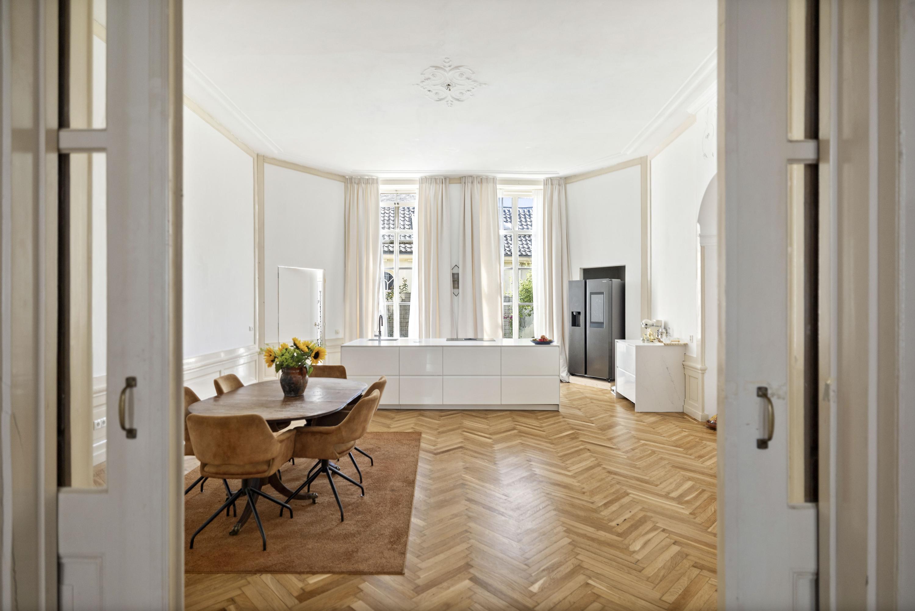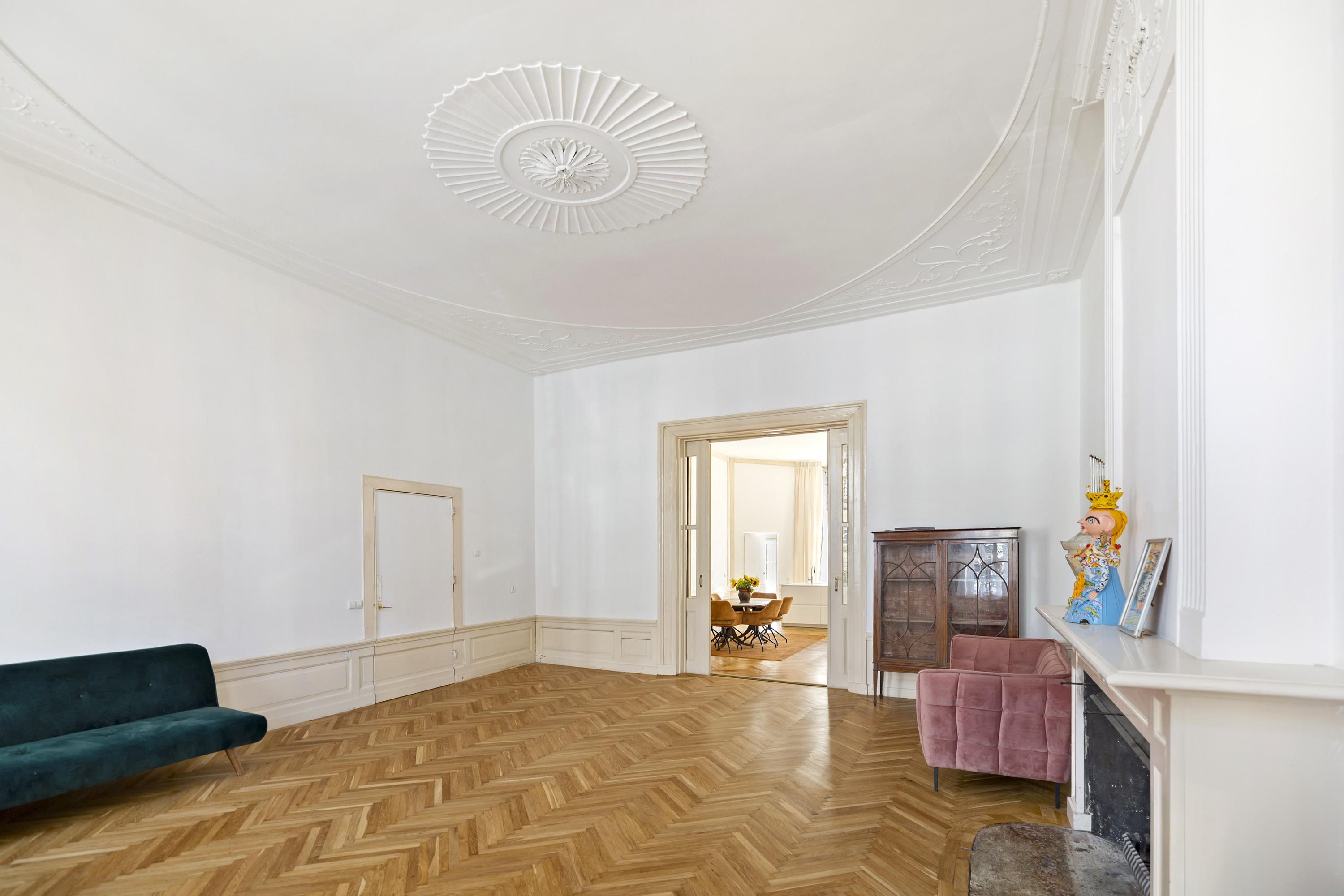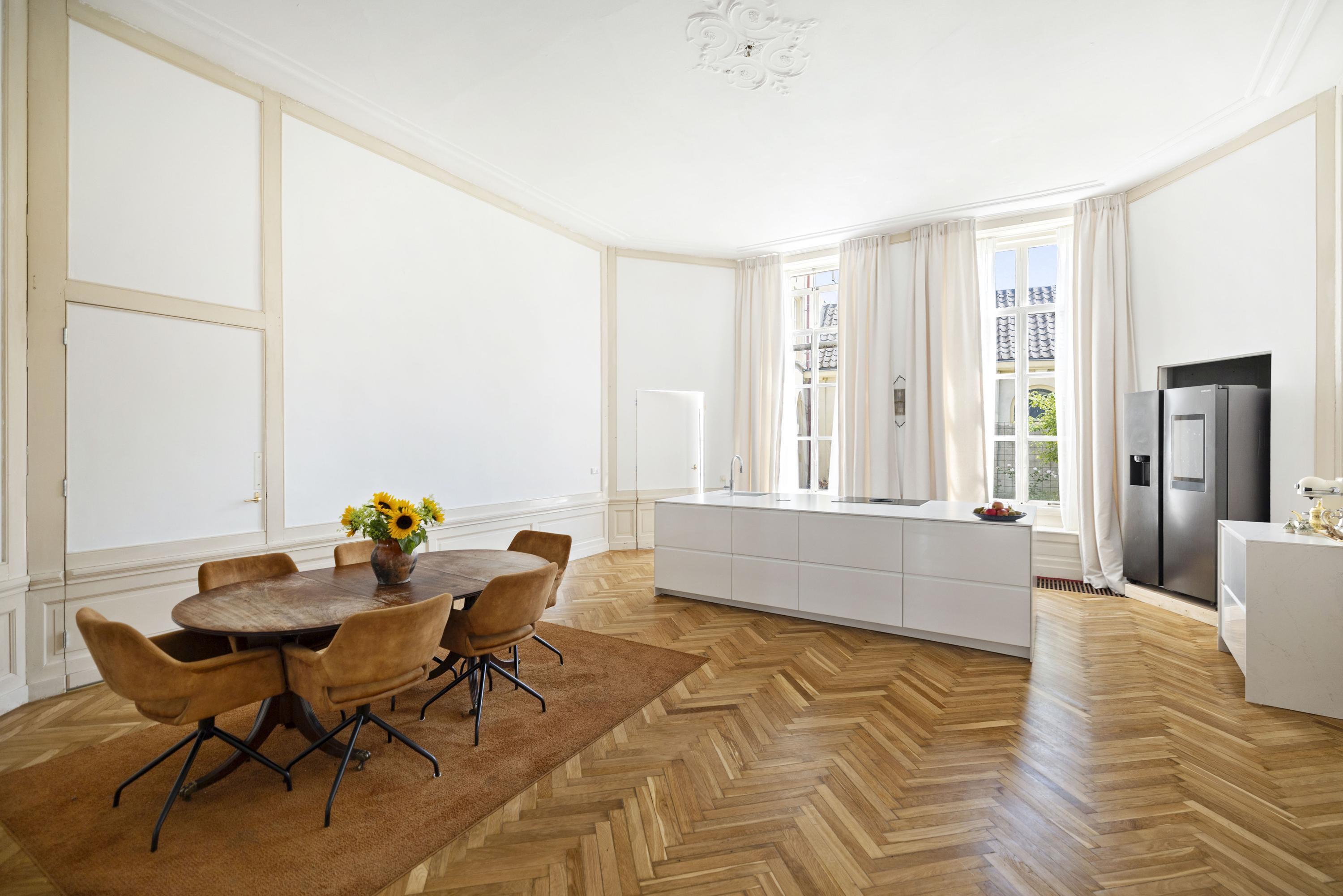 Past the classic double entrance, the vestibule greets you with a marble floor and abundant daylight. A combined living room and kitchen of nearly 100 m² anchor the main floor. The living room, at 43 m², features original window benches and a period mantelpiece, while herringbone oak floors establish a warm, graceful rhythm. The kitchen is fitted with white, handle-less cabinetry, high-spec appliances including an induction cooktop with downdraft extraction, and a large fridge-freezer.