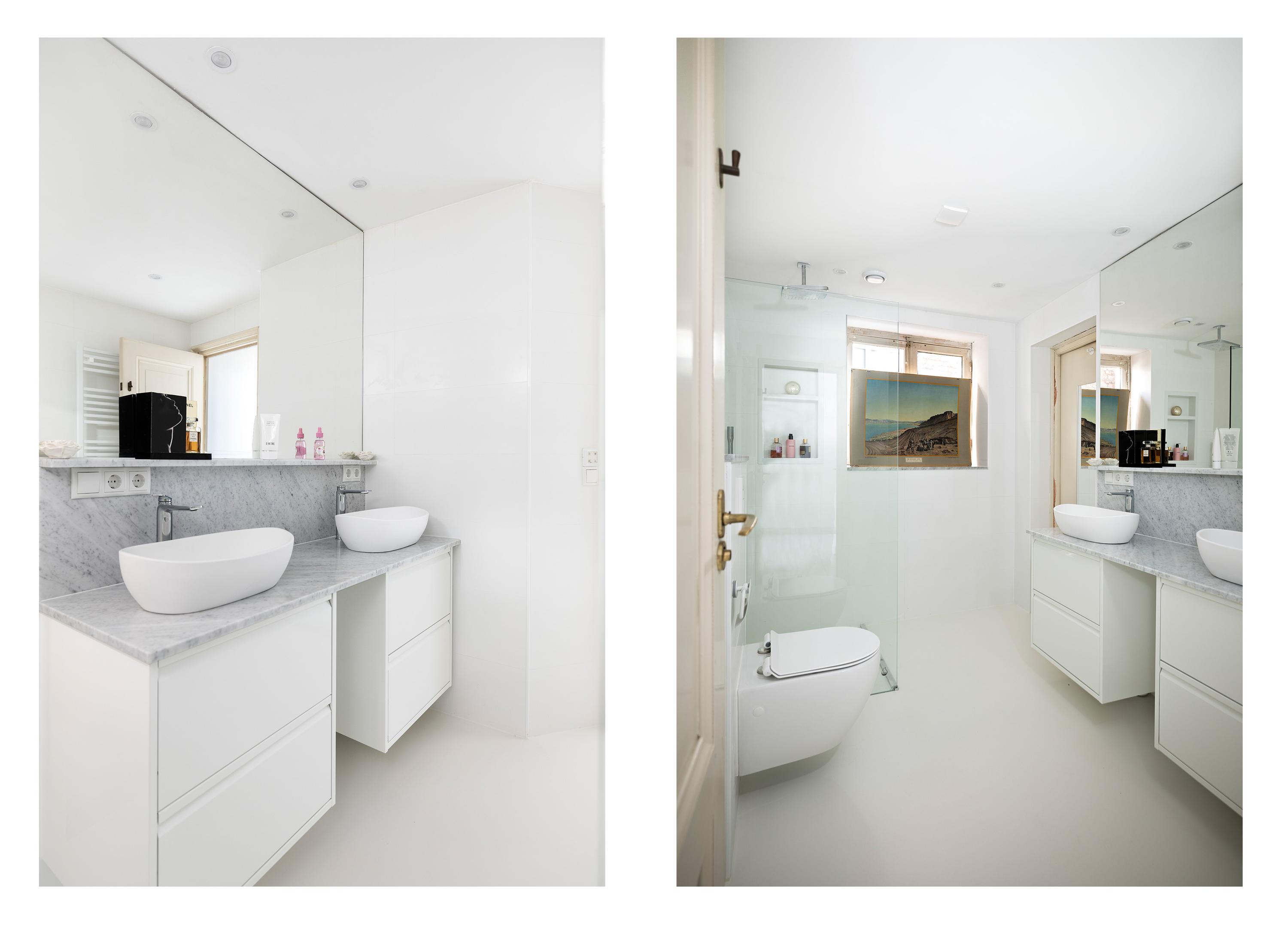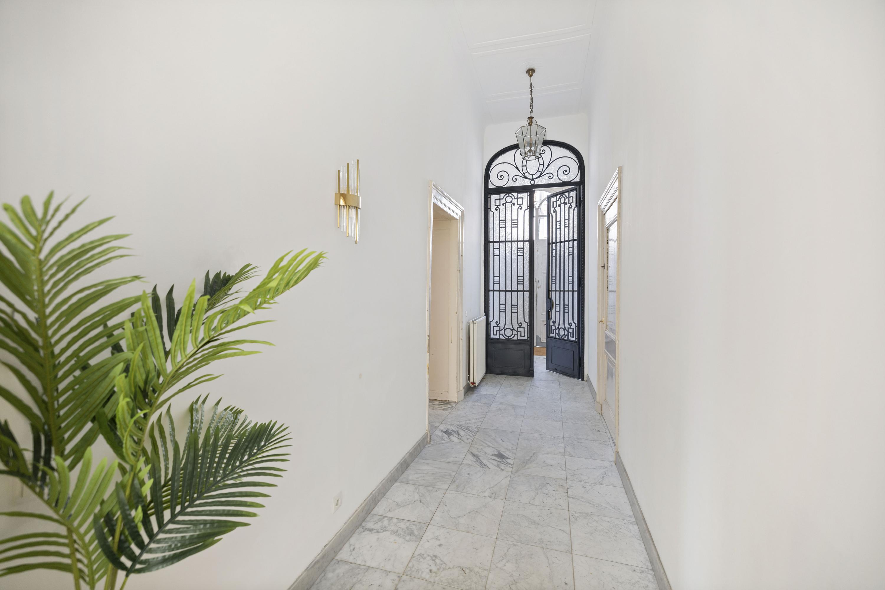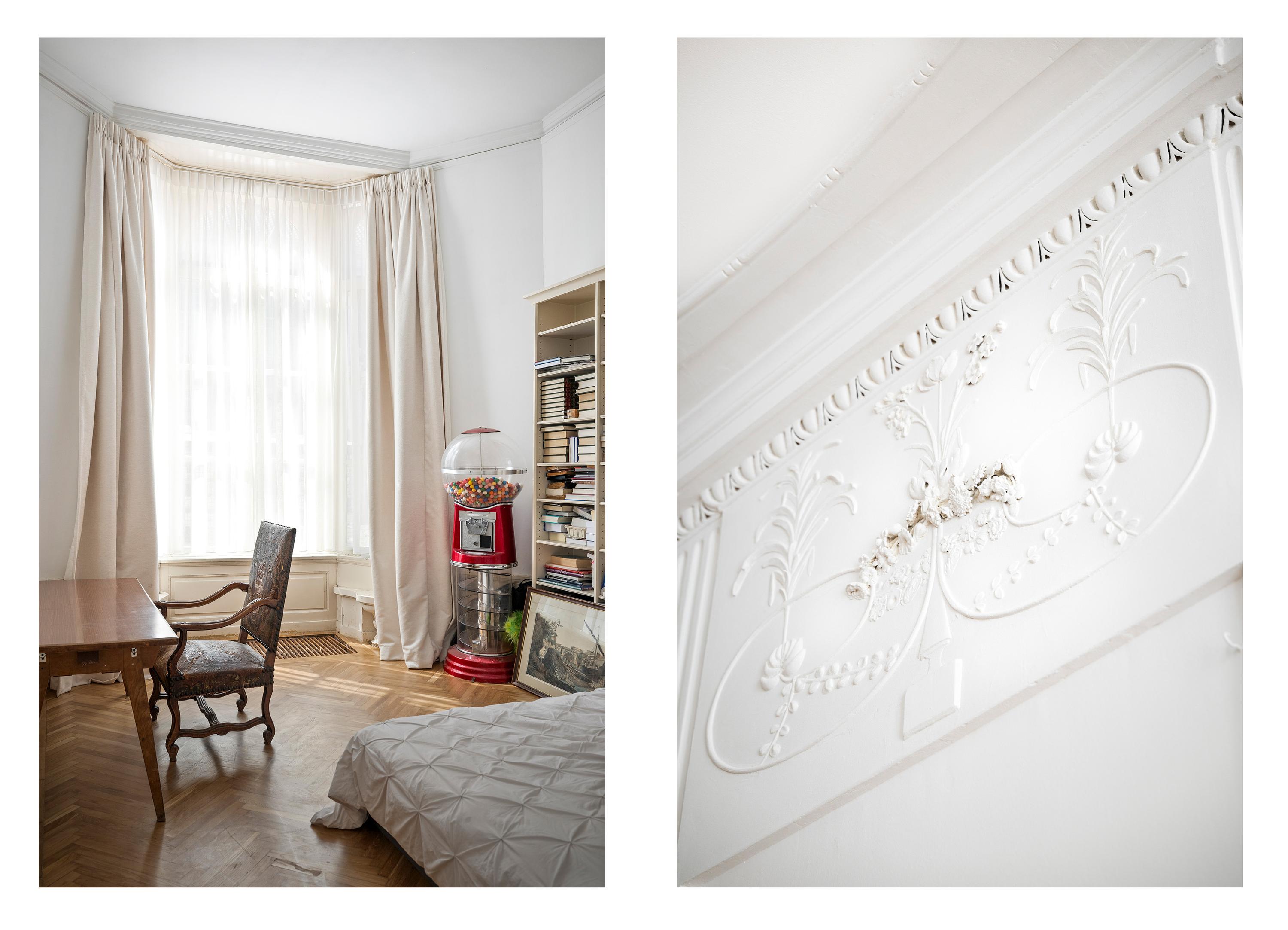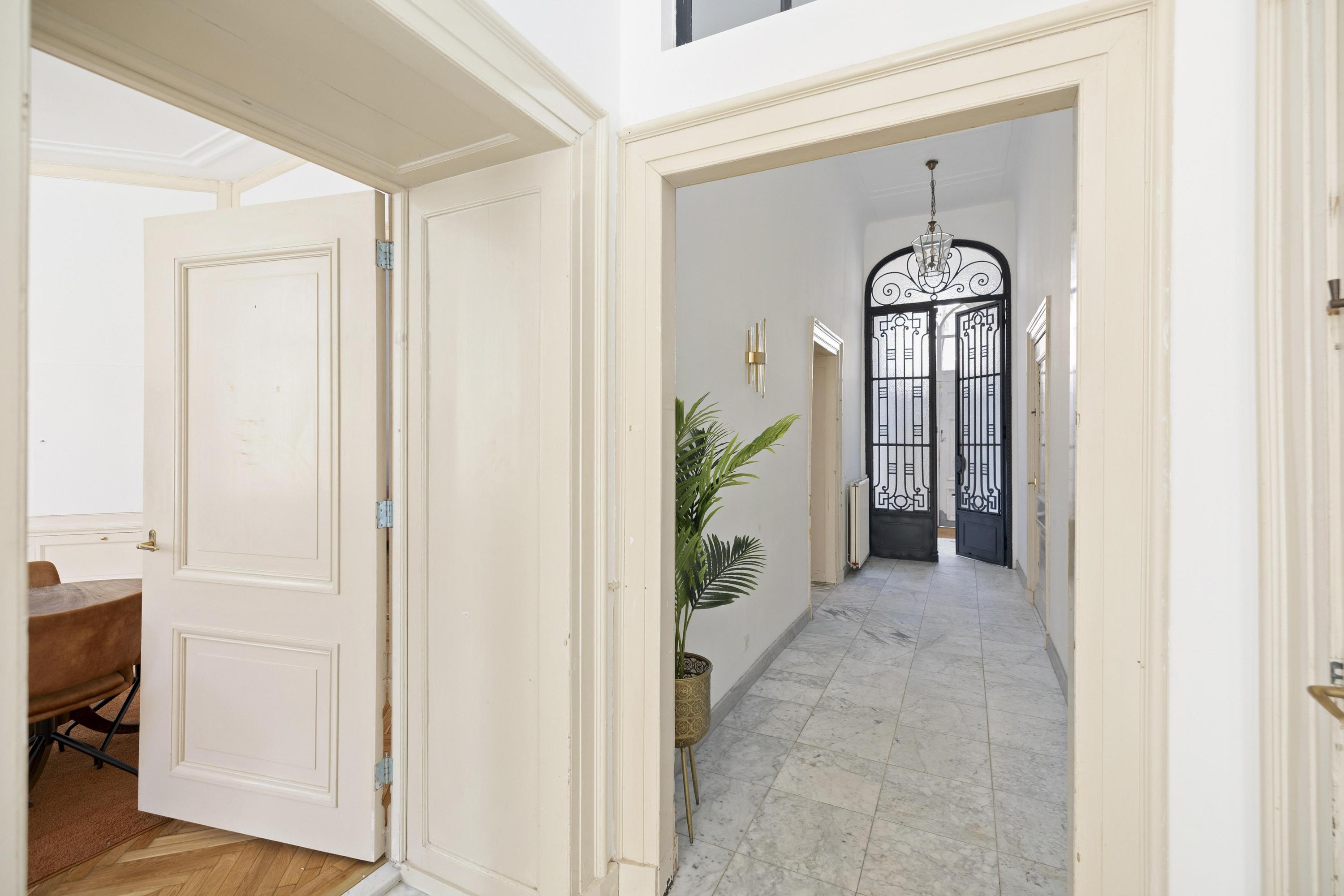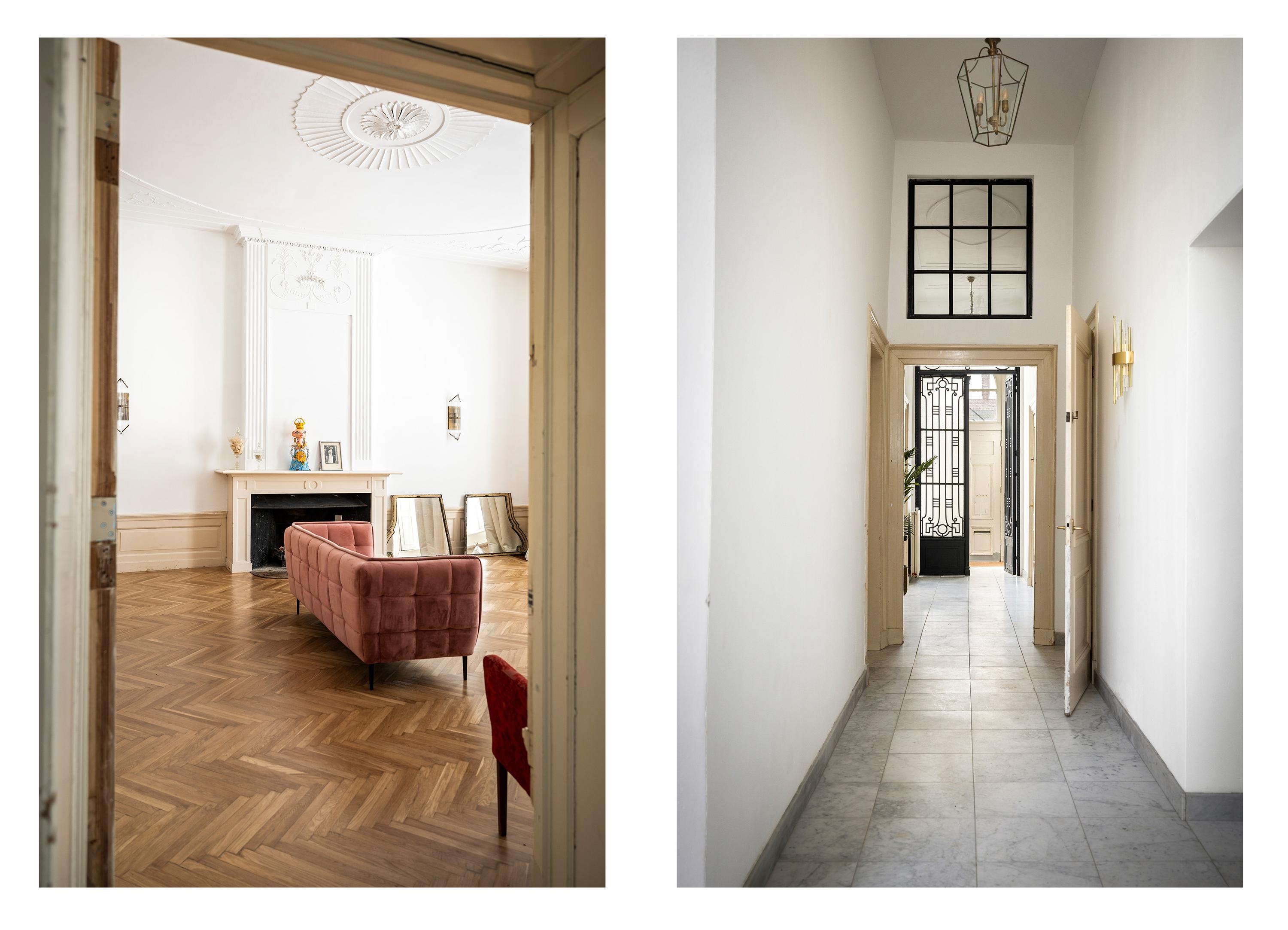Past the classic double entrance, the vestibule greets you with a marble floor and abundant daylight. A combined living room and kitchen of nearly 100 m² anchor the main floor. The living room, at 43 m², features original window benches and a period mantelpiece, while herringbone oak floors establish a warm, graceful rhythm. The kitchen is fitted with white, handle-less cabinetry, high-spec appliances including an induction cooktop with downdraft extraction, and a large fridge-freezer.