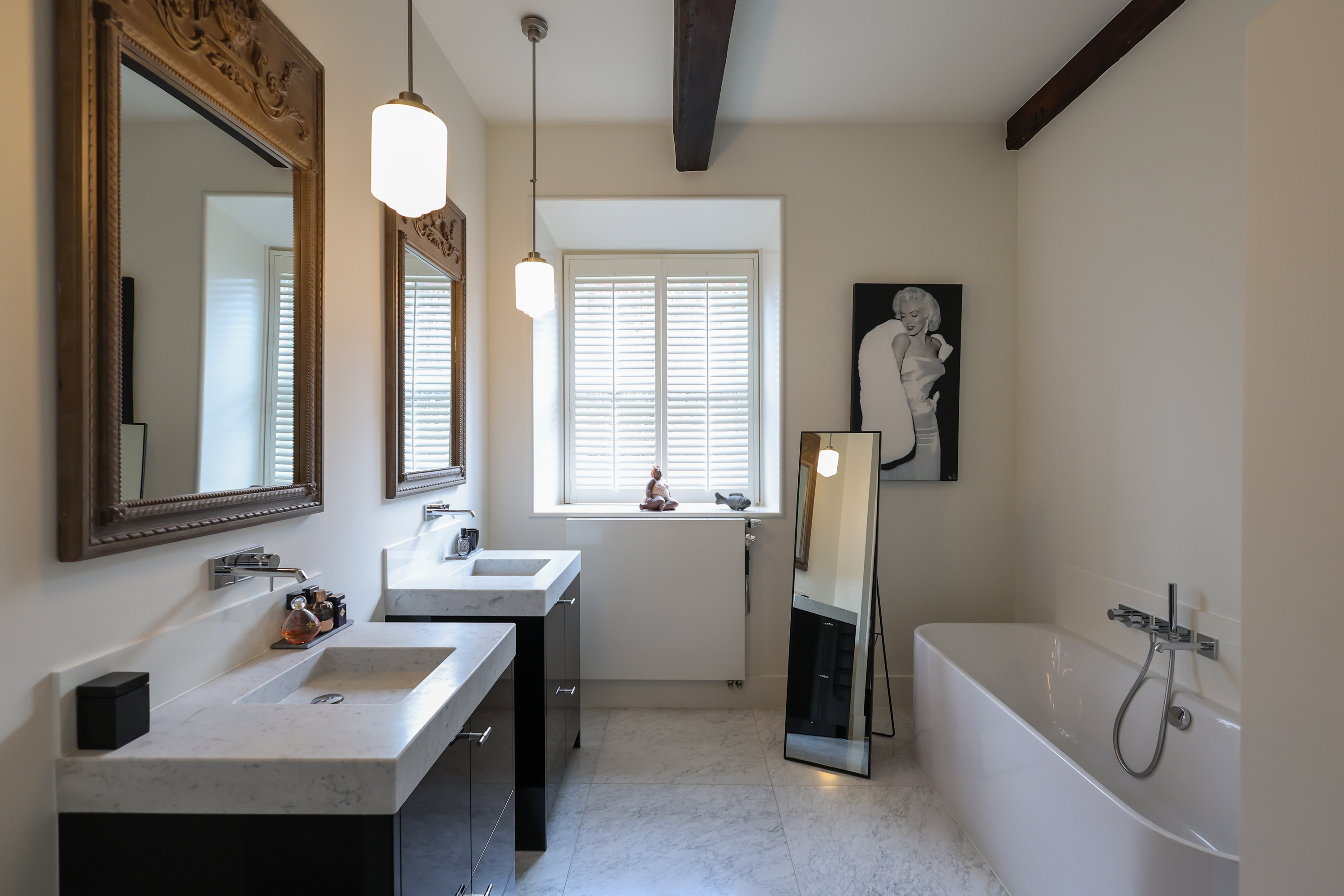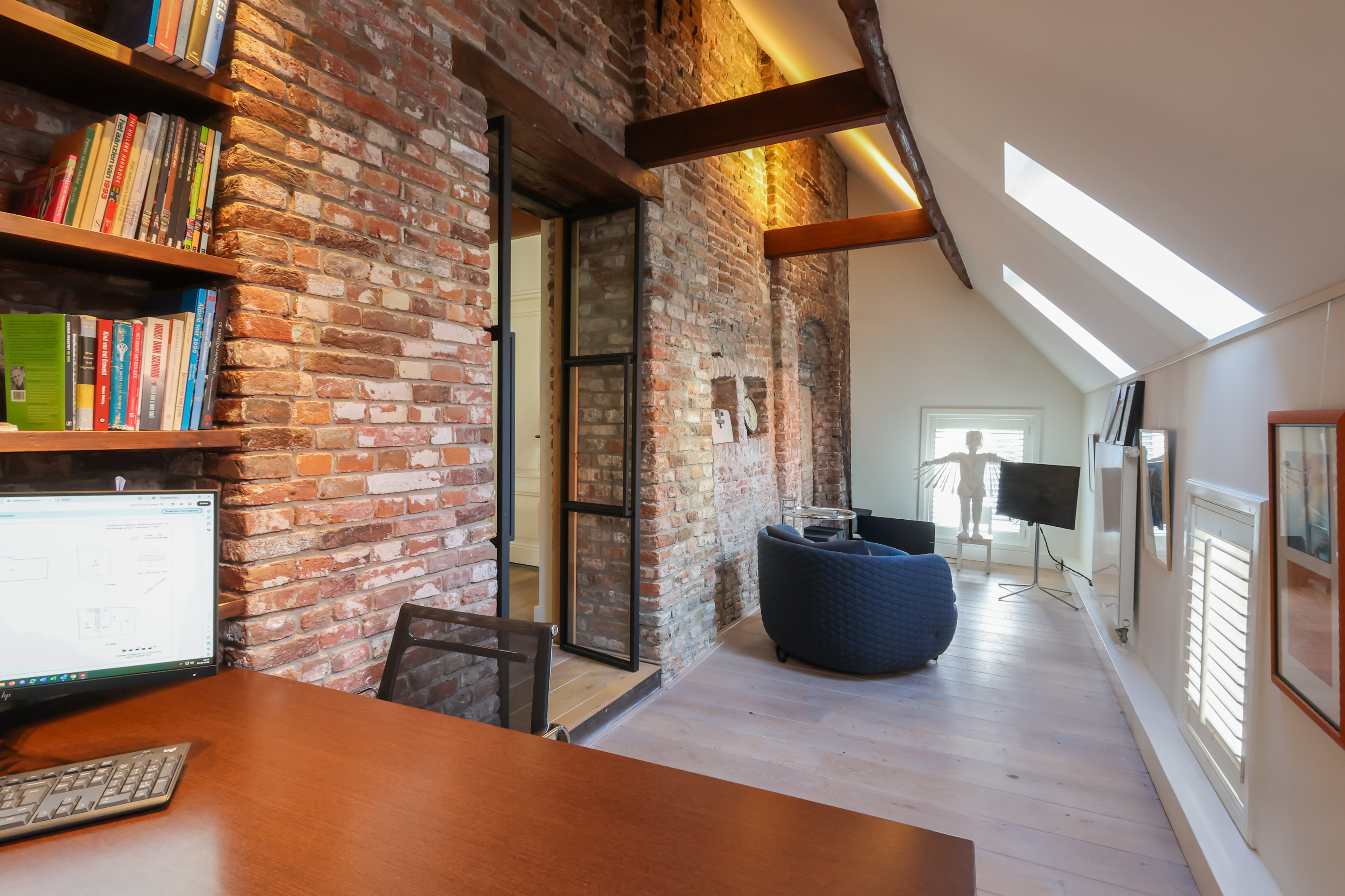 El dormitorio principal cuenta con vestidor con armarios a medida y un espacioso baño. En la planta superior, una sala versátil para trabajo o juego exhibe segmentos a la vista de la antigua muralla bajo generosas lucernarias, acentuando el vínculo con el rico pasado de Amersfoort. Tres dormitorios más y un segundo baño ofrecen opciones flexibles de alojamiento.