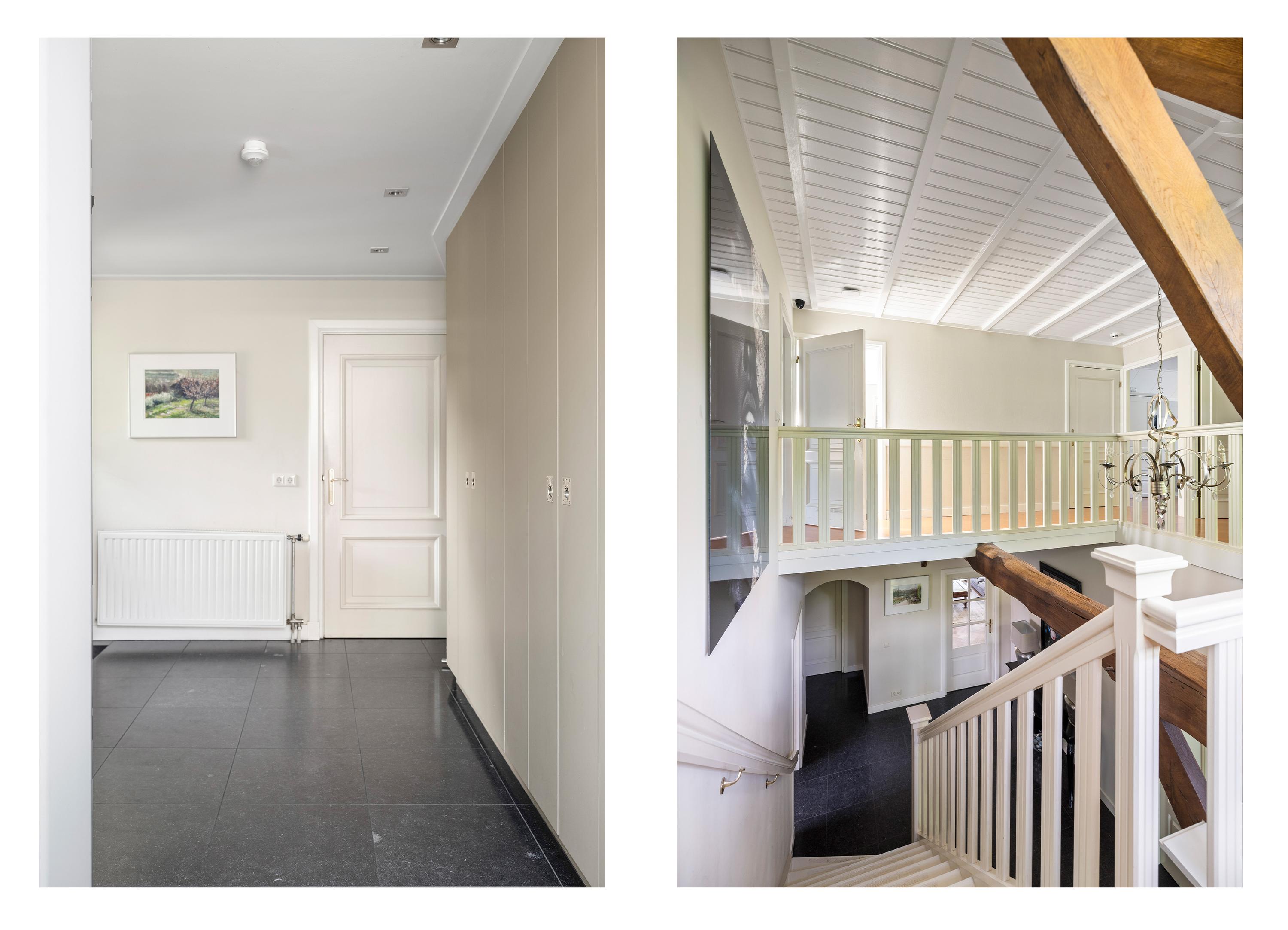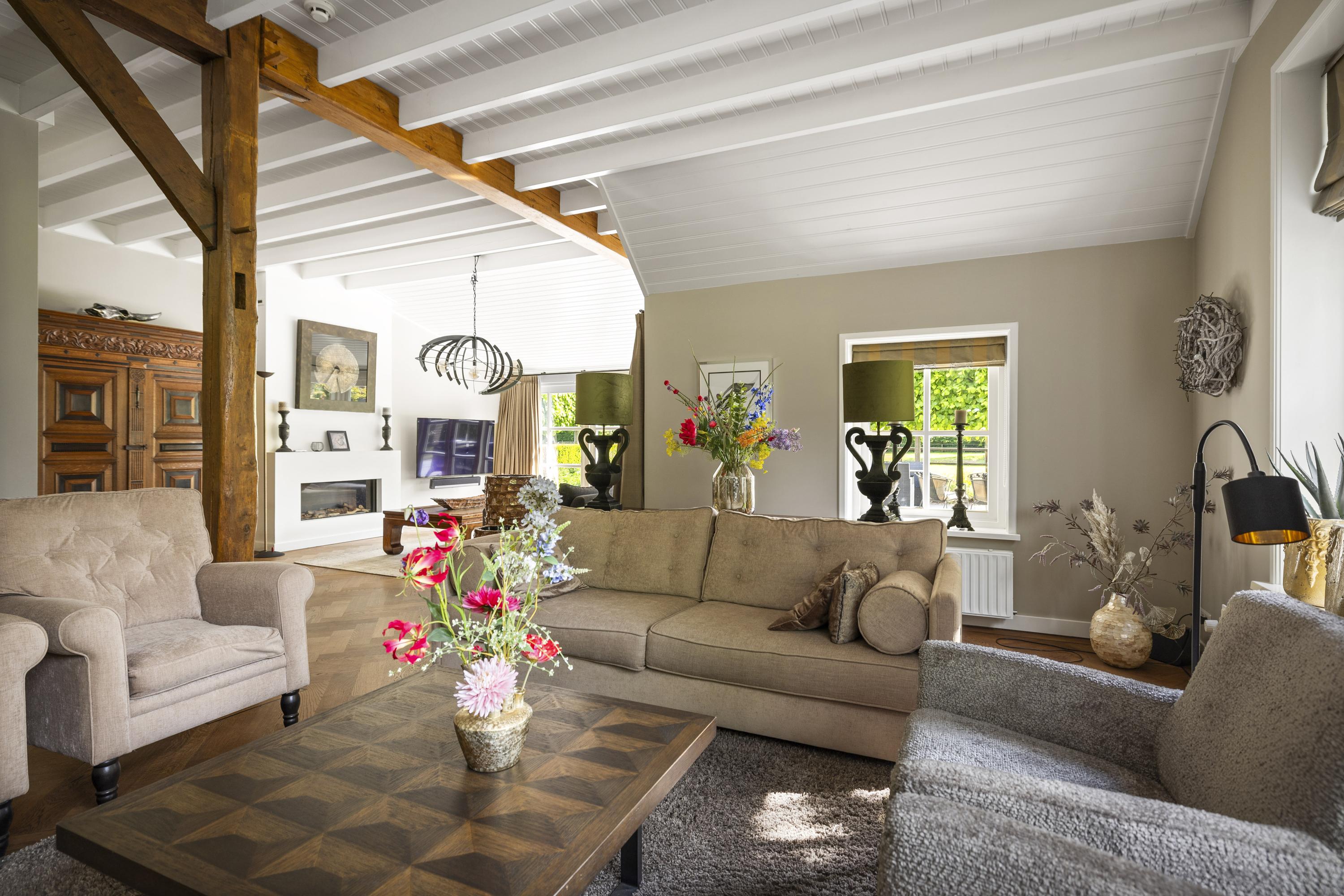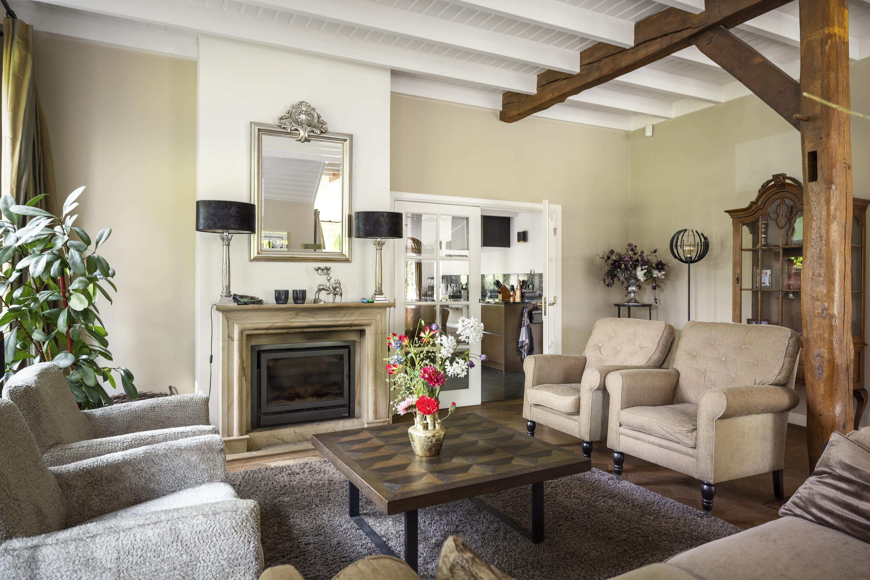 La residencia principal, erigida por primera vez en 1935 y renovada con esmero en los últimos años, ofrece actualmente 258 m² habitables, donde la utilización de piedra natural y parquet de roble en espiga imprime un ritmo cálido y acogedor. Cuatro dormitorios, dos baños y un luminoso vestíbulo central fluyen en un interior artesanal de discreto refinamiento. La cocina, de Lodder Keukens, está pensada tanto para el día a día como para reuniones sociales, con frentes de tonos cobrizos y encimeras de mármol. Los espacios de estar cuentan con dos chimeneas y vistas a jardines cuidados, establos y huertos.