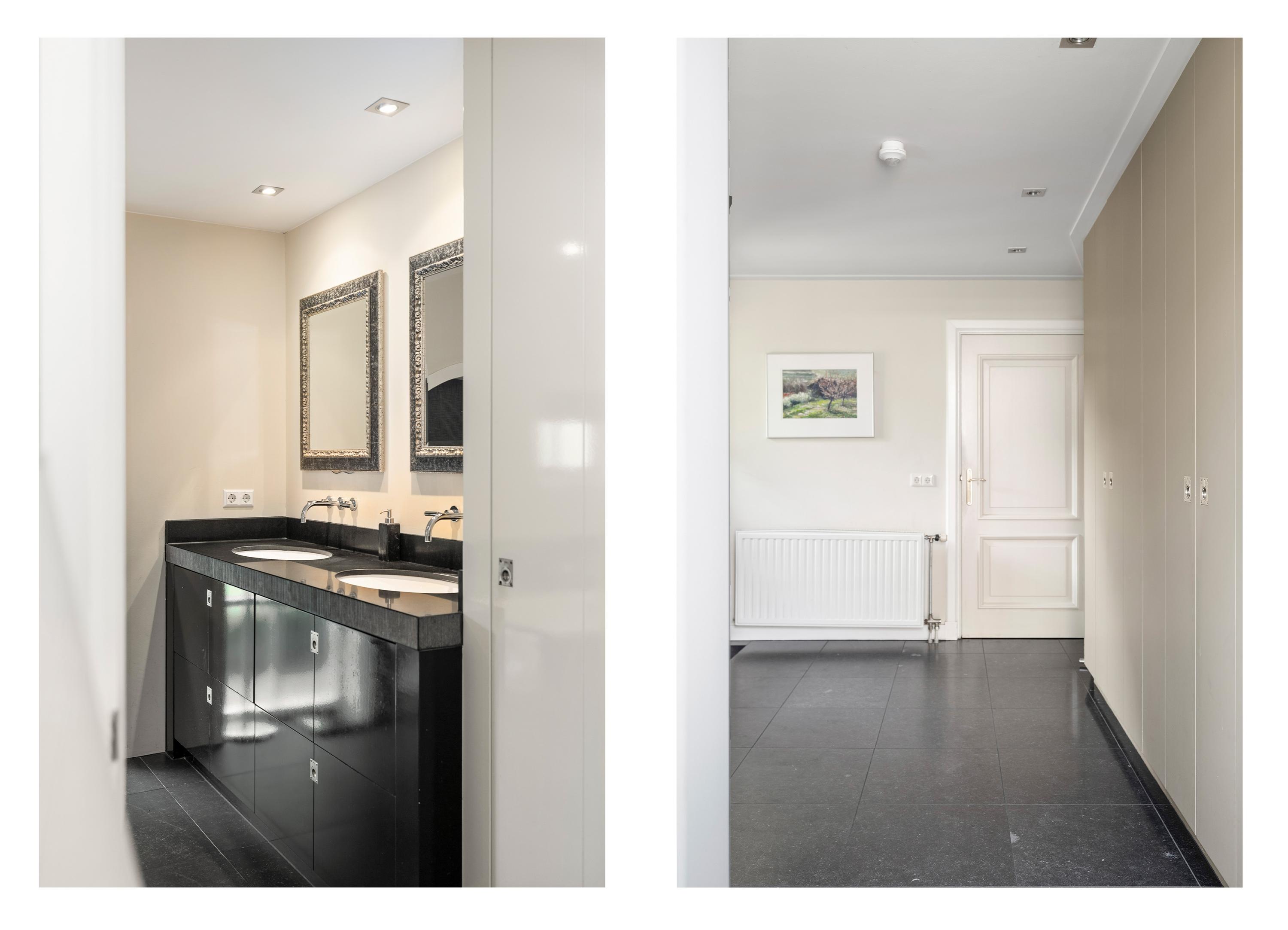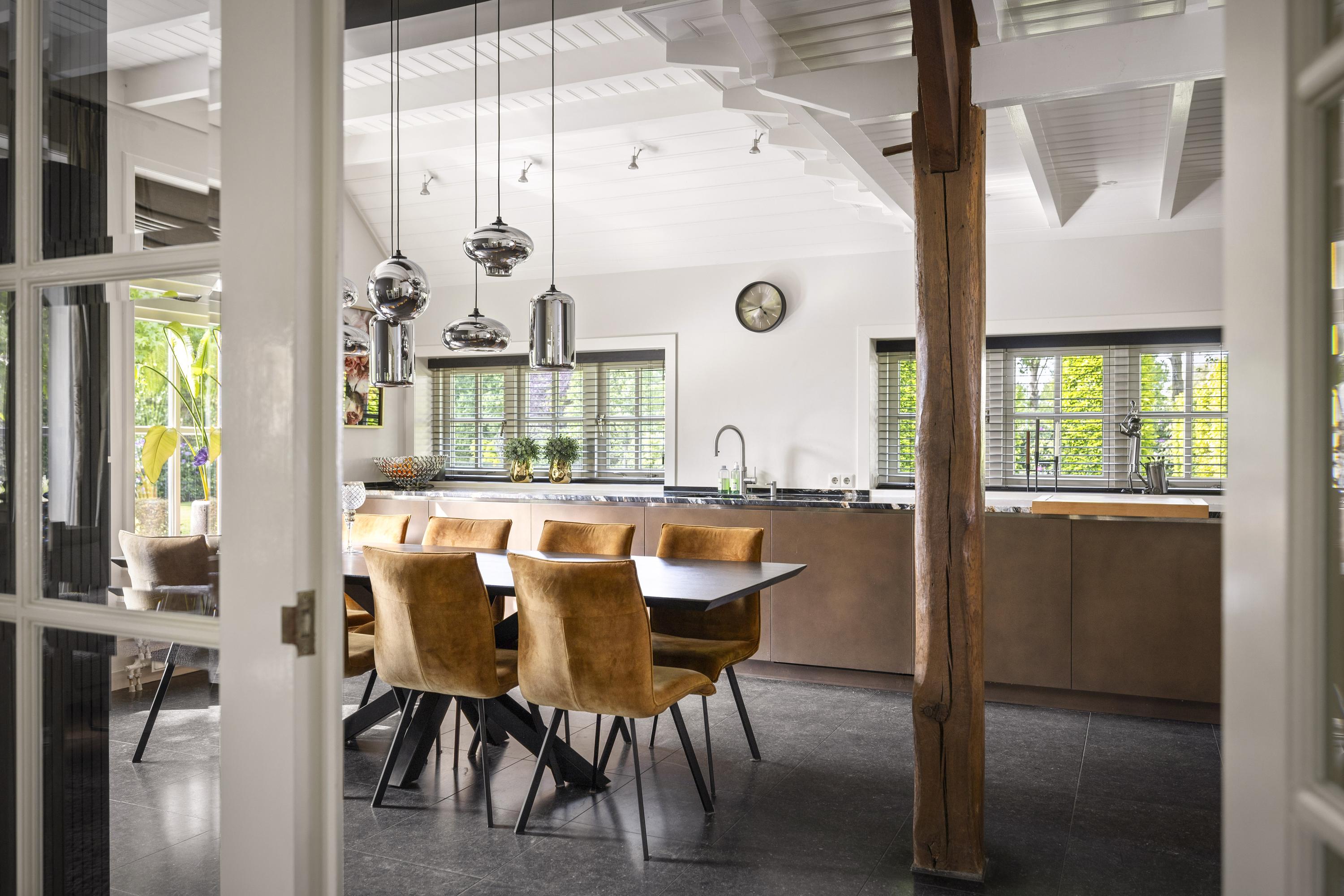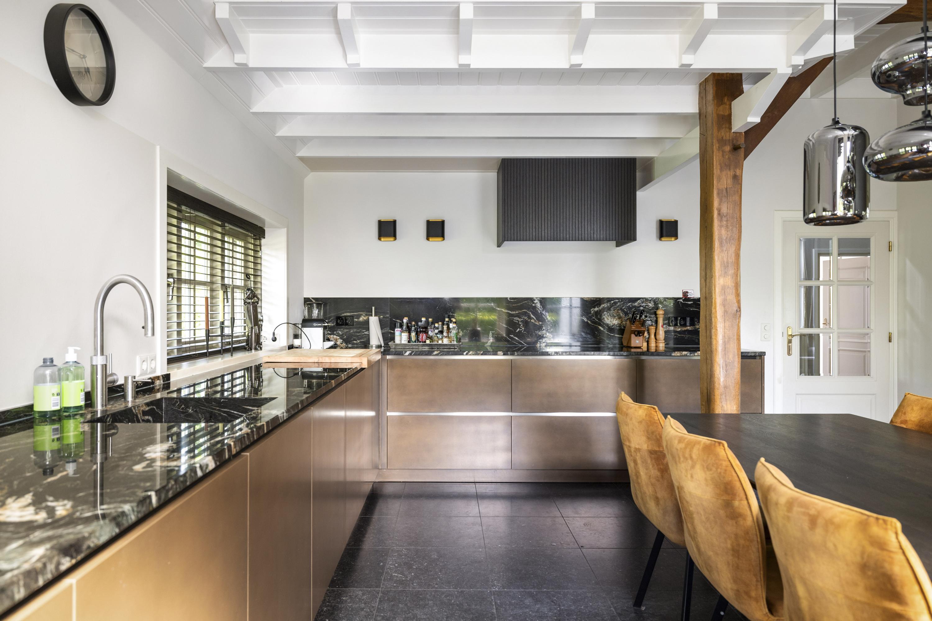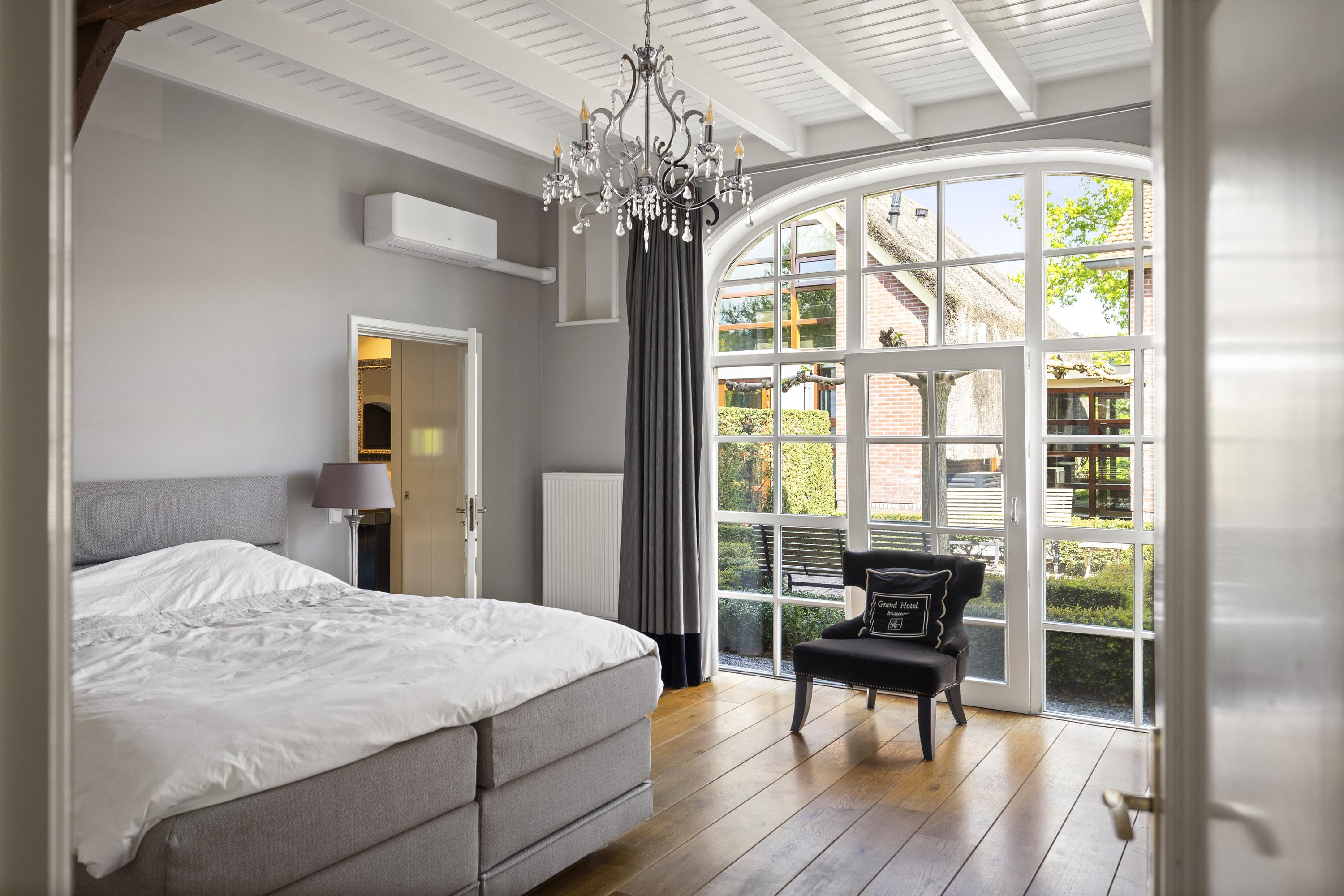 La residencia principal, erigida por primera vez en 1935 y renovada con esmero en los últimos años, ofrece actualmente 258 m² habitables, donde la utilización de piedra natural y parquet de roble en espiga imprime un ritmo cálido y acogedor. Cuatro dormitorios, dos baños y un luminoso vestíbulo central fluyen en un interior artesanal de discreto refinamiento. La cocina, de Lodder Keukens, está pensada tanto para el día a día como para reuniones sociales, con frentes de tonos cobrizos y encimeras de mármol. Los espacios de estar cuentan con dos chimeneas y vistas a jardines cuidados, establos y huertos.