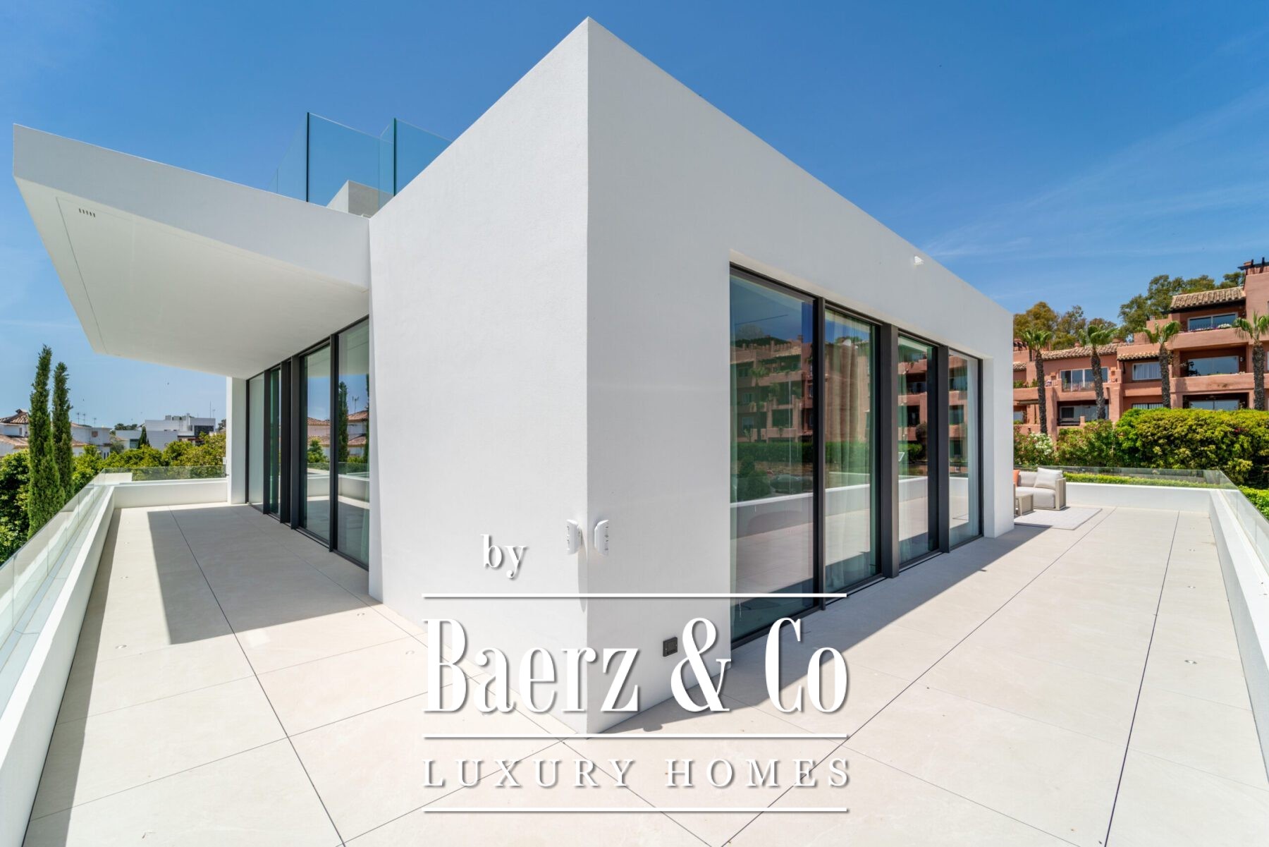 La azotea, con 100 m², está diseñada para ofrecer experiencias gastronómicas panorámicas, una piscina y un área chill out tranquila, perfecta para disfrutar de los emblemáticos atardeceres de Marbella. El entretenimiento fluye con facilidad gracias a una sala de cine, gimnasio y un versátil espacio de ocio en el sótano, complementado por un bar, zona de recepción, lavandería y garaje con capacidad para ocho coches. Seguridad y confort están garantizados gracias a características como alarma, ascensor, aire acondicionado, calefacción por suelo radiante y chimenea.