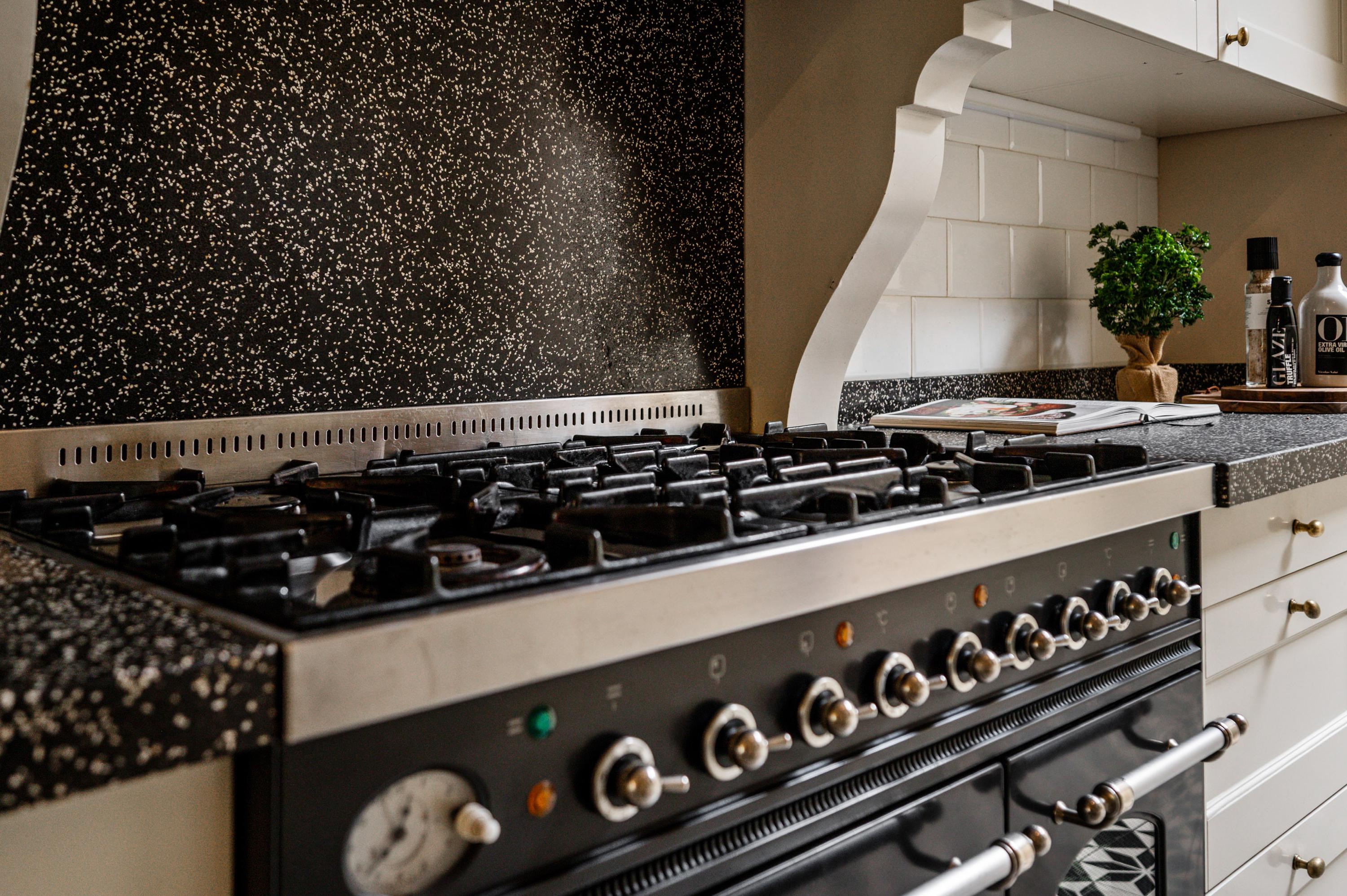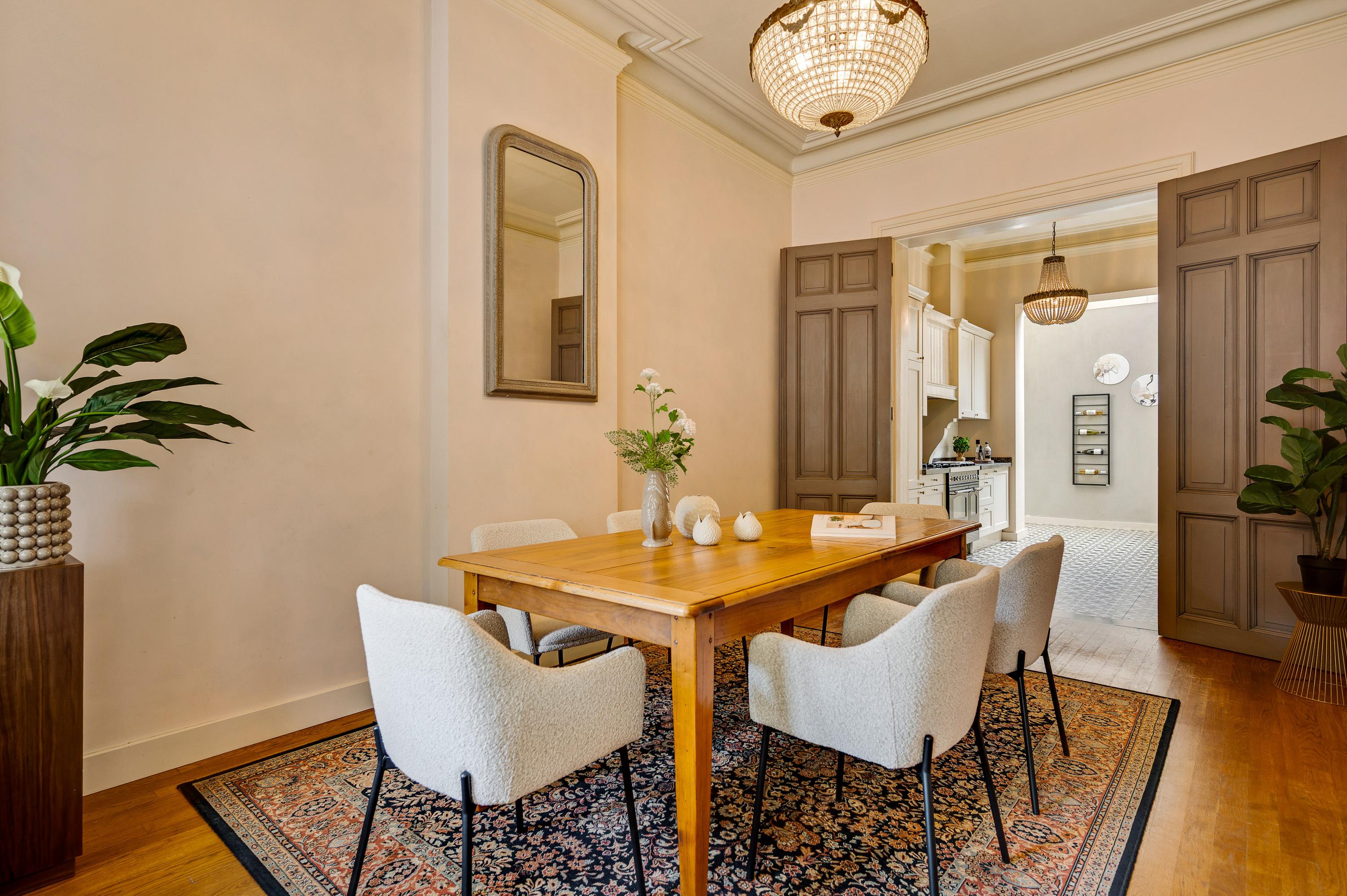 La cocina-comedor, de aproximadamente 25 m², rinde homenaje a la artesanía con una encimera de terrazo, cocina Boretti de seis fuegos y doble horno, además de electrodomésticos integrados de alta gama. La flexibilidad predomina con un estudio completamente equipado en la planta baja, y un estudio en la planta superior con área de cocina, añadido en 2019, que potencia la versatilidad para invitados o trabajo remoto.