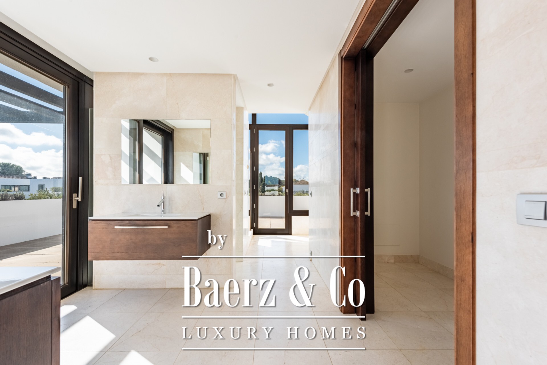 This modern and spacious and bright 4-bedroom apartment stands for luxury living within the esteemed Hacienda Valderrama urbanisation, comprising a private lift, private large garage, and basement, and offers unparalleled convenience and exclusivity. The main floor features three bedroom suites, complemented by expansive living and dining areas, connected to a well-appointed kitchen and utility room. On the upper floor is the master suite which is framed by a terrace. Surrounding these spaces are generous open and covered terraces, perfect for both relaxation and entertaining. The urbanisation of only 34 apartments provides 24hrs security, a large communal swimming pool and beautifully landscaped gardens.