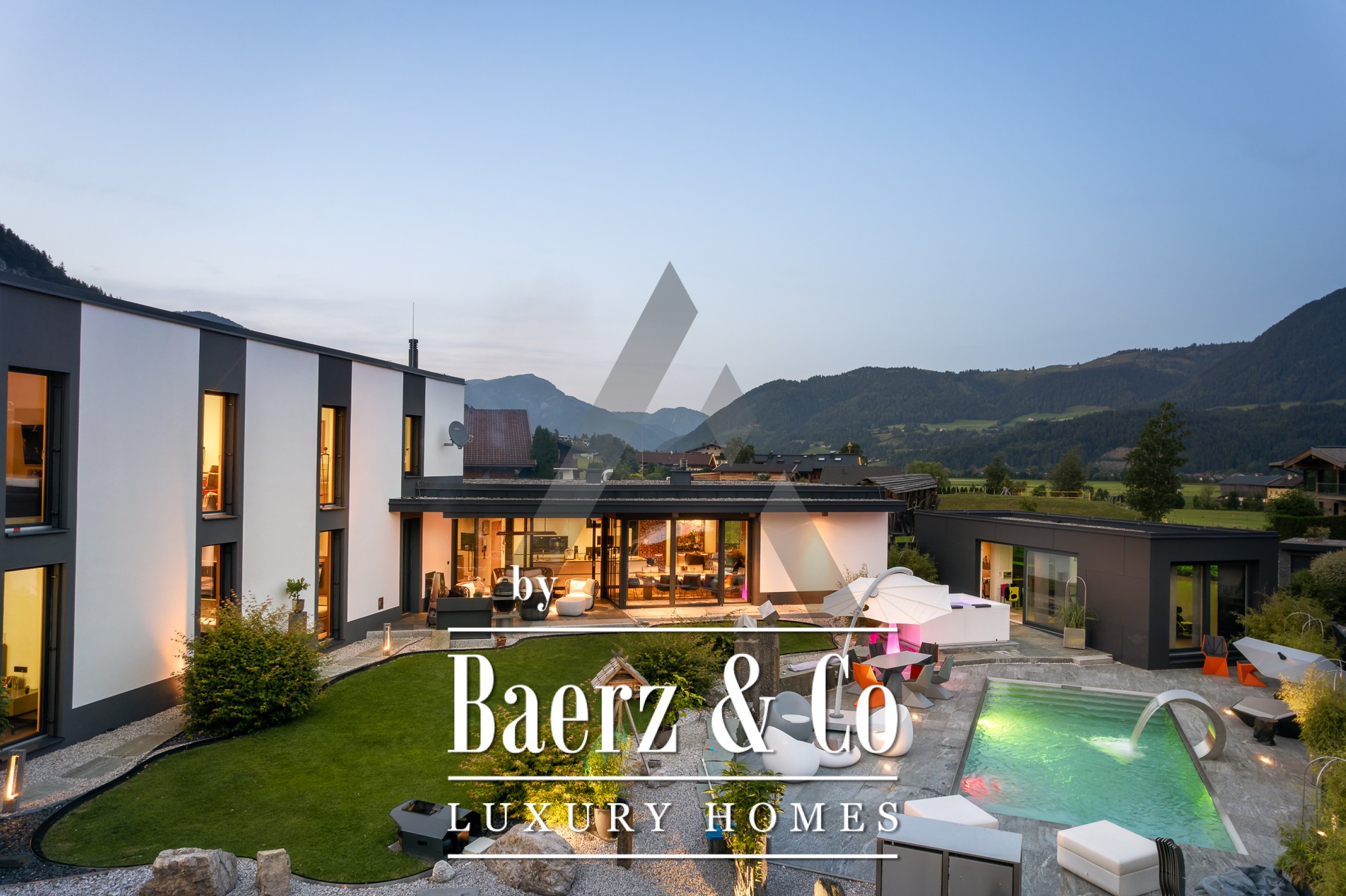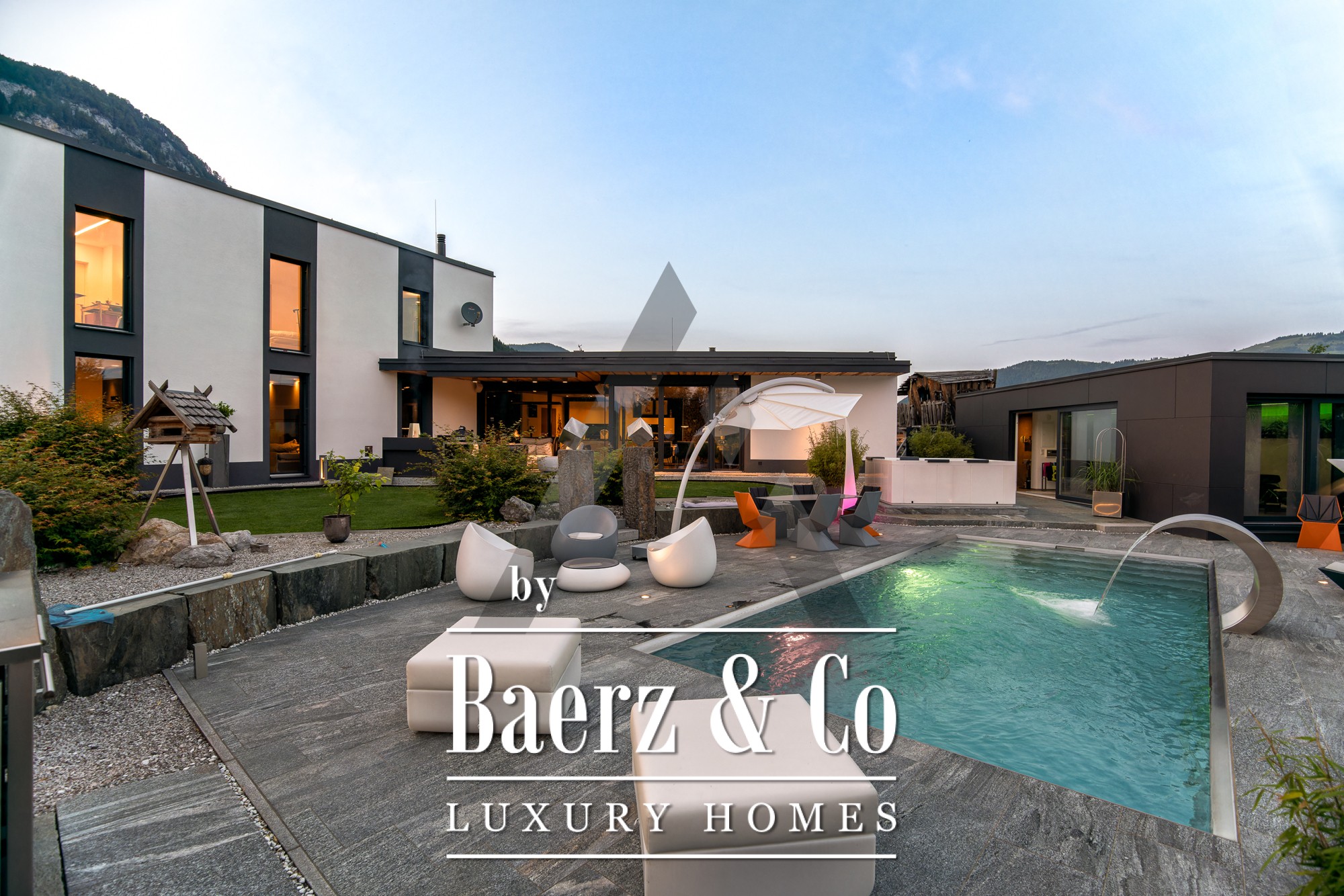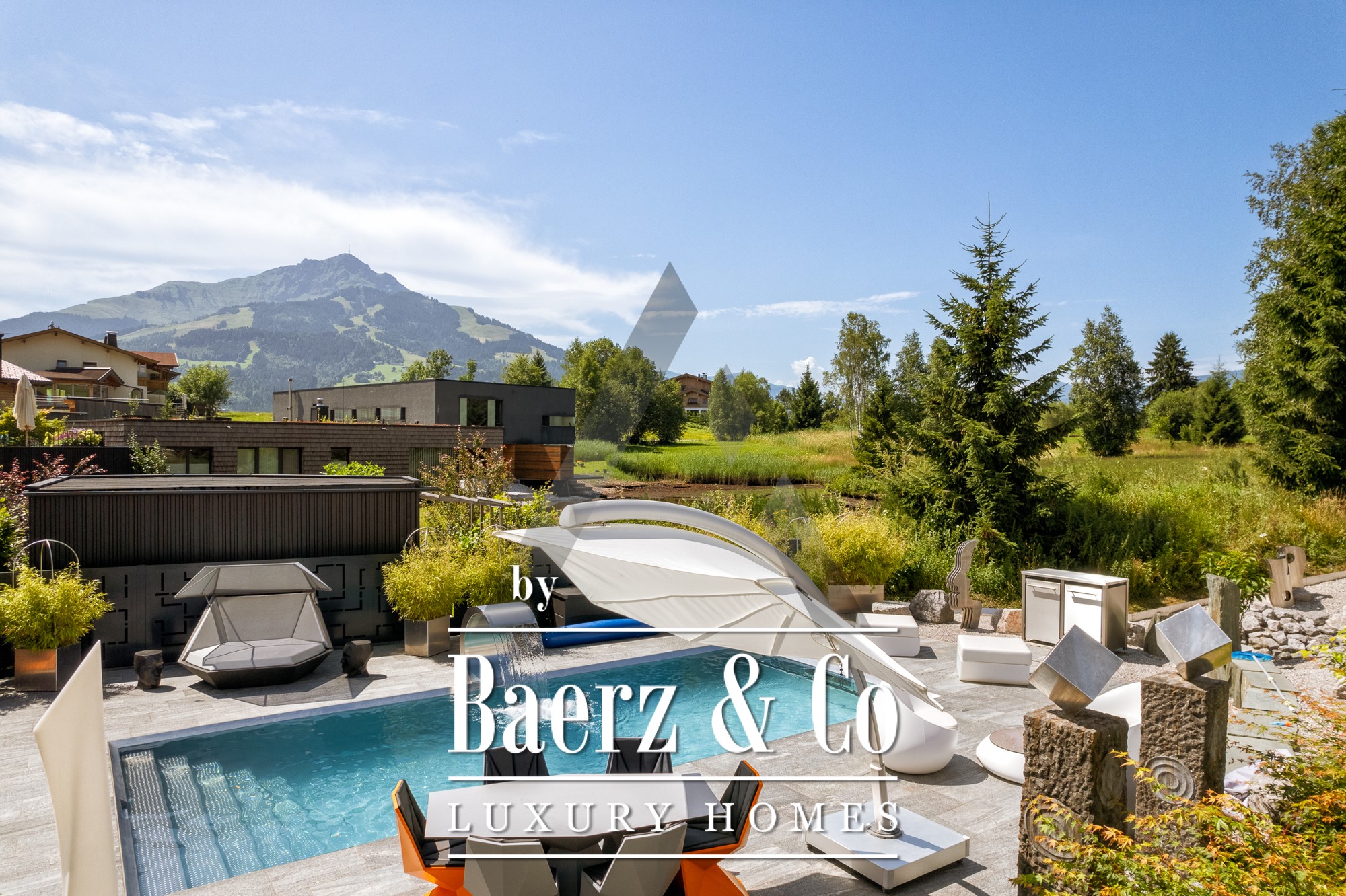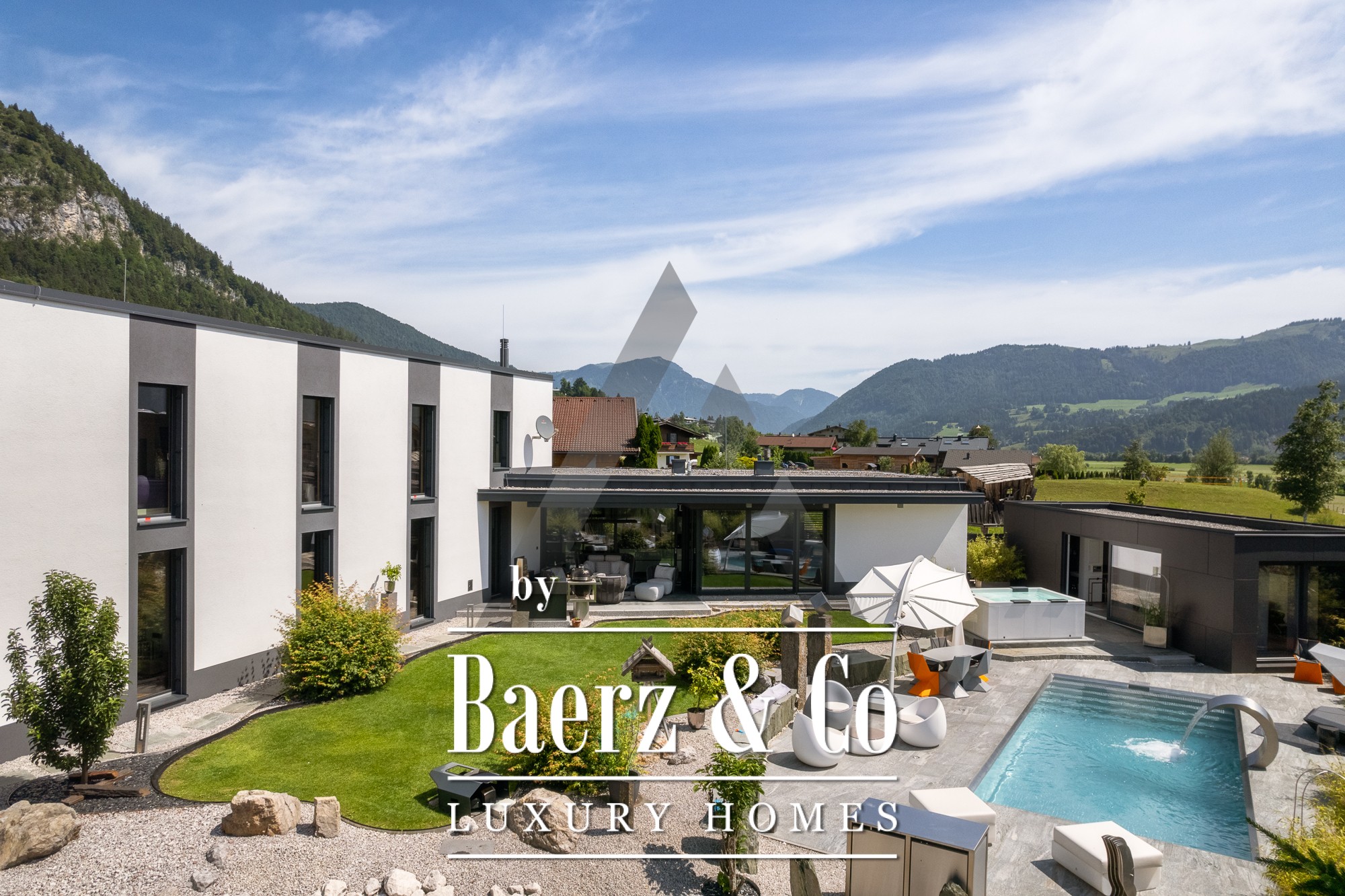 La casa independiente en St. Johann in Tirol se ubica en una posición tranquila y bañada por el sol, ofreciendo vistas panorámicas al Kitzbühel Horn y a las montañas Wilder Kaiser. Esta propiedad contemporánea, con 418 m² de superficie habitable en una parcela de 1.186 m², encarna la esencia de la vida alpina refinada. Un paisaje idílico se despliega con un estanque, arroyos ajardinados, amplias terrazas y panorámicas de montaña. El entorno exterior se realza con una piscina de acero inoxidable, un jacuzzi de diseño Treesse y una sauna, que invitan a disfrutar de mañanas relajadas y tardes reparadoras.
