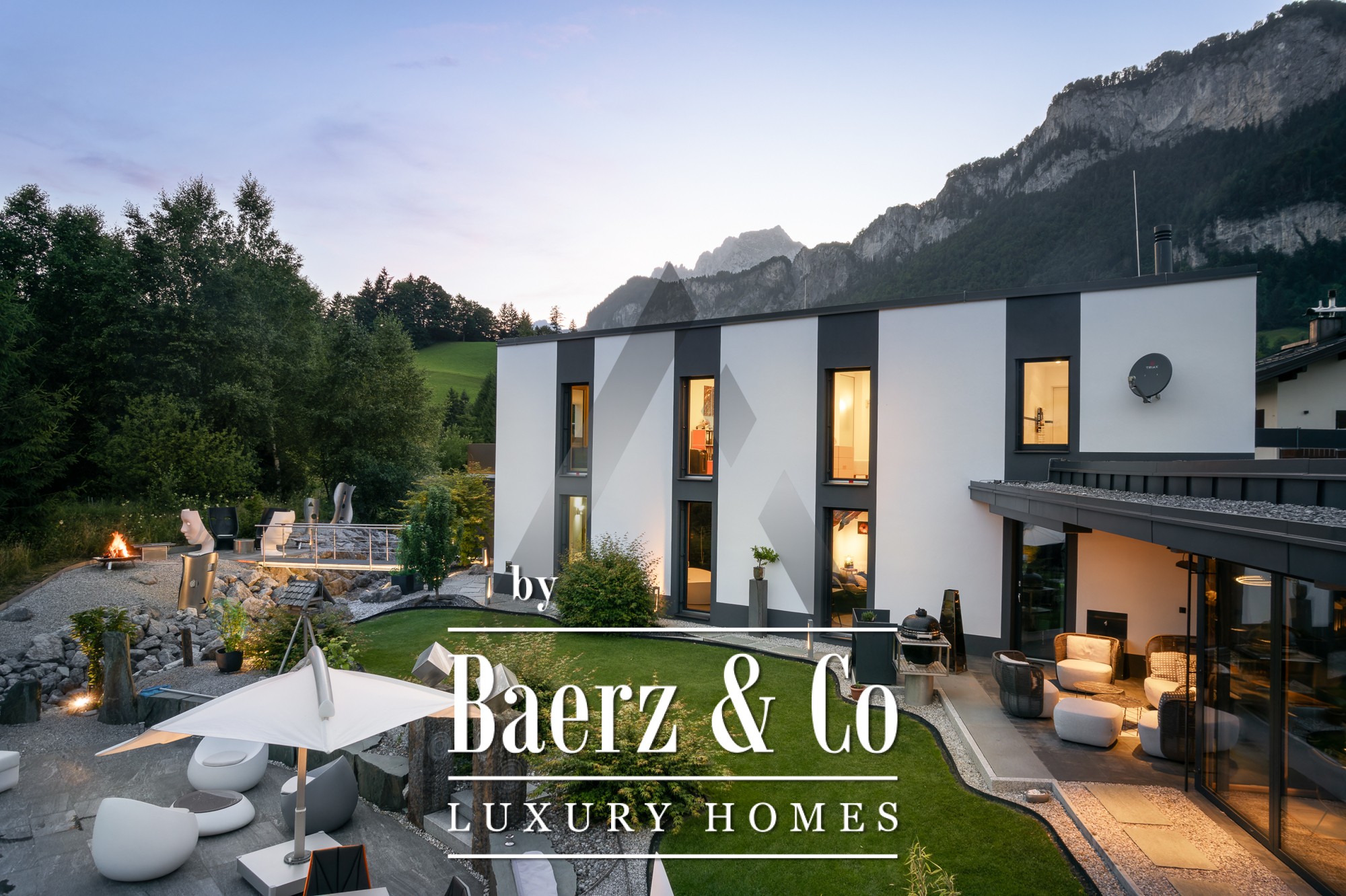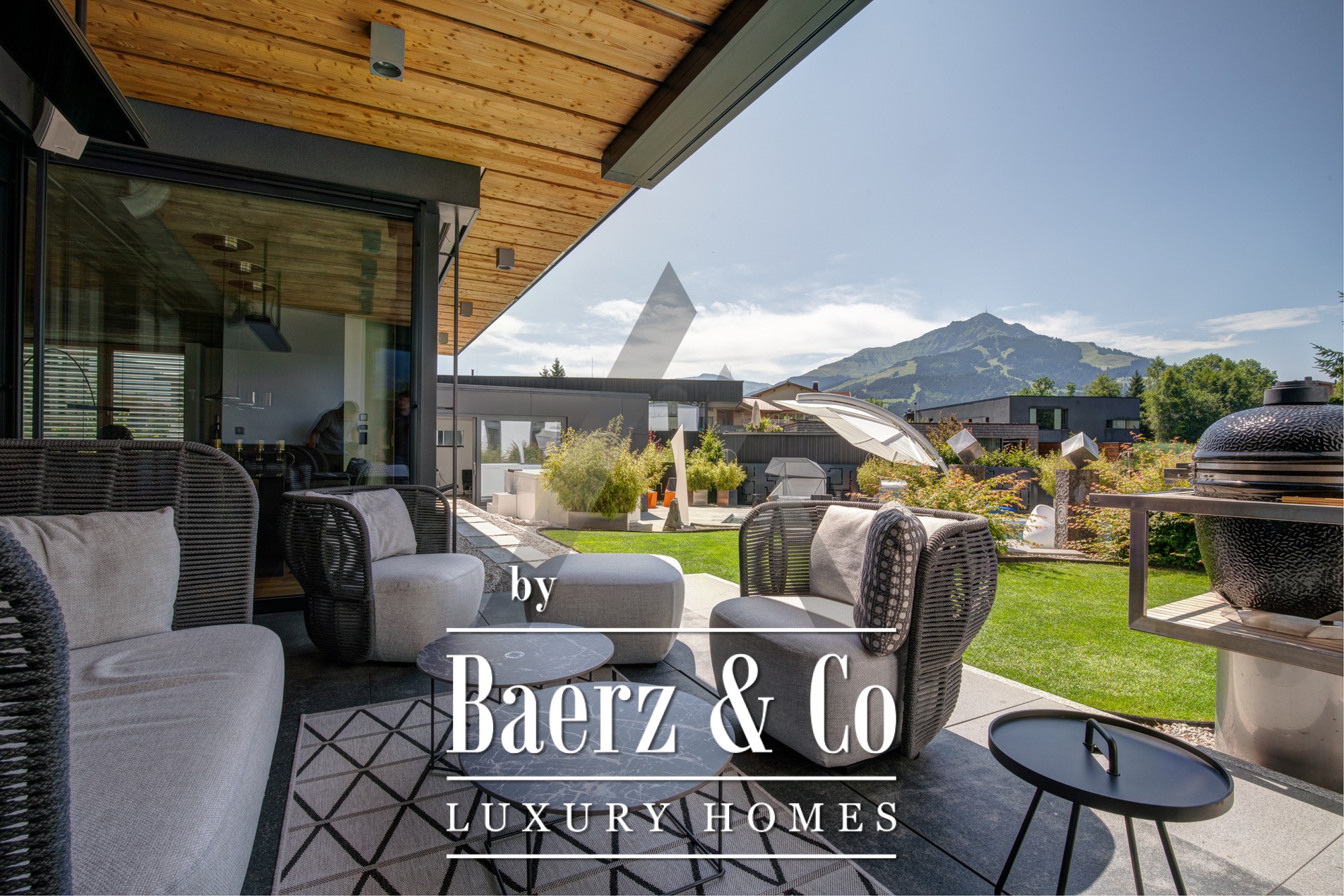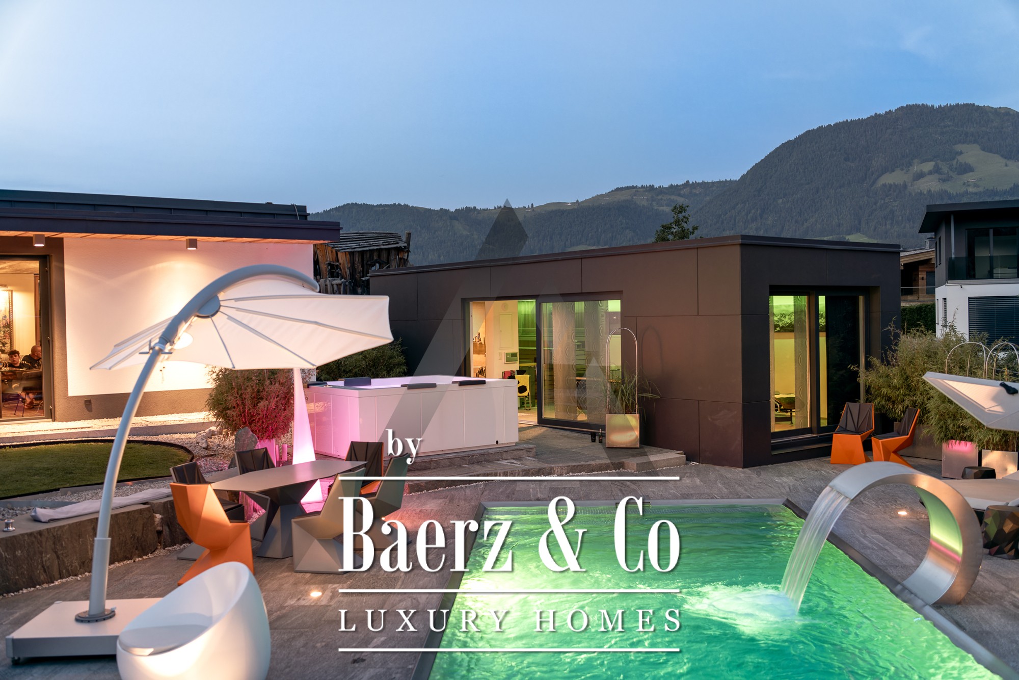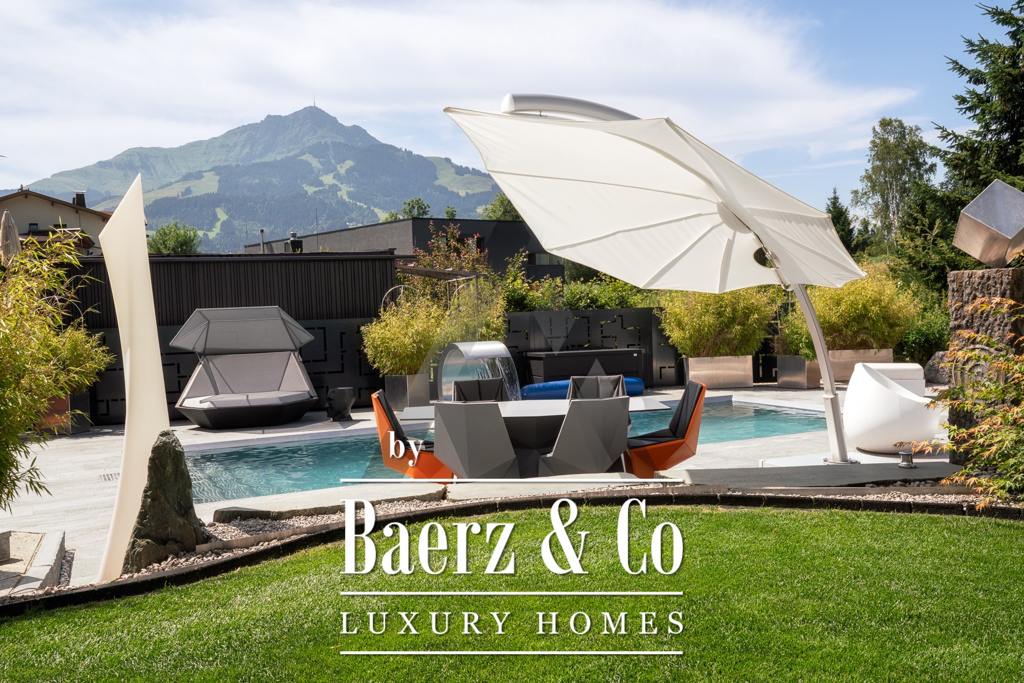 La casa independiente en St. Johann in Tirol se ubica en una posición tranquila y bañada por el sol, ofreciendo vistas panorámicas al Kitzbühel Horn y a las montañas Wilder Kaiser. Esta propiedad contemporánea, con 418 m² de superficie habitable en una parcela de 1.186 m², encarna la esencia de la vida alpina refinada. Un paisaje idílico se despliega con un estanque, arroyos ajardinados, amplias terrazas y panorámicas de montaña. El entorno exterior se realza con una piscina de acero inoxidable, un jacuzzi de diseño Treesse y una sauna, que invitan a disfrutar de mañanas relajadas y tardes reparadoras.