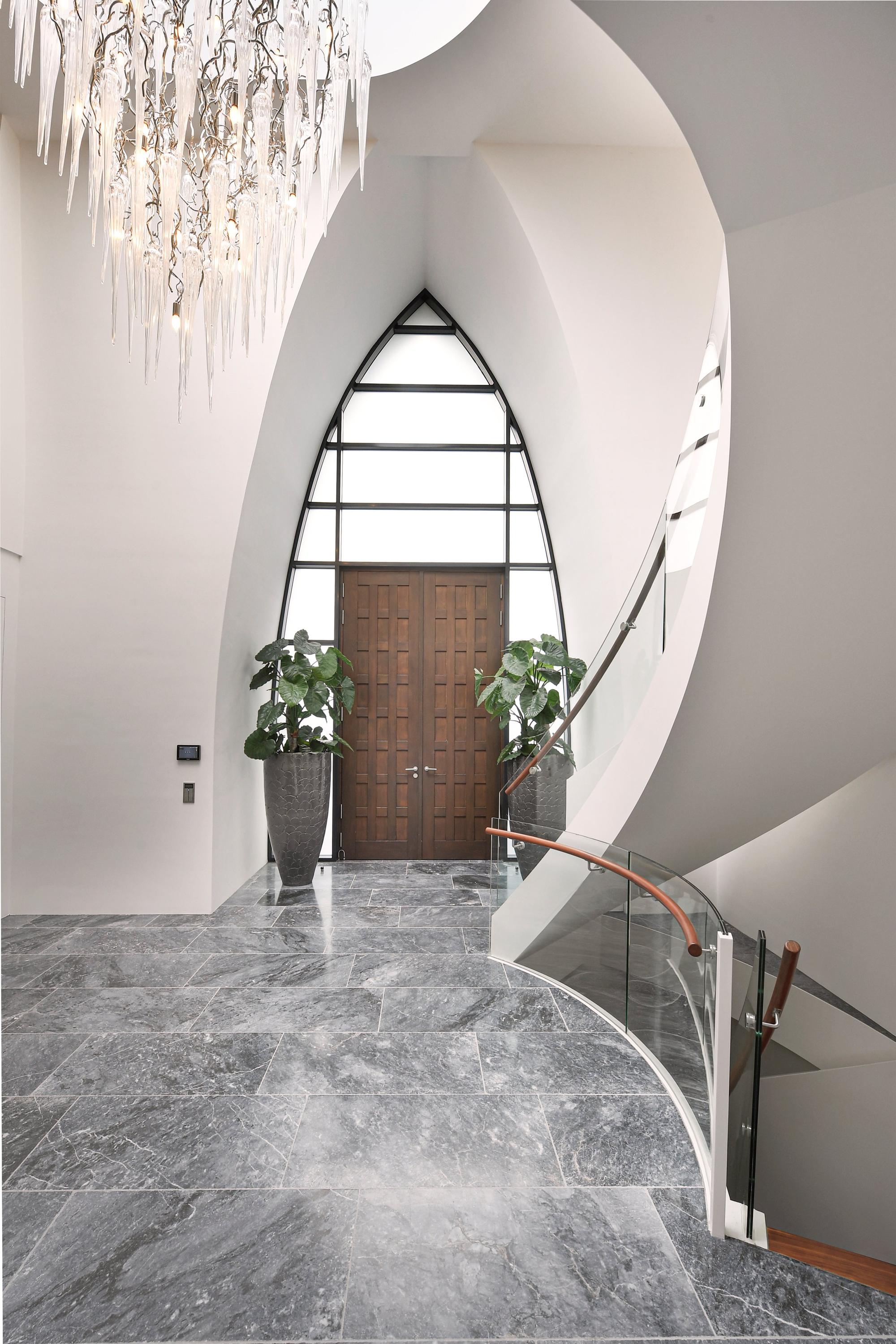 El sótano está dedicado al bienestar, con una piscina interior climatizada de 13 metros rodeada de paredes esculpidas en forma de olas, además de cine privado, gimnasio, cabina de vapor, sauna e iluminación ambiental en todos los espacios.