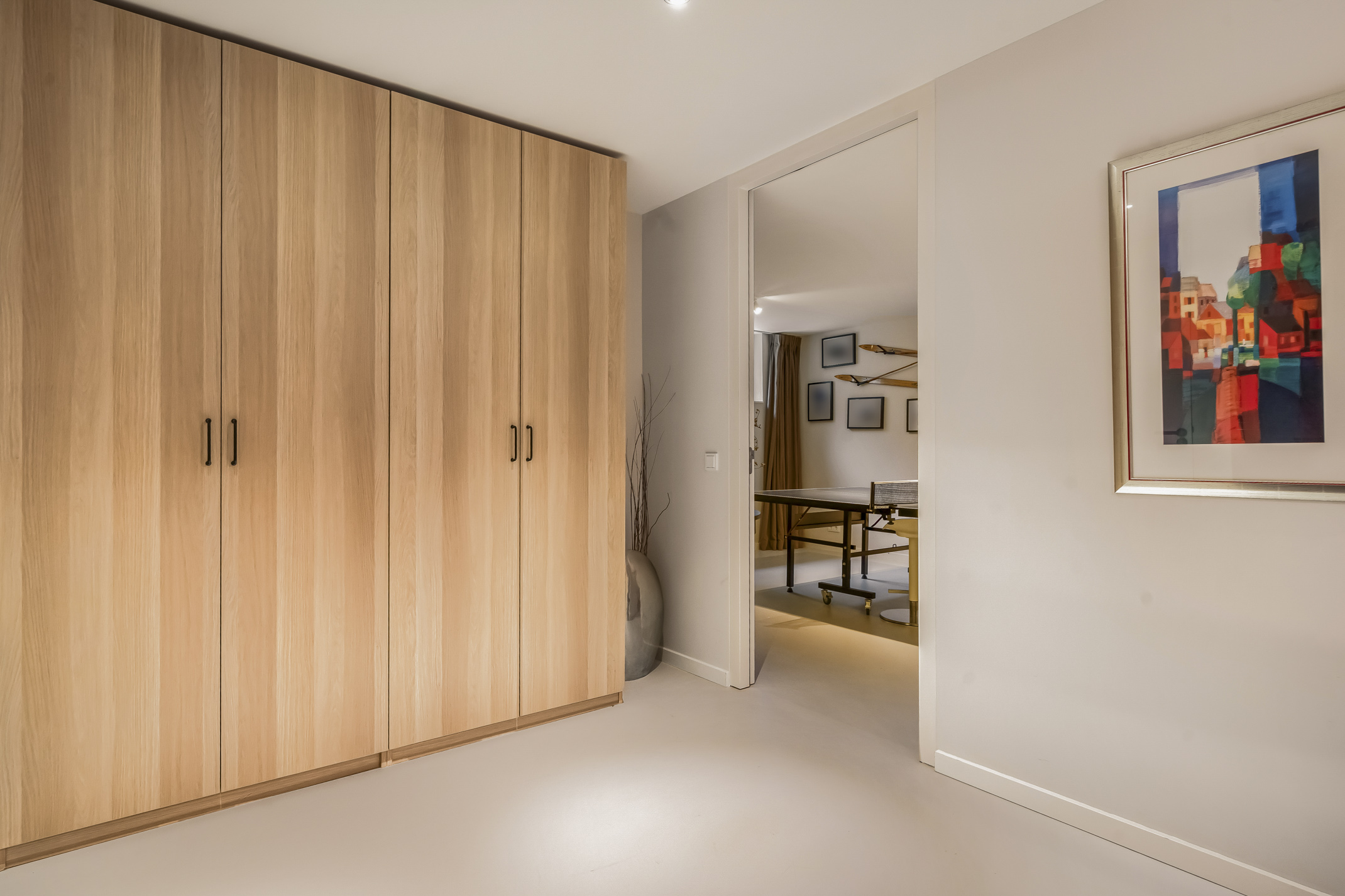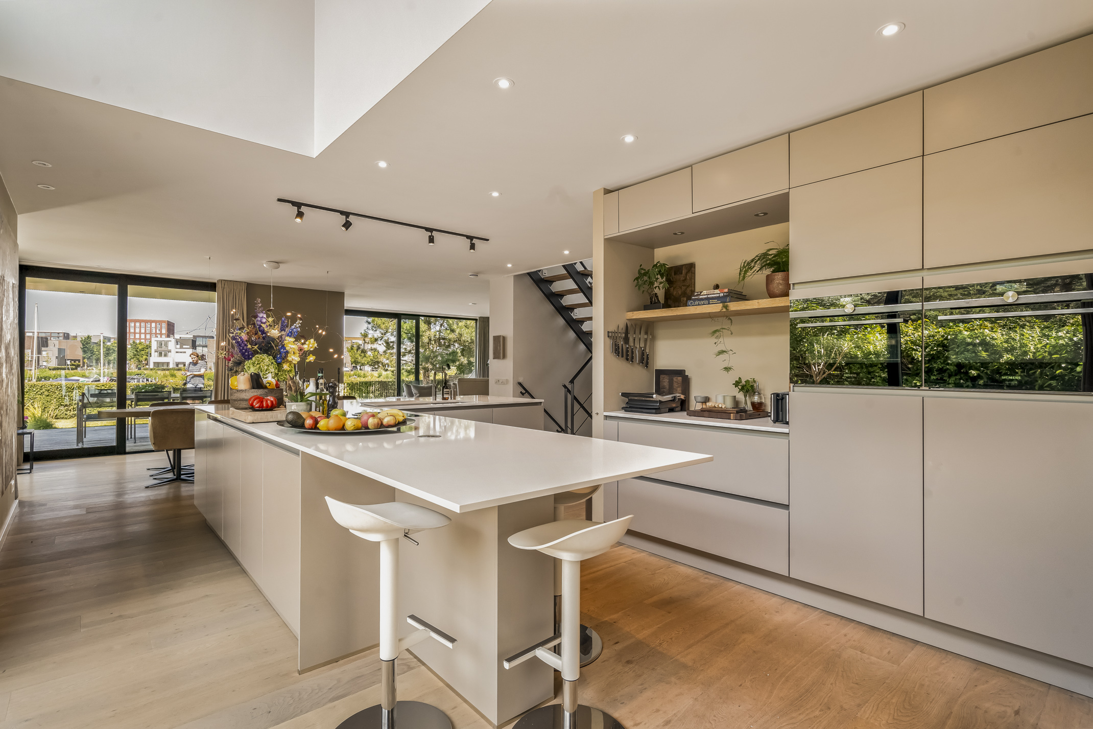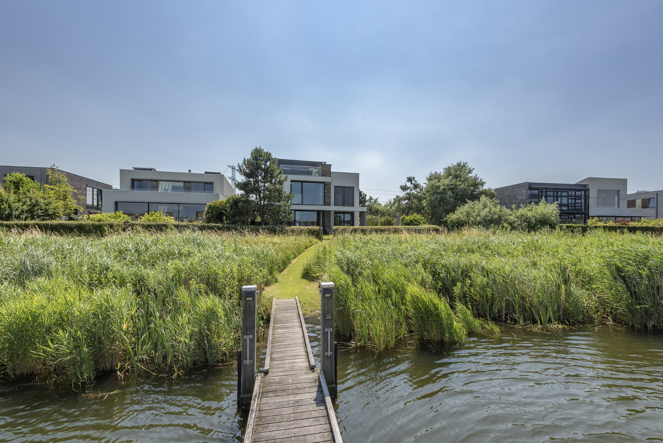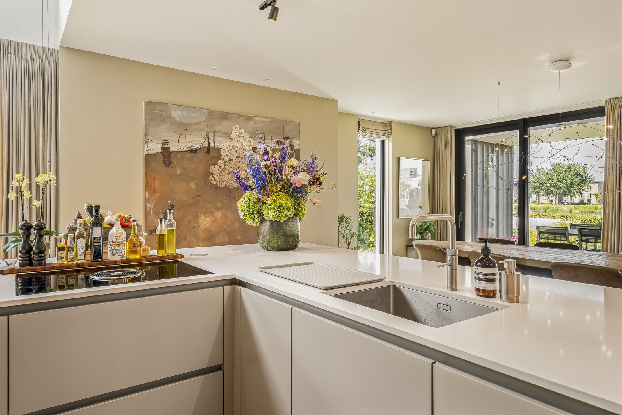 Répartie sur trois niveaux d’habitation et un sous-sol raffiné, la villa propose six chambres (avec possibilité d’une septième), trois salles de bains, ainsi qu’une suite parentale dotée d’un dressing et d’une baignoire indépendante offrant une vue apaisante sur l’eau. La cuisine marie savoir-faire raffiné et fonctionnalité au quotidien : plaque à induction Bora avec hotte intégrée, robinet Quooker, vaste espace réfrigéré et coin café dédié définissent un accueil élégant et soigné.