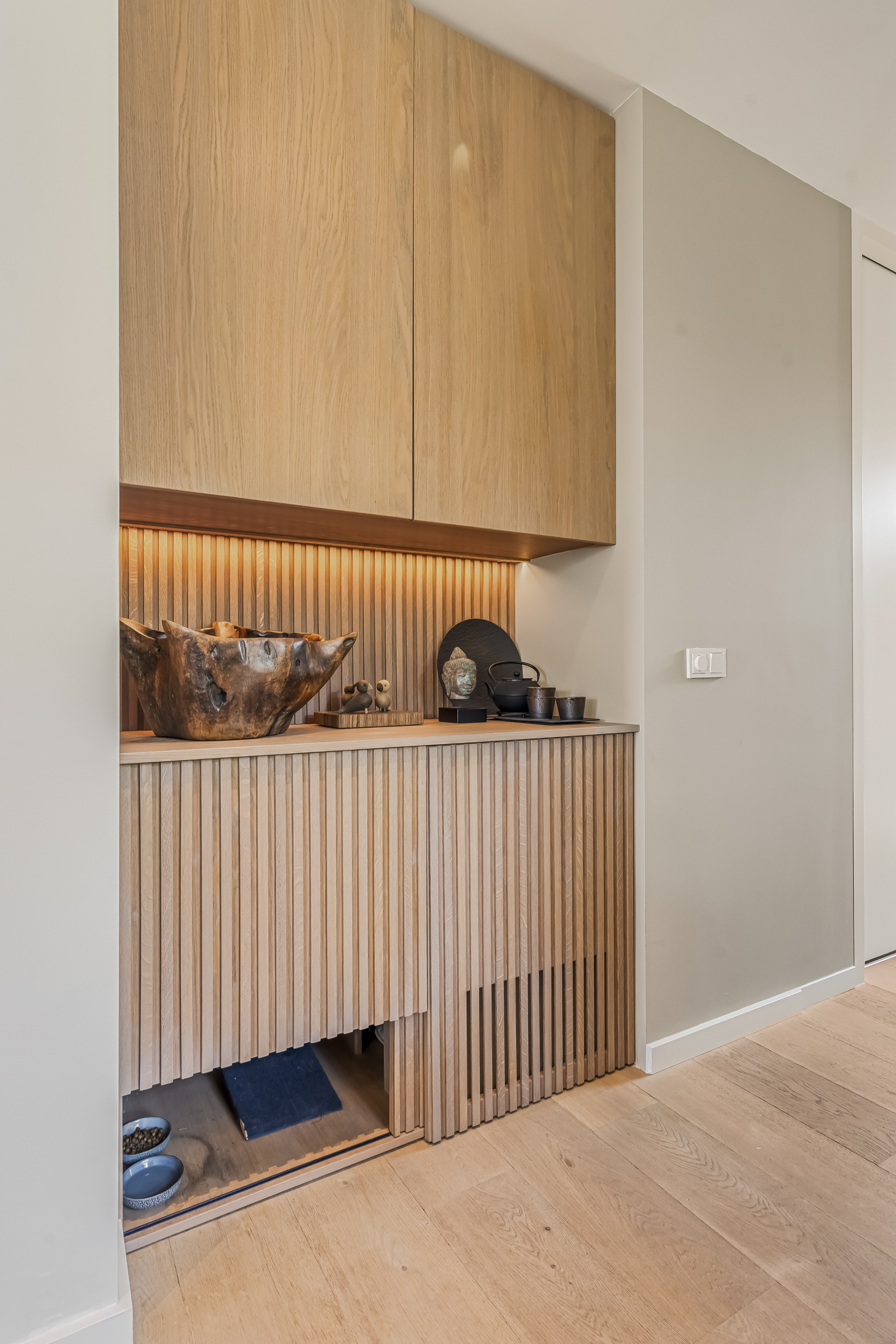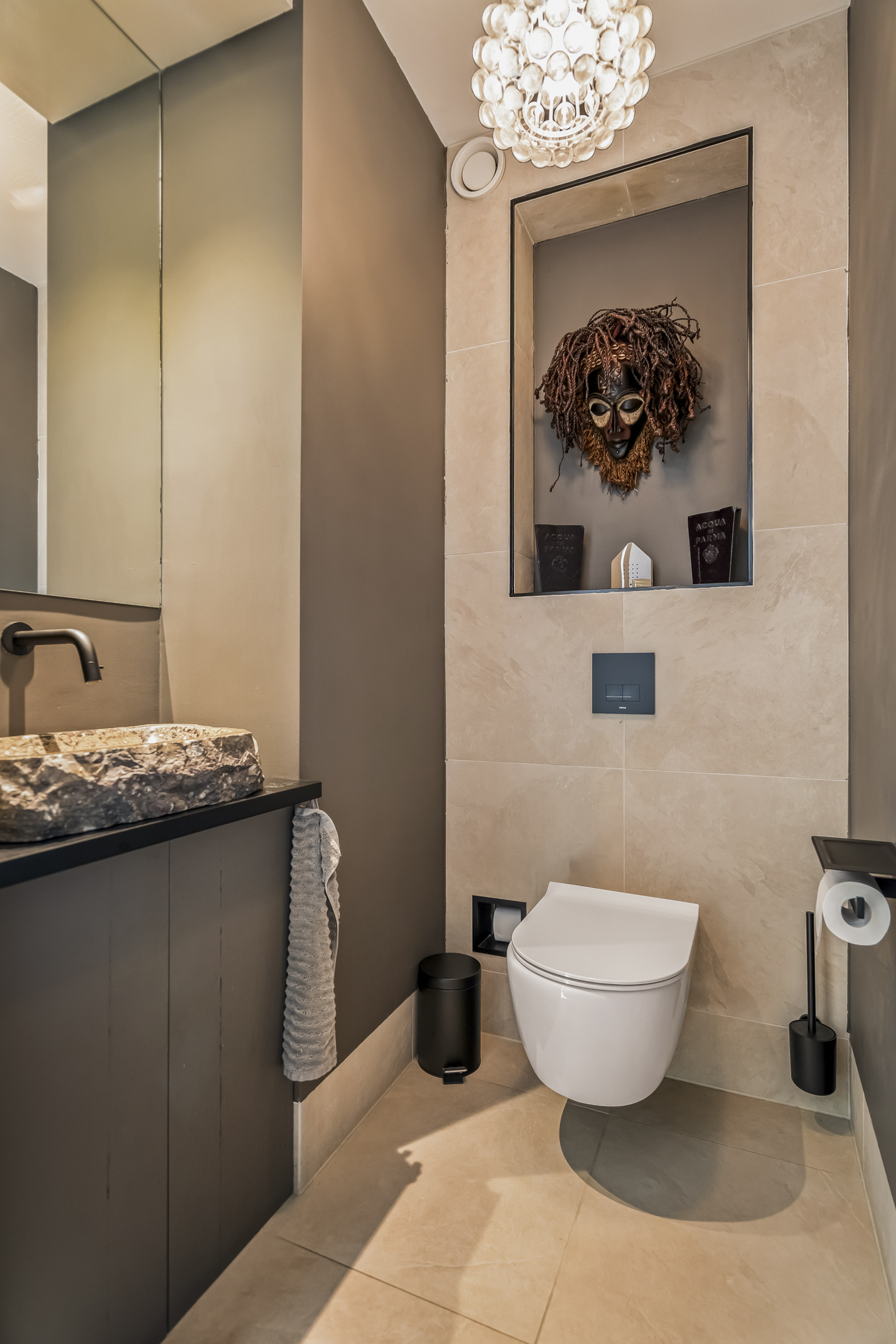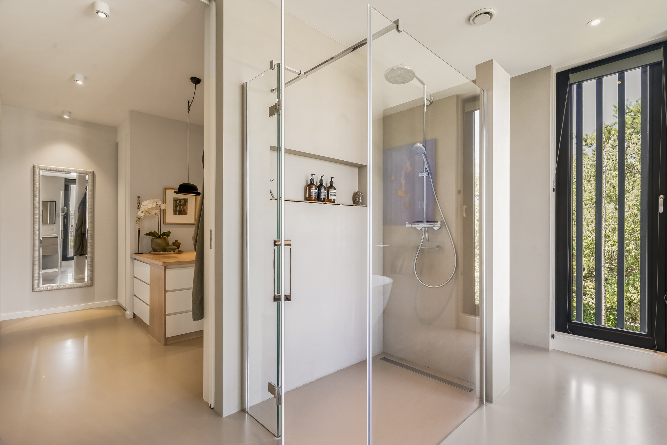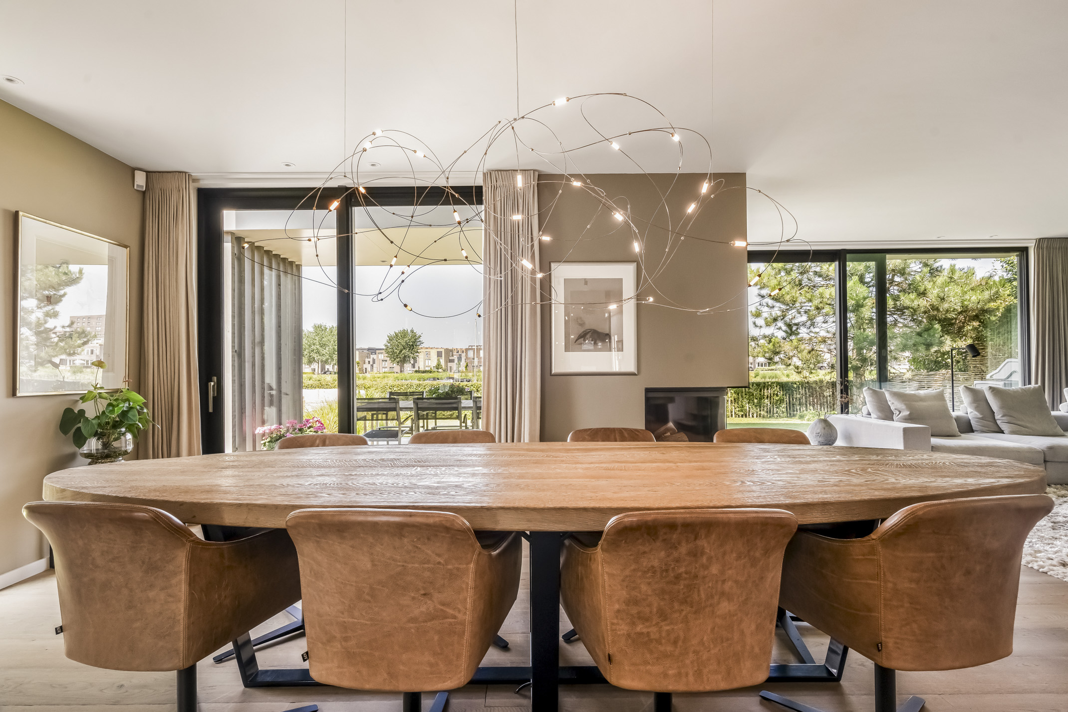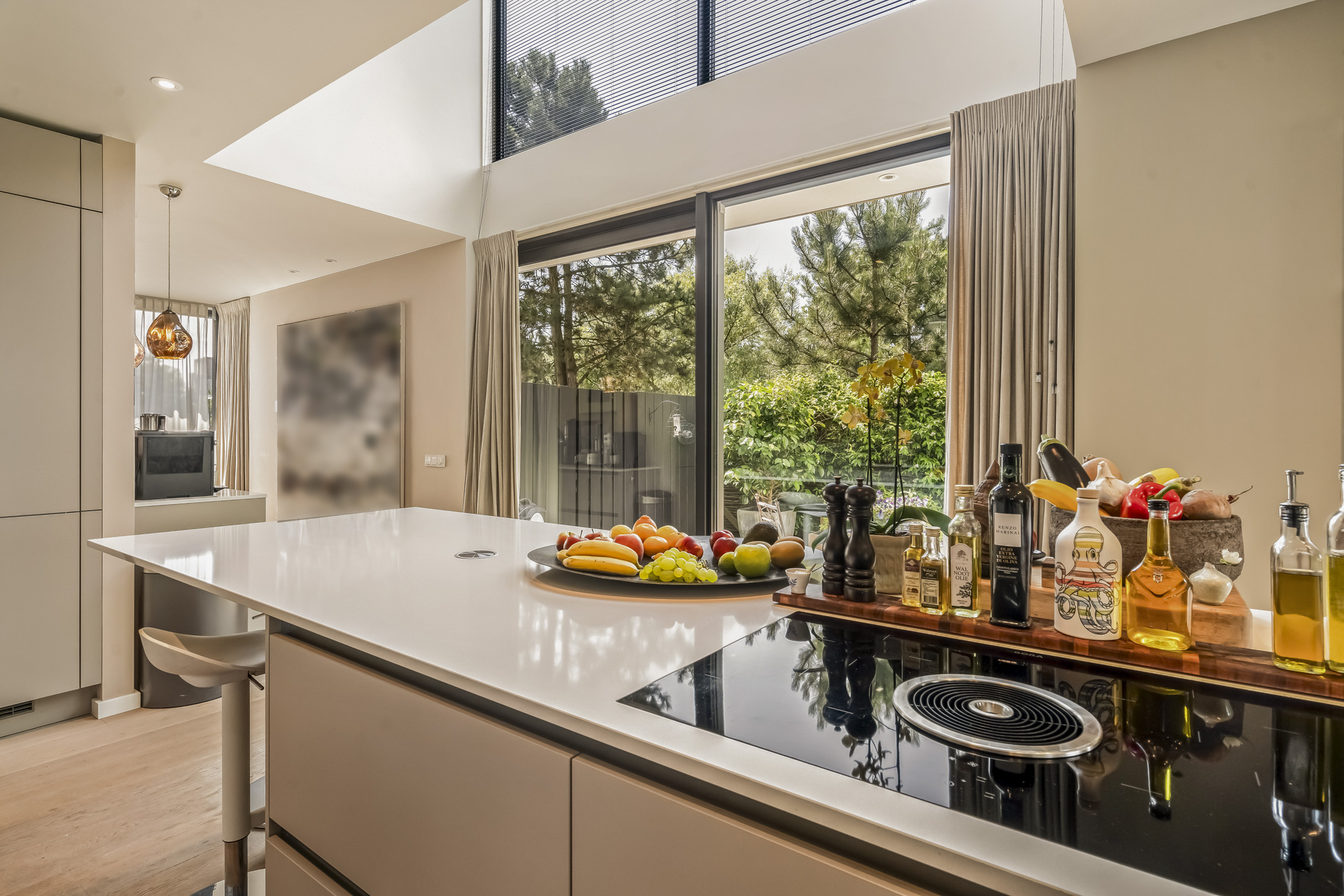 Répartie sur trois niveaux d’habitation et un sous-sol raffiné, la villa propose six chambres (avec possibilité d’une septième), trois salles de bains, ainsi qu’une suite parentale dotée d’un dressing et d’une baignoire indépendante offrant une vue apaisante sur l’eau. La cuisine marie savoir-faire raffiné et fonctionnalité au quotidien : plaque à induction Bora avec hotte intégrée, robinet Quooker, vaste espace réfrigéré et coin café dédié définissent un accueil élégant et soigné.