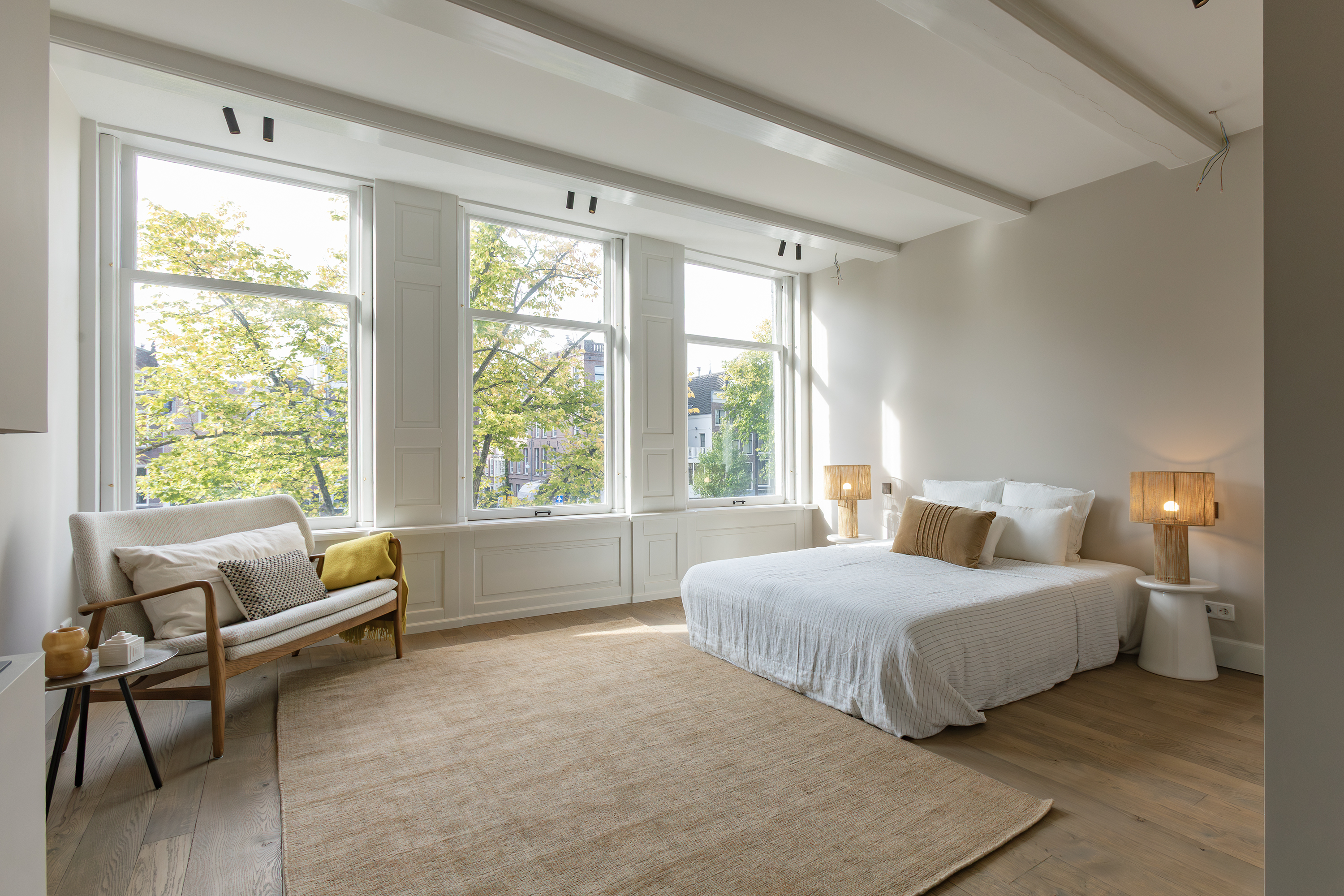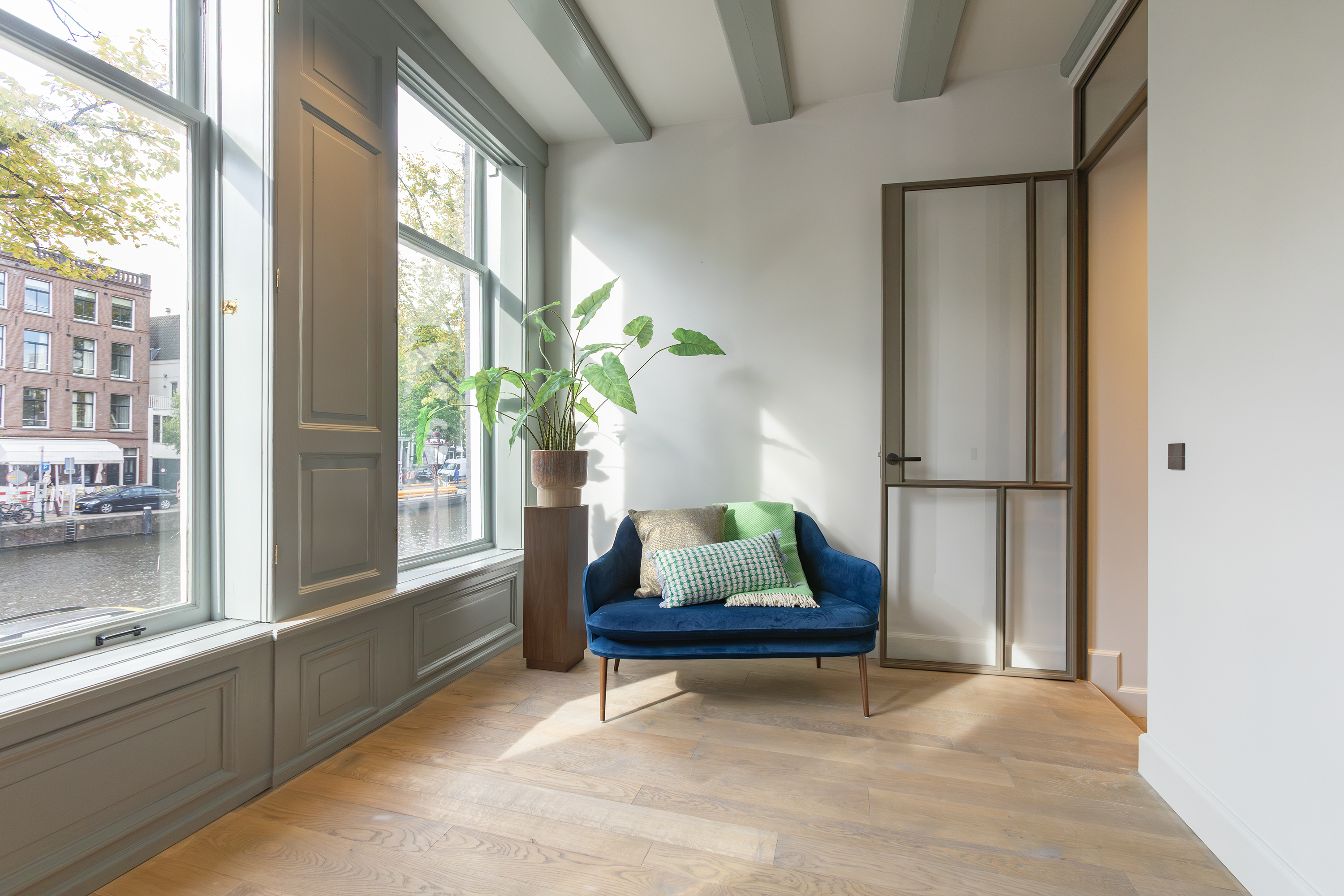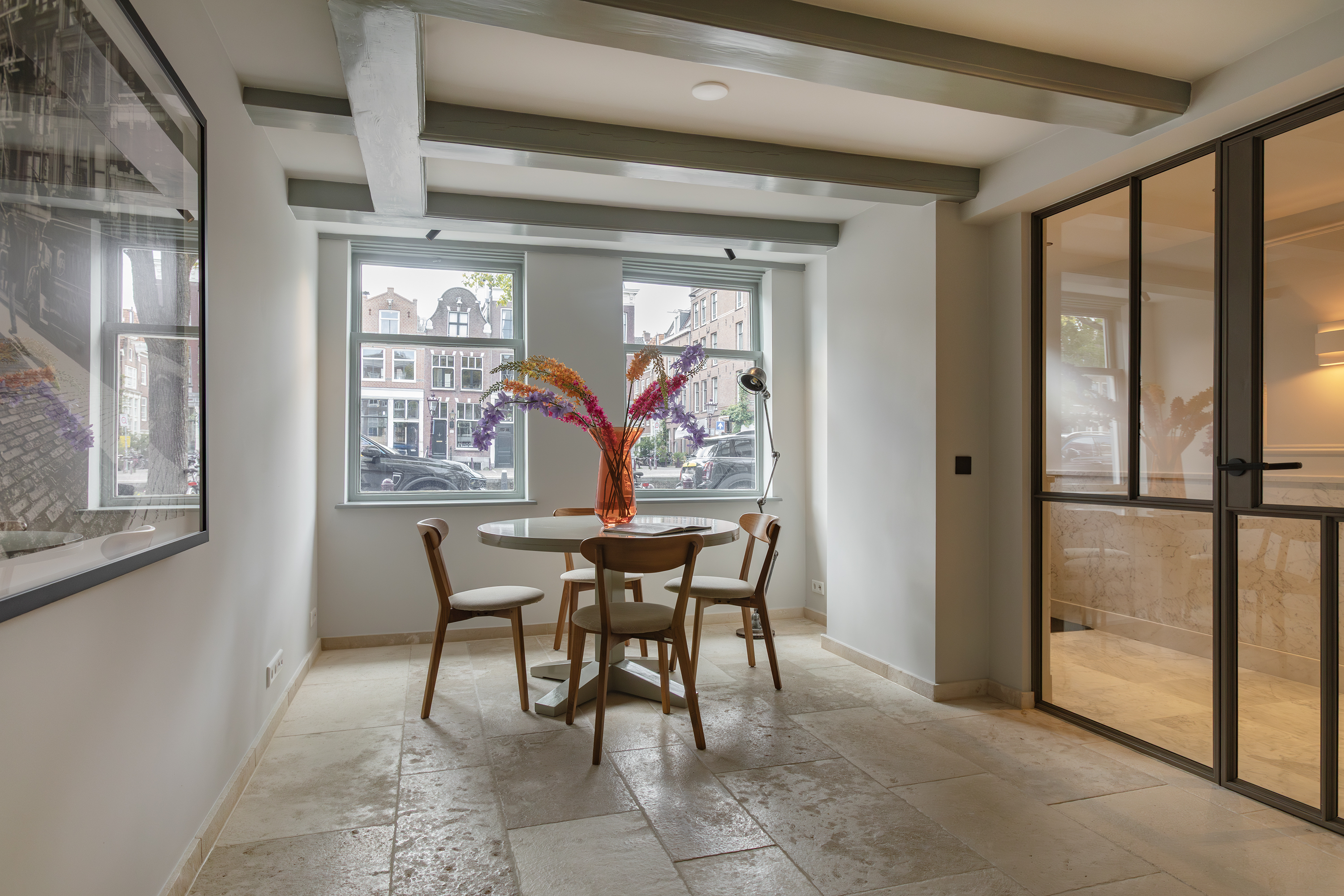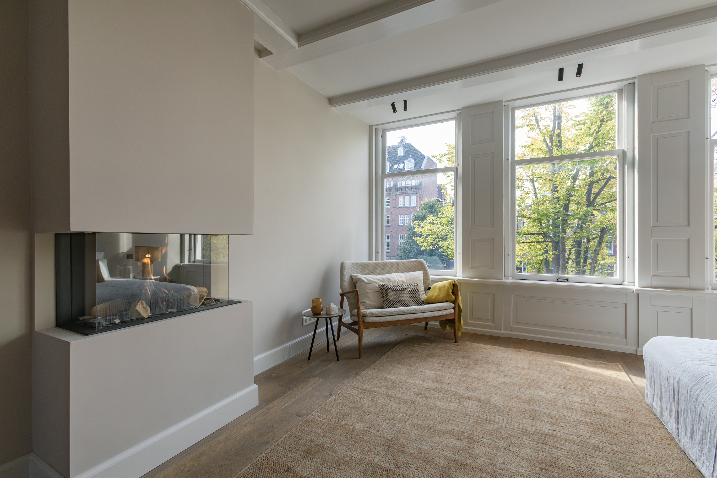 L’entrée historique le long du canal mène à un hall orné de marbre, qui s’ouvre sur une cuisine-séjour baignée de lumière, équipée d’appareils Gaggenau et d’une vaste salle à manger donnant sur le canal à travers de larges baies vitrées. Les portes vitrées en acier, les carreaux anciens préservés et un espace de plus de 30 mètres au rez-de-chaussée offrent une continuité rare, même parmi les prestigieuses maisons de canal d’Amsterdam. Le sol en microciment du salon, la cheminée à gaz tunnel et les généreuses verrières apportent une sérénité raffinée, tandis que les patios et le carrelage d’origine invitent la nature à l’intérieur.
