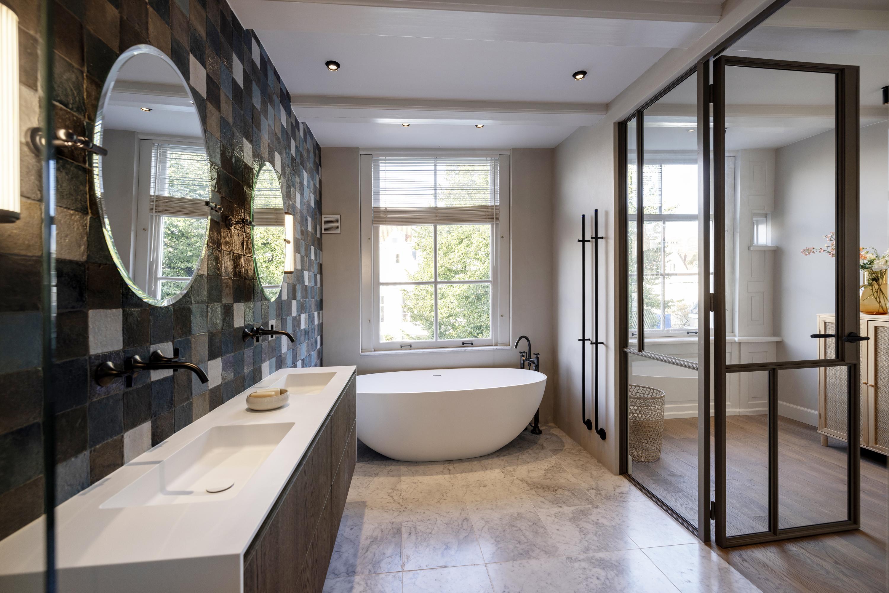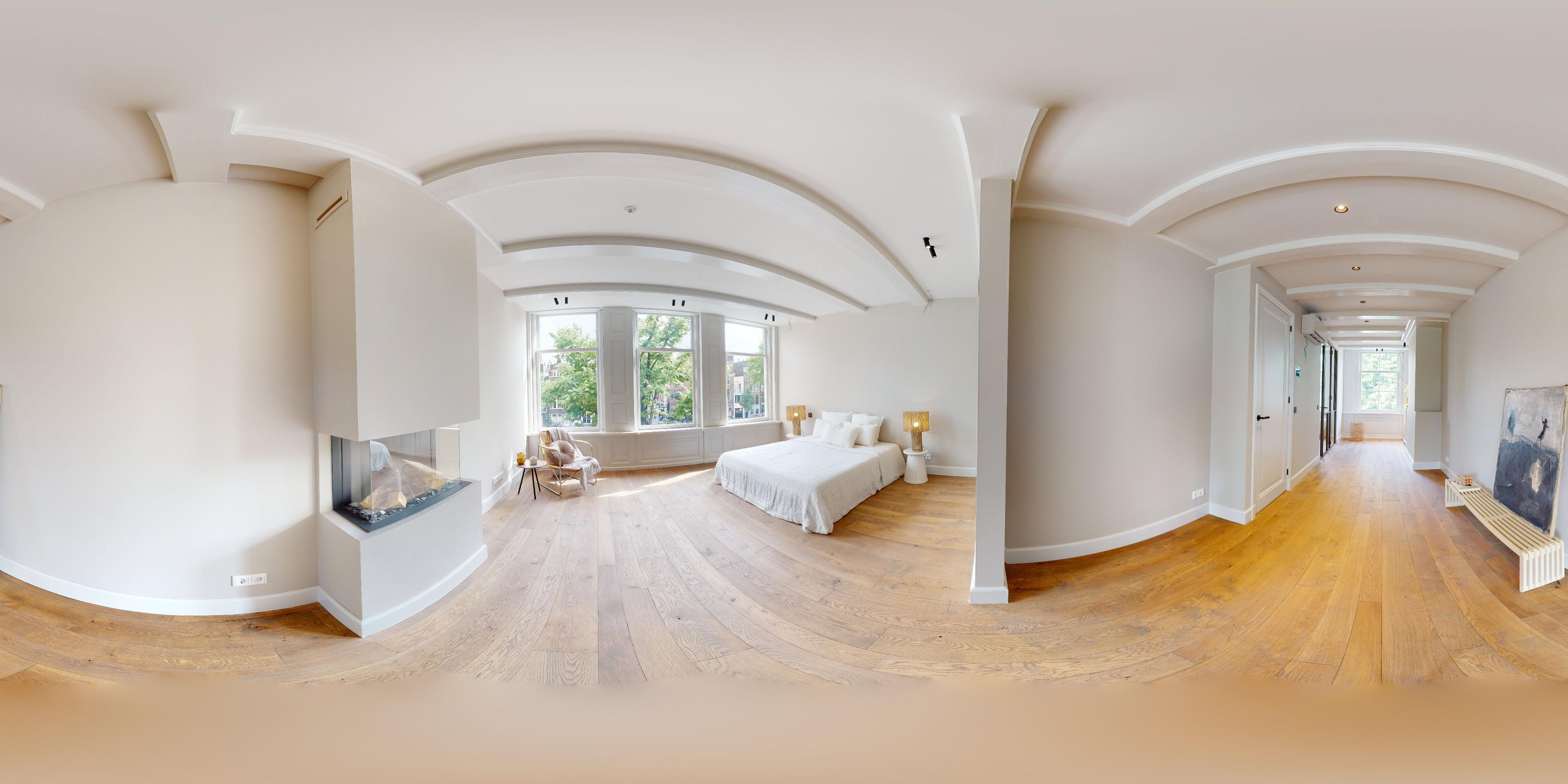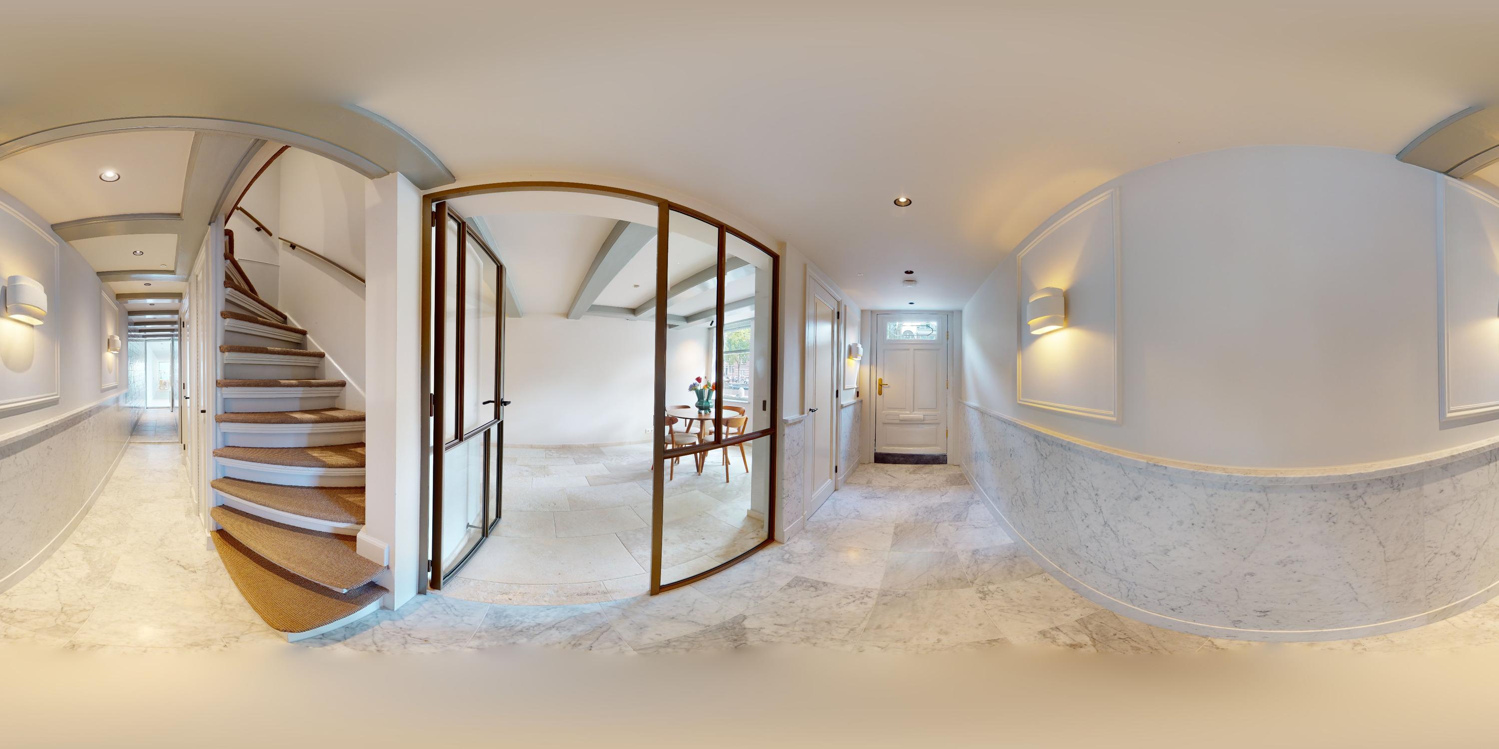 L’entrée historique le long du canal mène à un hall orné de marbre, qui s’ouvre sur une cuisine-séjour baignée de lumière, équipée d’appareils Gaggenau et d’une vaste salle à manger donnant sur le canal à travers de larges baies vitrées. Les portes vitrées en acier, les carreaux anciens préservés et un espace de plus de 30 mètres au rez-de-chaussée offrent une continuité rare, même parmi les prestigieuses maisons de canal d’Amsterdam. Le sol en microciment du salon, la cheminée à gaz tunnel et les généreuses verrières apportent une sérénité raffinée, tandis que les patios et le carrelage d’origine invitent la nature à l’intérieur.