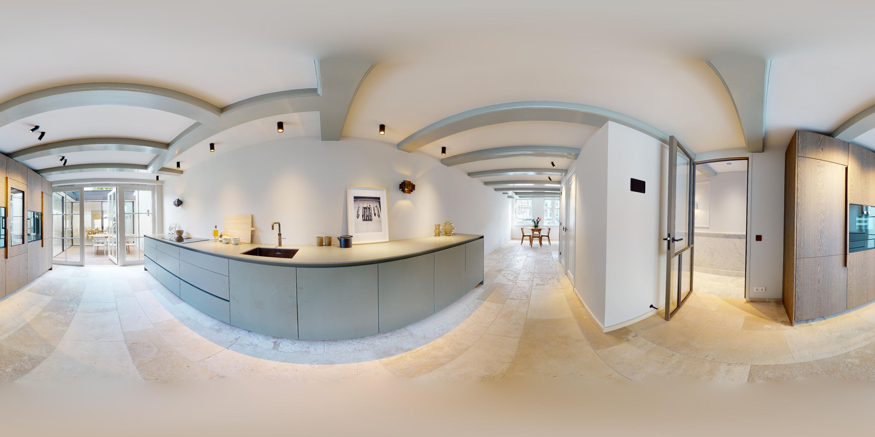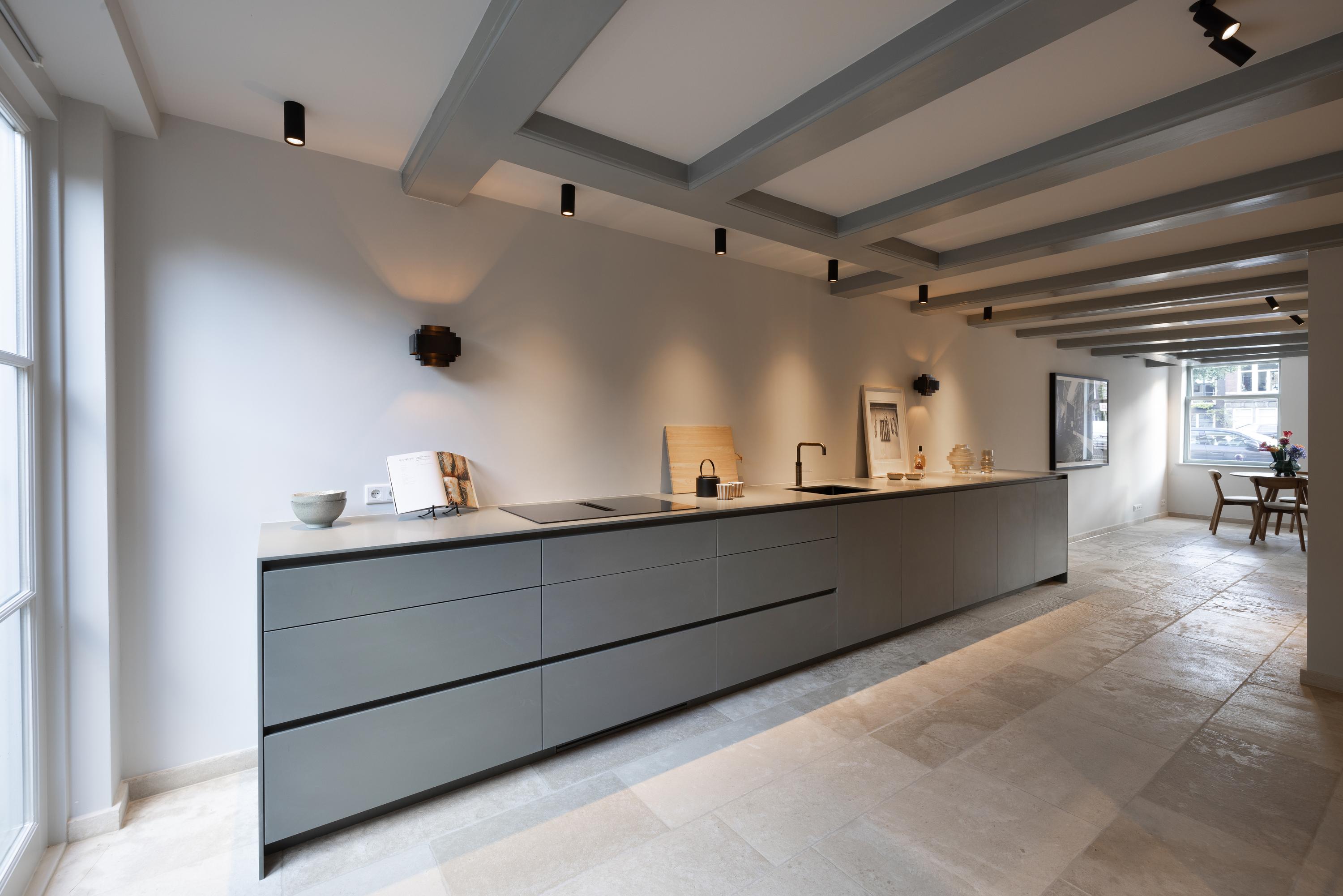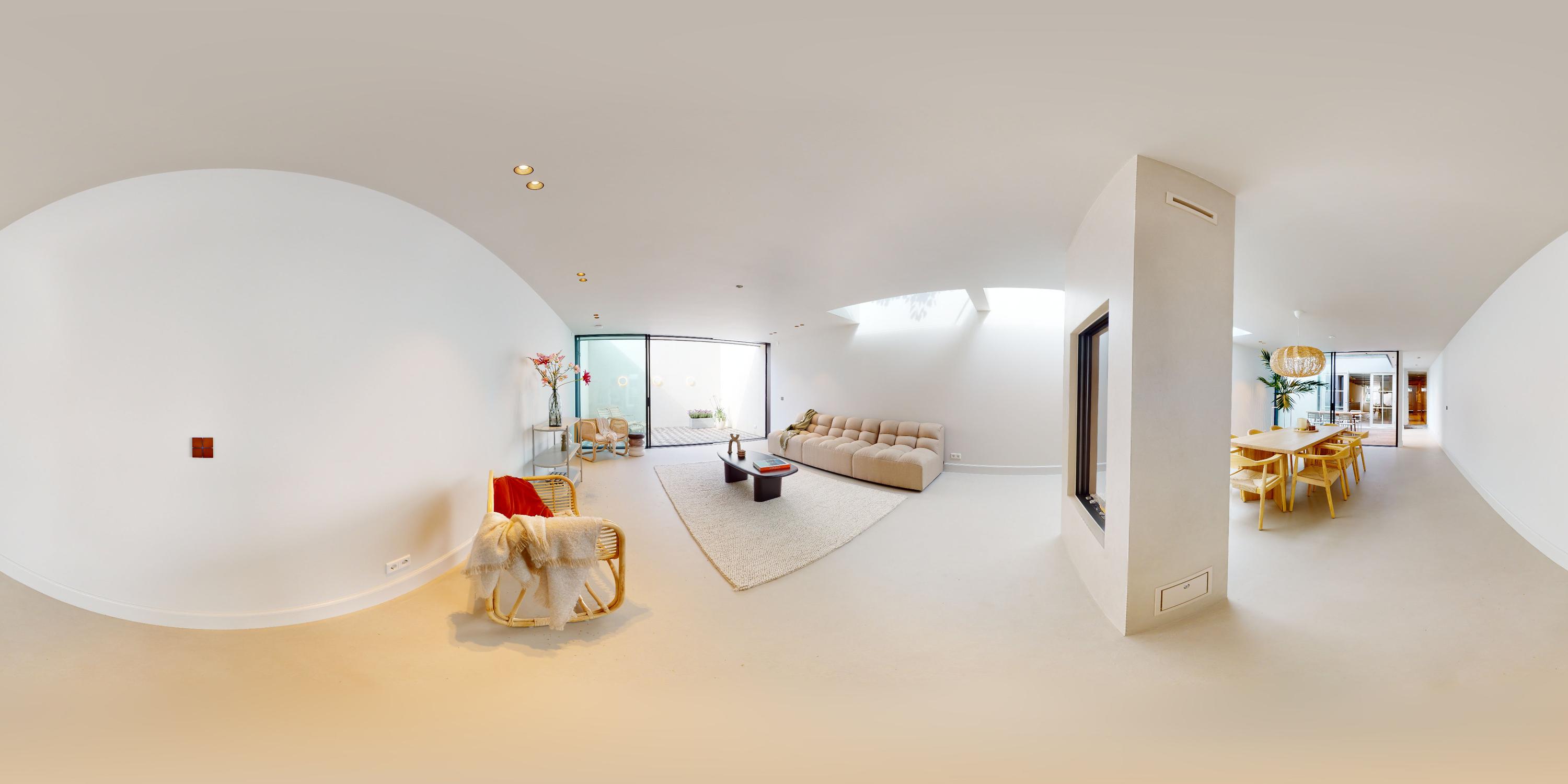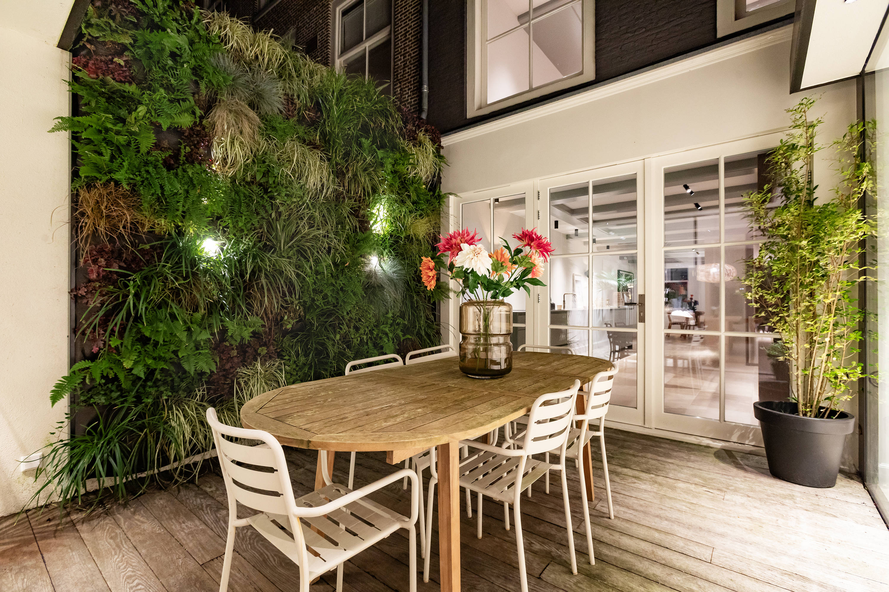 L’entrée historique le long du canal mène à un hall orné de marbre, qui s’ouvre sur une cuisine-séjour baignée de lumière, équipée d’appareils Gaggenau et d’une vaste salle à manger donnant sur le canal à travers de larges baies vitrées. Les portes vitrées en acier, les carreaux anciens préservés et un espace de plus de 30 mètres au rez-de-chaussée offrent une continuité rare, même parmi les prestigieuses maisons de canal d’Amsterdam. Le sol en microciment du salon, la cheminée à gaz tunnel et les généreuses verrières apportent une sérénité raffinée, tandis que les patios et le carrelage d’origine invitent la nature à l’intérieur.
