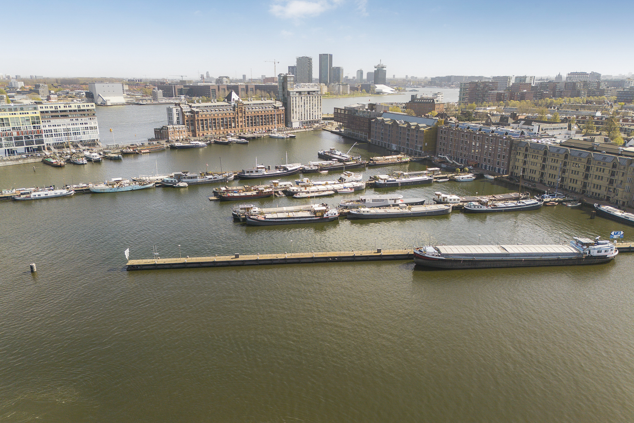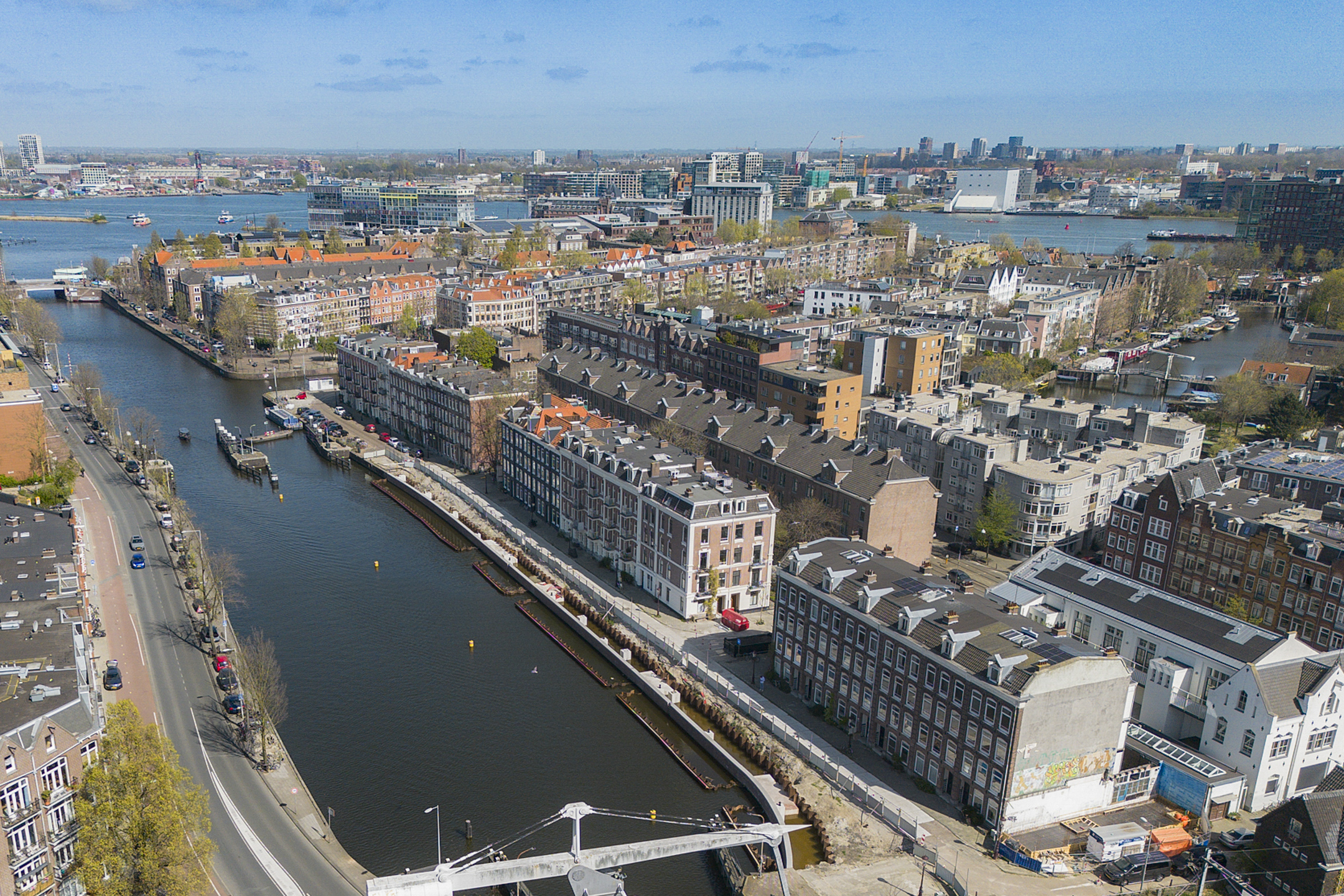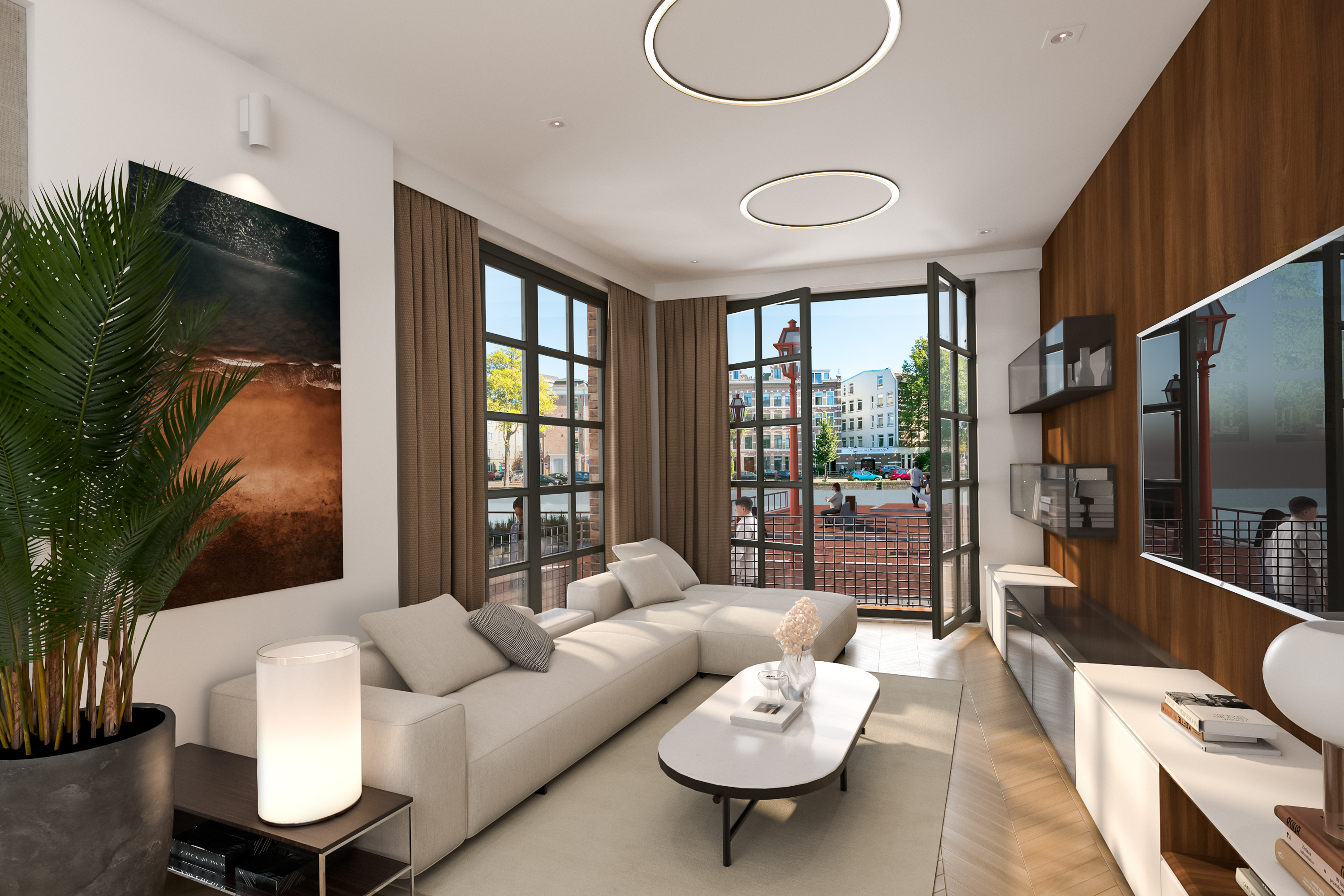 L’espace principal surélevé profite d’une lumière naturelle abondante grâce à de larges baies vitrées orientées vers le canal, avec une hauteur sous plafond approchant 2,90 mètres. Un balconnet à la française et une banquette astucieusement escamotable relient discrètement l’intérieur au Westerkanaal. Le niveau inférieur accueille, en hauteur sous plafond totale, deux chambres, un espace bureau, une buanderie et une salle de bains généreuse, tous conçus sur une base technique harmonieuse avec ventilation mécanique. Les intérieurs sont livrés hors d’eau hors d’air, offrant la liberté d’exprimer votre propre style, avec les conseils d’un expert de Co van der Horst.