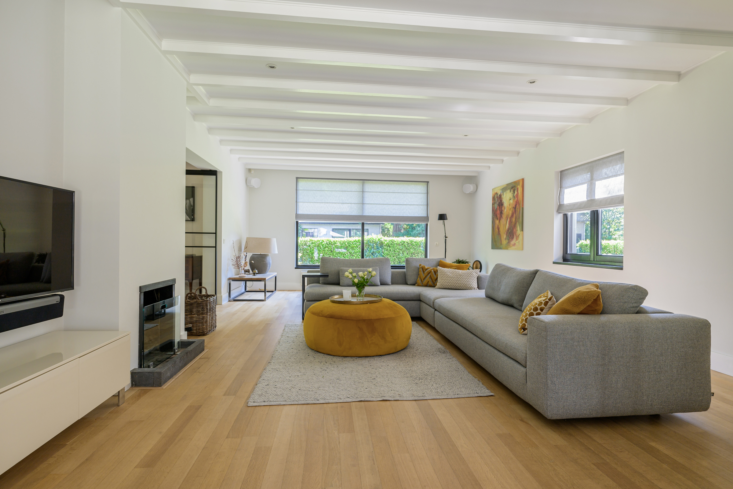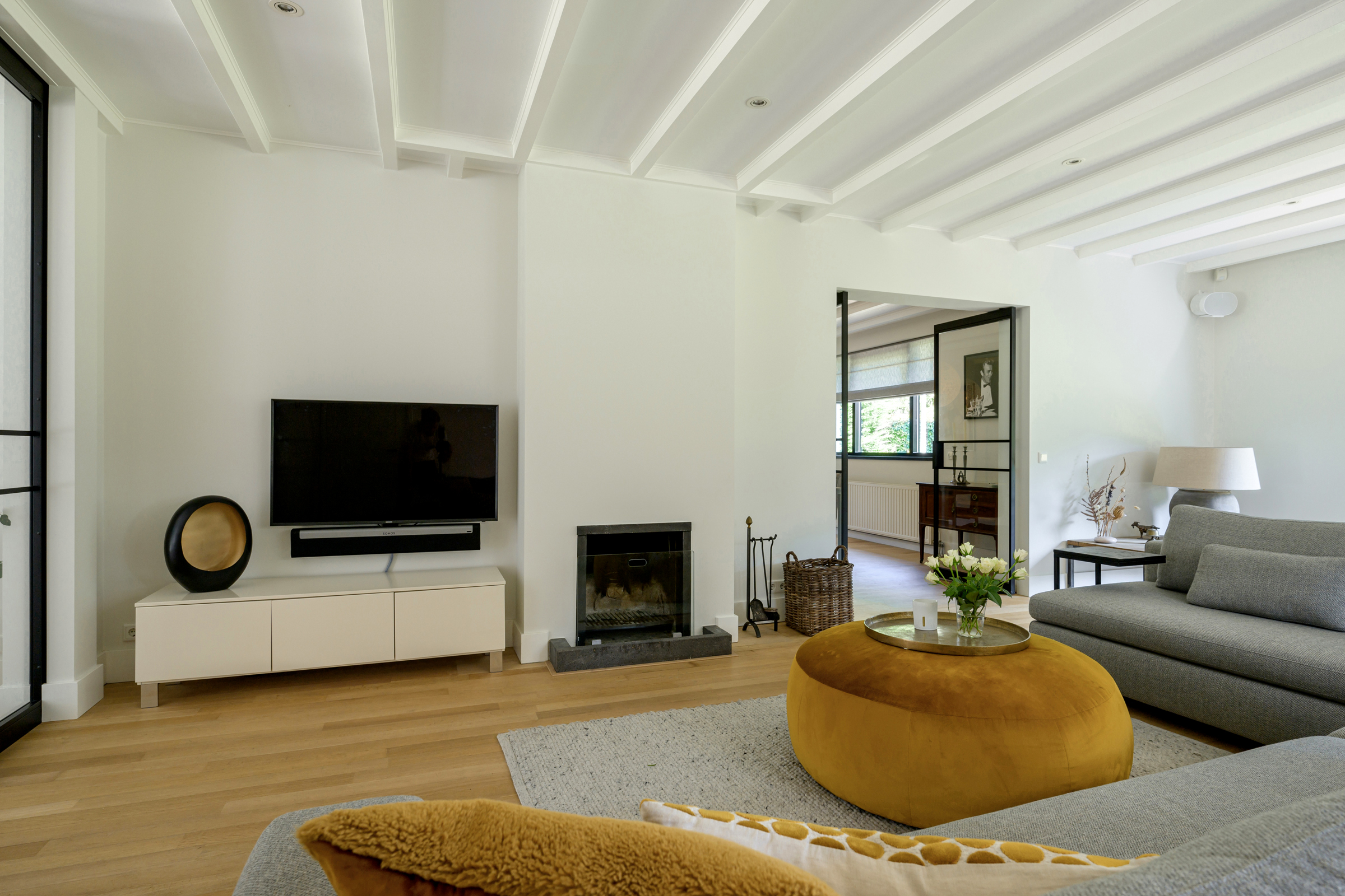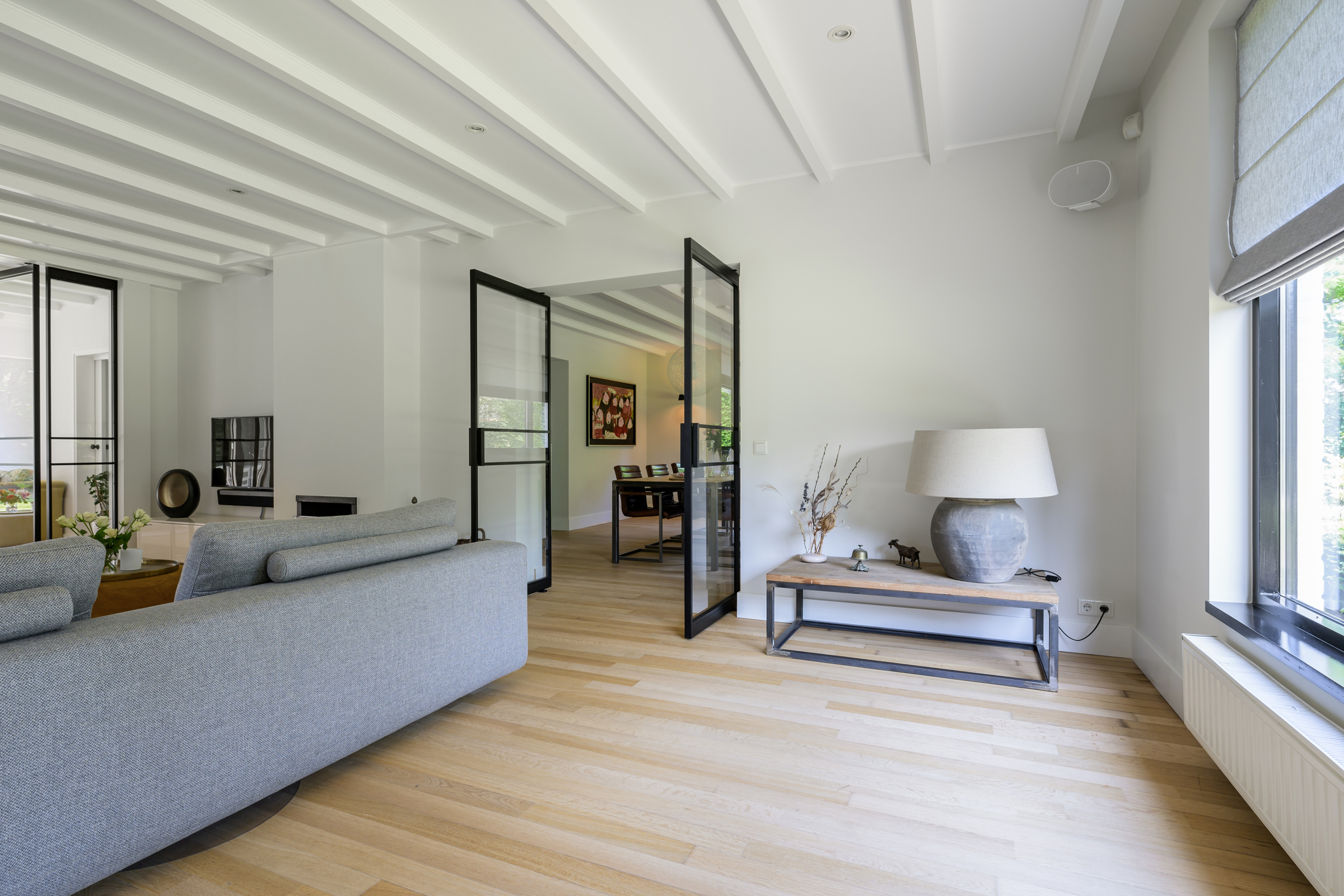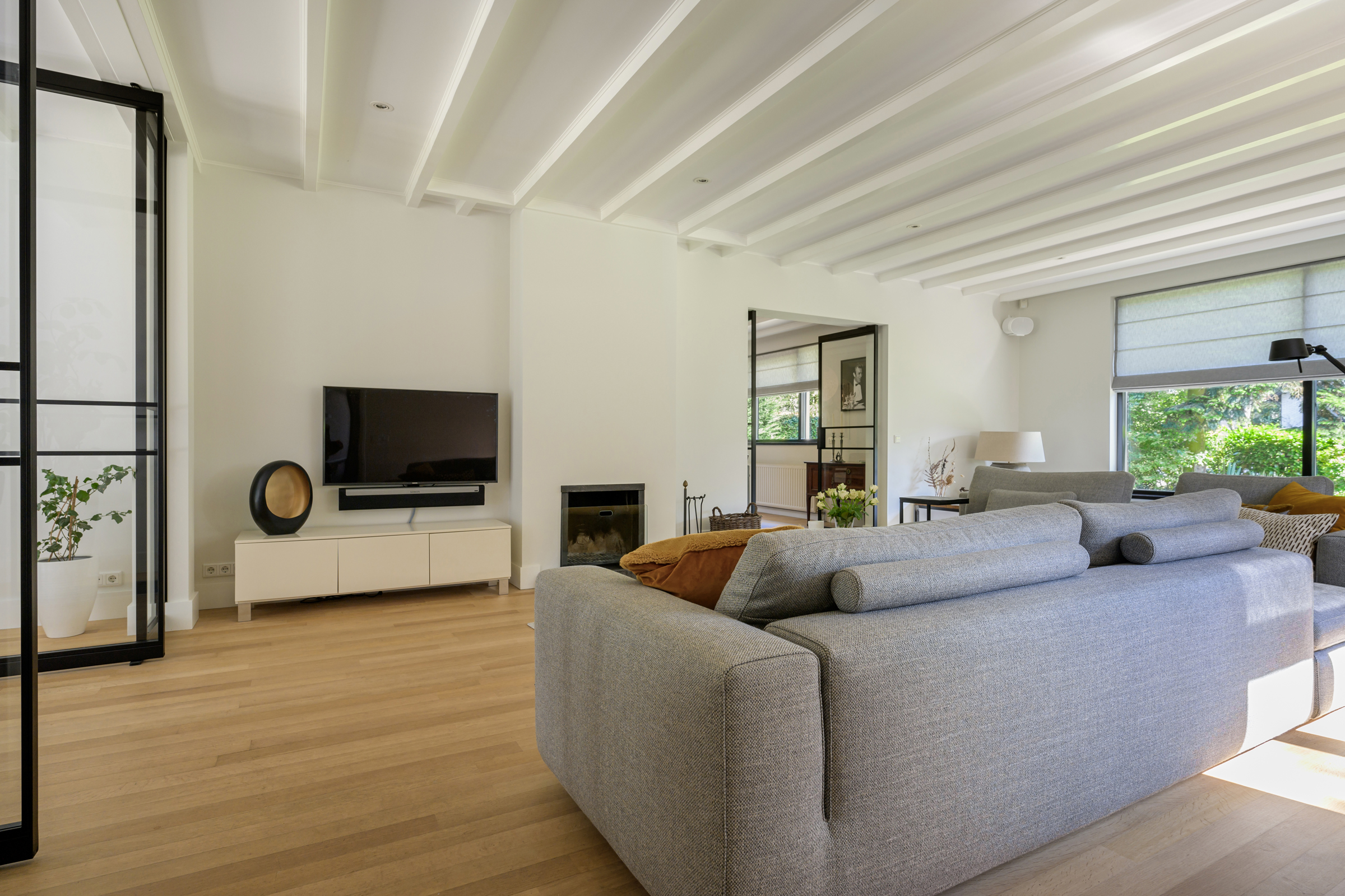 La maison conjugue durabilité et pragmatisme grâce à l’isolation des sols et plafonds, au vitrage HR++, à 18 panneaux solaires et à un chauffage moderne, offrant ainsi un environnement efficace et serein. De grandes dalles en ardoise, du parquet et des sols en bois massif soulignent le caractère feutré de l’ensemble, tandis que les plafonds à poutres apparentes et l’éclairage intégré instaurent une atmosphère rythmée. Les espaces de vie s’ouvrent depuis un salon avec cheminée, traversant des portes vitrées vers le jardin, et communiquent harmonieusement avec une salle à manger séparée et une cuisine entièrement équipée avec buanderie.