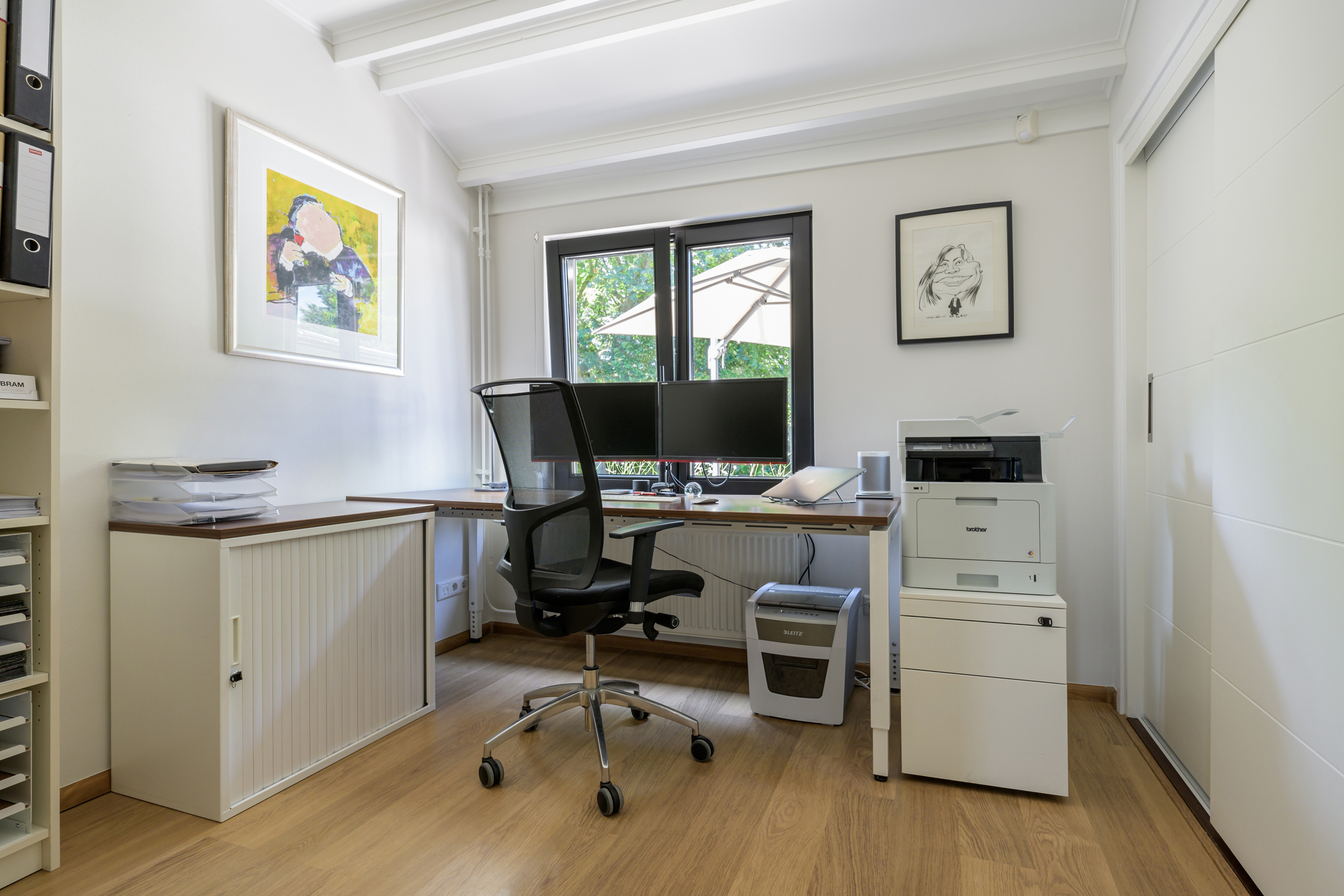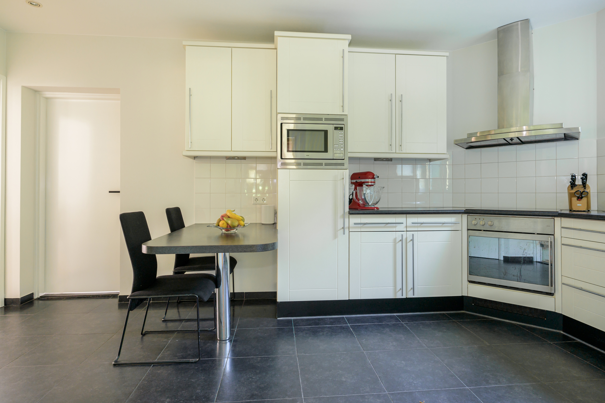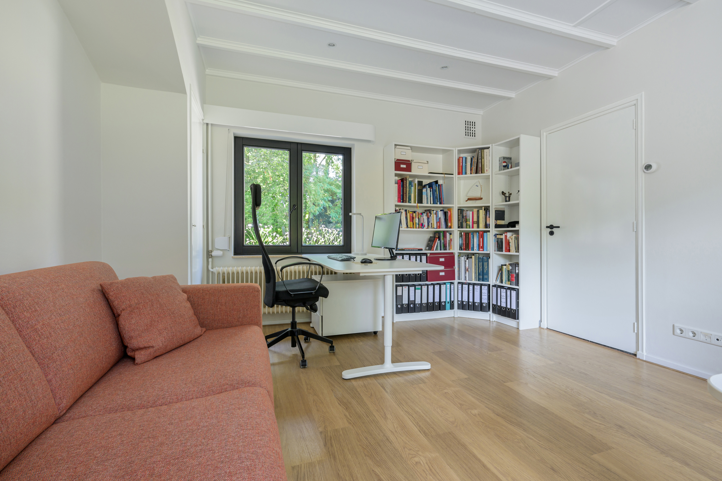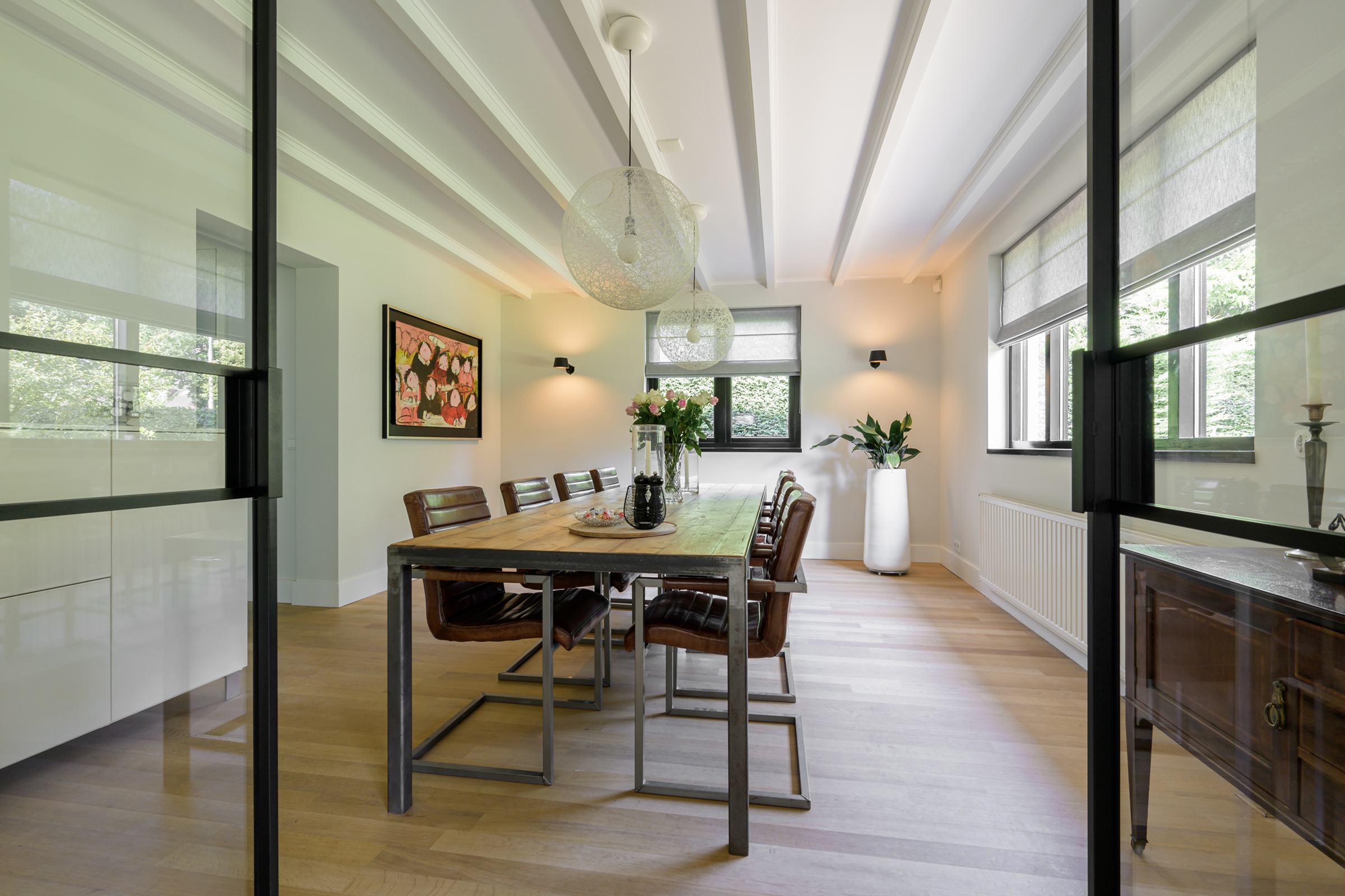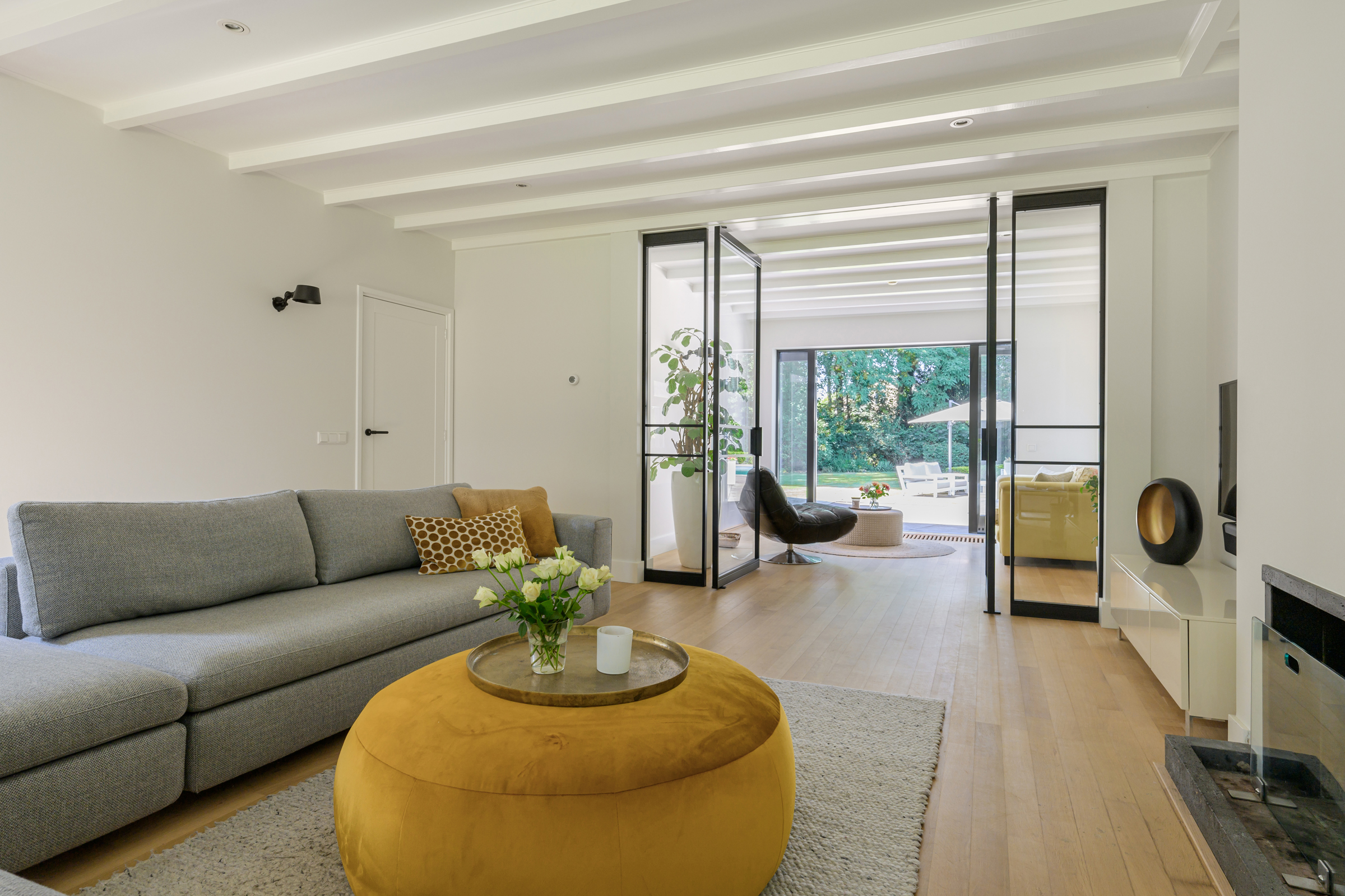 La maison conjugue durabilité et pragmatisme grâce à l’isolation des sols et plafonds, au vitrage HR++, à 18 panneaux solaires et à un chauffage moderne, offrant ainsi un environnement efficace et serein. De grandes dalles en ardoise, du parquet et des sols en bois massif soulignent le caractère feutré de l’ensemble, tandis que les plafonds à poutres apparentes et l’éclairage intégré instaurent une atmosphère rythmée. Les espaces de vie s’ouvrent depuis un salon avec cheminée, traversant des portes vitrées vers le jardin, et communiquent harmonieusement avec une salle à manger séparée et une cuisine entièrement équipée avec buanderie.